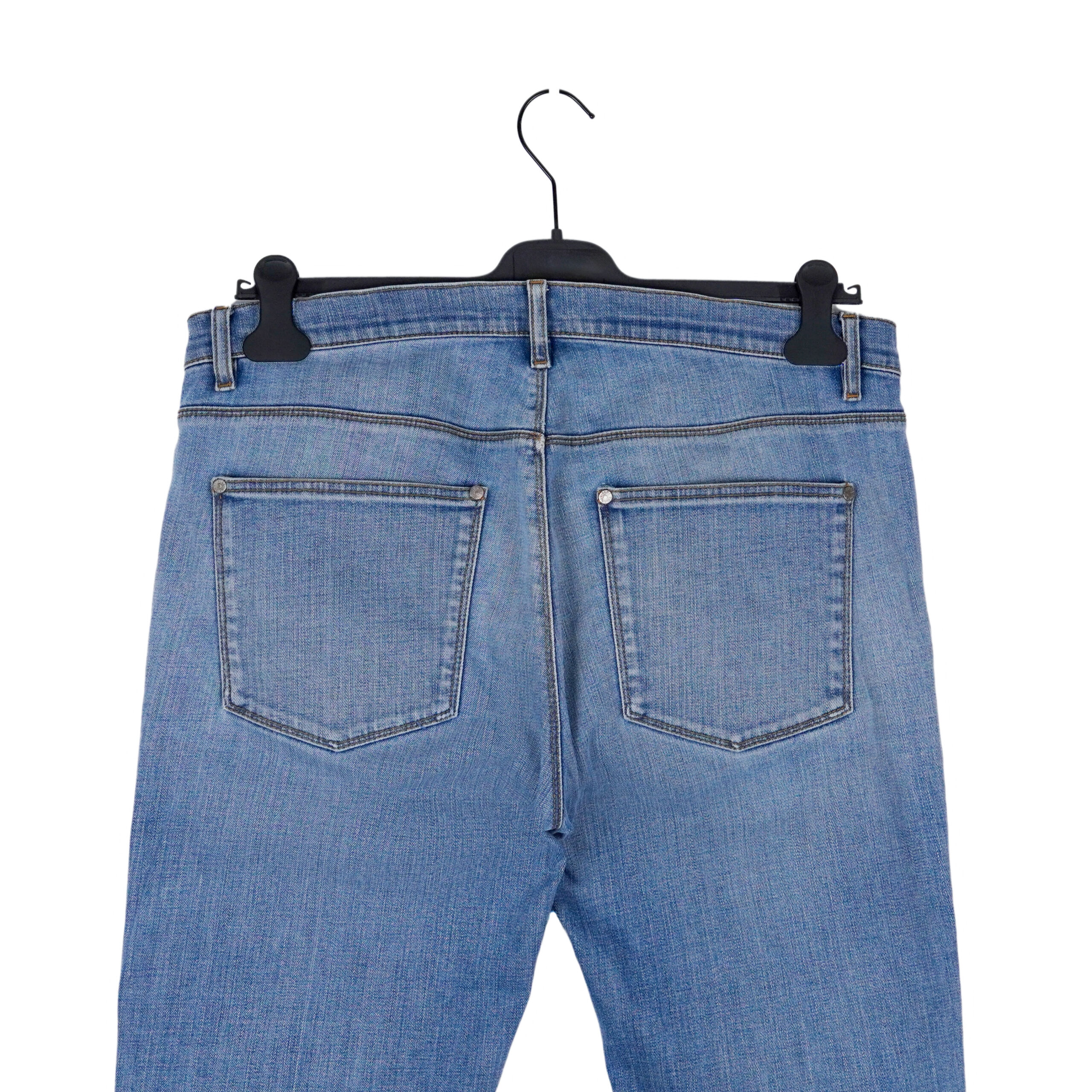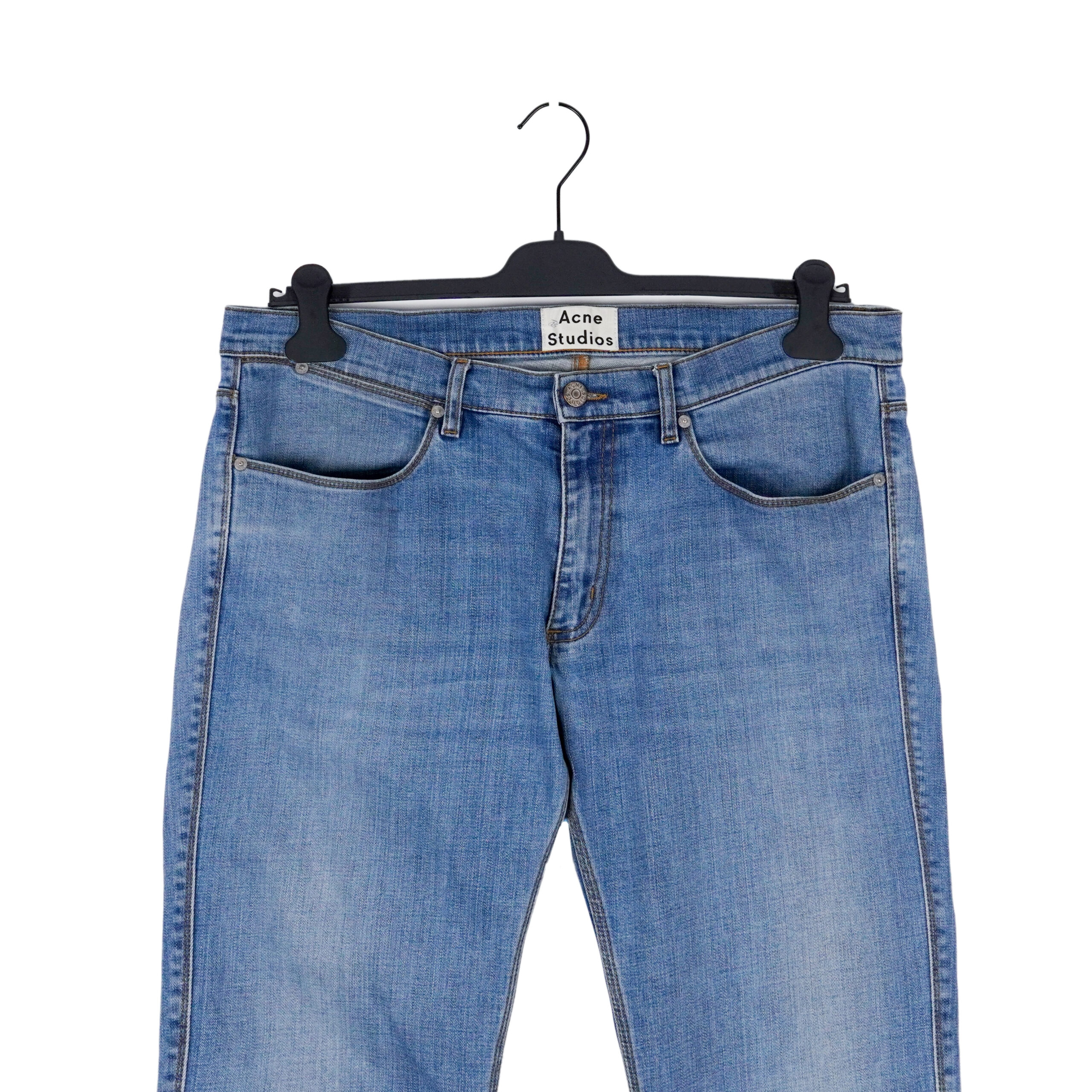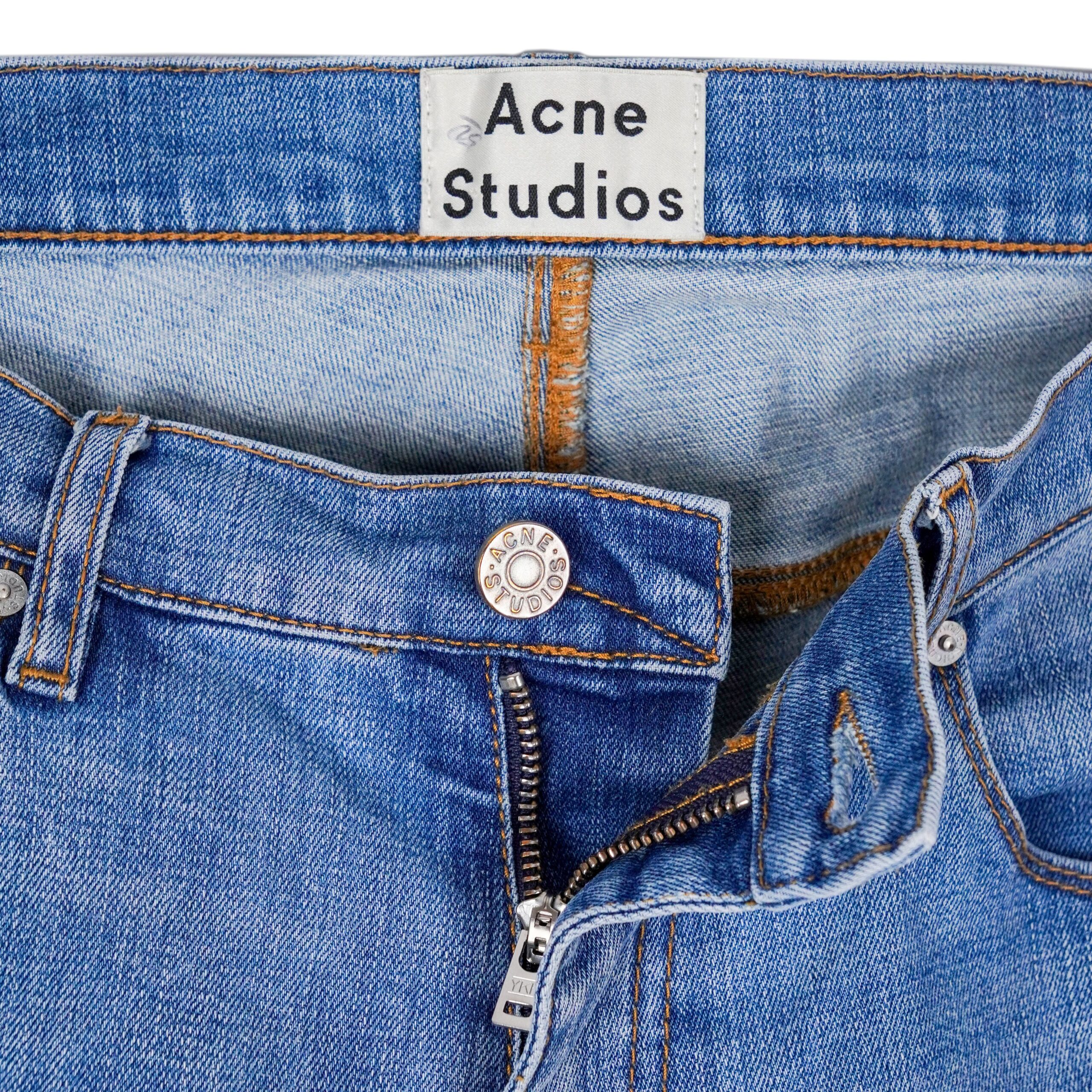 These Acne Studios jeans showcase the brand’s signature minimalist aesthetic with a refined everyday appeal. Crafted from premium stretch denim, they feature a classic five-pocket construction and a clean blue wash with natural fading and subtle whiskering on the front, adding depth and character. The slim fit offers a modern silhouette while remaining comfortable and versatile for daily wear. A timeless wardrobe essential from a renowned Scandinavian fashion house.