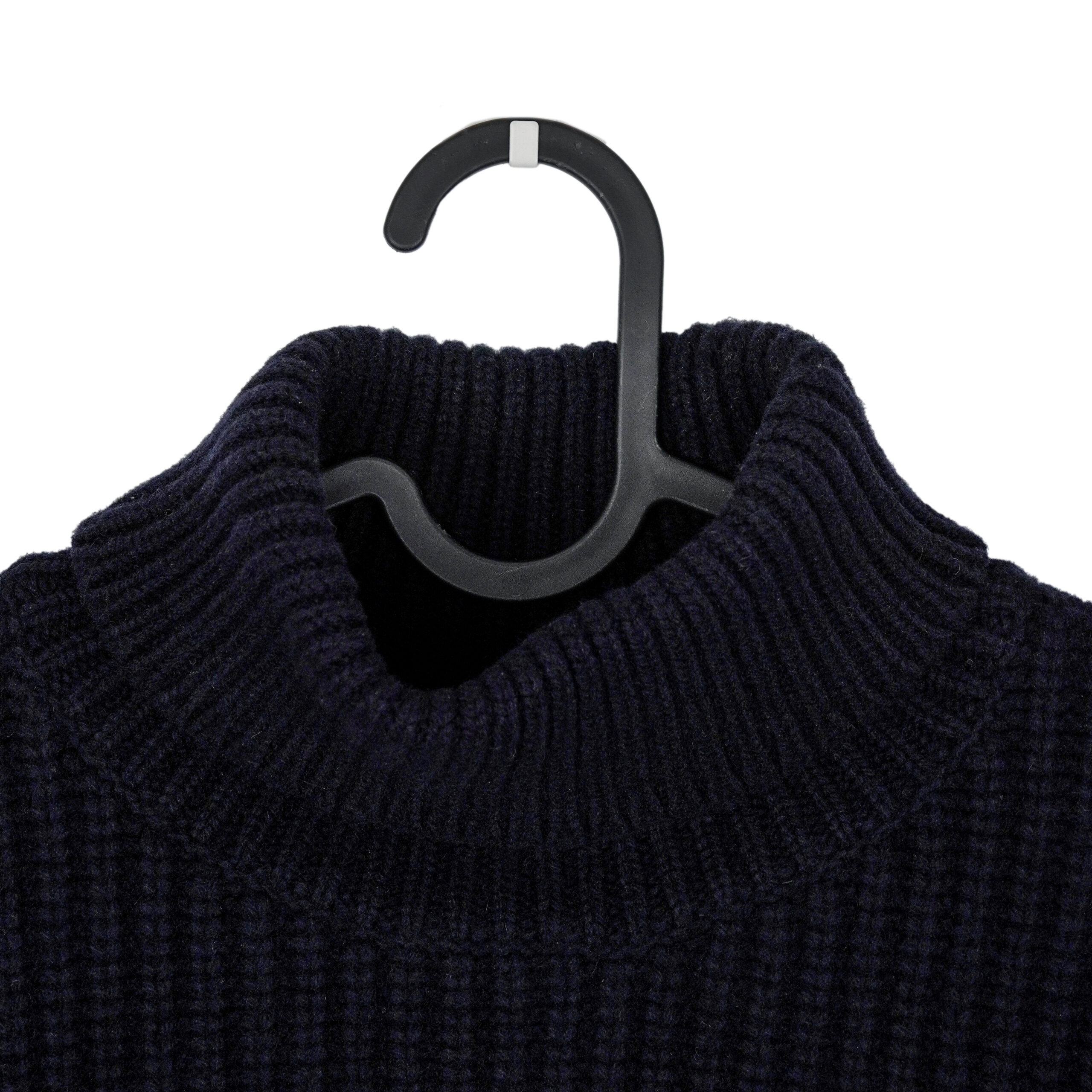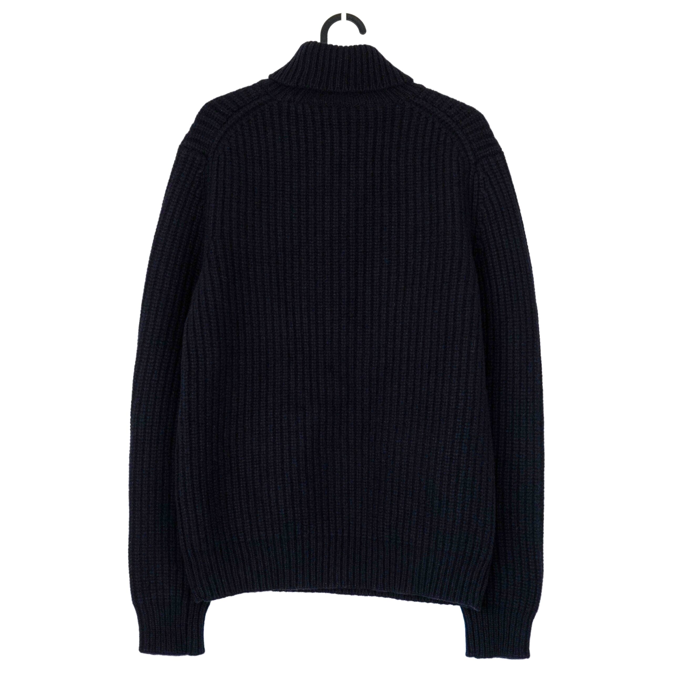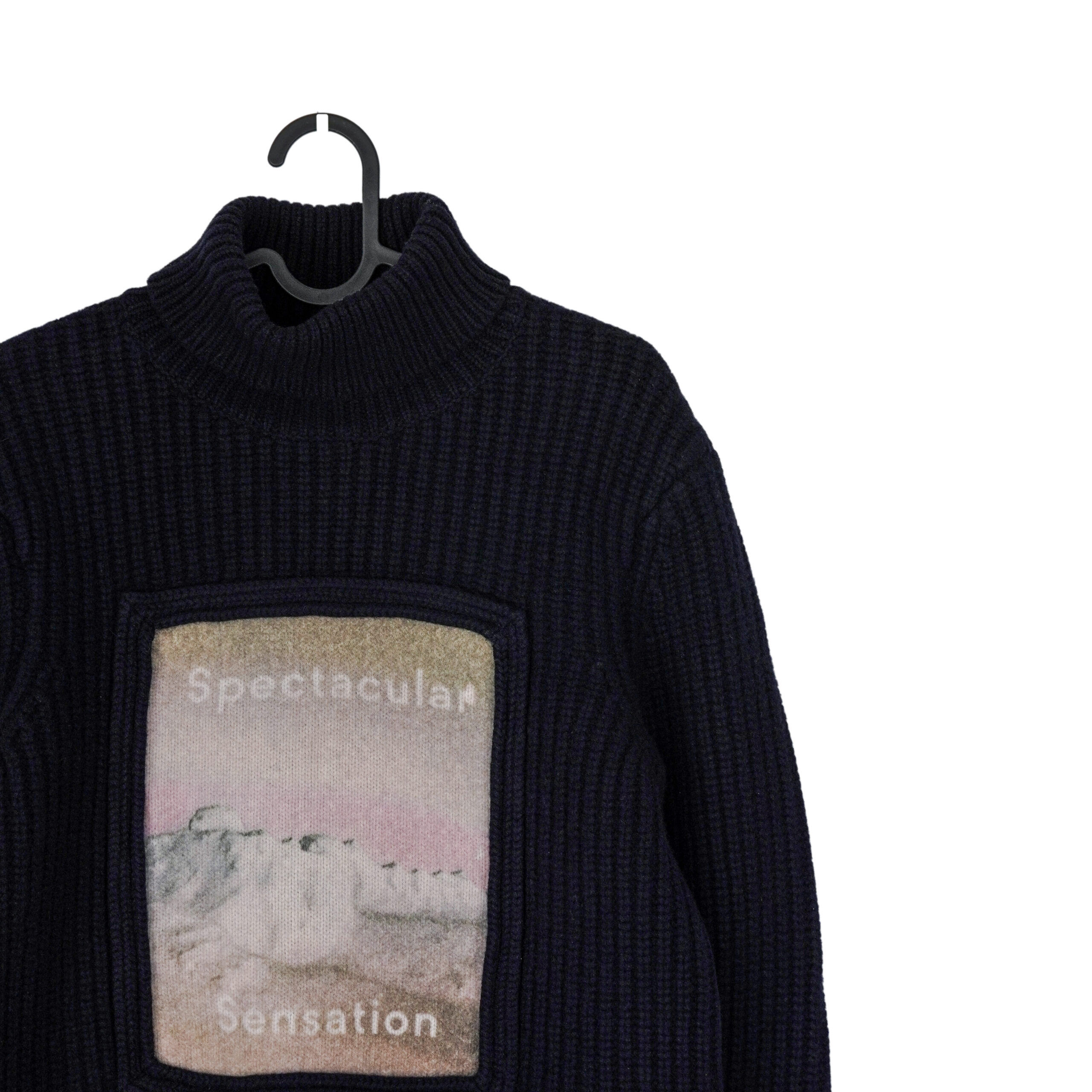 Authentic Acne Studios ribbed turtleneck sweater in deep navy blue featuring a distinctive front graphic patch with “Spectacular Sensation” text and landscape imagery. The contrast artwork panel adds a bold, artistic statement to the otherwise minimalist Scandinavian silhouette. Crafted in a thick ribbed knit, this sweater offers structure, warmth, and a clean tailored drape. The high turtleneck collar enhances its modern, elevated look while maintaining everyday versatility. A standout designer piece that pairs effortlessly with tailored trousers, denim, or layered under outerwear for a refined contemporary outfit.