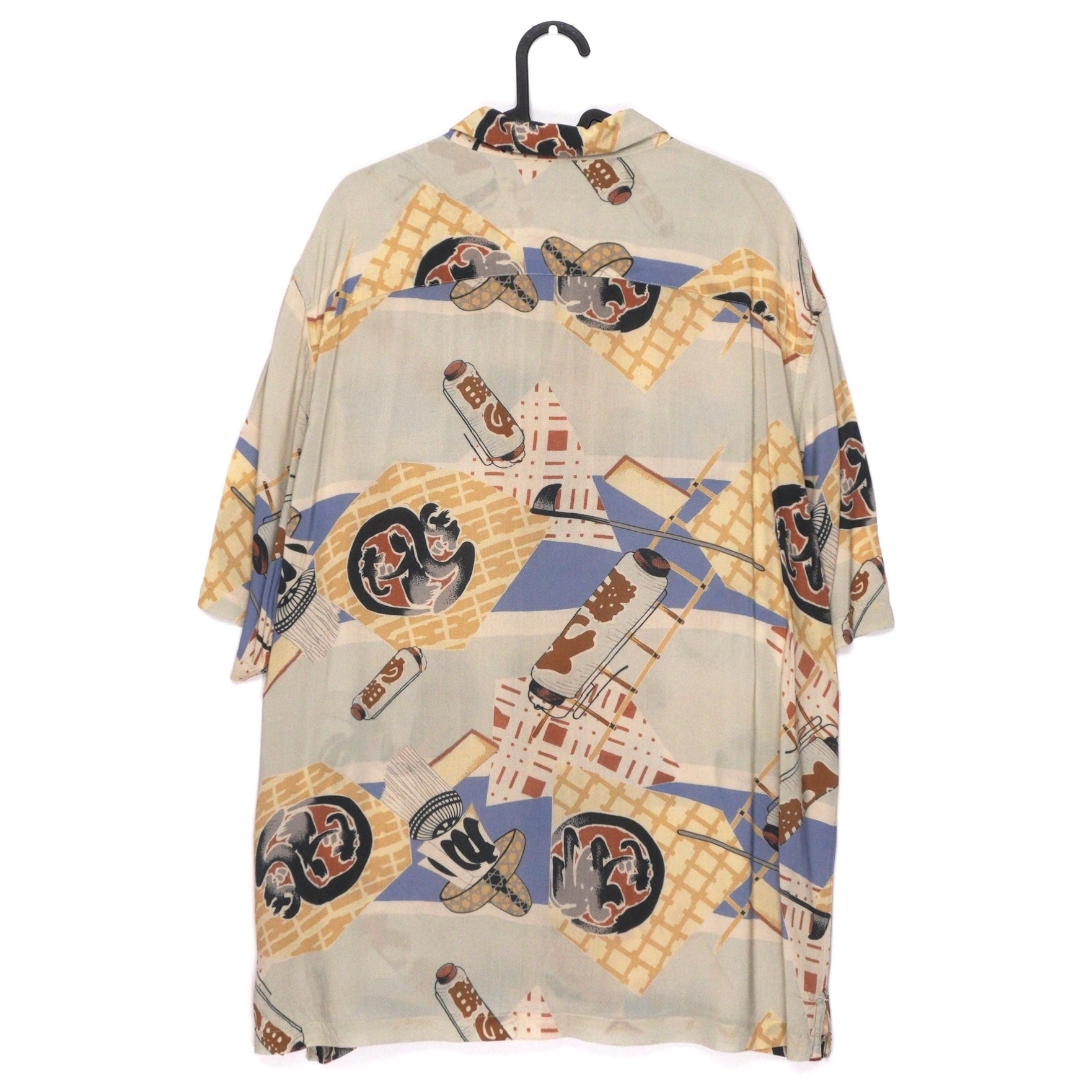 • Abstract graphic print in beige, blue, and earthy tones