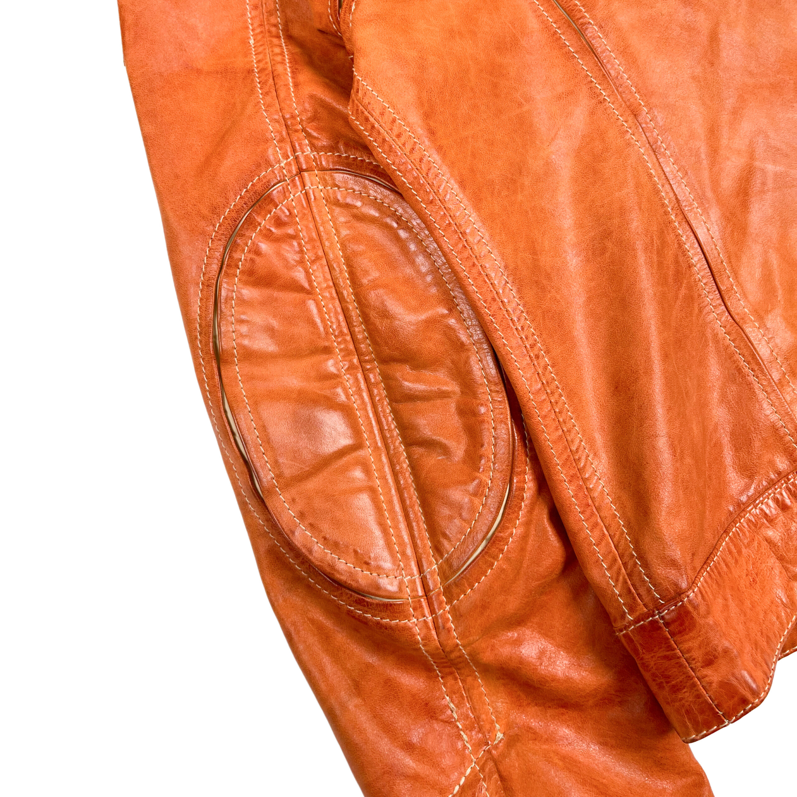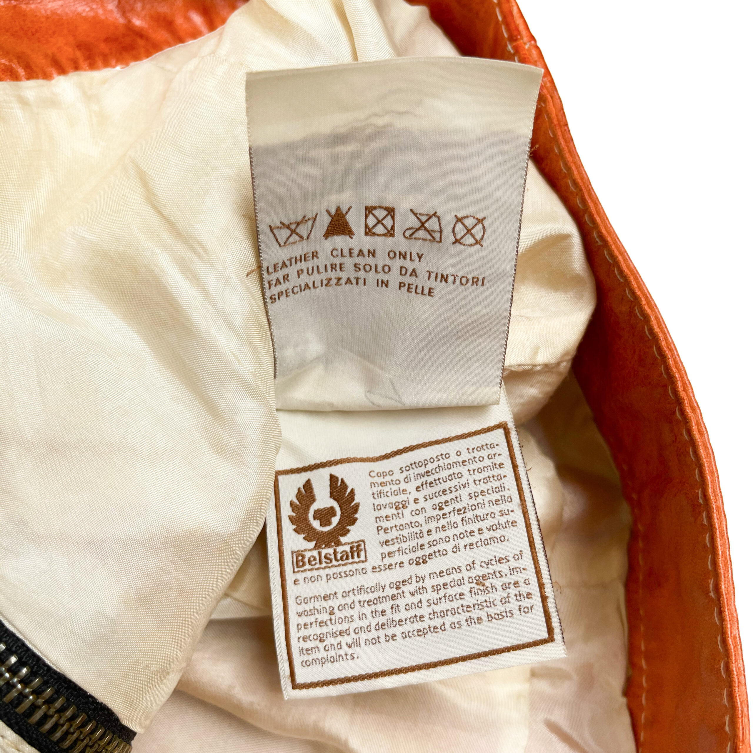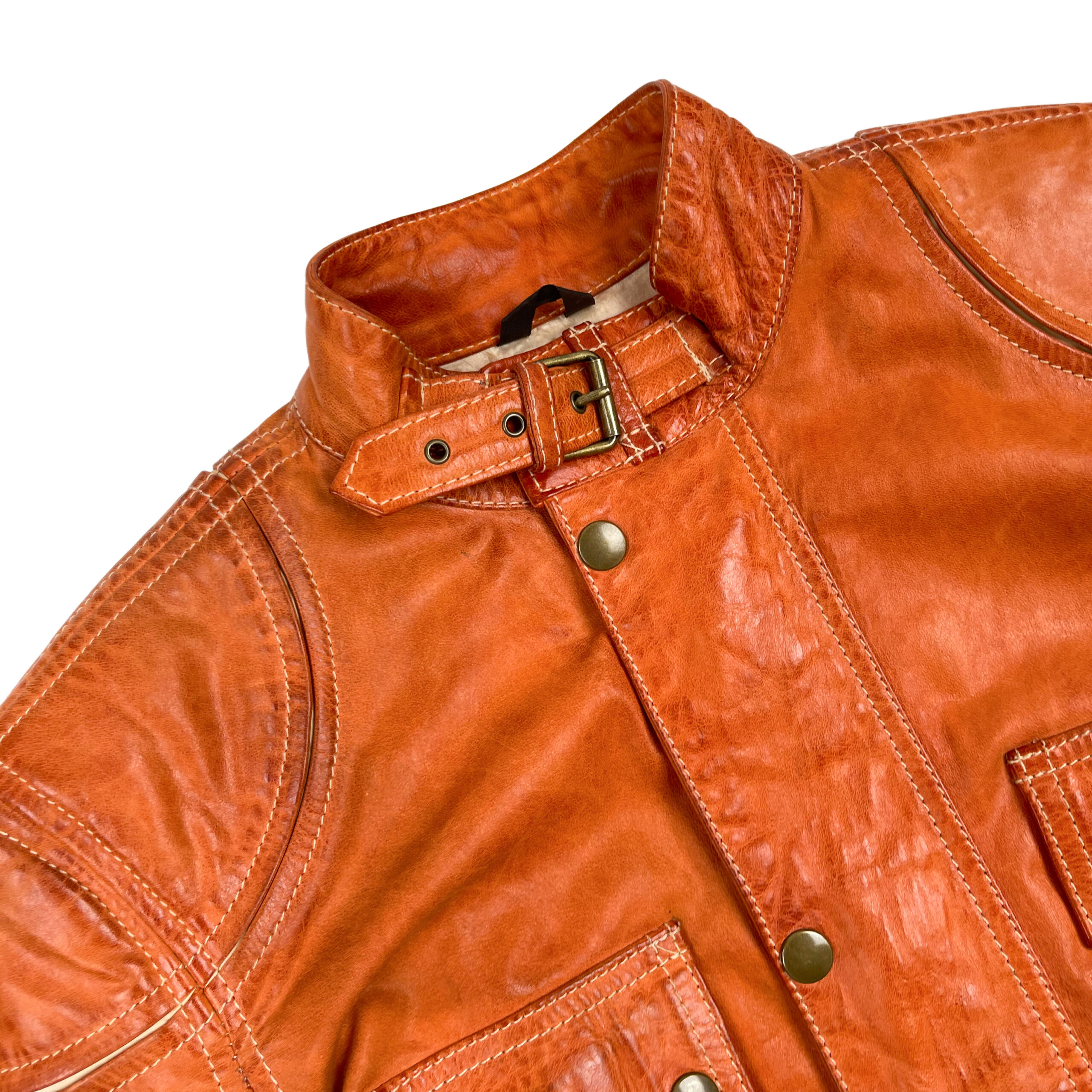 This Belstaff leather jacket is a striking example of the brand’s signature craftsmanship and heritage. Made from premium genuine leather, it features a bold orange tone with a naturally distressed finish that adds character and uniqueness to the piece. The classic moto-inspired design includes multiple front pockets, reinforced elbow patches, and a buckle collar, combining style with practical detailing. A perfect piece for those who appreciate iconic outerwear with a vintage edge.