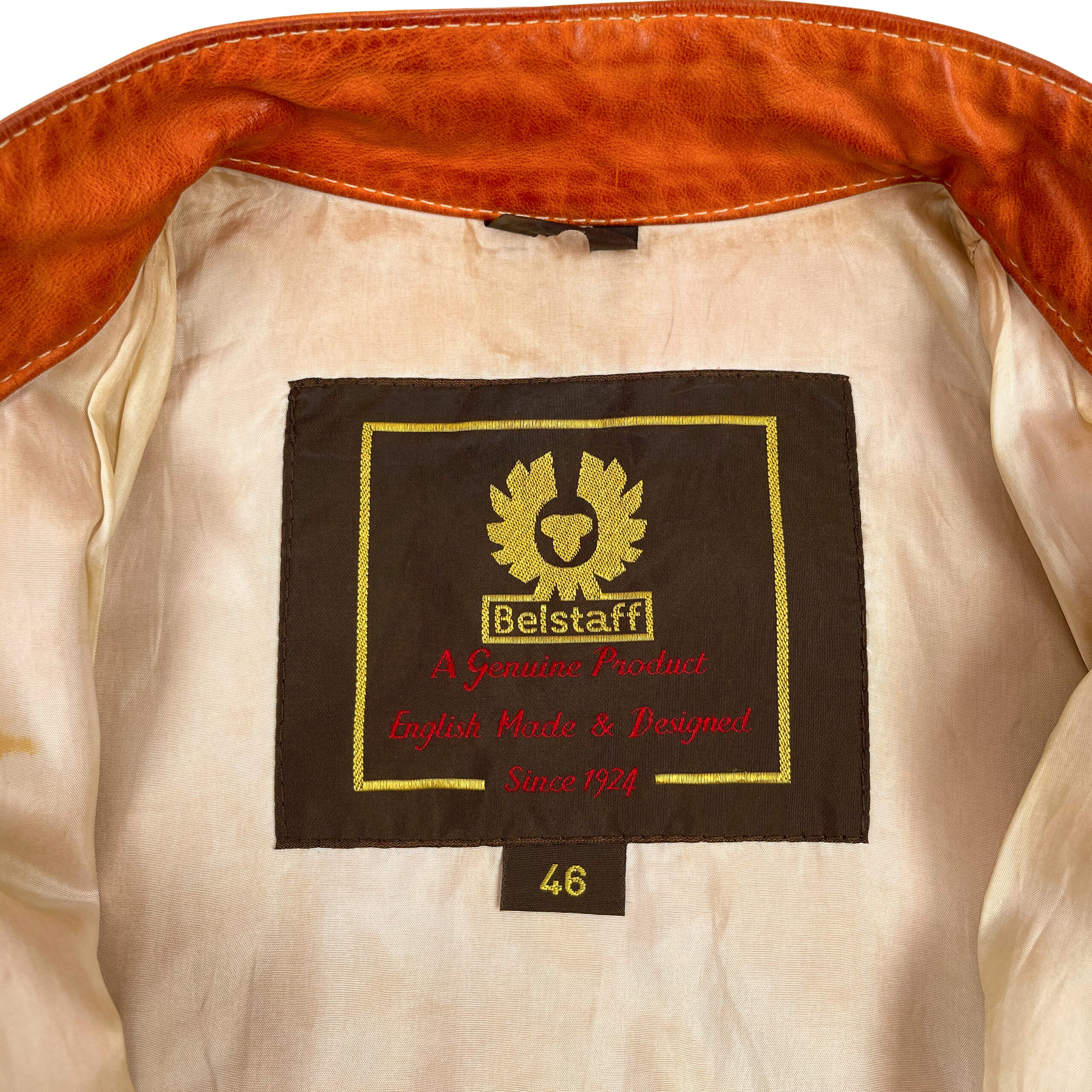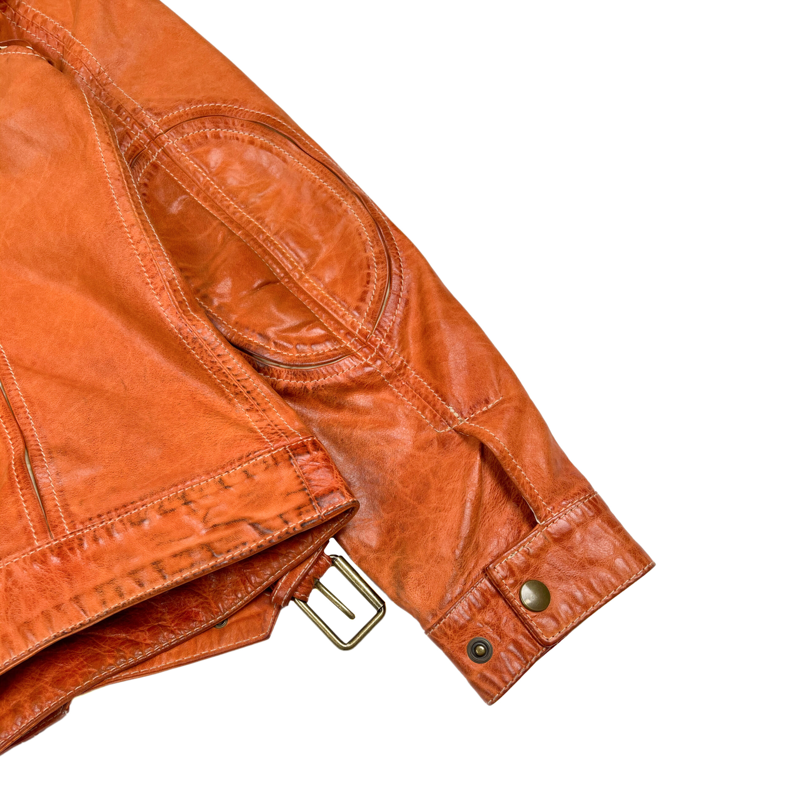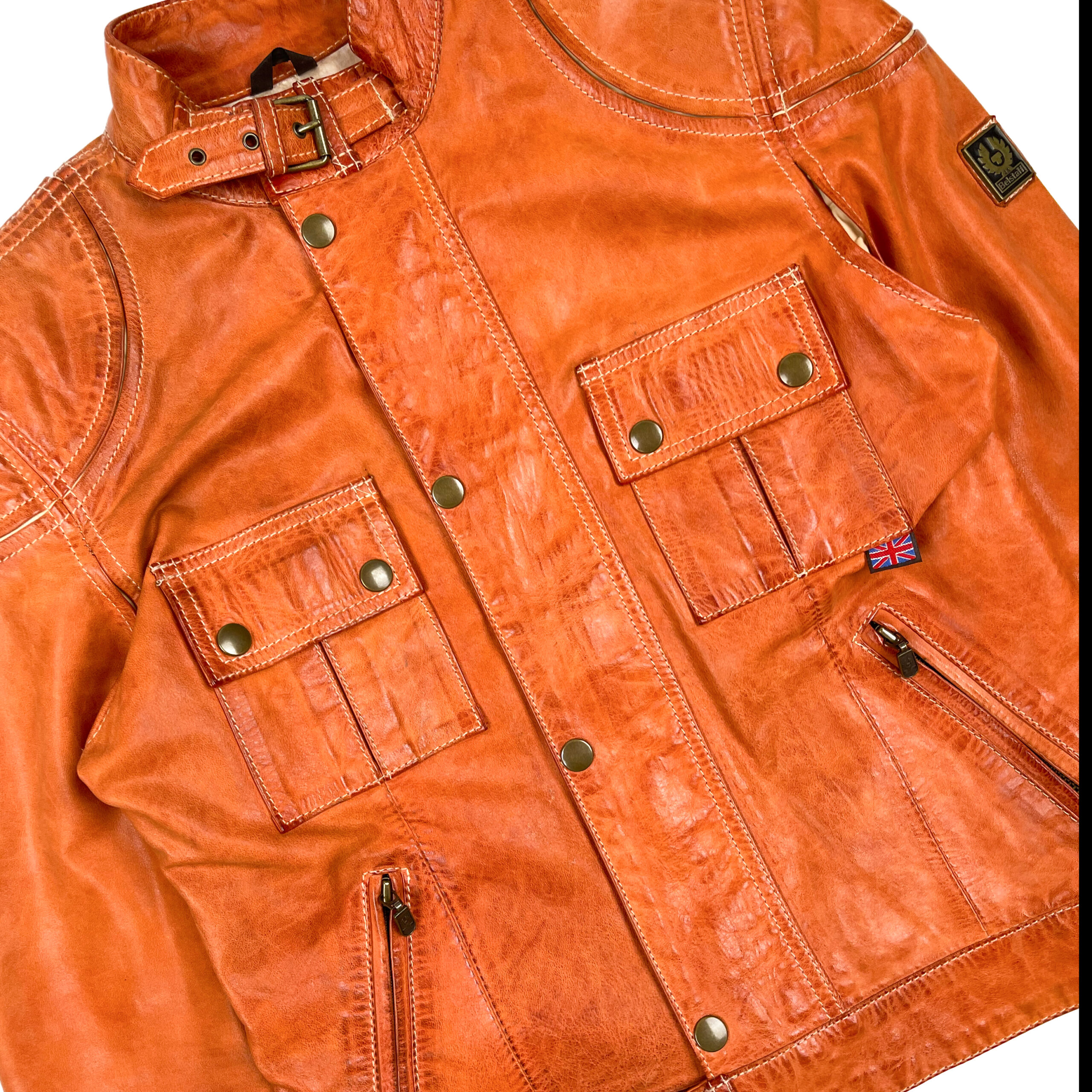 This Belstaff leather jacket is a striking example of the brand’s signature craftsmanship and heritage. Made from premium genuine leather, it features a bold orange tone with a naturally distressed finish that adds character and uniqueness to the piece. The classic moto-inspired design includes multiple front pockets, reinforced elbow patches, and a buckle collar, combining style with practical detailing. A perfect piece for those who appreciate iconic outerwear with a vintage edge.