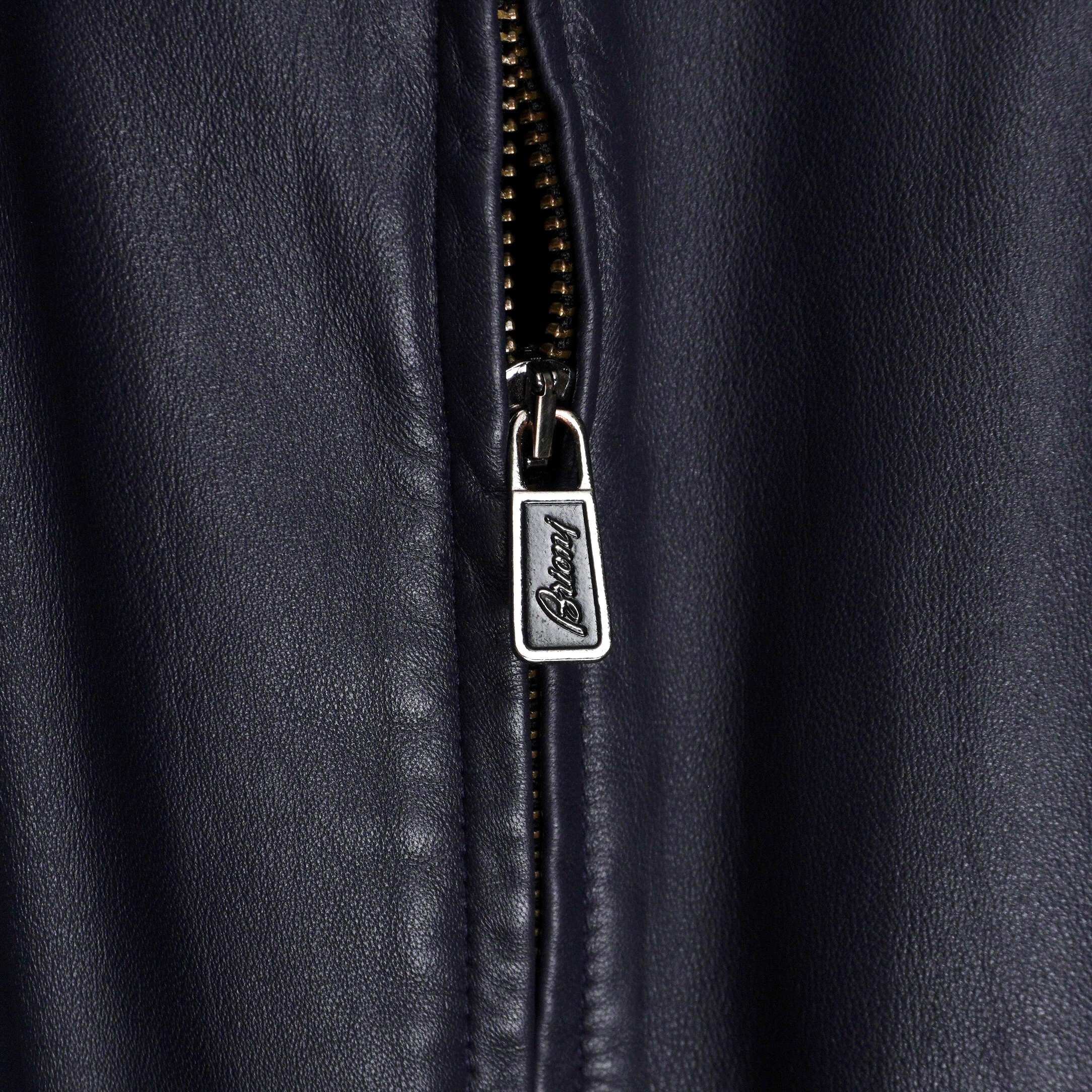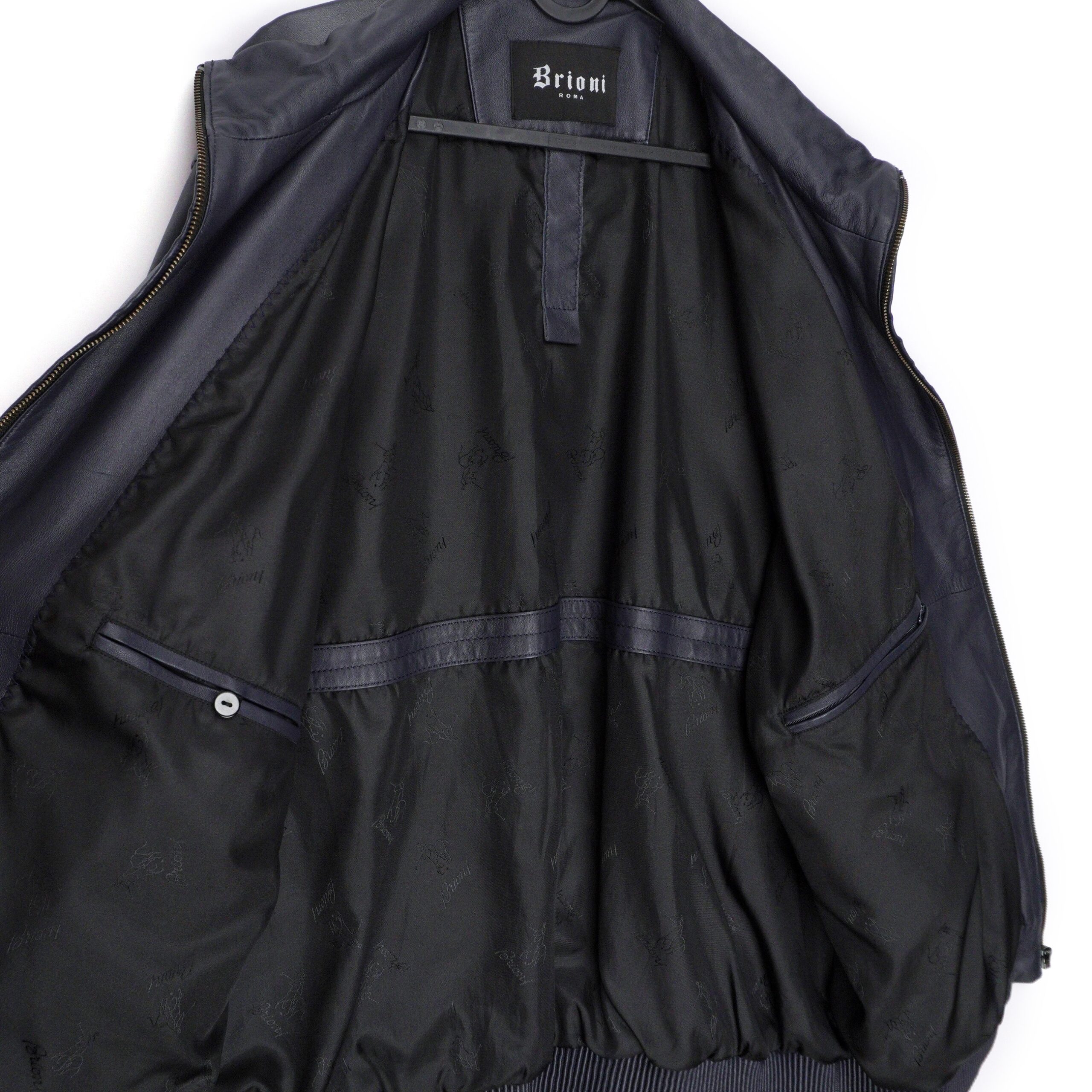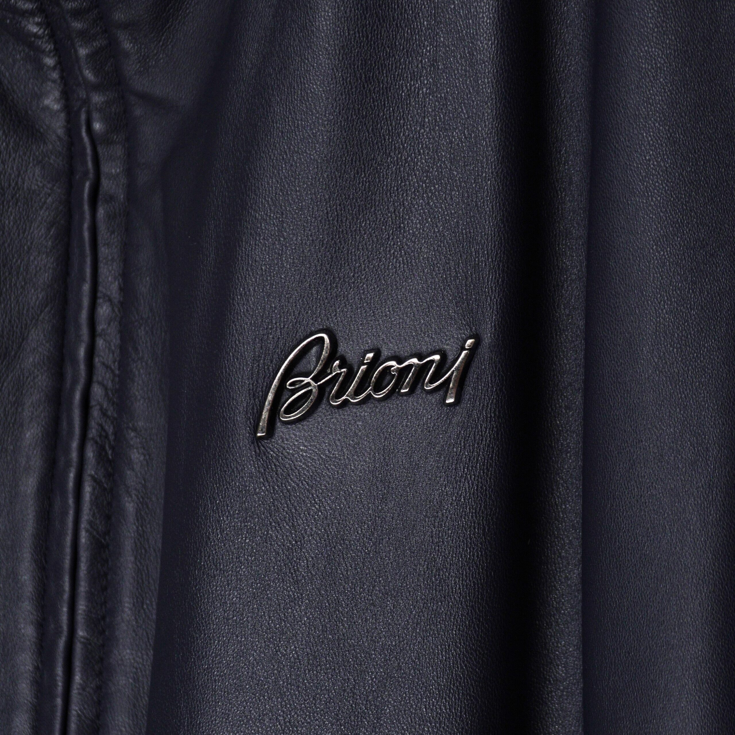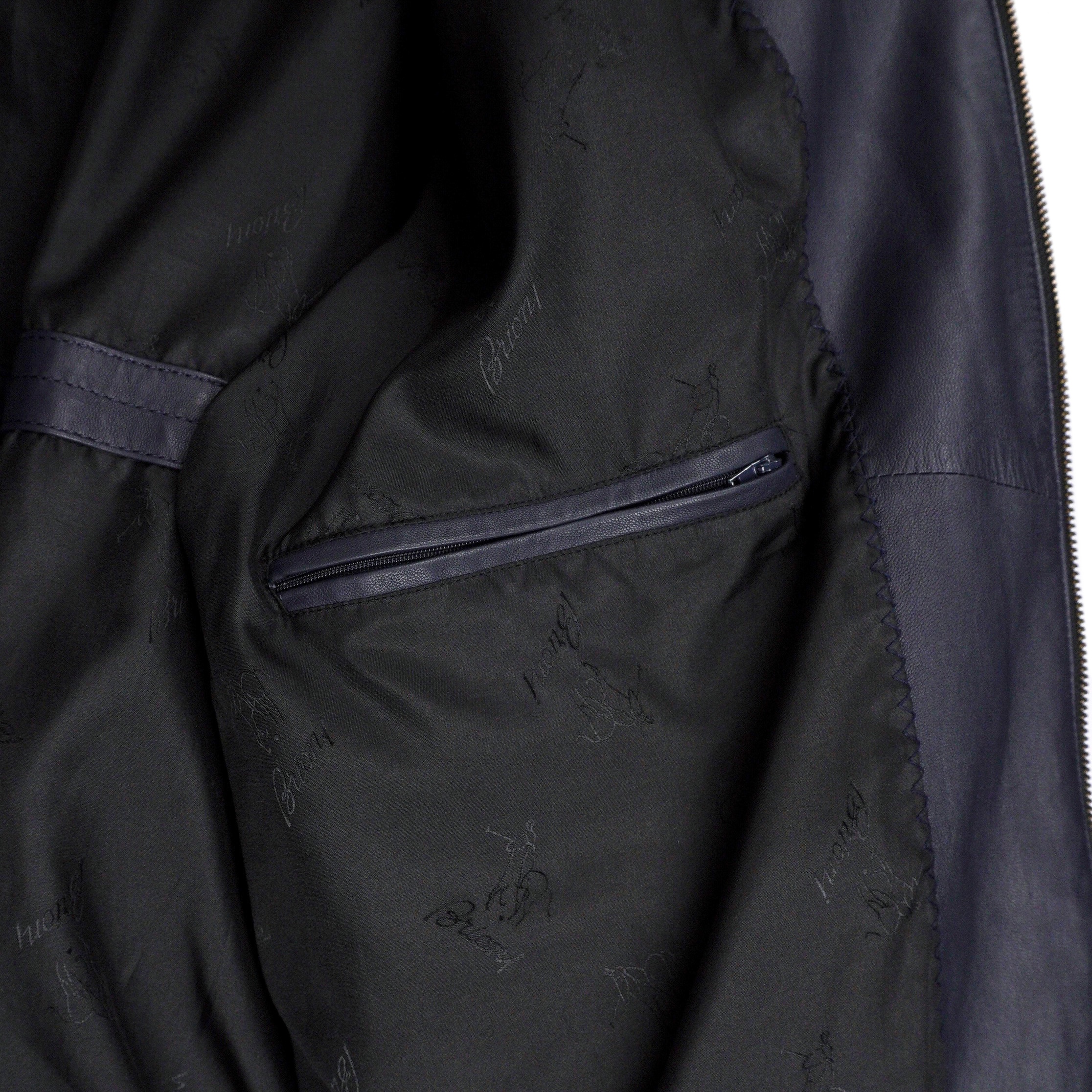 Brioni Navy Blue Metal Logo Leather Bomber Jacket