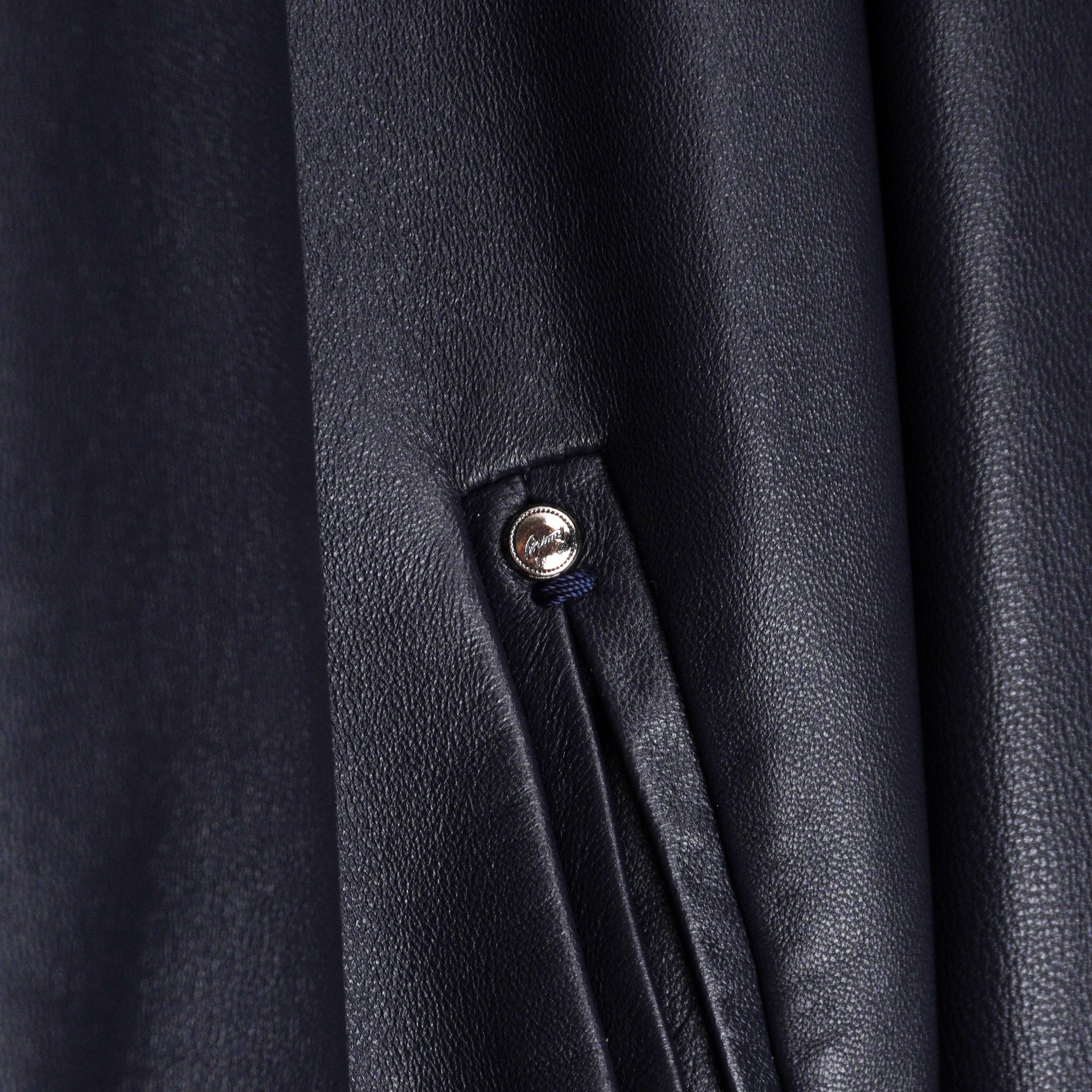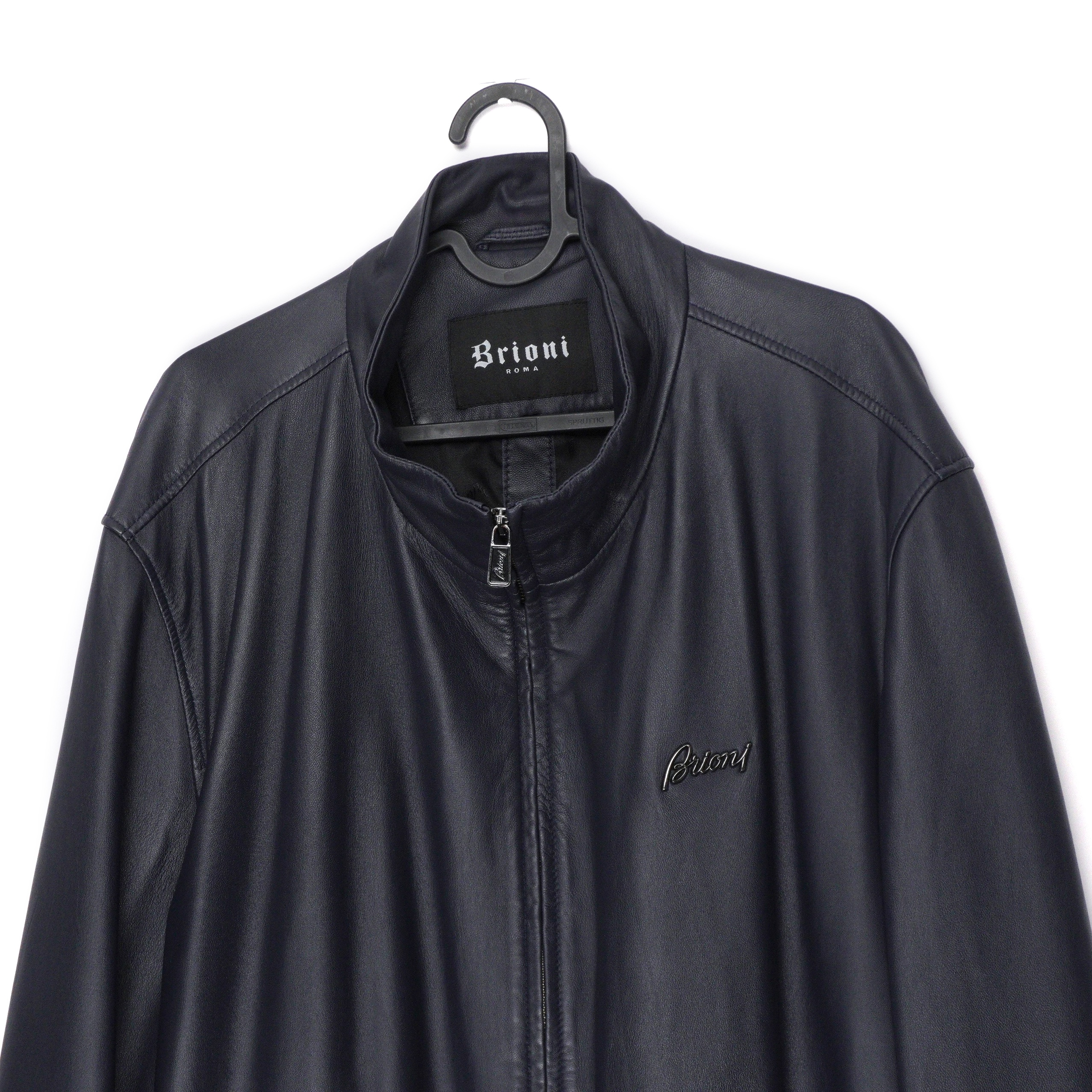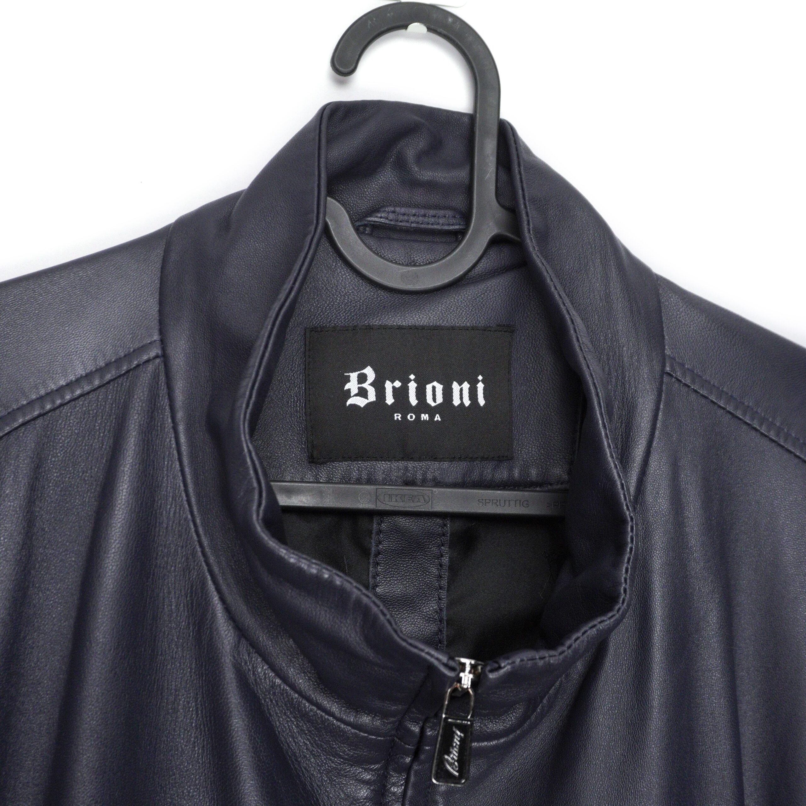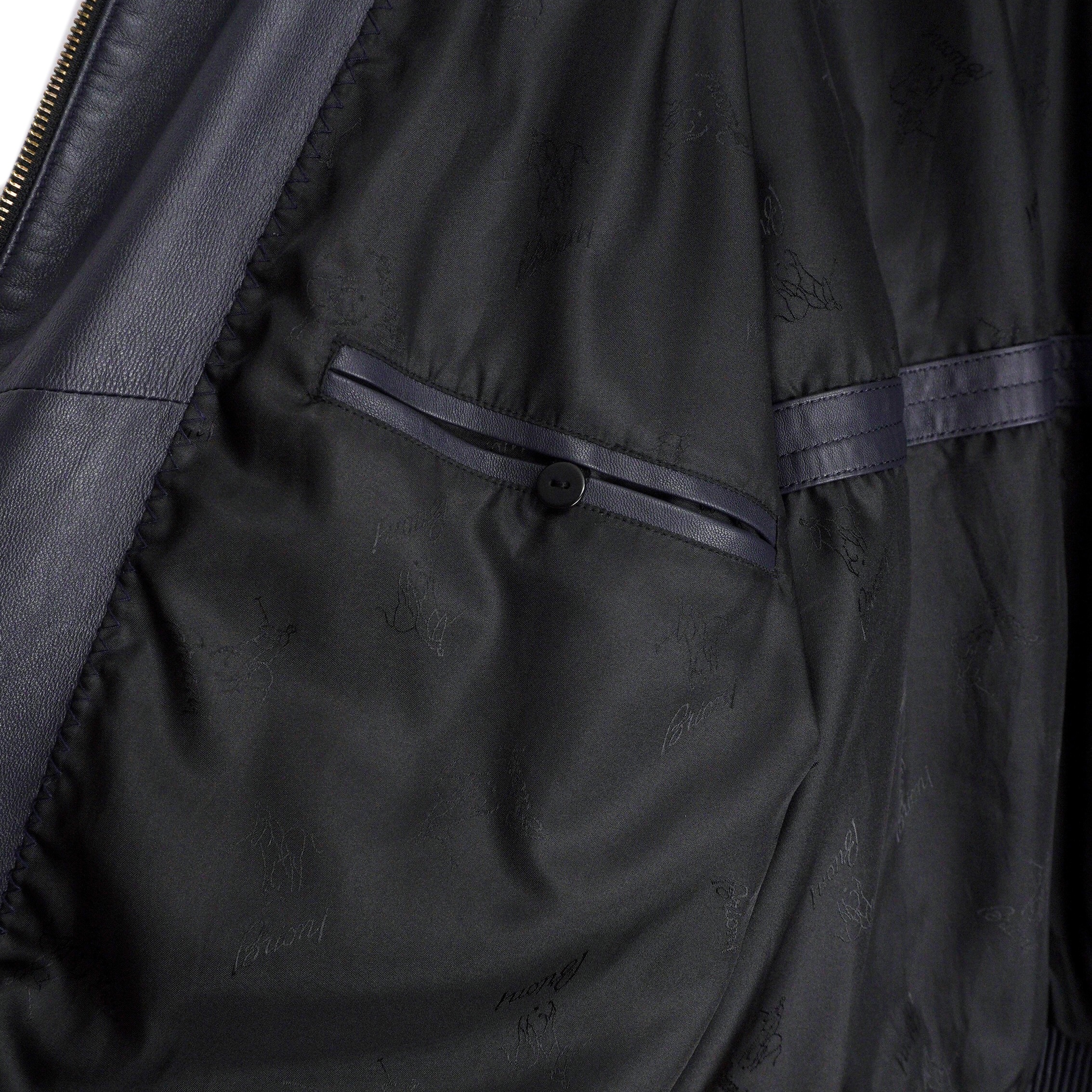 Brioni Navy Blue Metal Logo Leather Bomber Jacket
