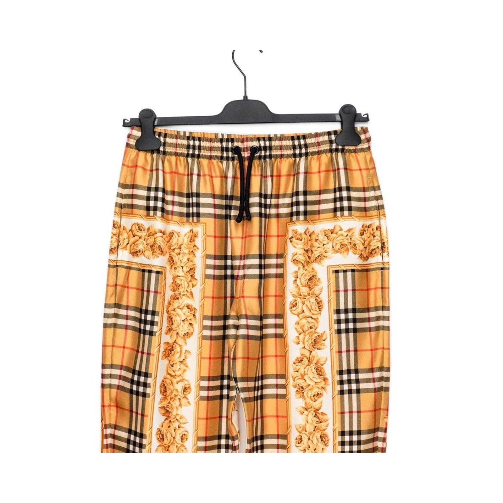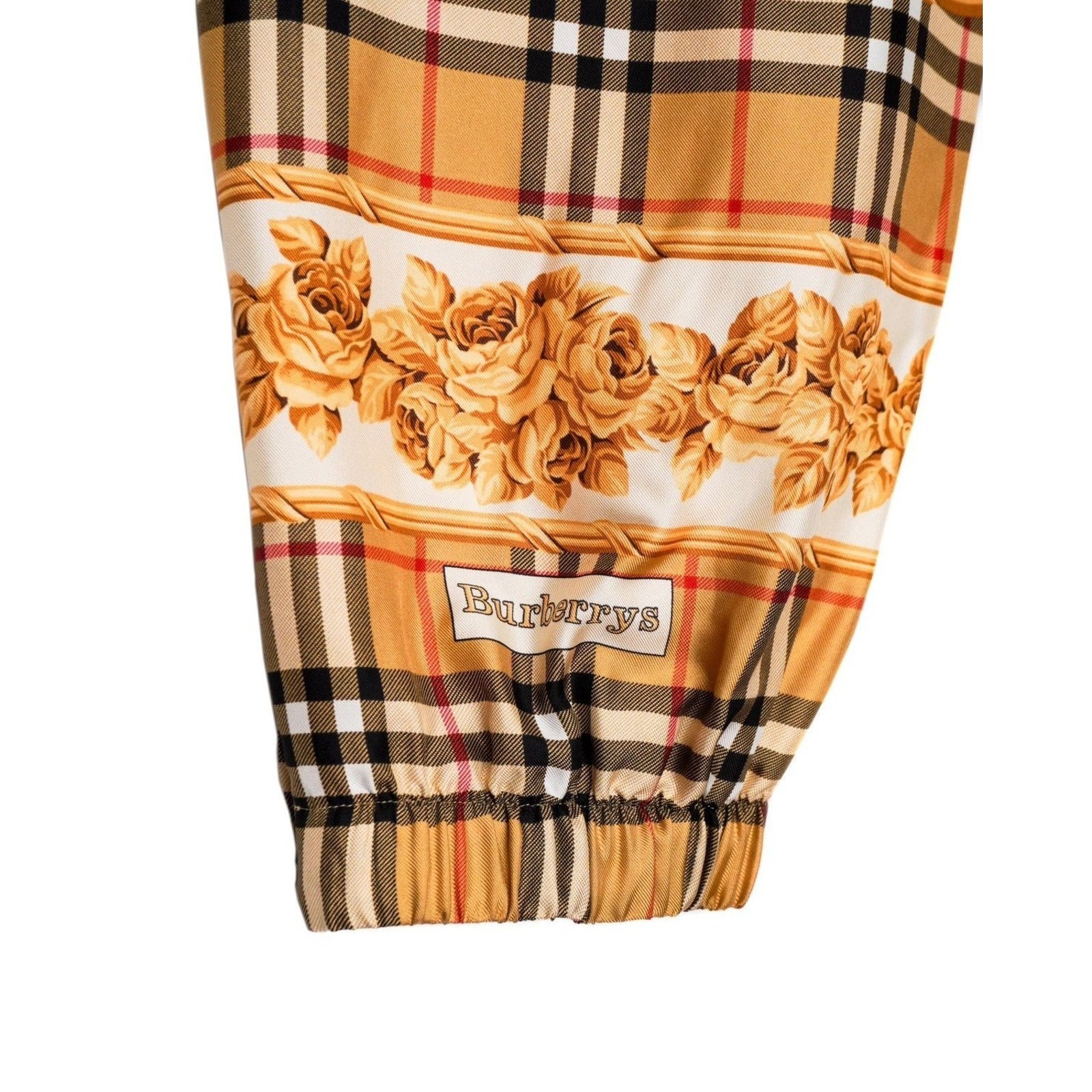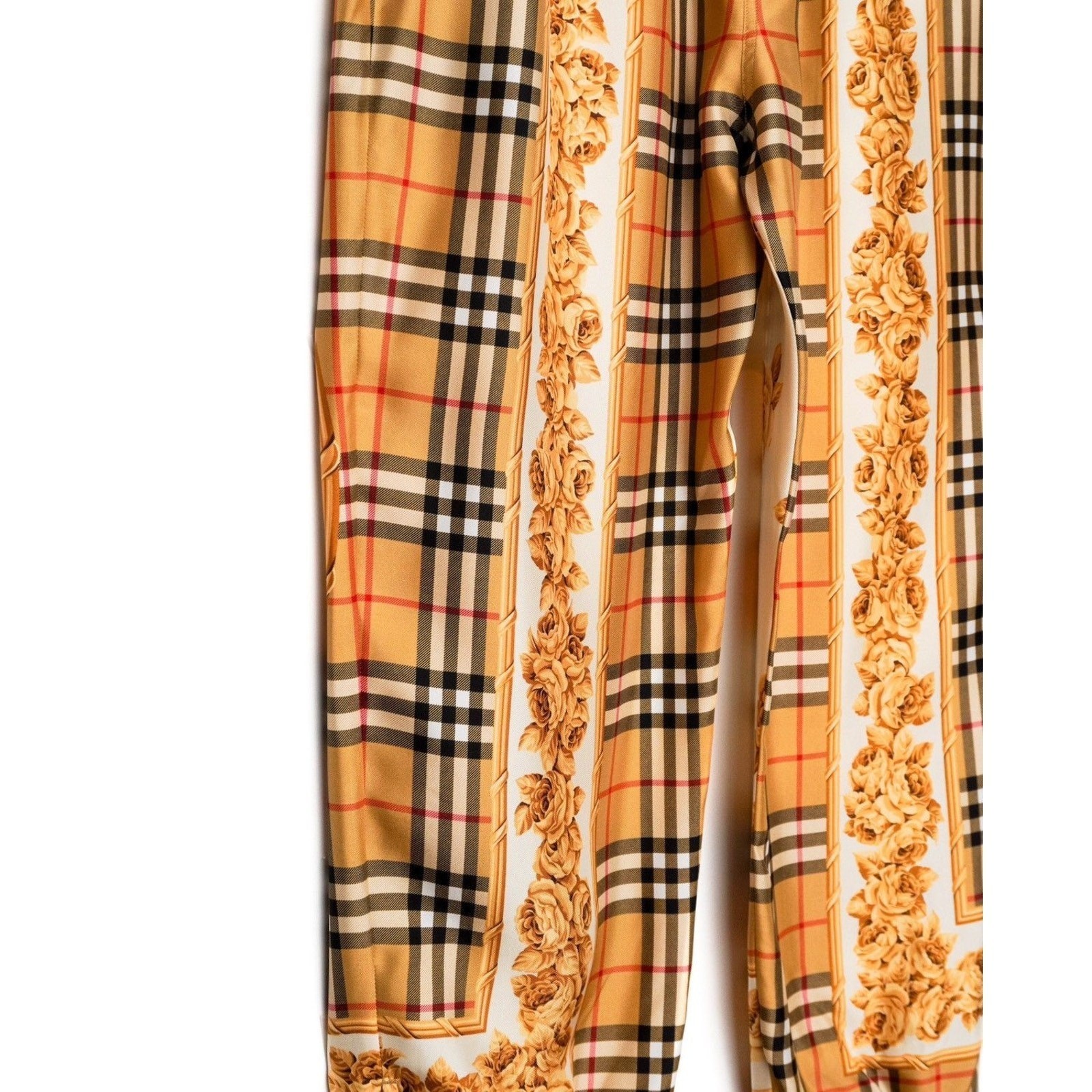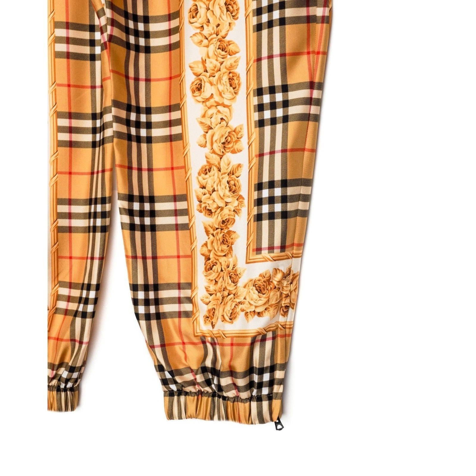 These Burberry silk joggers are a luxurious blend of heritage design and modern elegance. Crafted in Poland from 100% silk, they showcase Burberry’s iconic Vintage Check pattern enriched with ornate golden rose motifs. The relaxed jogger silhouette, elastic waistband with drawstring, and elastic cuffs with zipper accents provide both comfort and elevated style. A standout piece for those who appreciate refined fashion with a bold visual statement.
