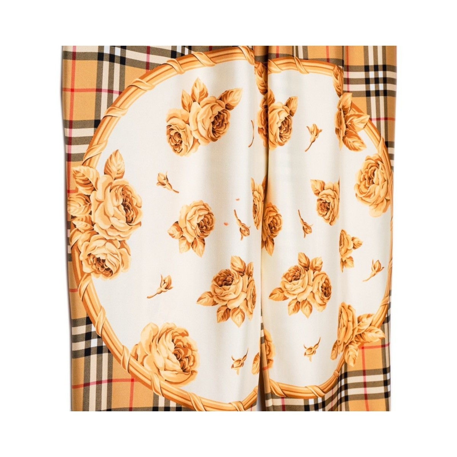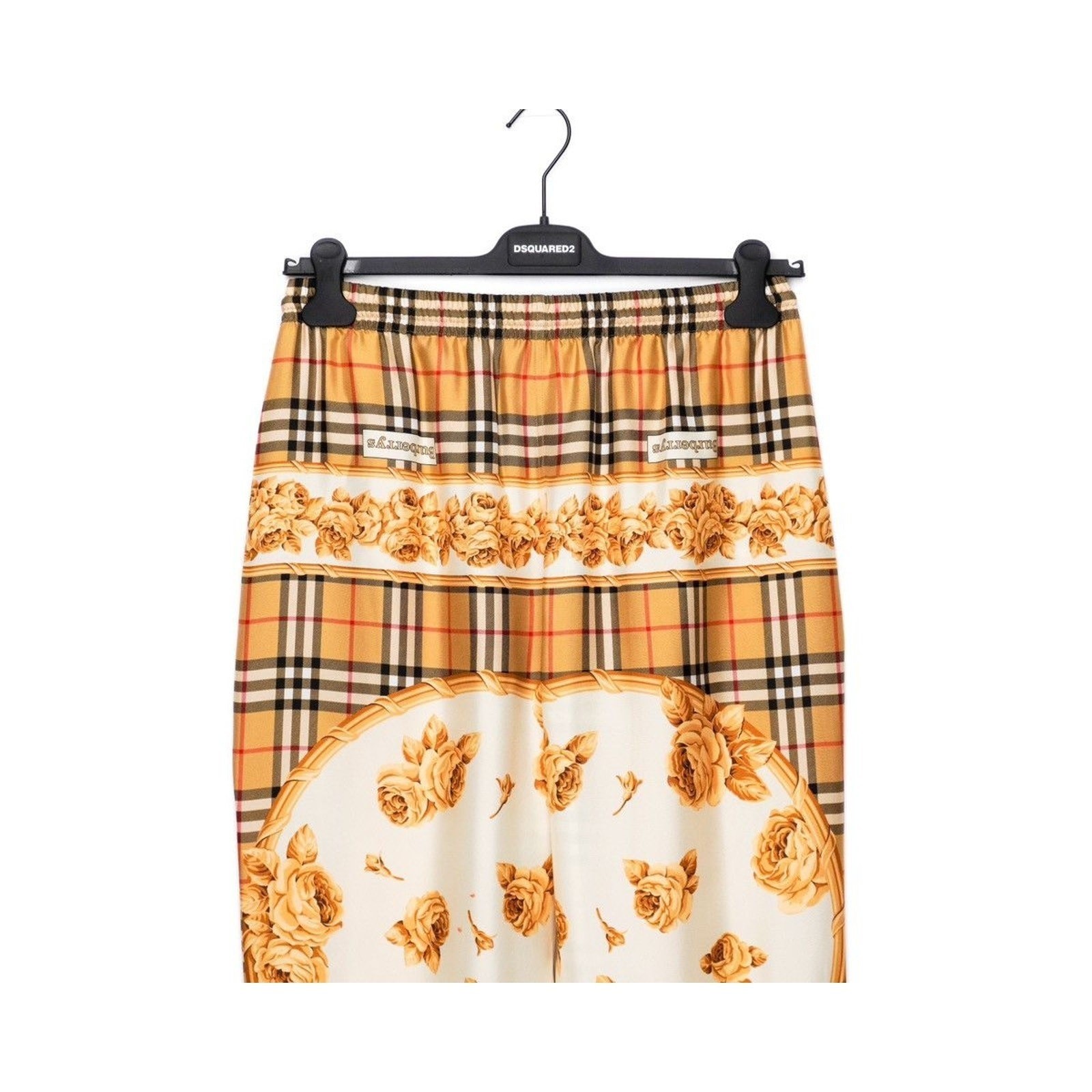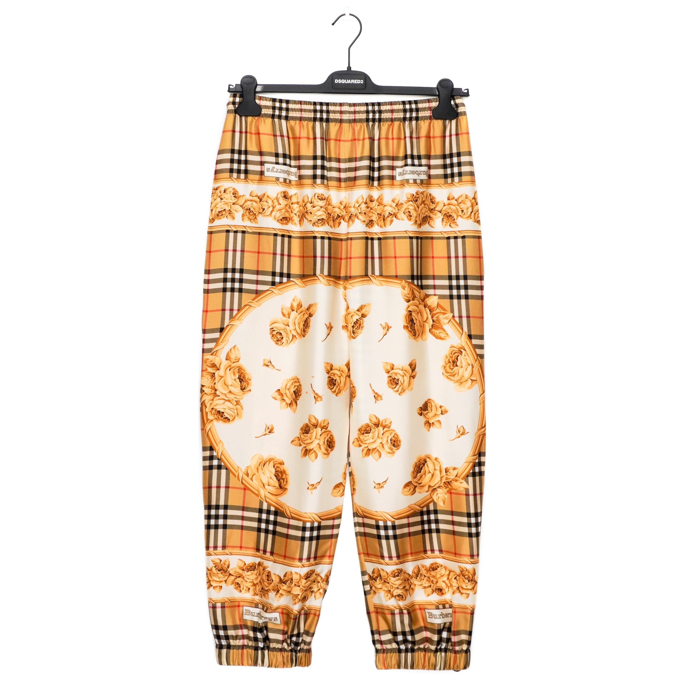 These Burberry silk joggers are a luxurious blend of heritage design and modern elegance. Crafted in Poland from 100% silk, they showcase Burberry’s iconic Vintage Check pattern enriched with ornate golden rose motifs. The relaxed jogger silhouette, elastic waistband with drawstring, and elastic cuffs with zipper accents provide both comfort and elevated style. A standout piece for those who appreciate refined fashion with a bold visual statement.