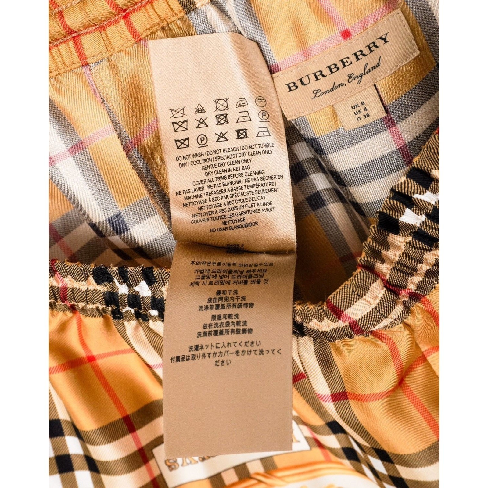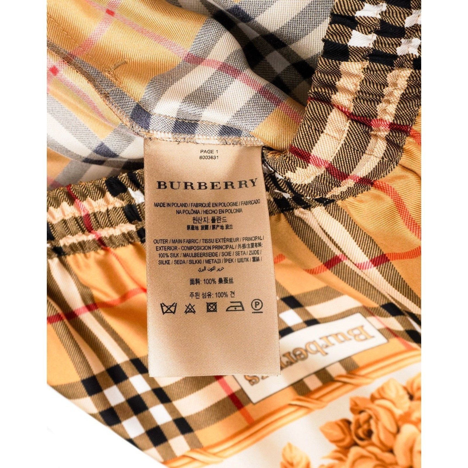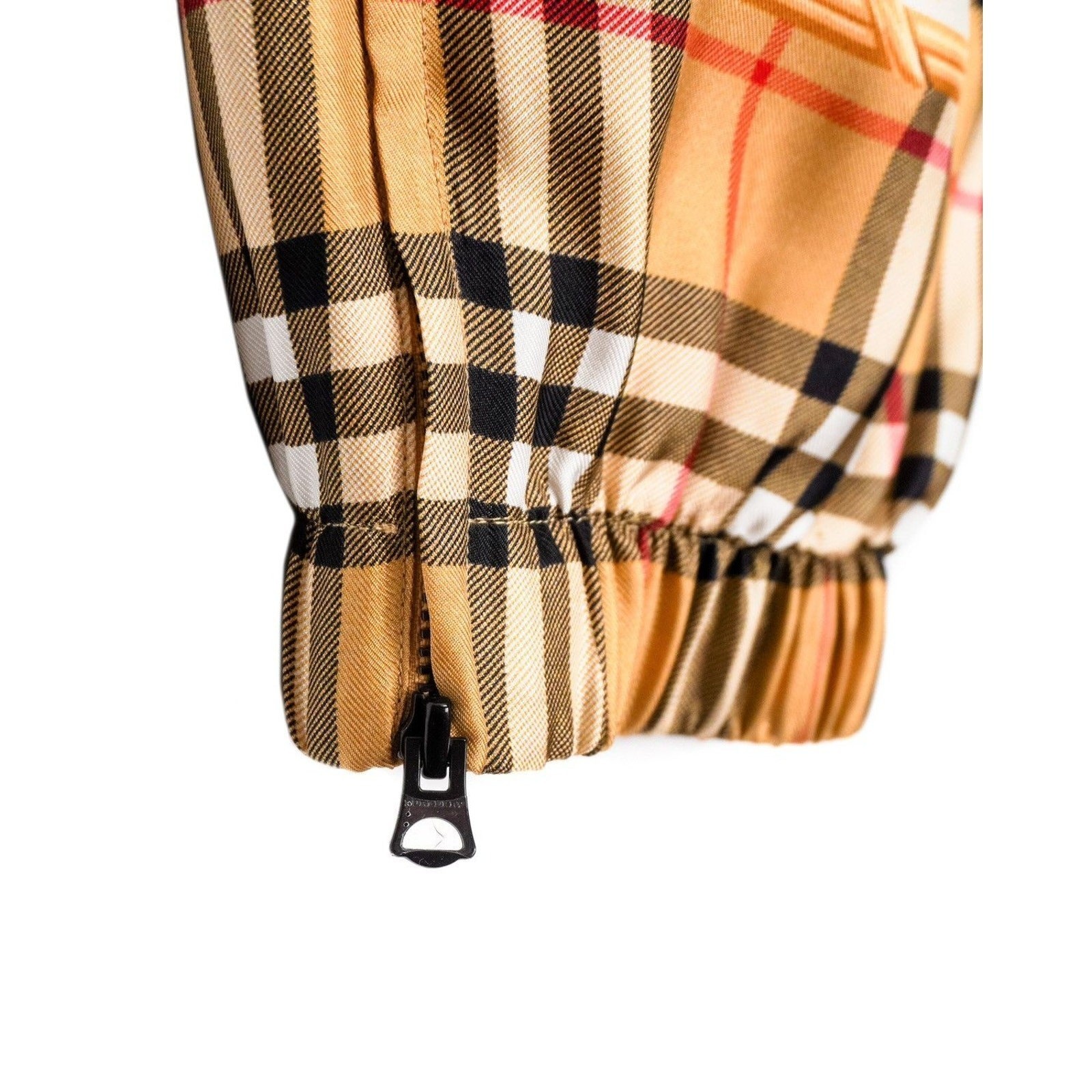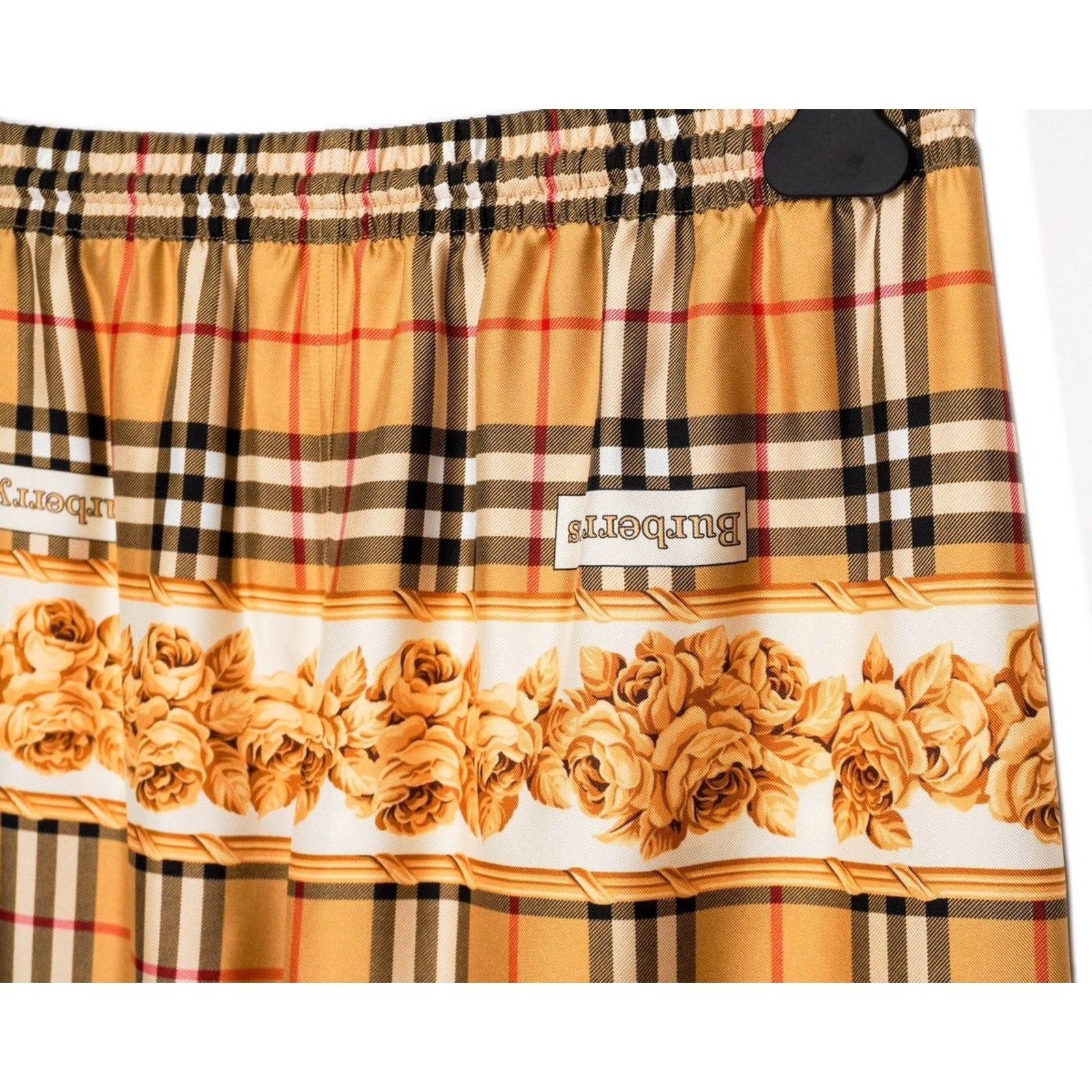 These Burberry silk joggers are a luxurious blend of heritage design and modern elegance. Crafted in Poland from 100% silk, they showcase Burberry’s iconic Vintage Check pattern enriched with ornate golden rose motifs. The relaxed jogger silhouette, elastic waistband with drawstring, and elastic cuffs with zipper accents provide both comfort and elevated style. A standout piece for those who appreciate refined fashion with a bold visual statement.