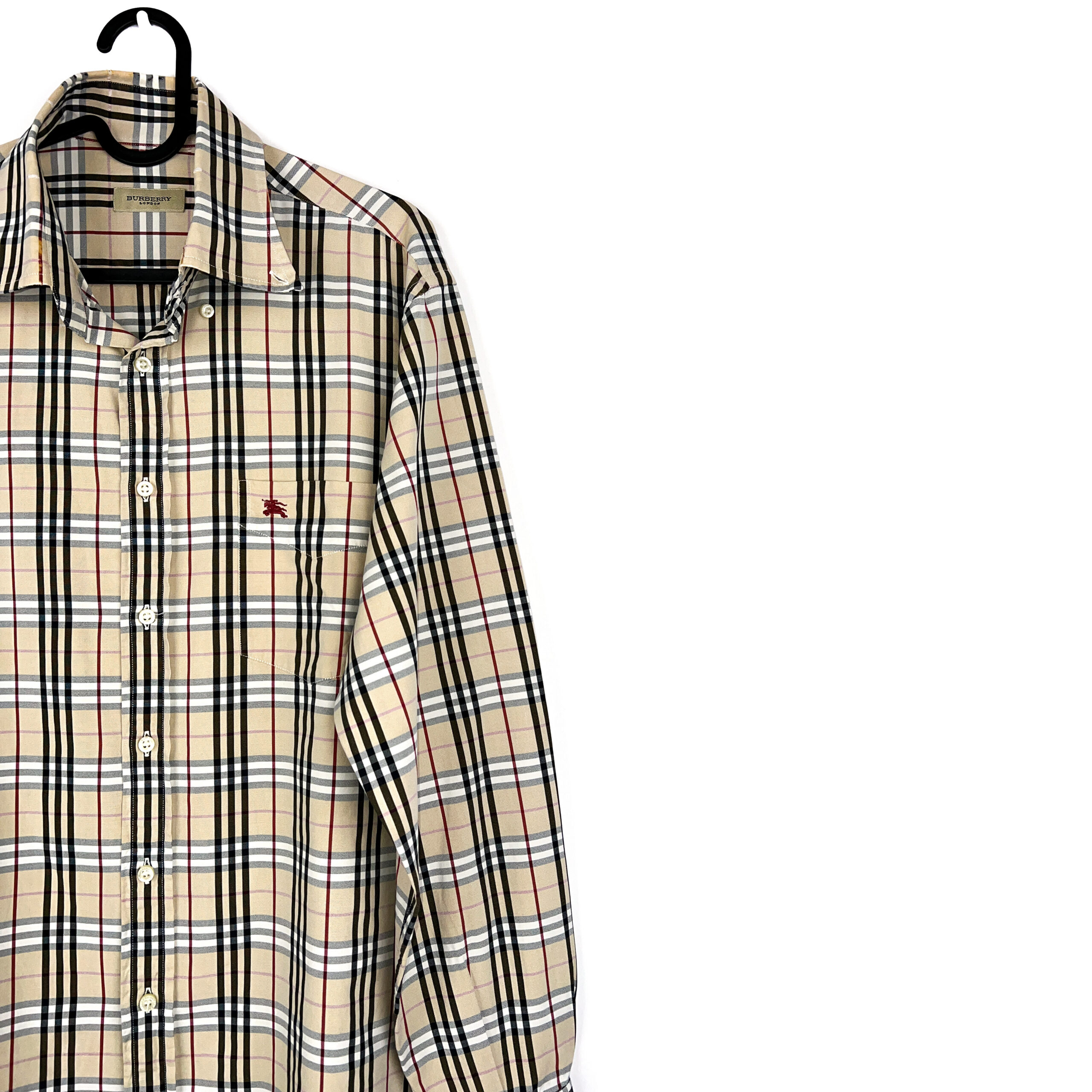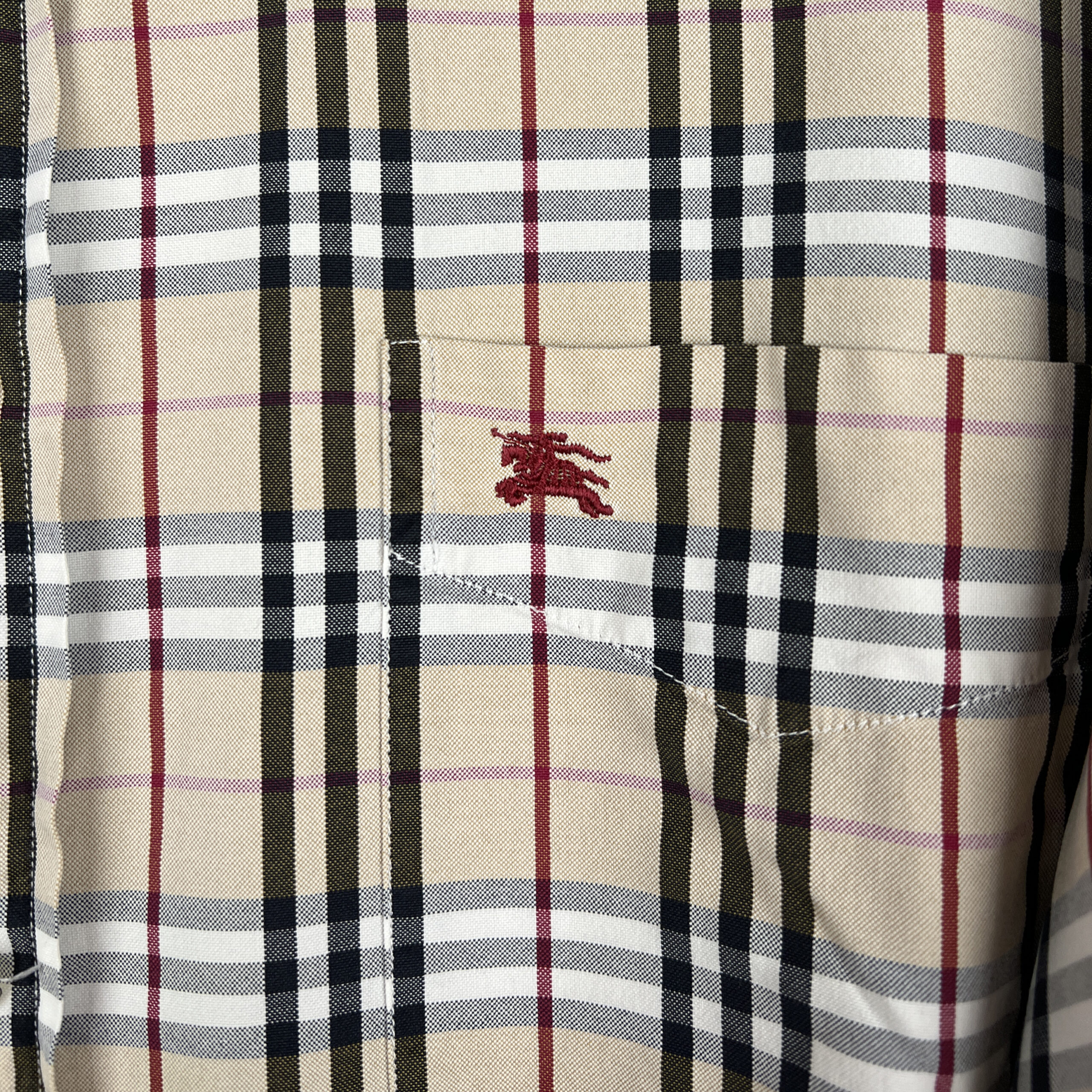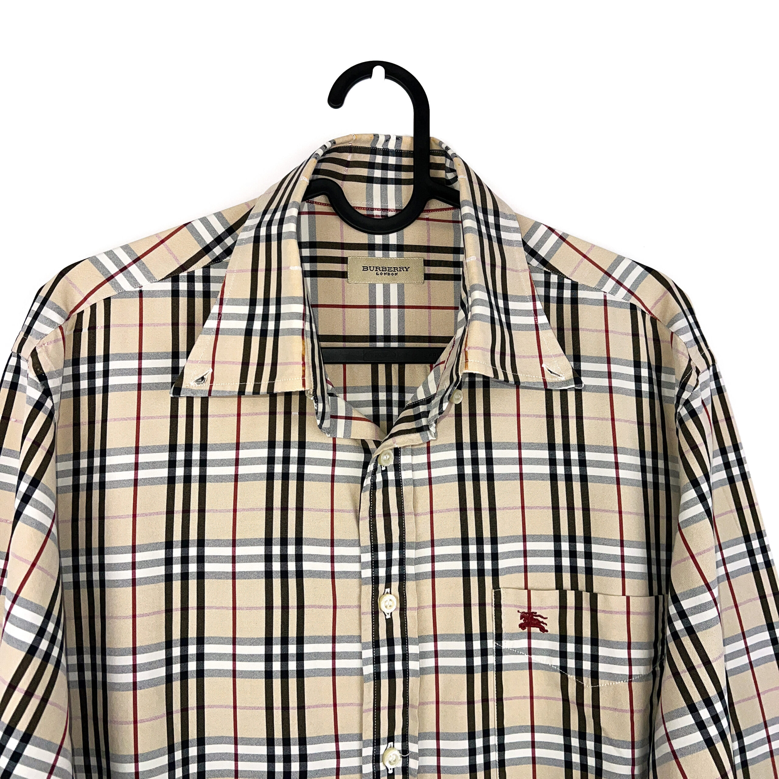 Burberry presents this vintage checked shirt in its iconic beige, black, and red plaid pattern. Crafted from lightweight polyester, the shirt combines the house’s heritage design with casual sophistication. The front features button closure, a pointed collar, and an embroidered Burberry equestrian knight logo on the chest pocket. With its relaxed fit and timeless check motif, this shirt is a versatile wardrobe piece that pairs easily with both formal and casual styles.
