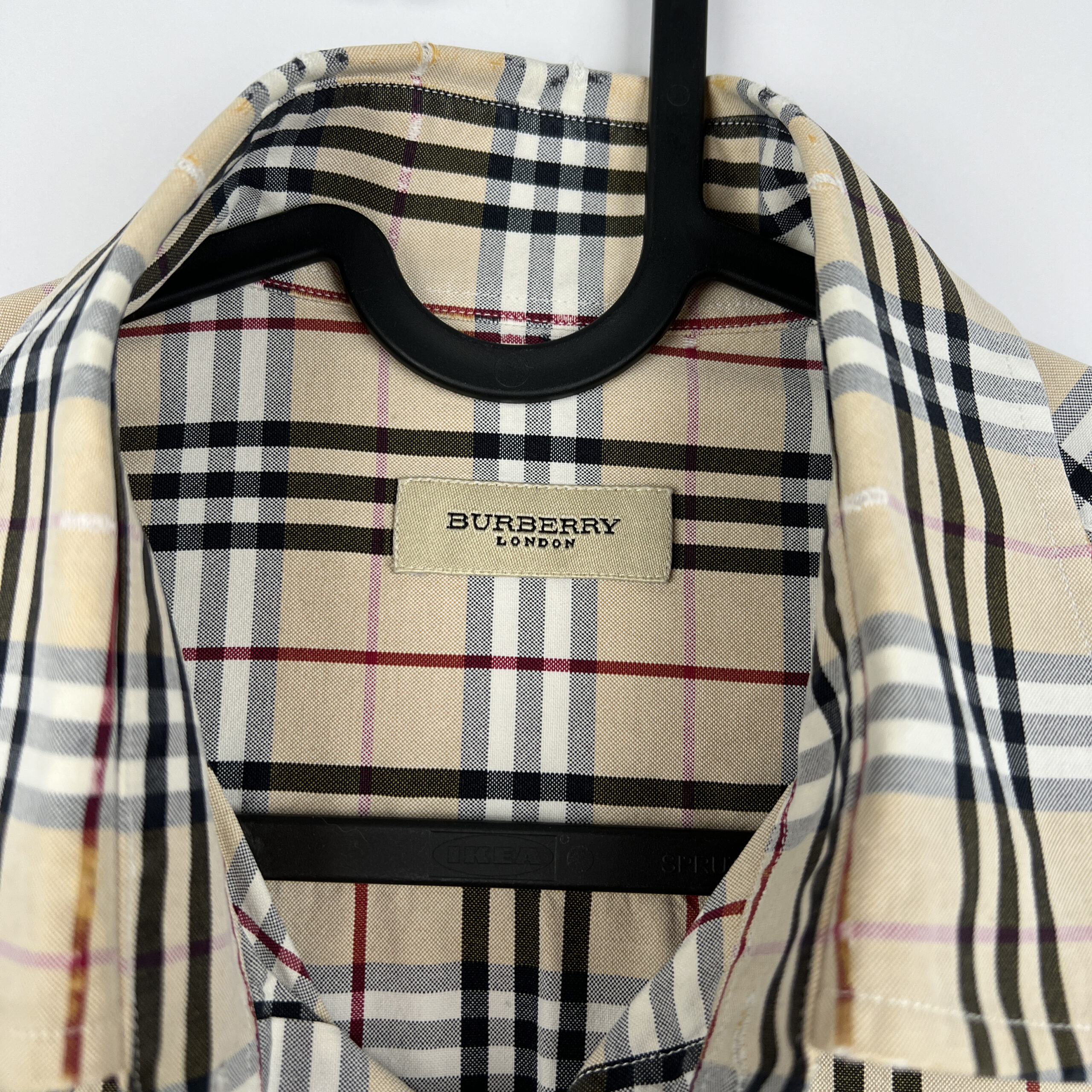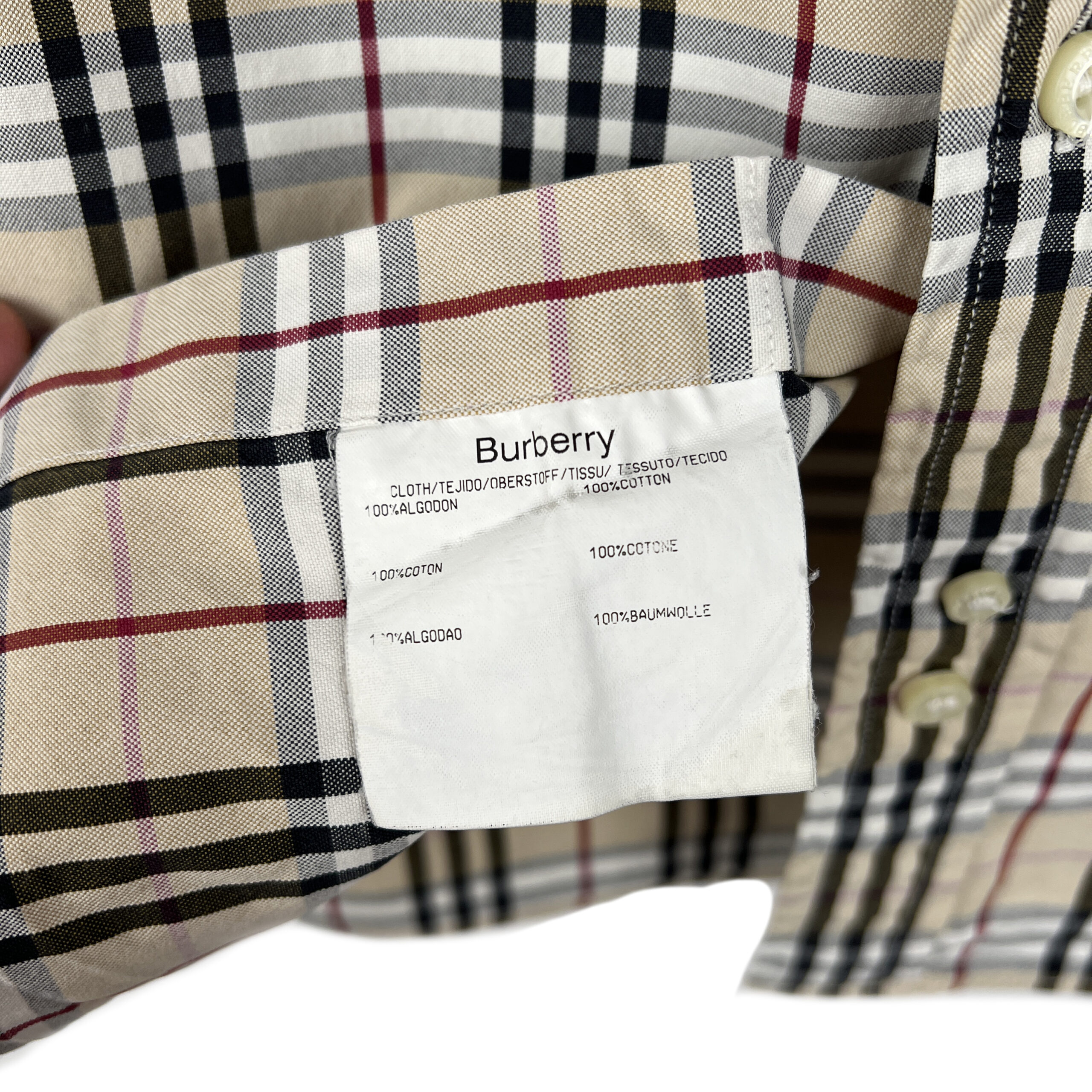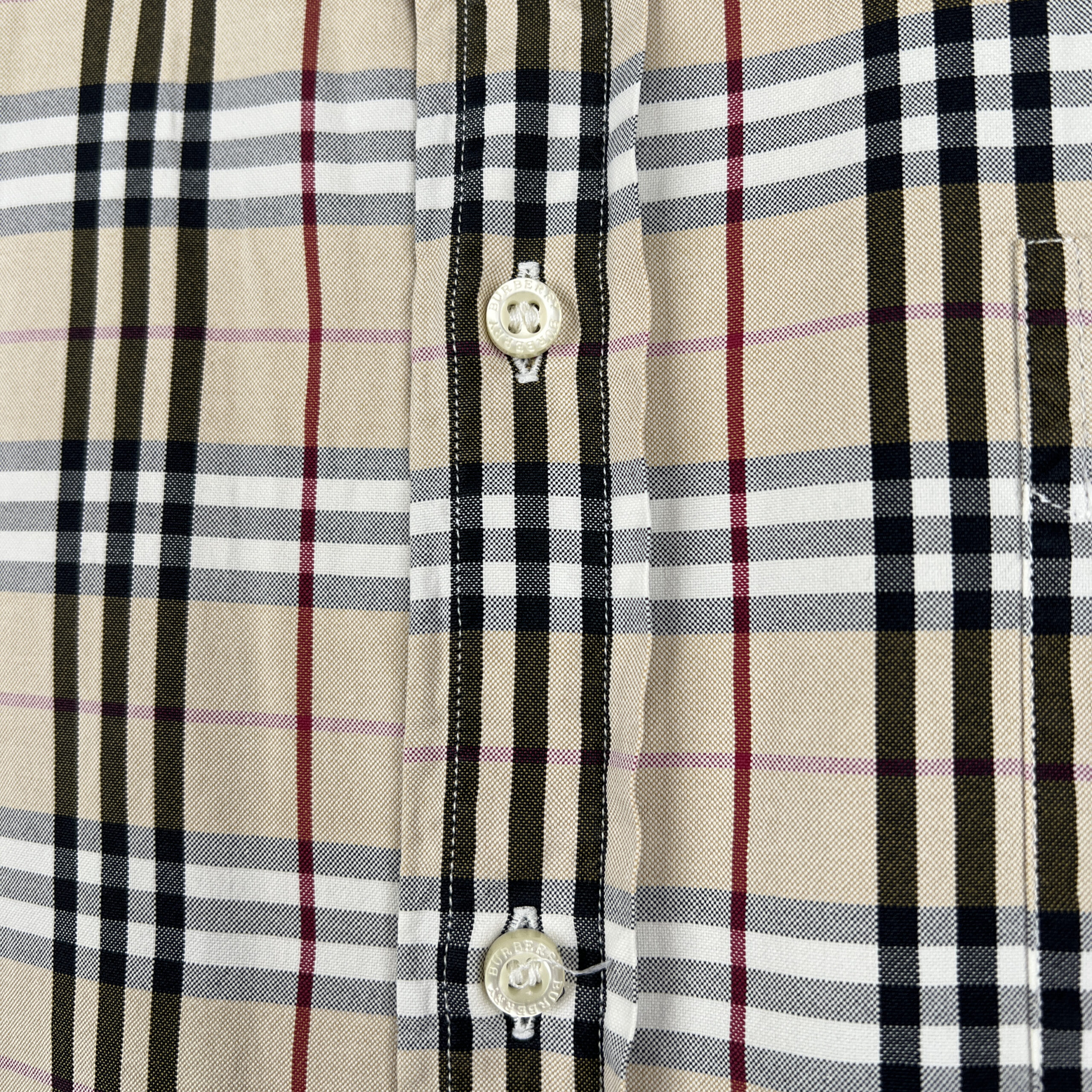 Burberry presents this vintage checked shirt in its iconic beige, black, and red plaid pattern. Crafted from lightweight polyester, the shirt combines the house’s heritage design with casual sophistication. The front features button closure, a pointed collar, and an embroidered Burberry equestrian knight logo on the chest pocket. With its relaxed fit and timeless check motif, this shirt is a versatile wardrobe piece that pairs easily with both formal and casual styles.