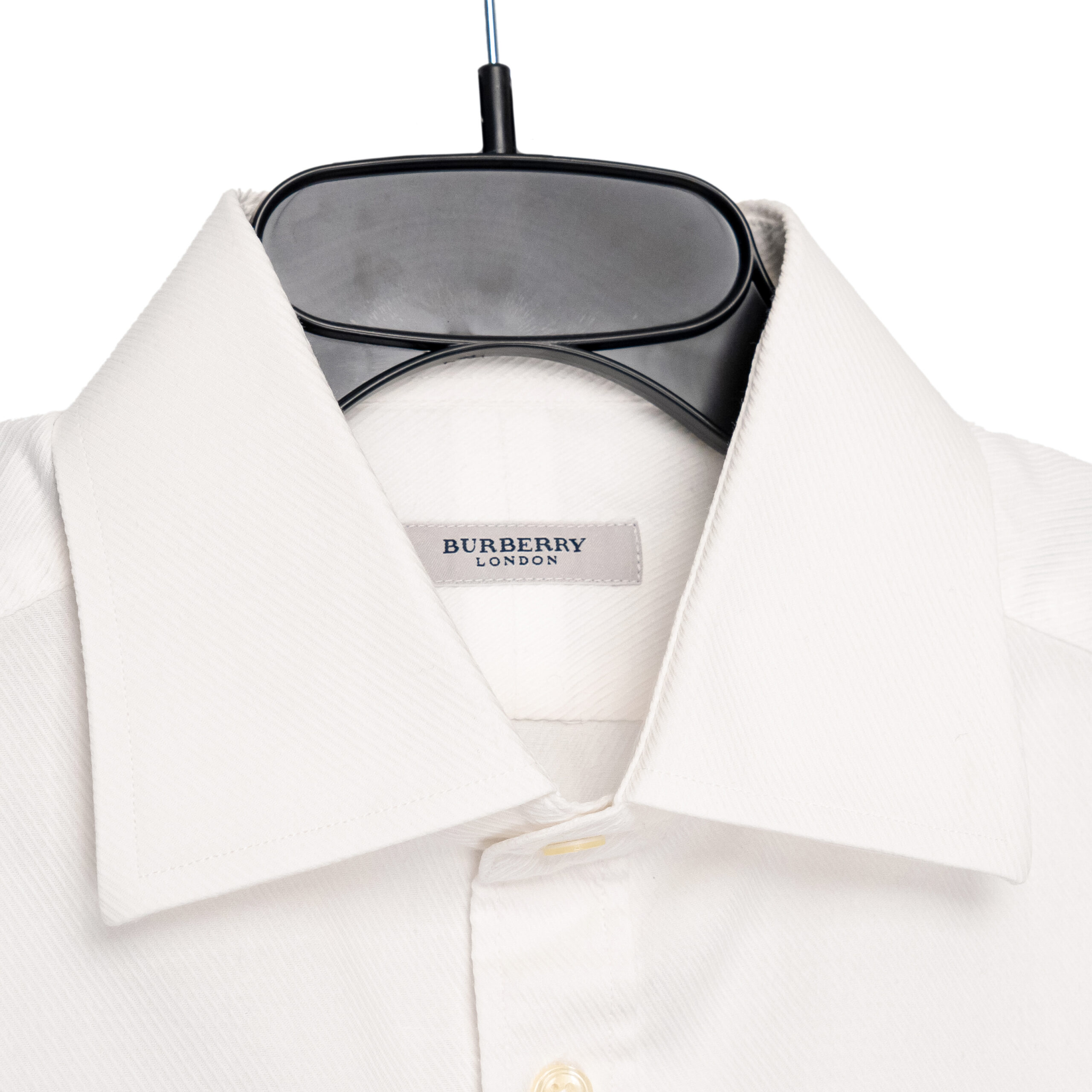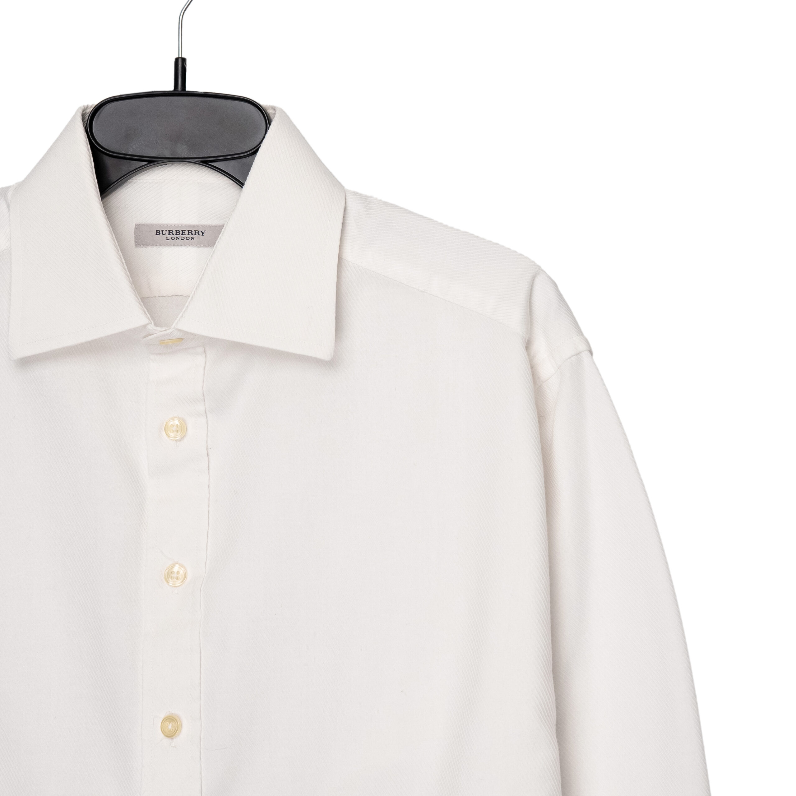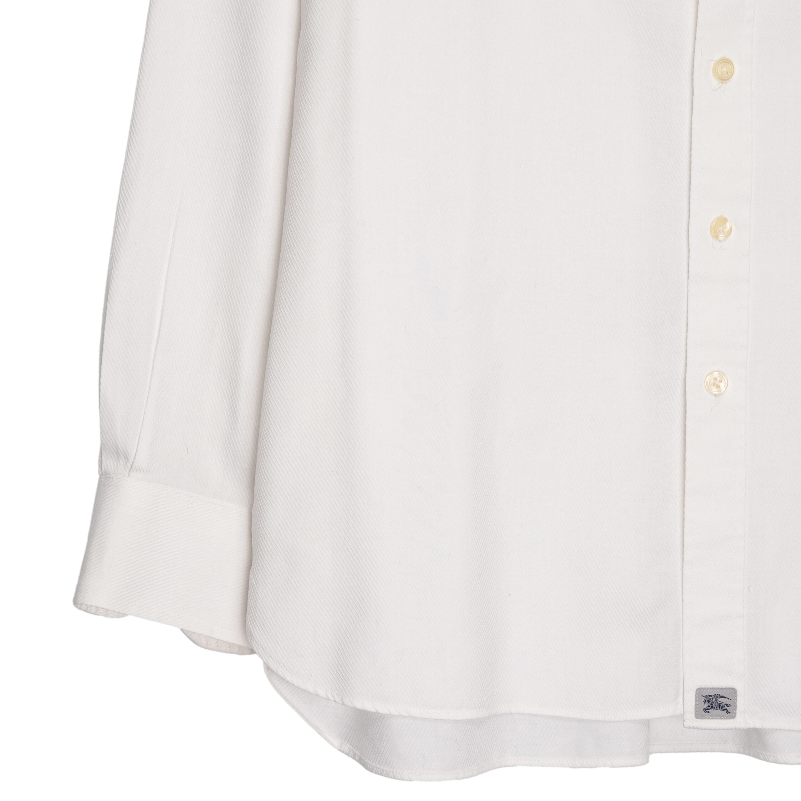 This Burberry London shirt is a refined staple that embodies timeless British tailoring. Crafted in a crisp white cotton blend, it features a classic point collar, button-down front, and long sleeves with structured cuffs. The clean lines and minimal detailing highlight the elegance of the design, while the subtle Burberry Equestrian Knight logo patch near the hem adds a discreet signature touch. A versatile piece, it transitions seamlessly from formal occasions to smart-casual styling.