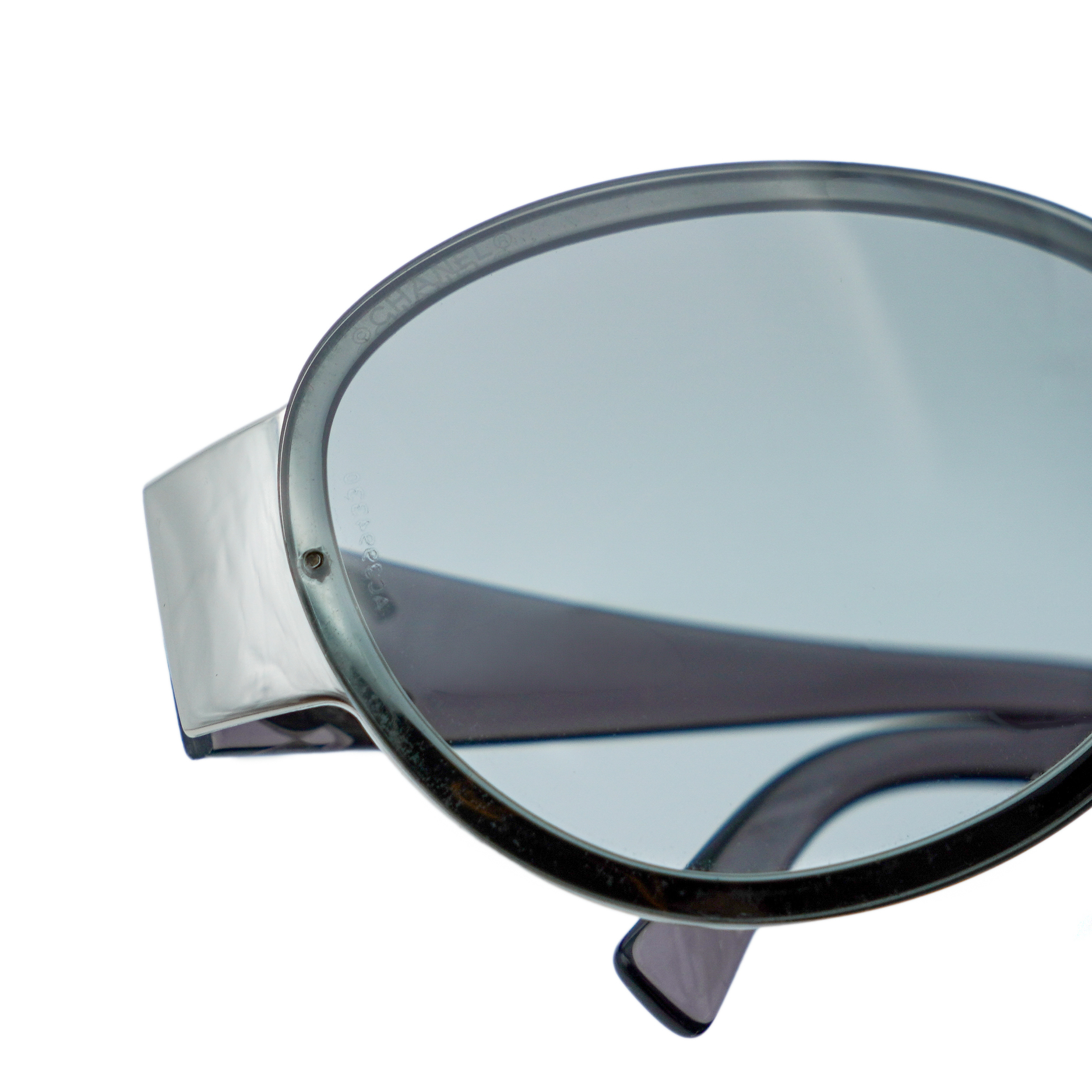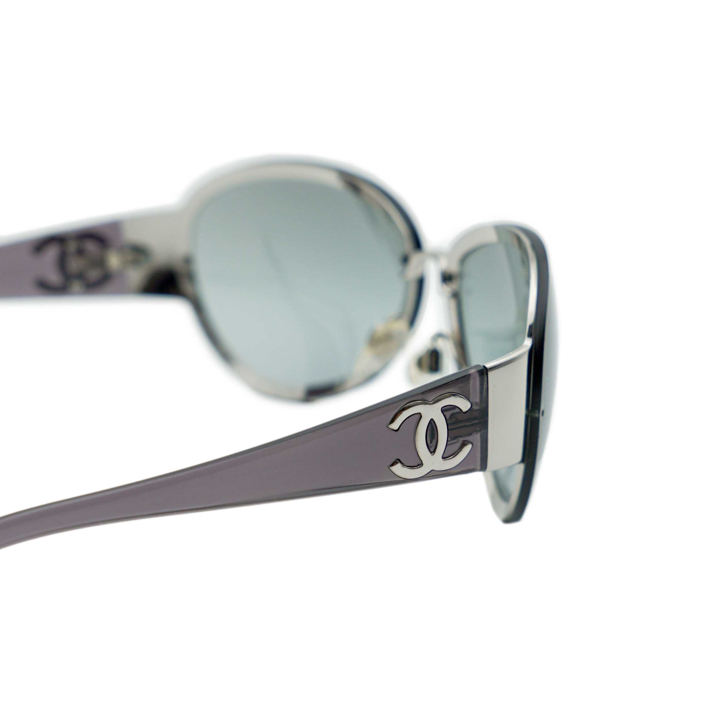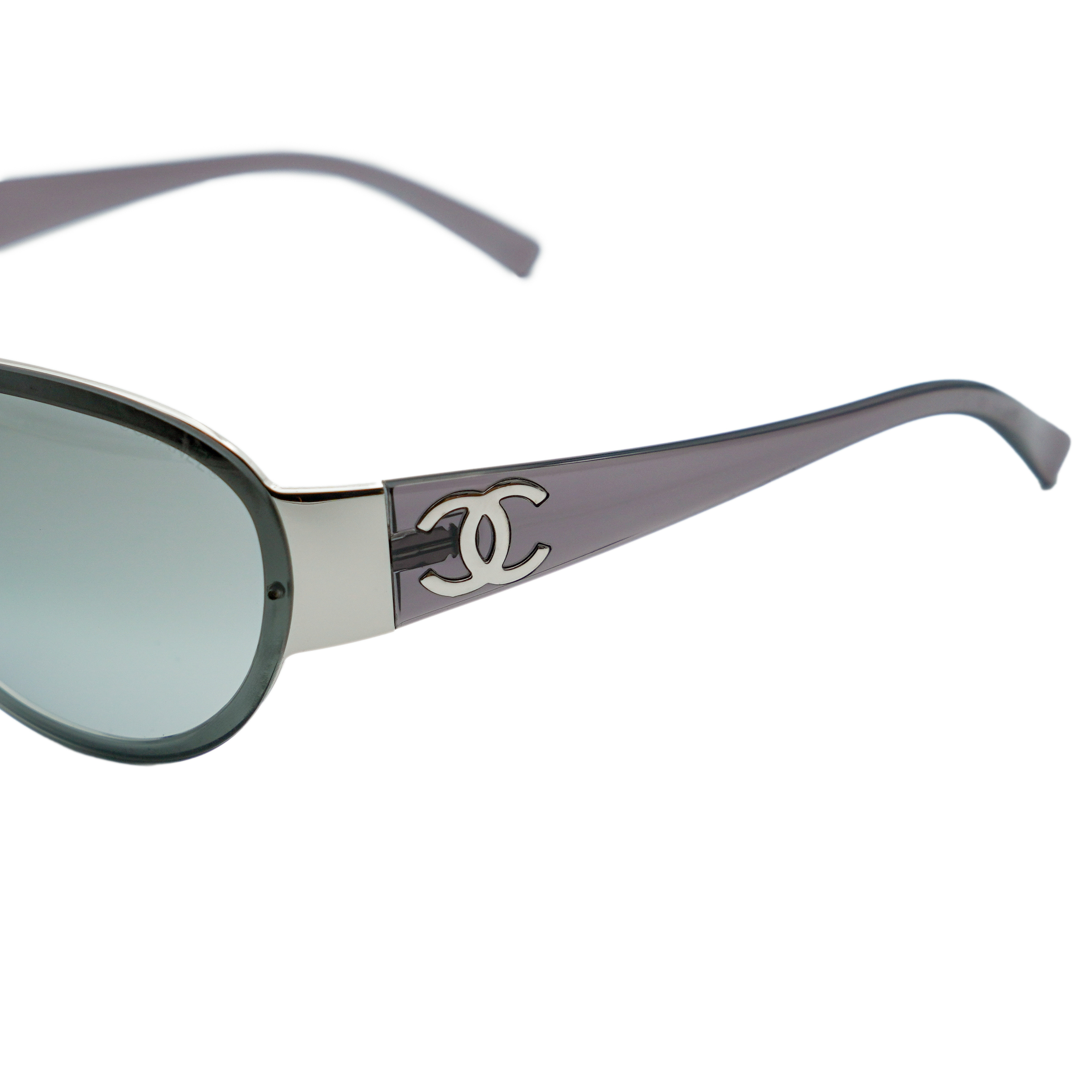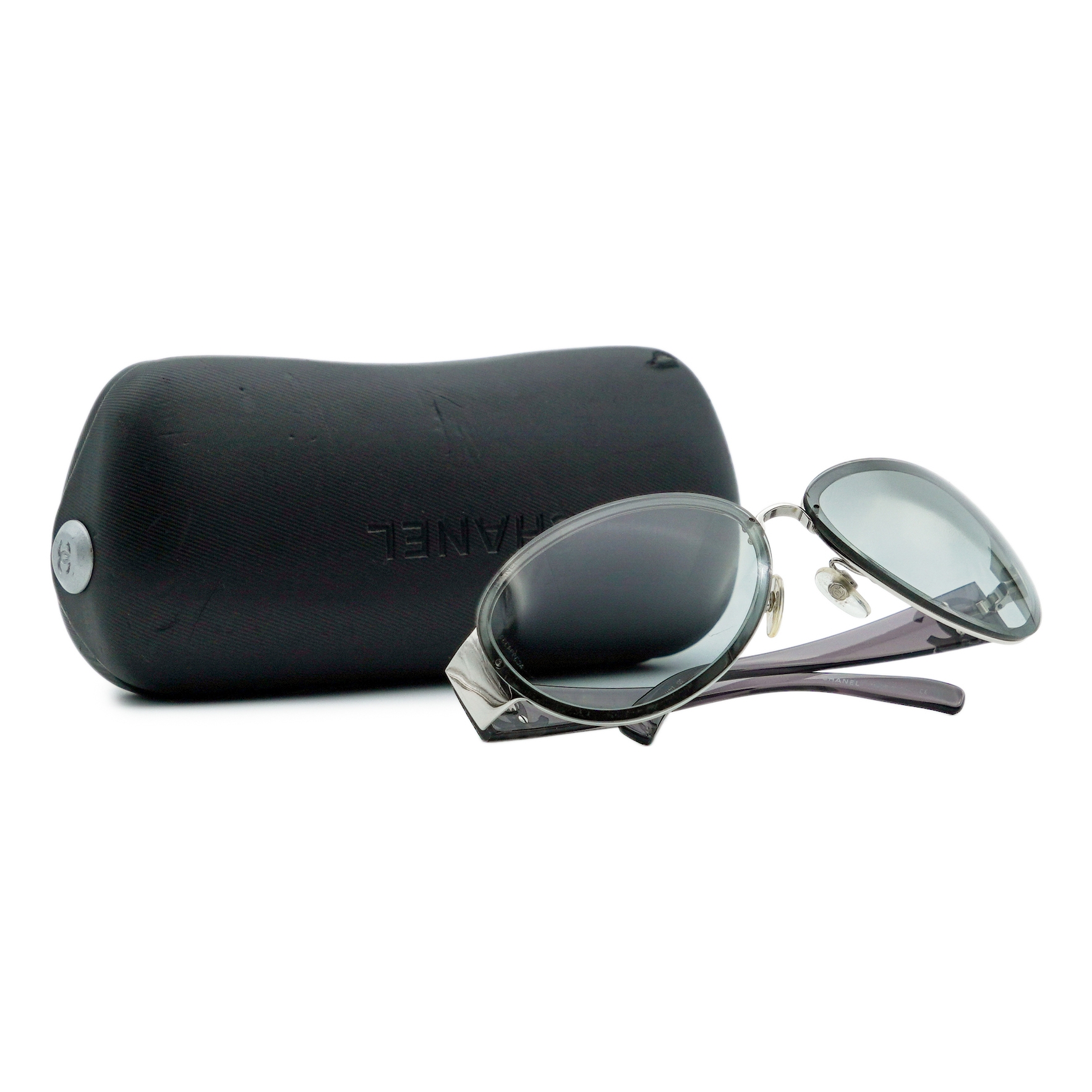 These Chanel sunglasses feature a refined oval silhouette with a silver-tone metal frame and translucent smoky grey temples. The soft blue gradient lenses create a light, elegant look, while the polished metal side panels are accented with the iconic interlocking CC logo. The combination of slim metal construction and semi-transparent acetate arms gives this model a modern early-2000s aesthetic with timeless Chanel sophistication. Adjustable nose pads ensure a comfortable fit. Crafted in Italy, this design blends subtle luxury with everyday versatility.