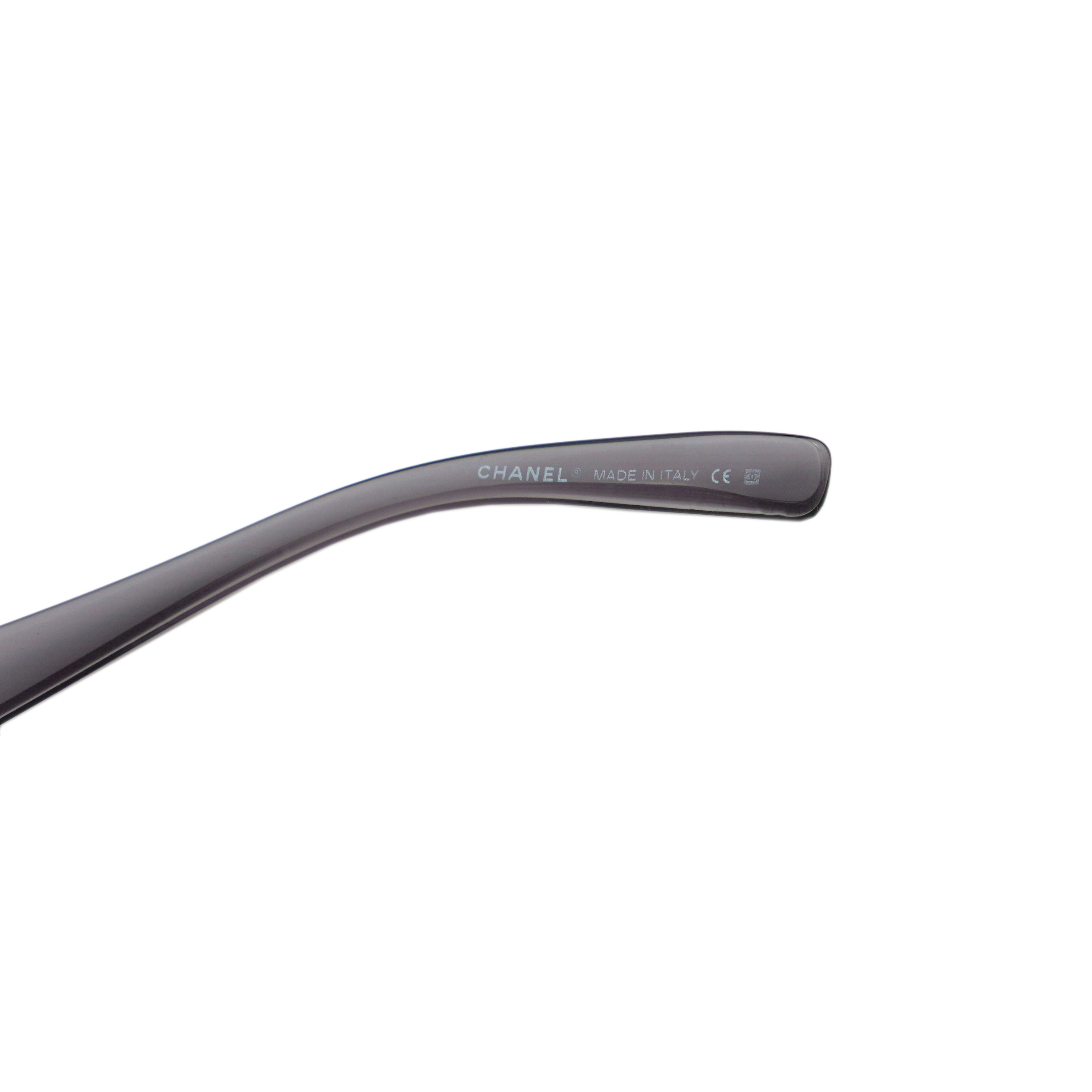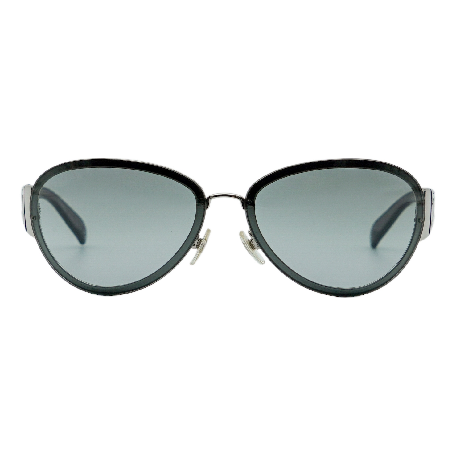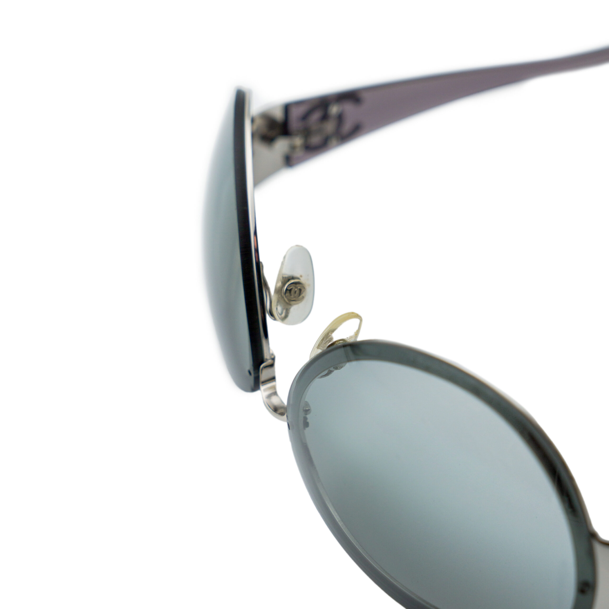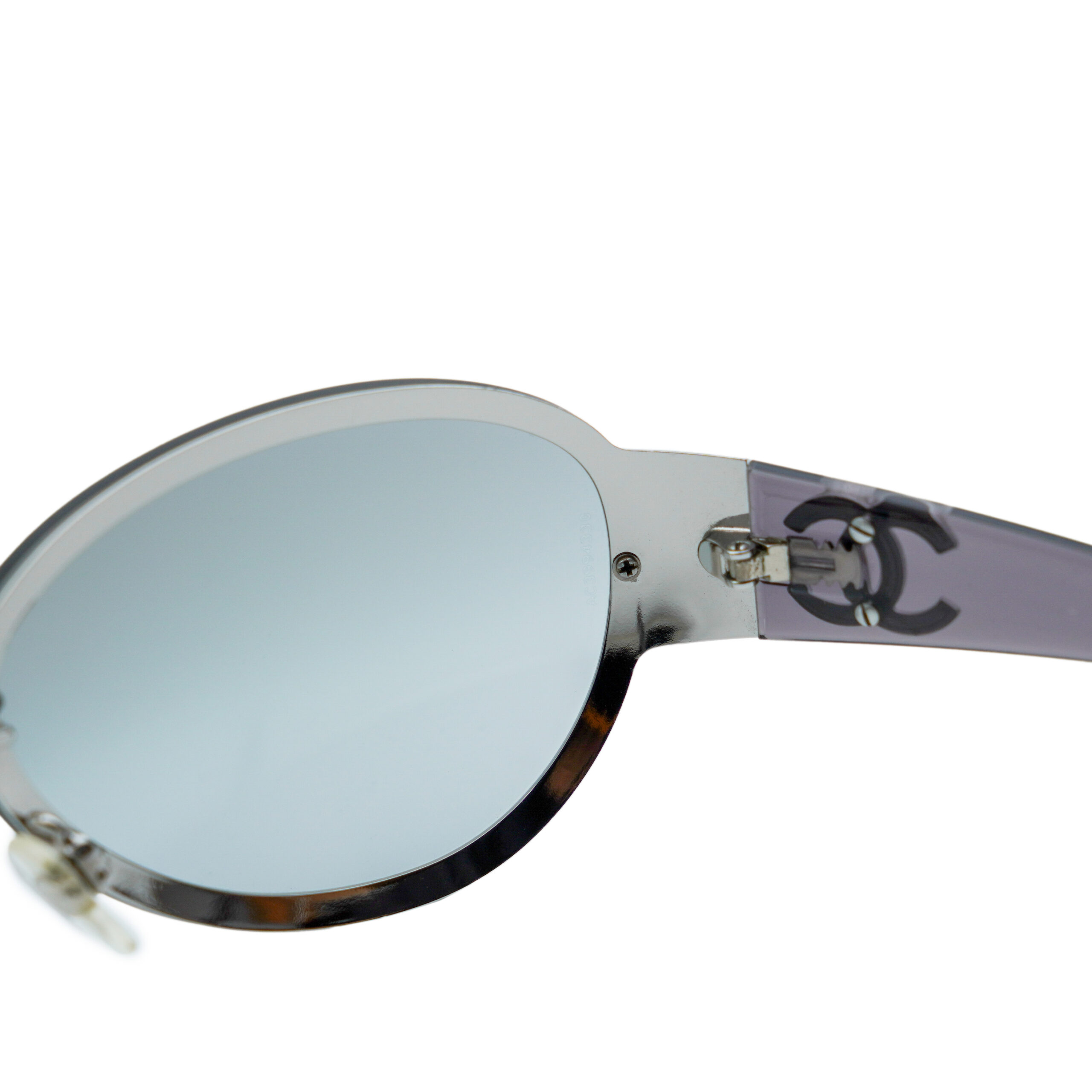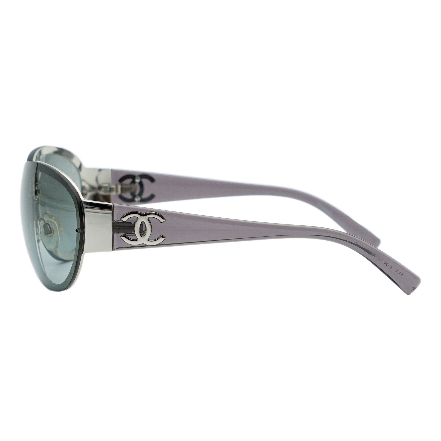 These Chanel sunglasses feature a refined oval silhouette with a silver-tone metal frame and translucent smoky grey temples. The soft blue gradient lenses create a light, elegant look, while the polished metal side panels are accented with the iconic interlocking CC logo. The combination of slim metal construction and semi-transparent acetate arms gives this model a modern early-2000s aesthetic with timeless Chanel sophistication. Adjustable nose pads ensure a comfortable fit. Crafted in Italy, this design blends subtle luxury with everyday versatility.