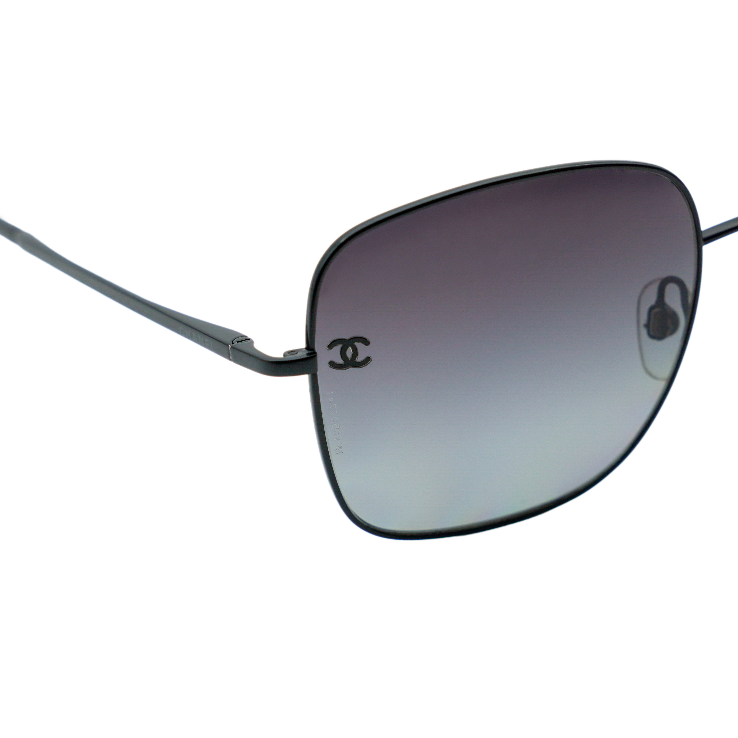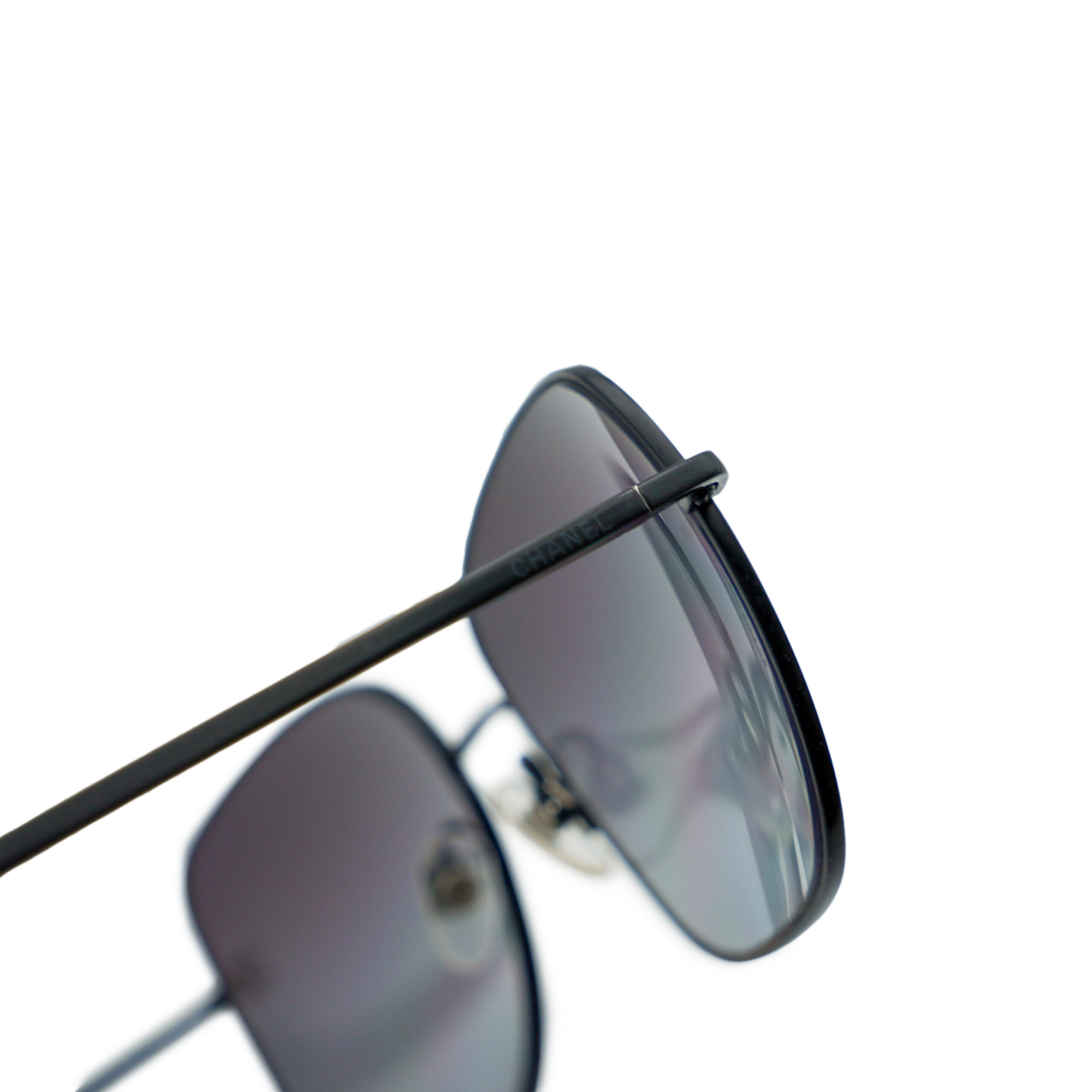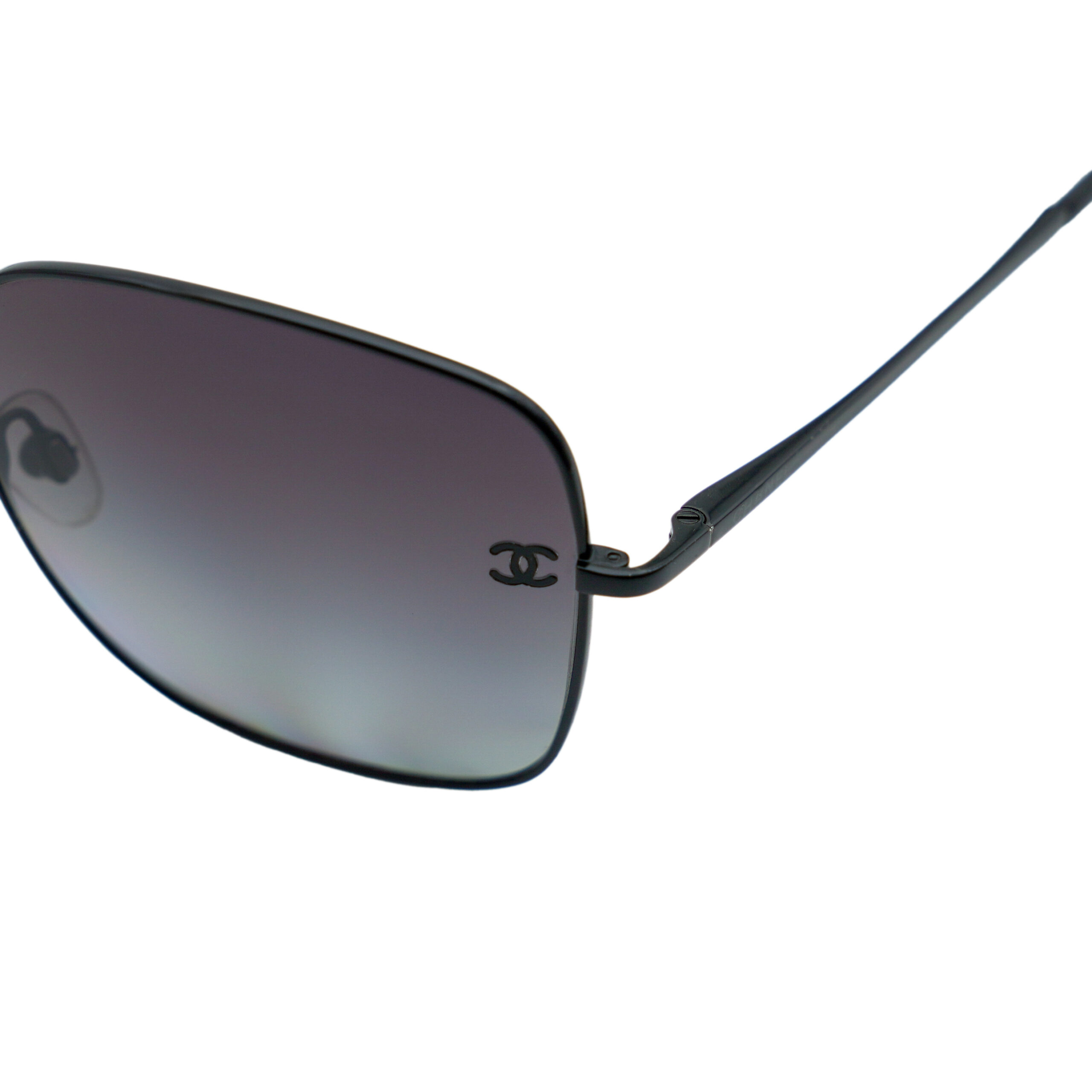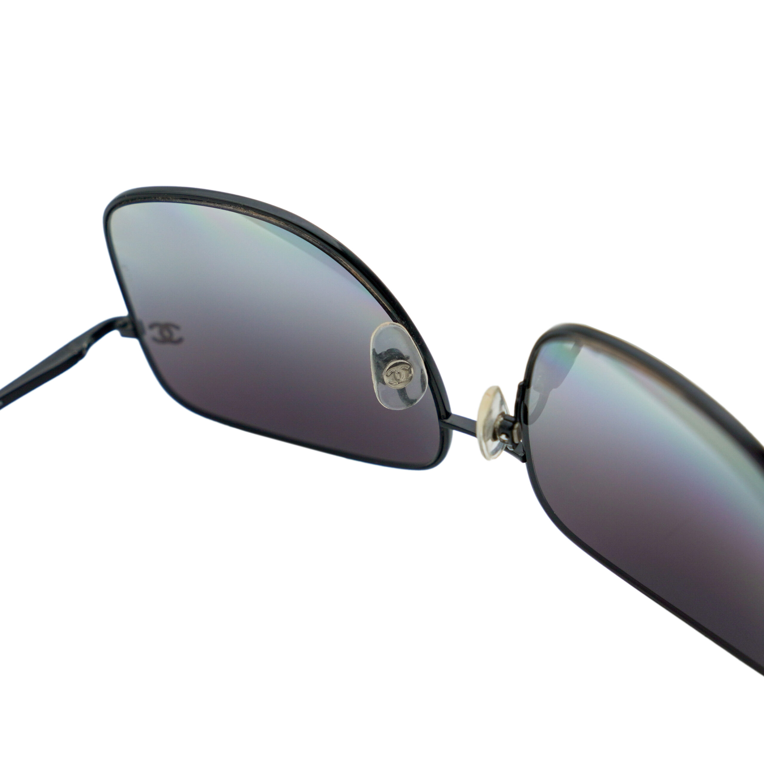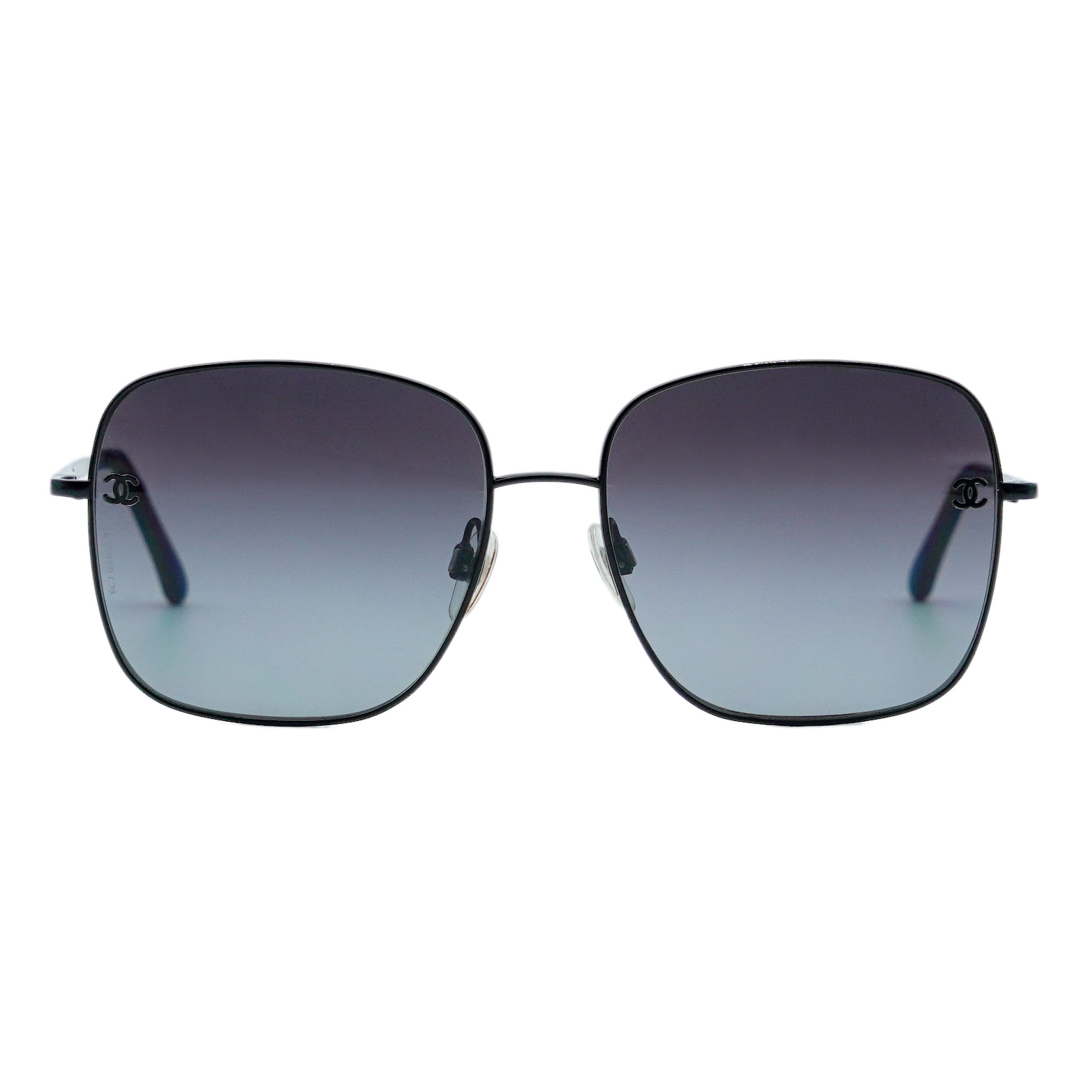 These Chanel sunglasses feature a refined rimless square silhouette with a lightweight matte black metal frame. The softly oversized lenses are finished in a blue-to-grey gradient, creating an elegant and modern look. The iconic interlocking CC logos are mounted directly onto the outer corners of the lenses, adding a subtle yet unmistakable Chanel signature detail. Slim black metal temples enhance the minimalist aesthetic while ensuring a comfortable fit. A timeless and versatile Chanel design that blends understated luxury with contemporary edge.