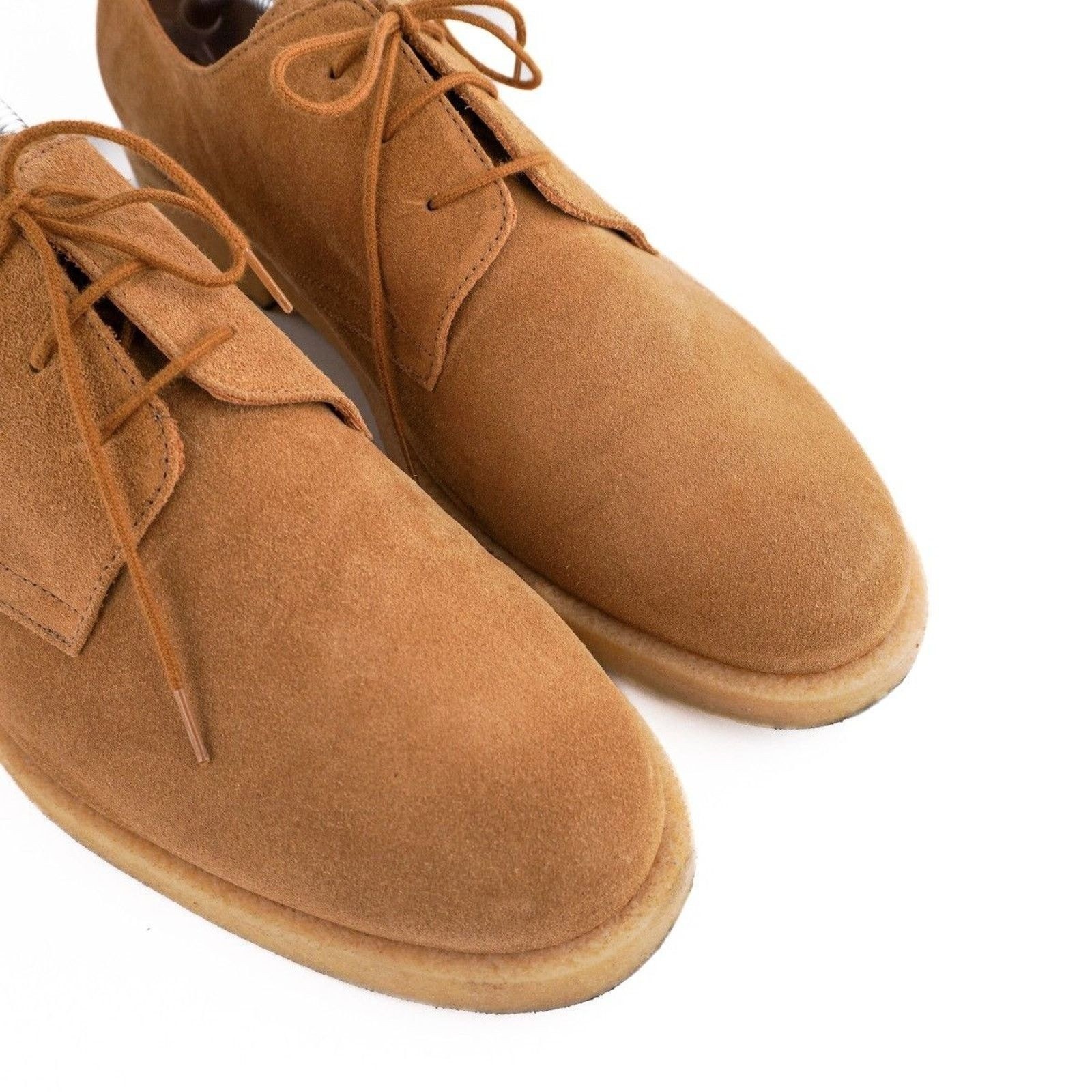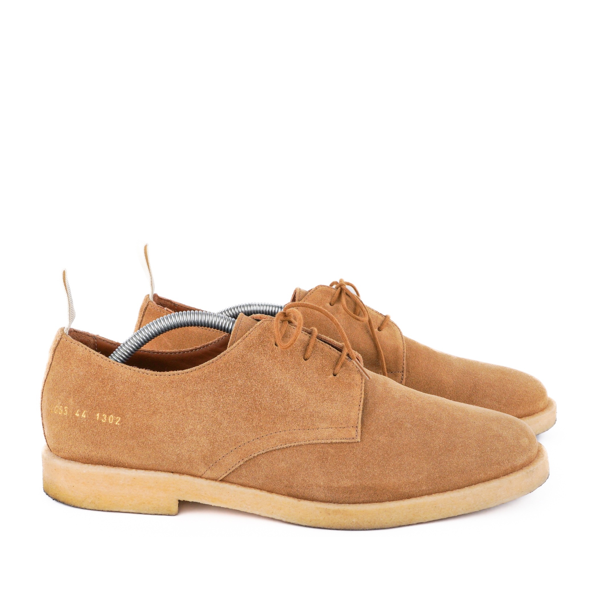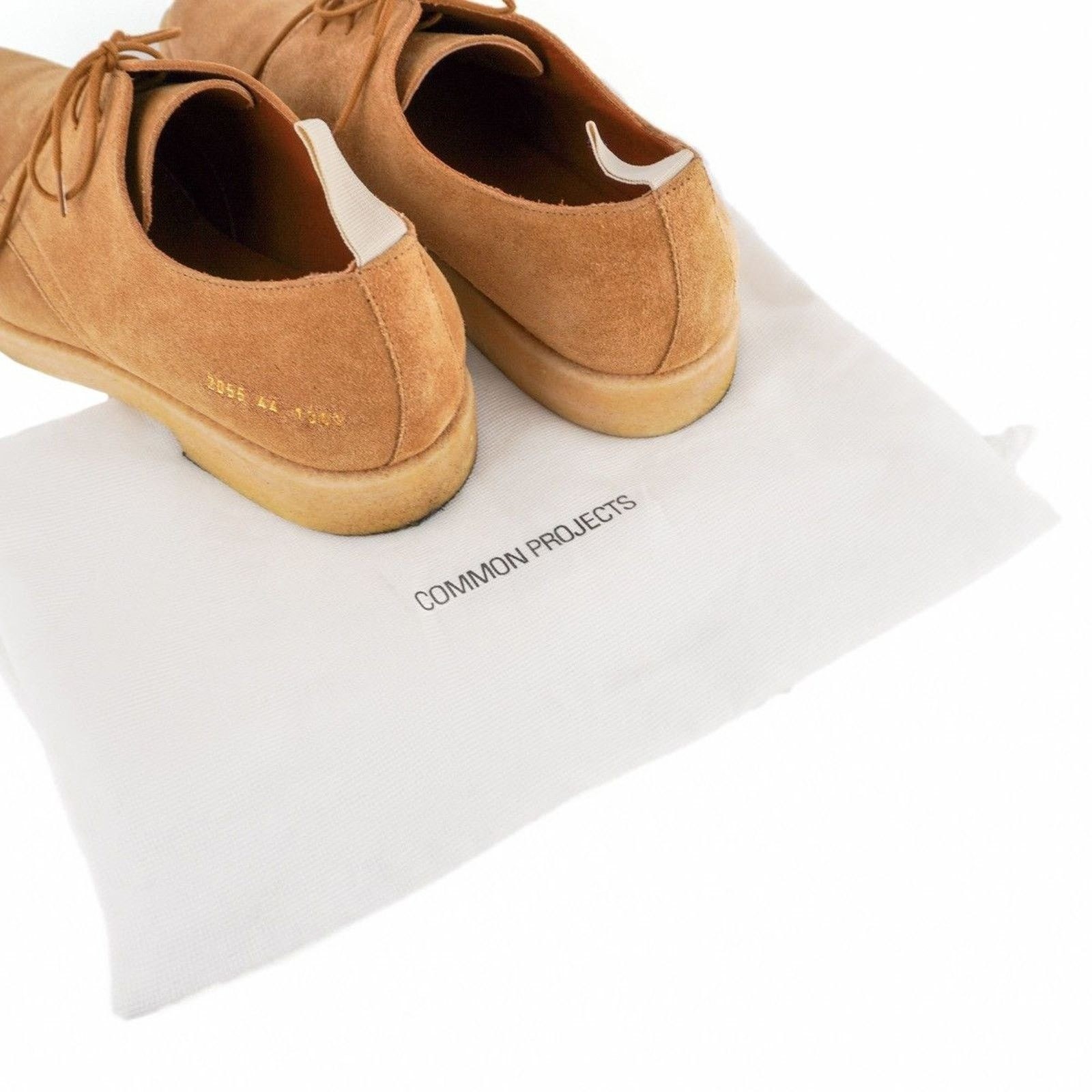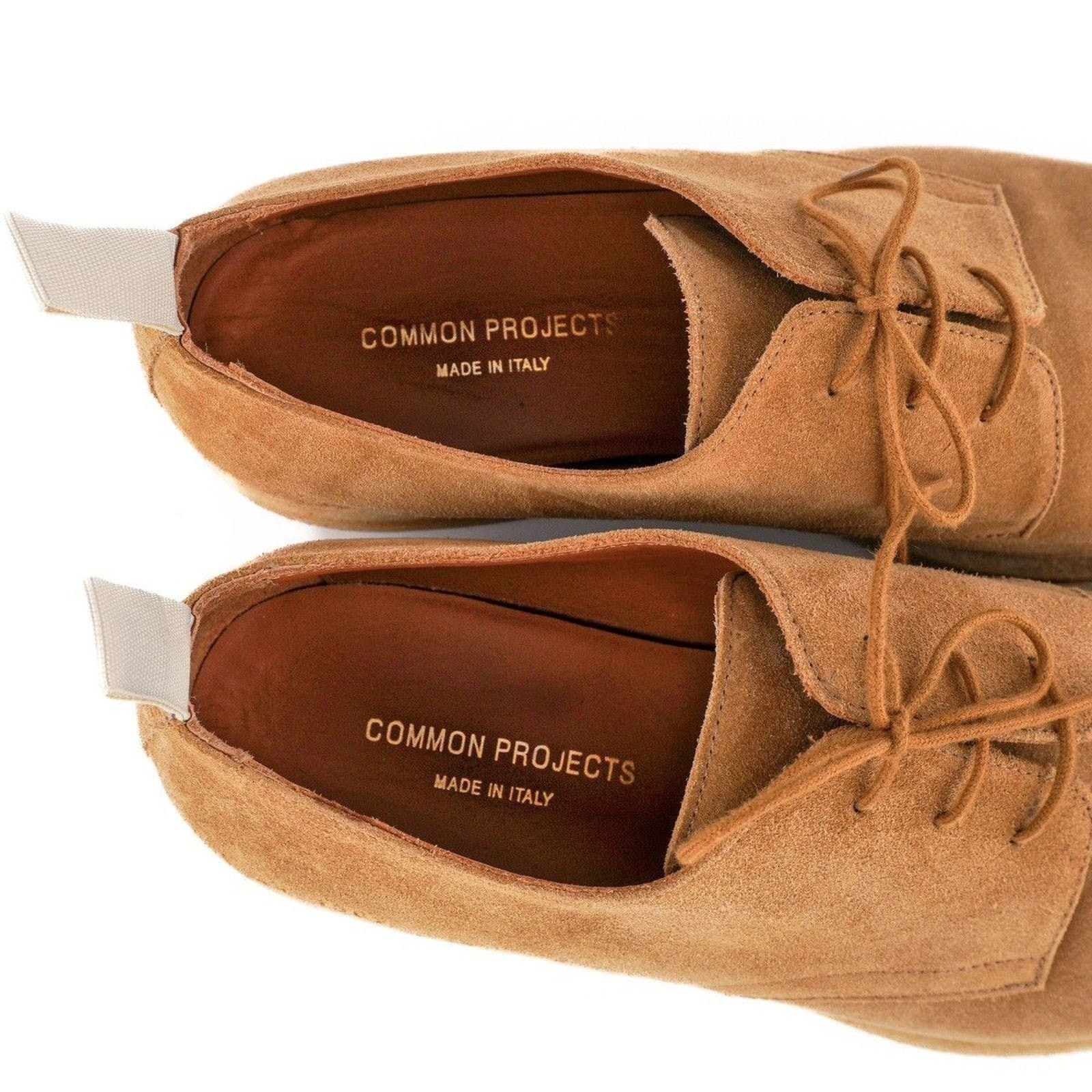These Common Projects suede derby shoes offer a refined blend of minimalist design and premium craftsmanship. Made in Italy from soft tan suede, they feature the brand’s signature gold-stamped serial number and a comfortable crepe sole. Their clean silhouette makes them versatile enough for both casual and smart-casual outfits.