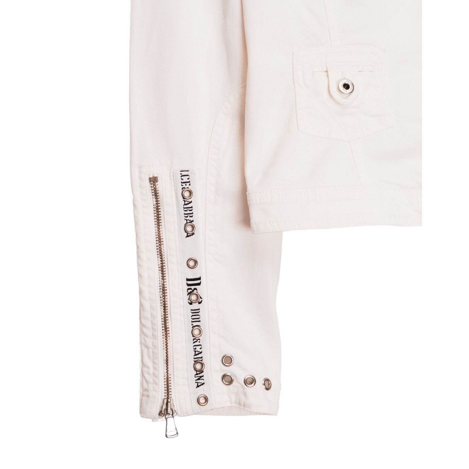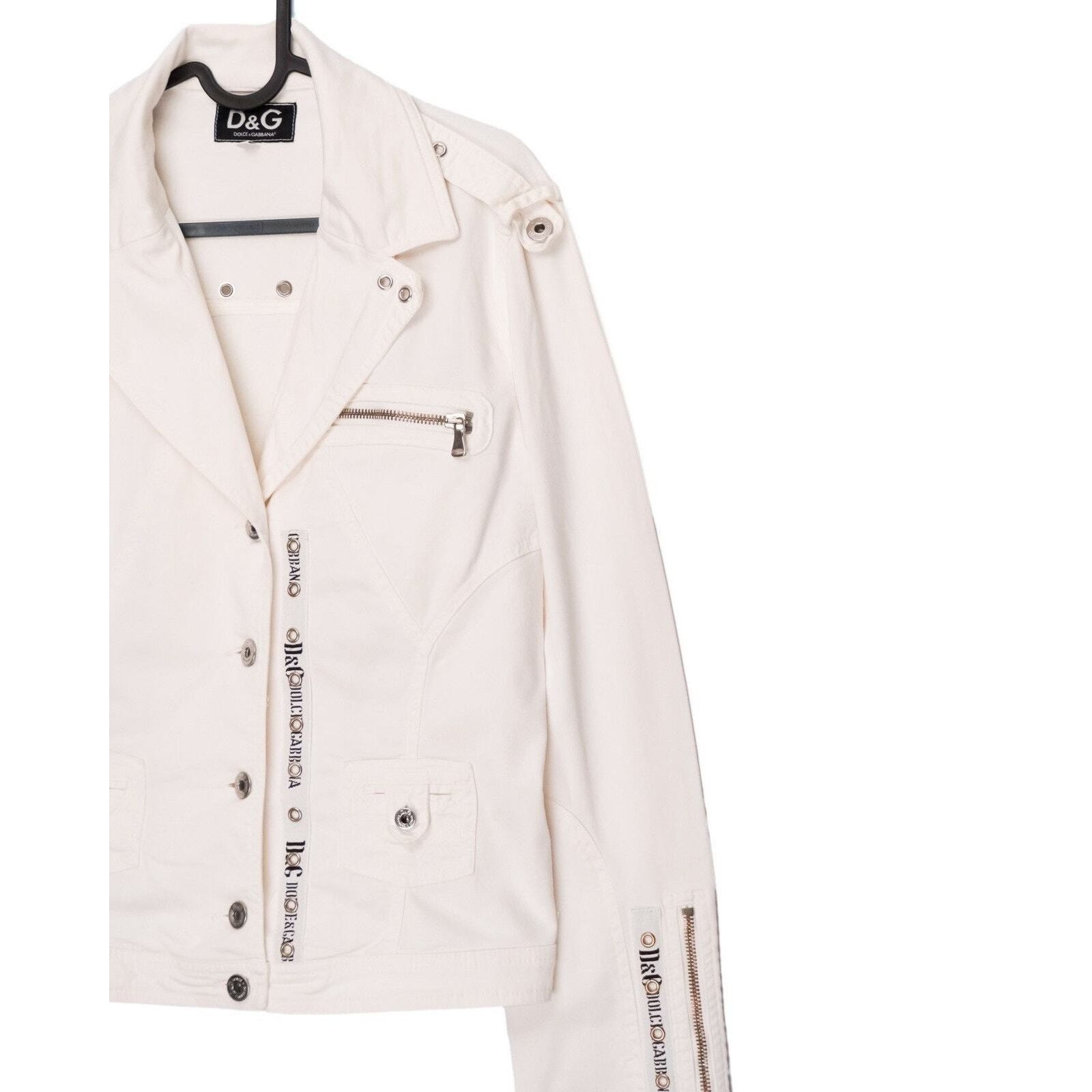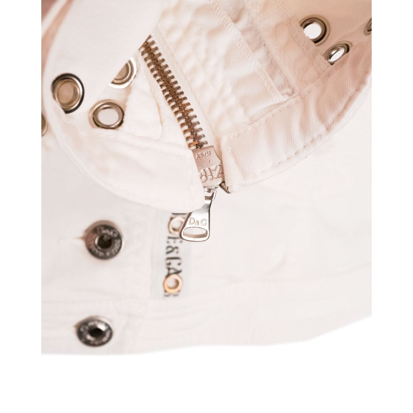 This D&G Dolce & Gabbana jacket is a standout example of bold Italian design. Made from structured white cotton with metal hardware detailing, it blends a biker-inspired silhouette with the clean, crisp look of luxury casualwear. Signature branded grommets, button details, and a tailored cut give the piece a distinctive and elevated edge. Perfect for adding statement character to everyday outfits or enhancing a refined streetwear look.