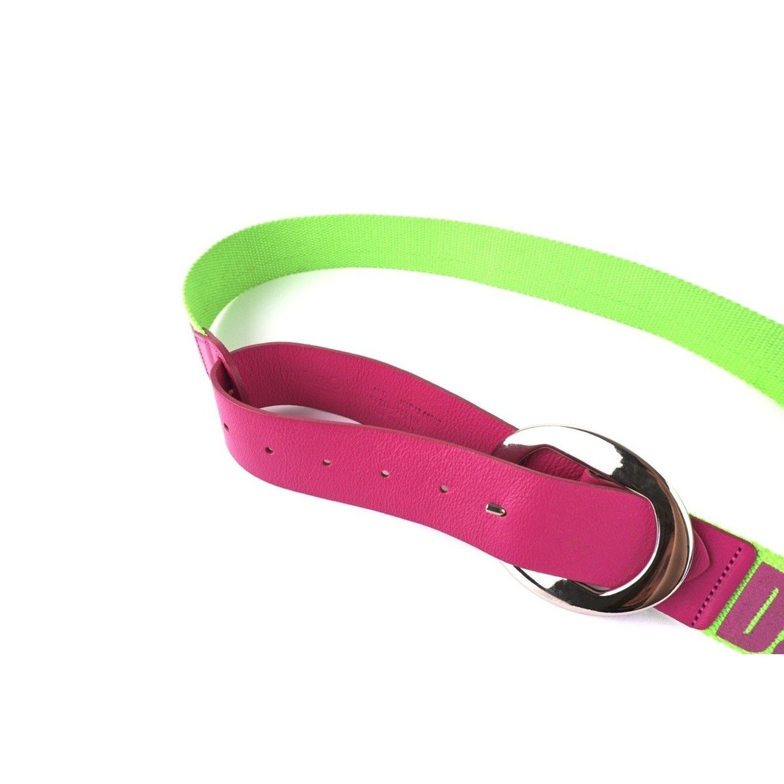 This Dolce & Gabbana belt is a bold and eye-catching accessory that perfectly reflects the brand’s playful and expressive Italian design. Featuring a vibrant green canvas strap with contrasting pink Dolce & Gabbana logo lettering, it is paired with a smooth pink leather section and a polished silver-tone oval buckle. The striking color combination and mixed materials make this belt a standout statement piece, ideal for adding personality to any outfit.