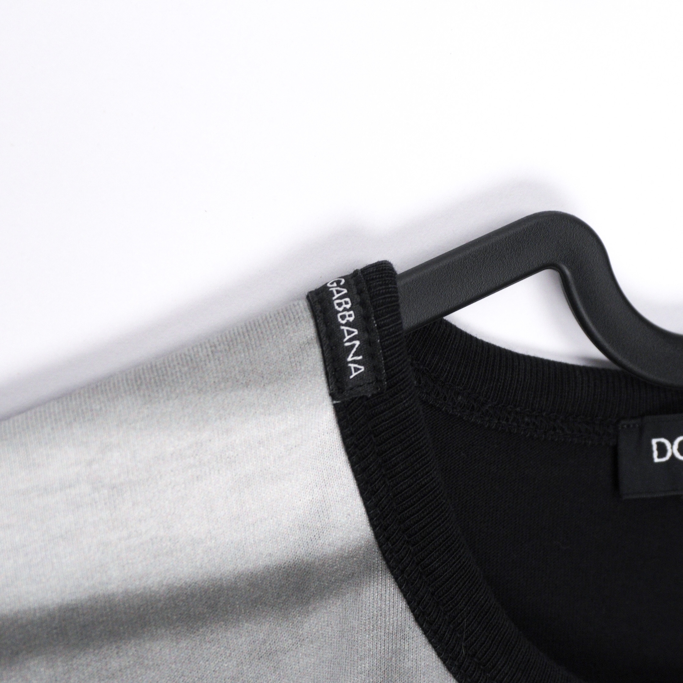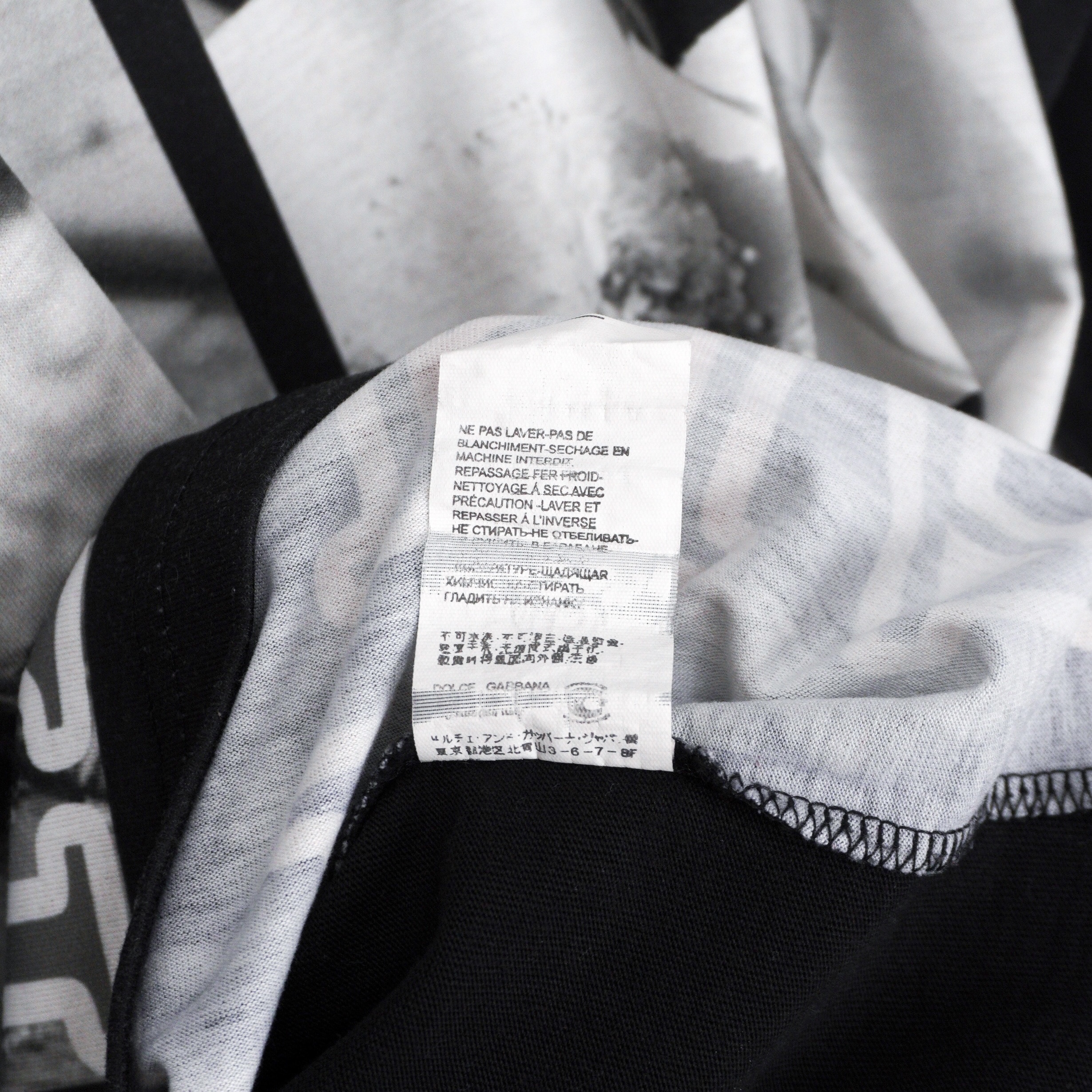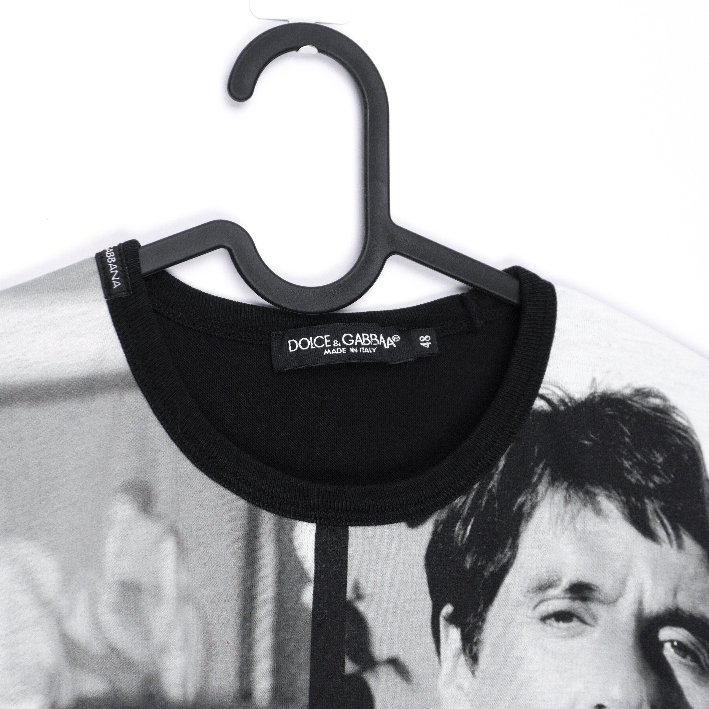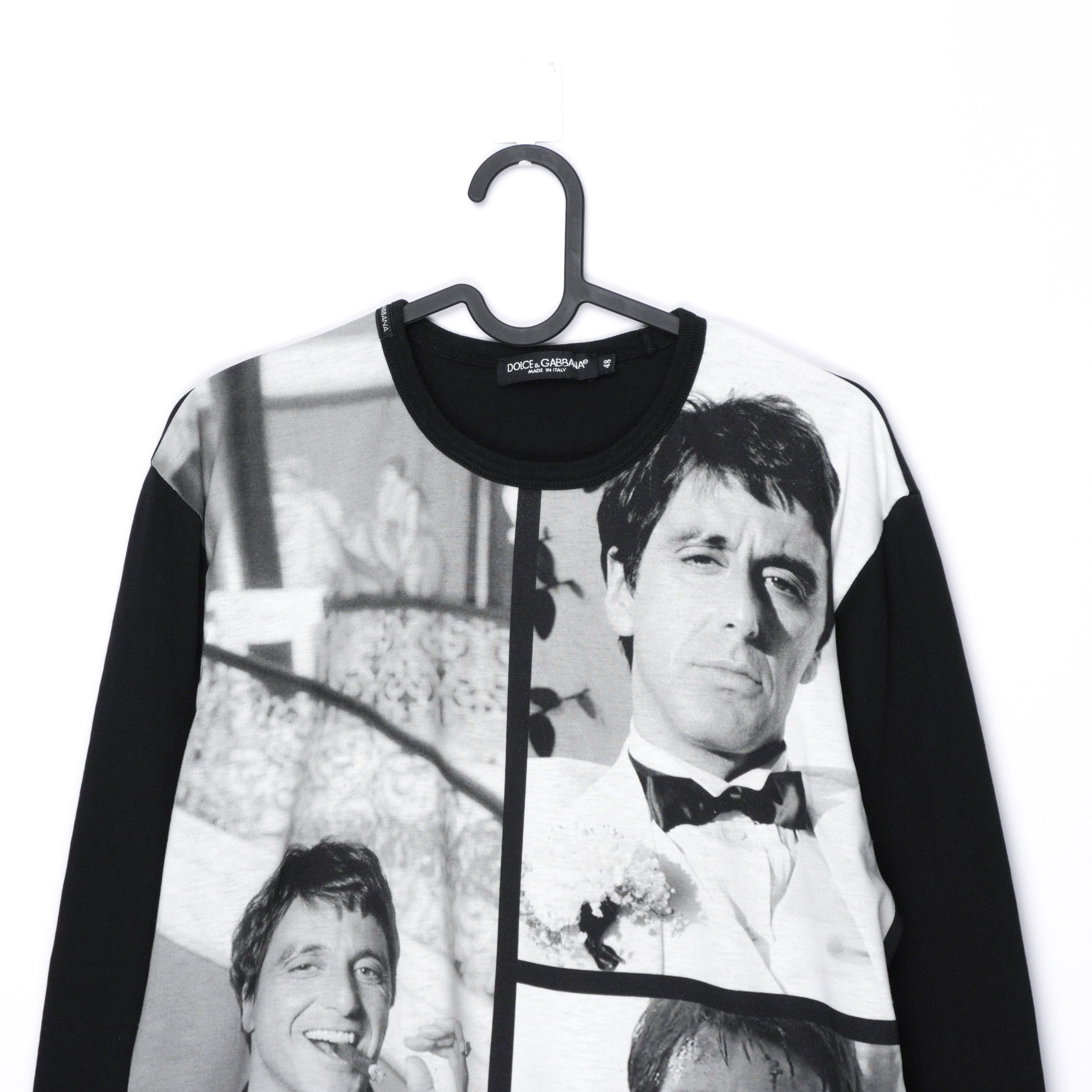 A standout long-sleeve tee with a striking monochrome collage graphic on the front and solid black sleeves/back. Cut from soft cotton jersey, it features a crew neckline and bold front text reading “TONY MONTANA,” delivering a cinematic, statement look that’s unmistakably Dolce & Gabbana.
