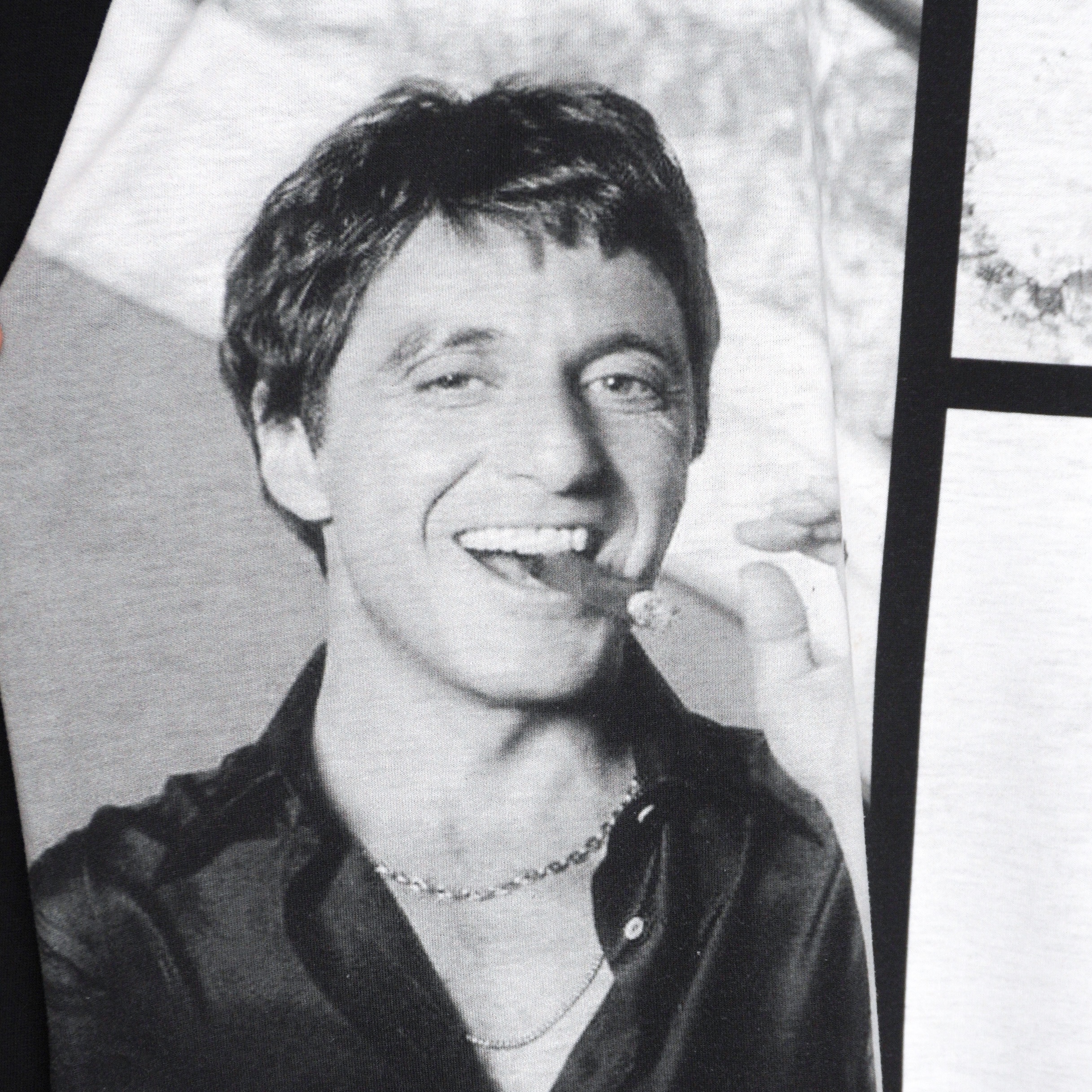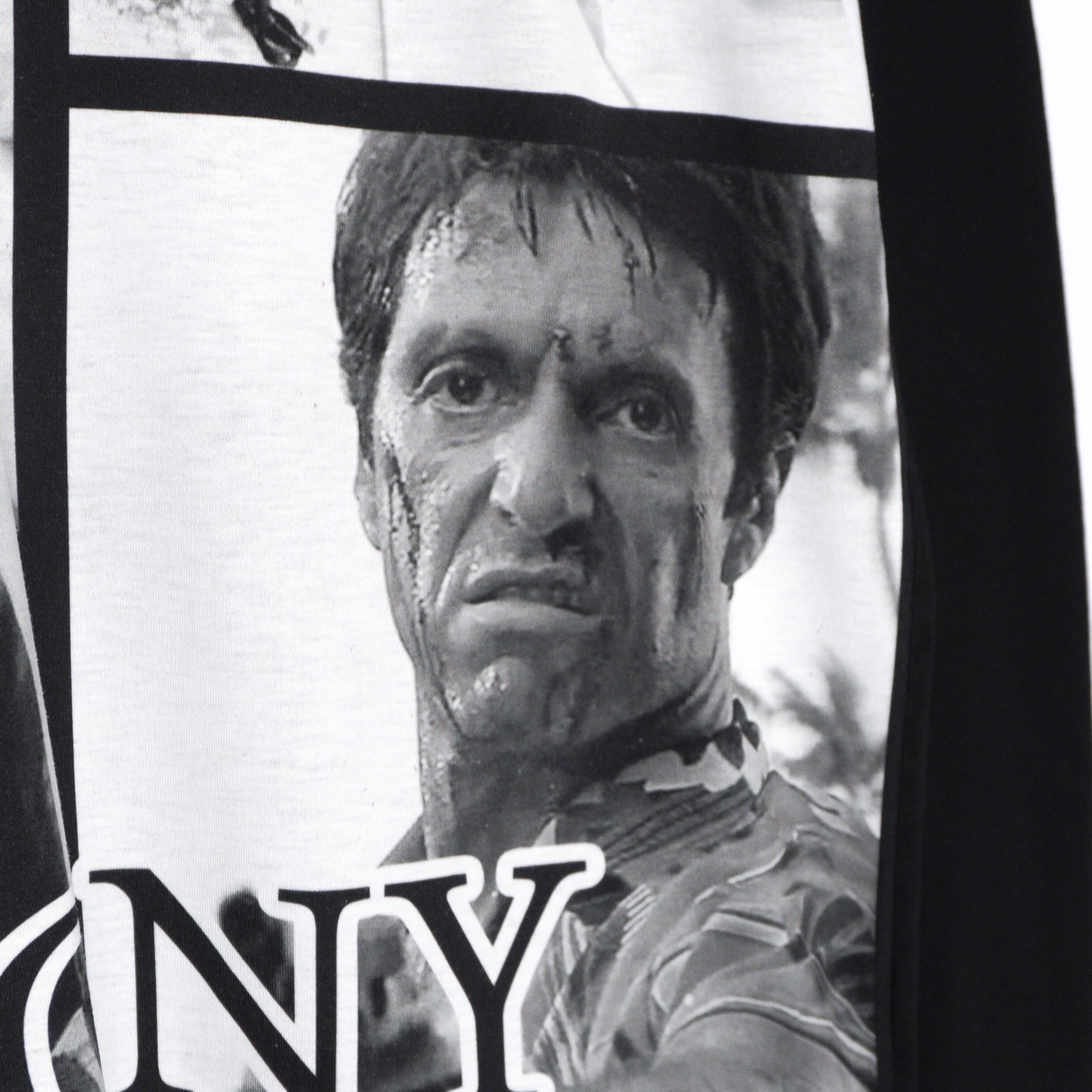 • Monochrome photo-collage front with “TONY MONTANA” text; contrast black sleeves and back