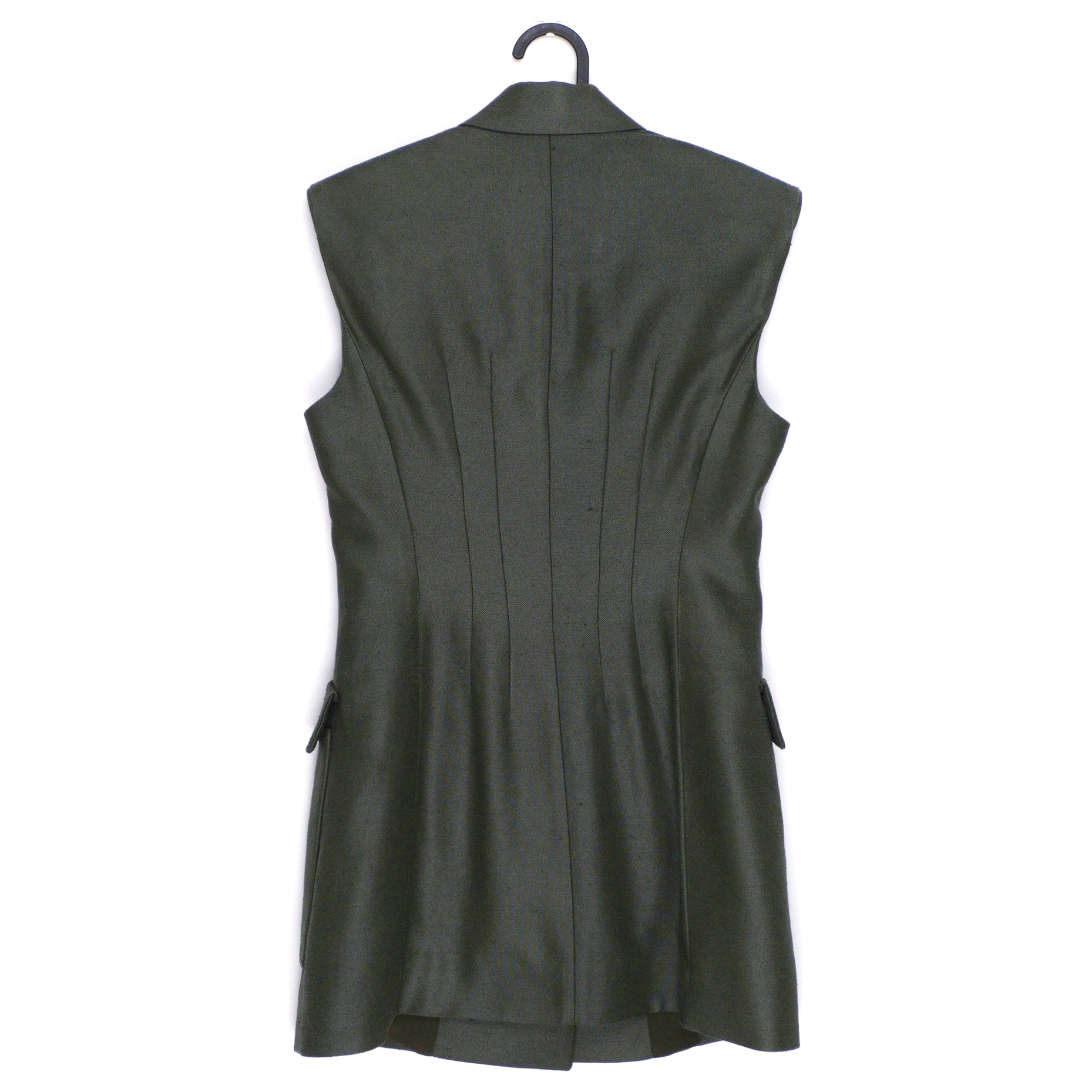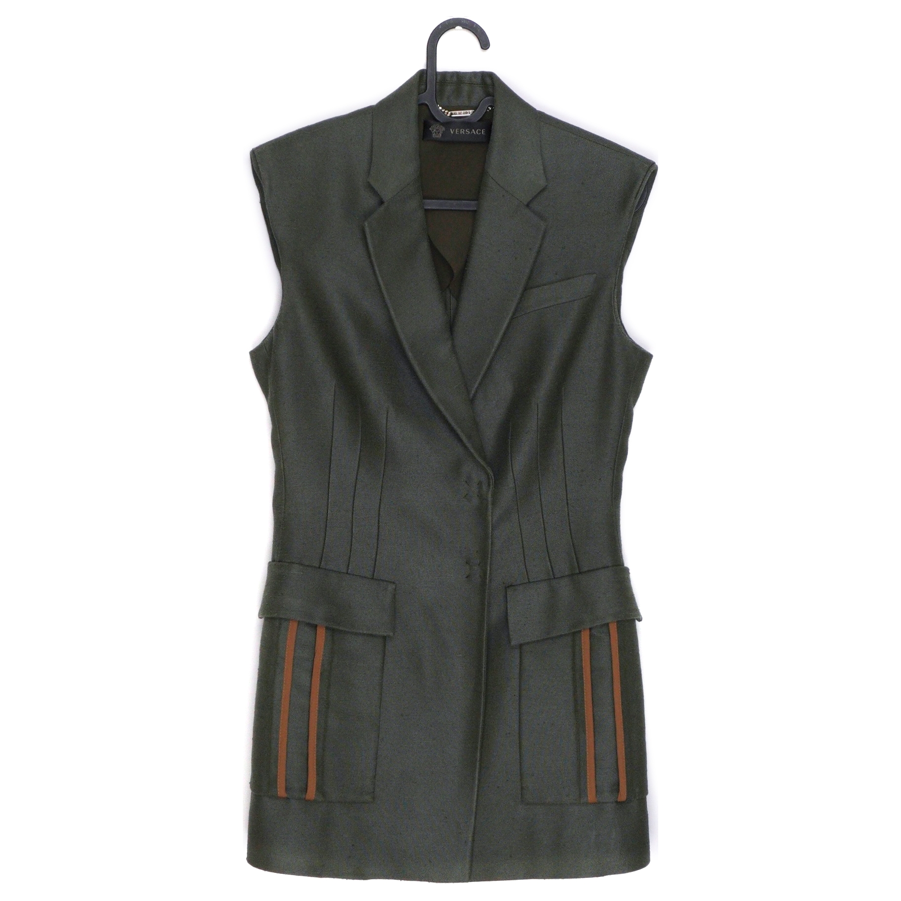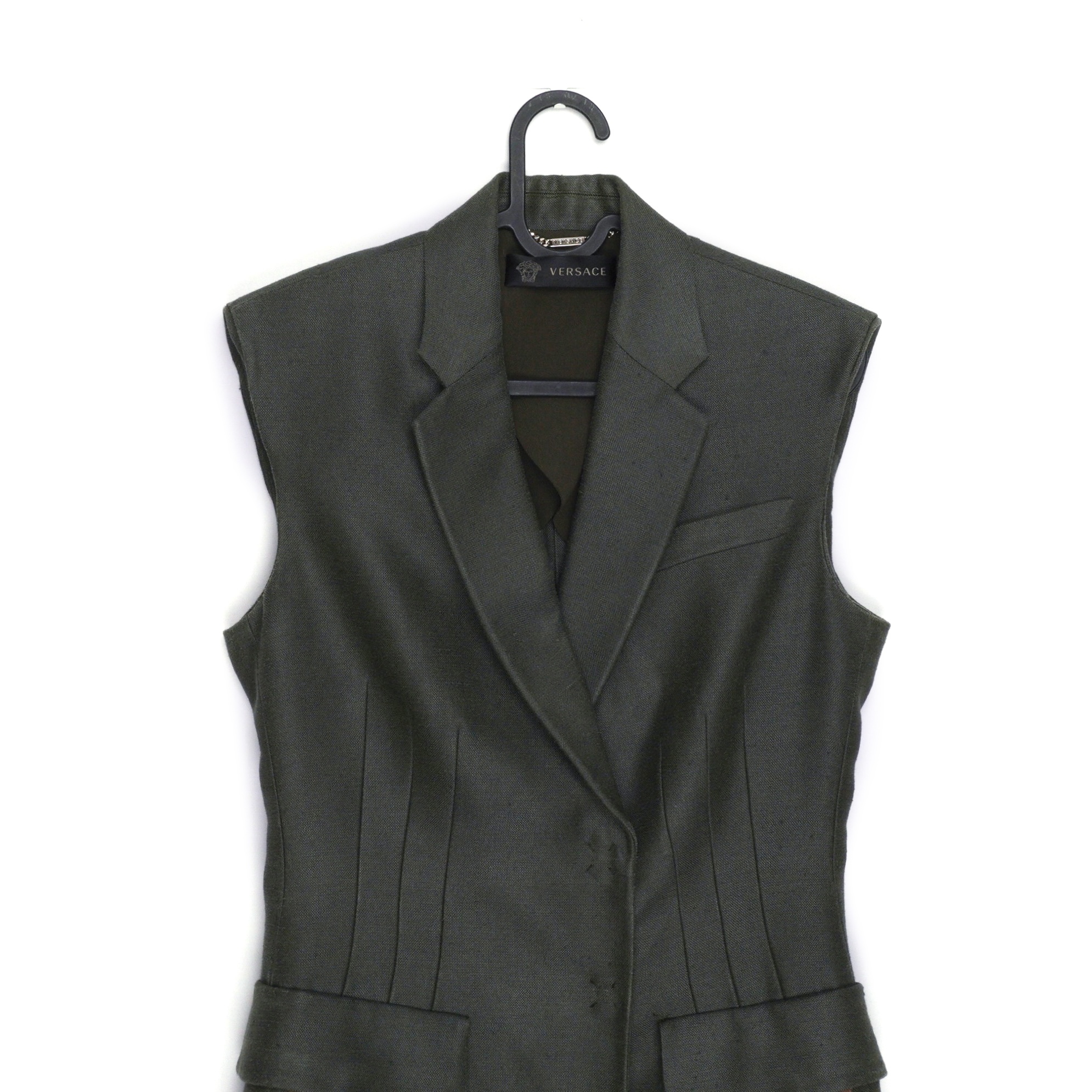 This Versace sleeveless tailored vest dress is a striking example of Italian luxury and sharp runway design. Crafted from structured wool fabric, it features a deep V lapel neckline, sculpted paneling, and a defined waist accented with an iconic Medusa buckle belt. The elongated vest silhouette blends power tailoring with feminine elegance, making it suitable for both statement evening looks and elevated daywear. A timeless archival-inspired Versace piece with strong fashion presence.