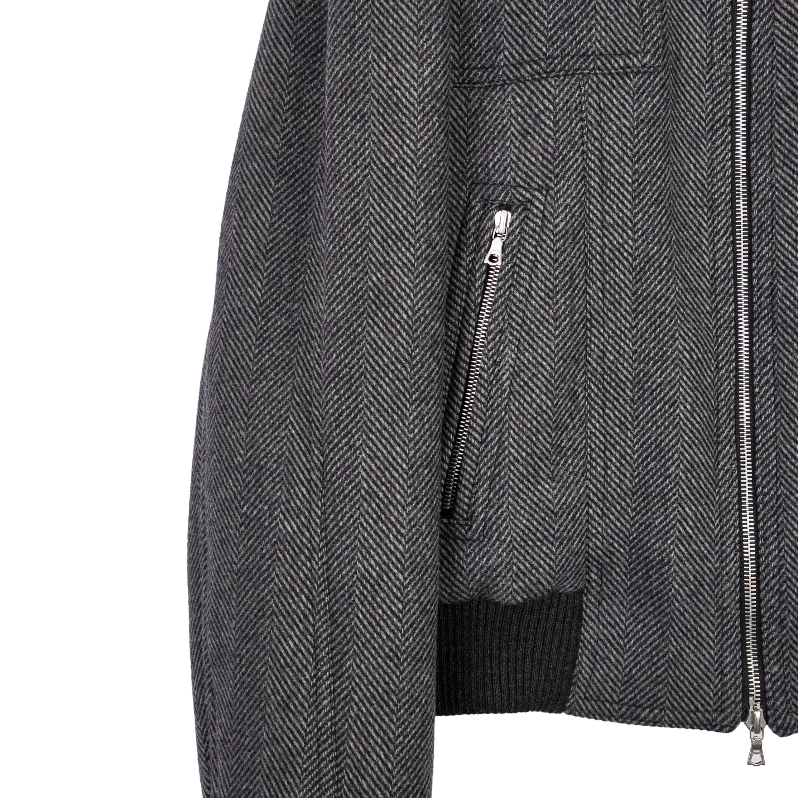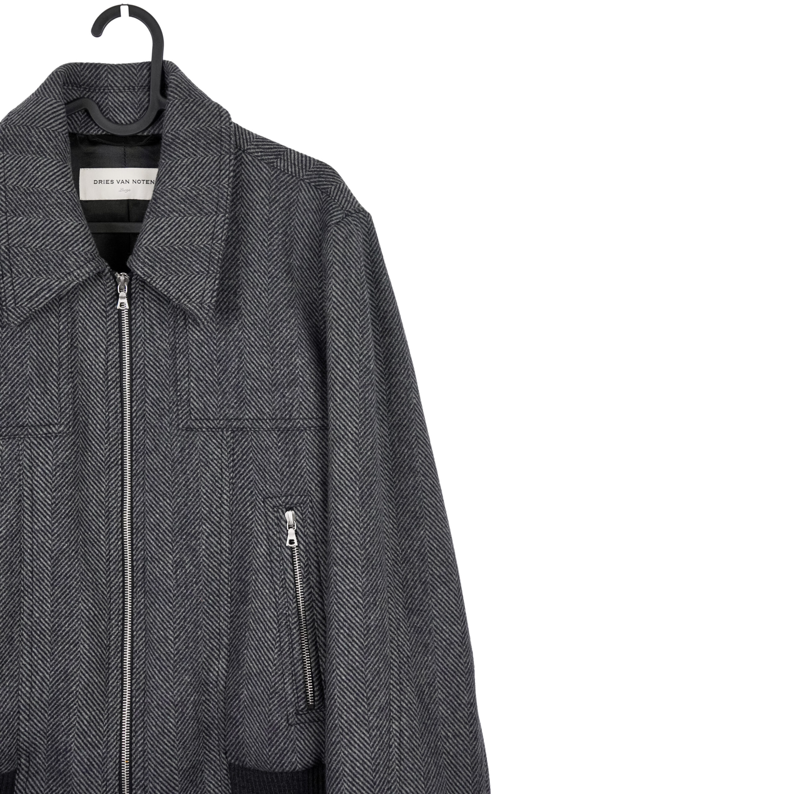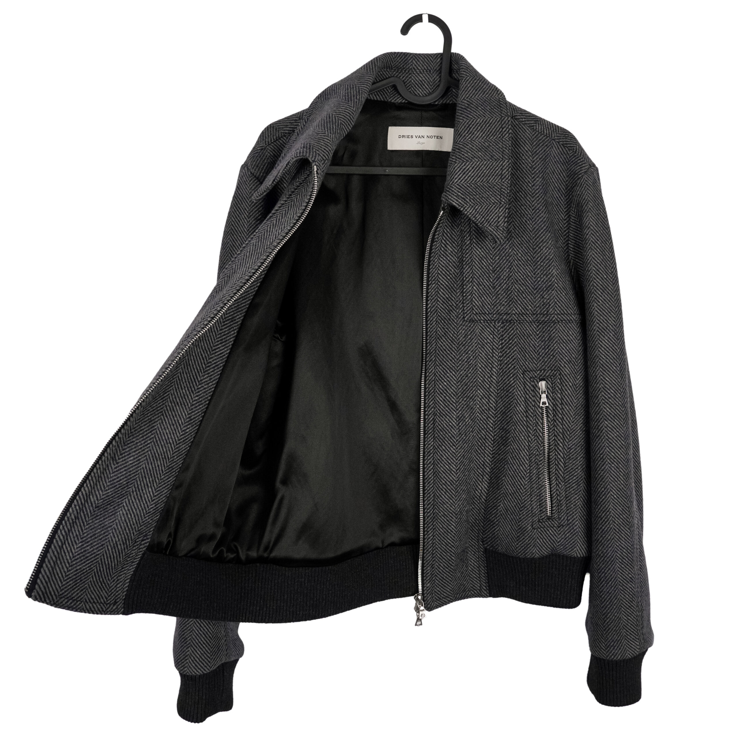 Dries Van Noten Mens Herringbone Wool Gray Zip Bomber Jacket