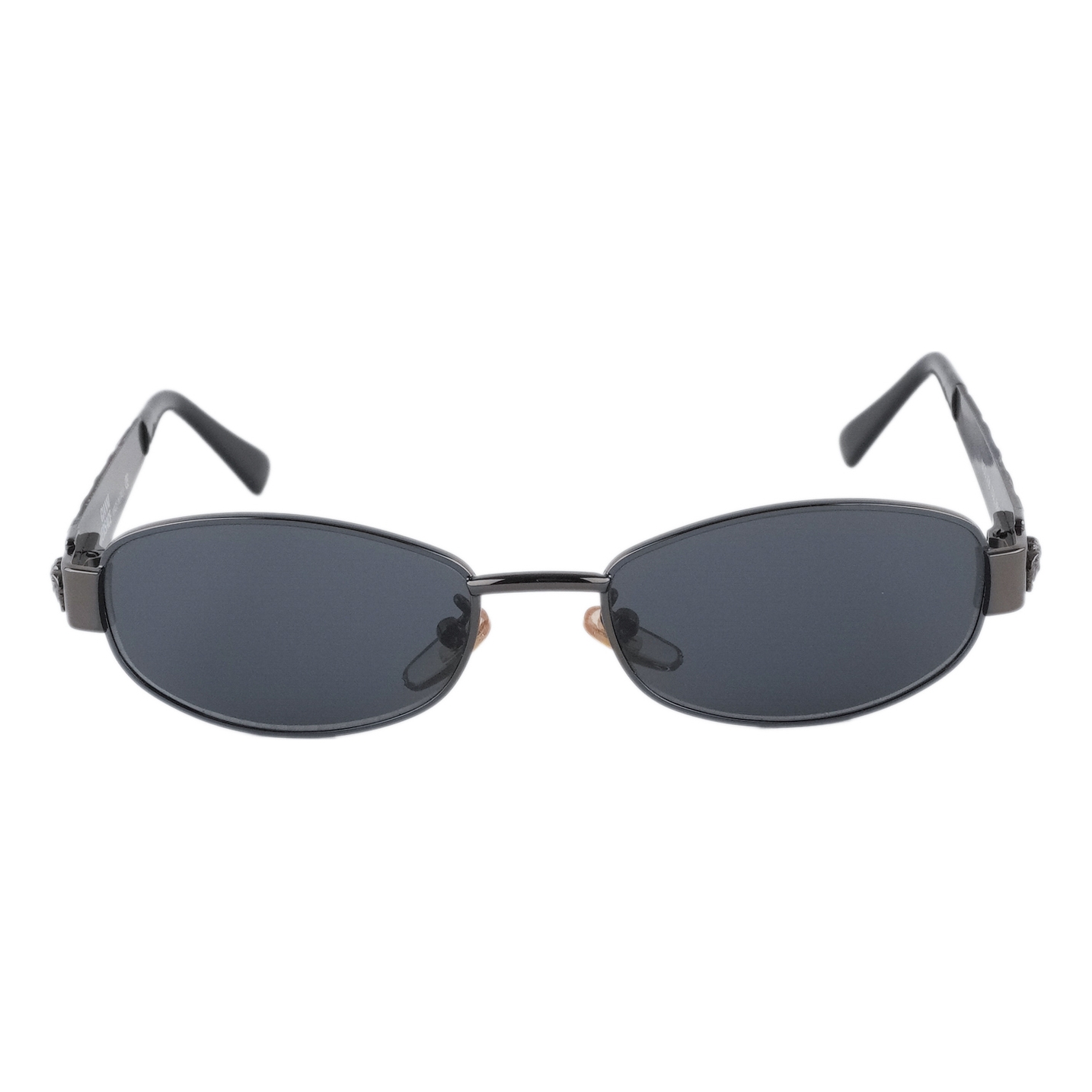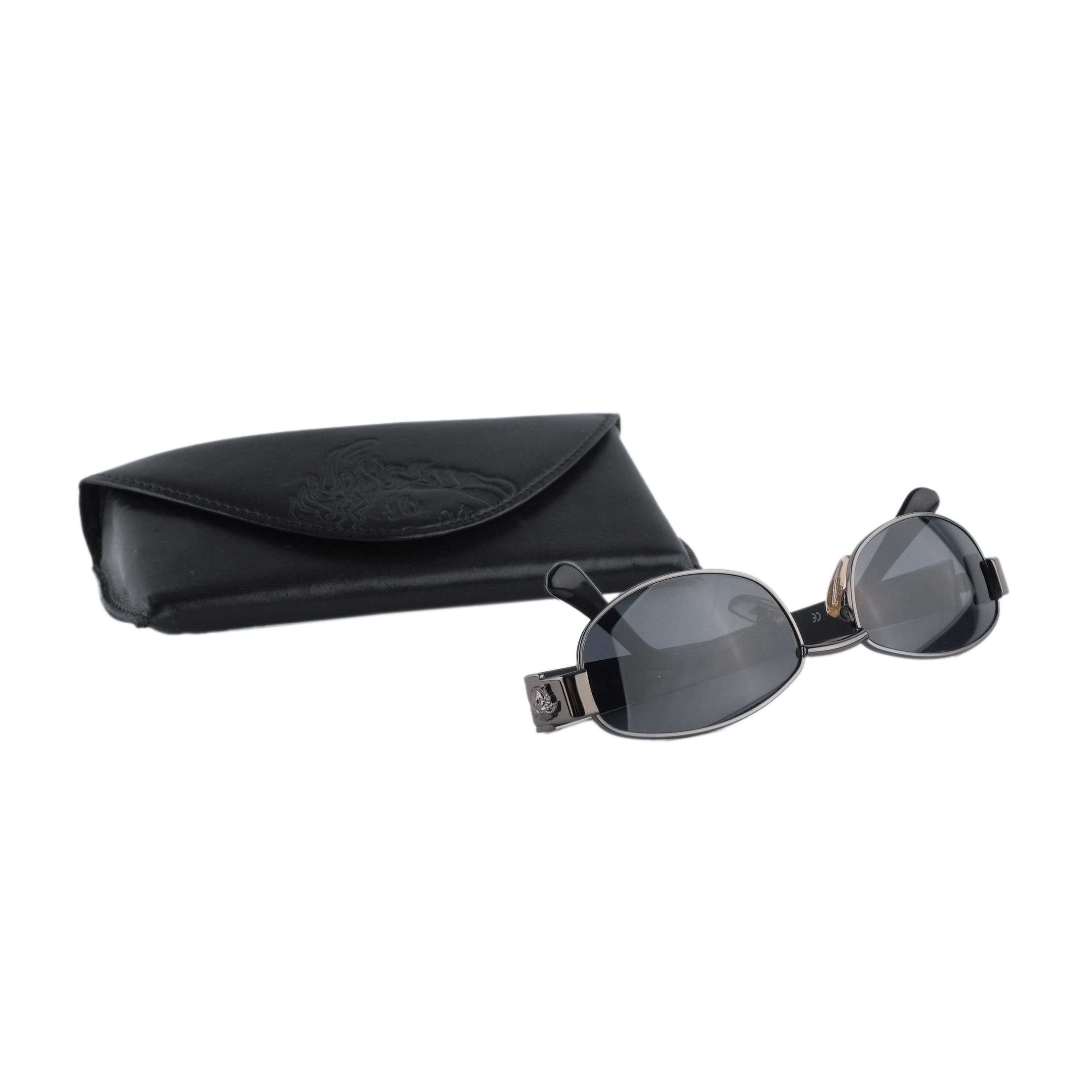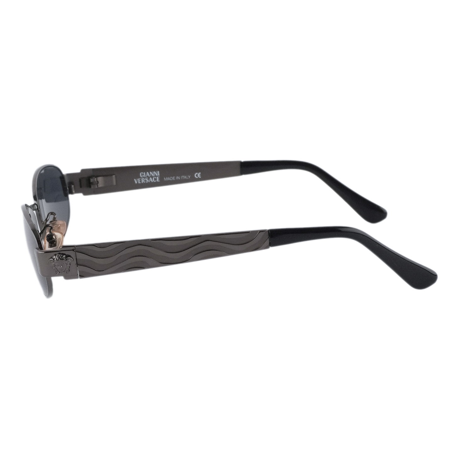 Sleek vintage oval sunglasses from Gianni Versace, crafted in Italy with signature bold detailing. The dark gunmetal frame is paired with deep grey lenses, while the wide temples feature engraved wave patterns and Medusa emblems for a striking finish. A timeless piece that embodies Versace’s confident aesthetic.