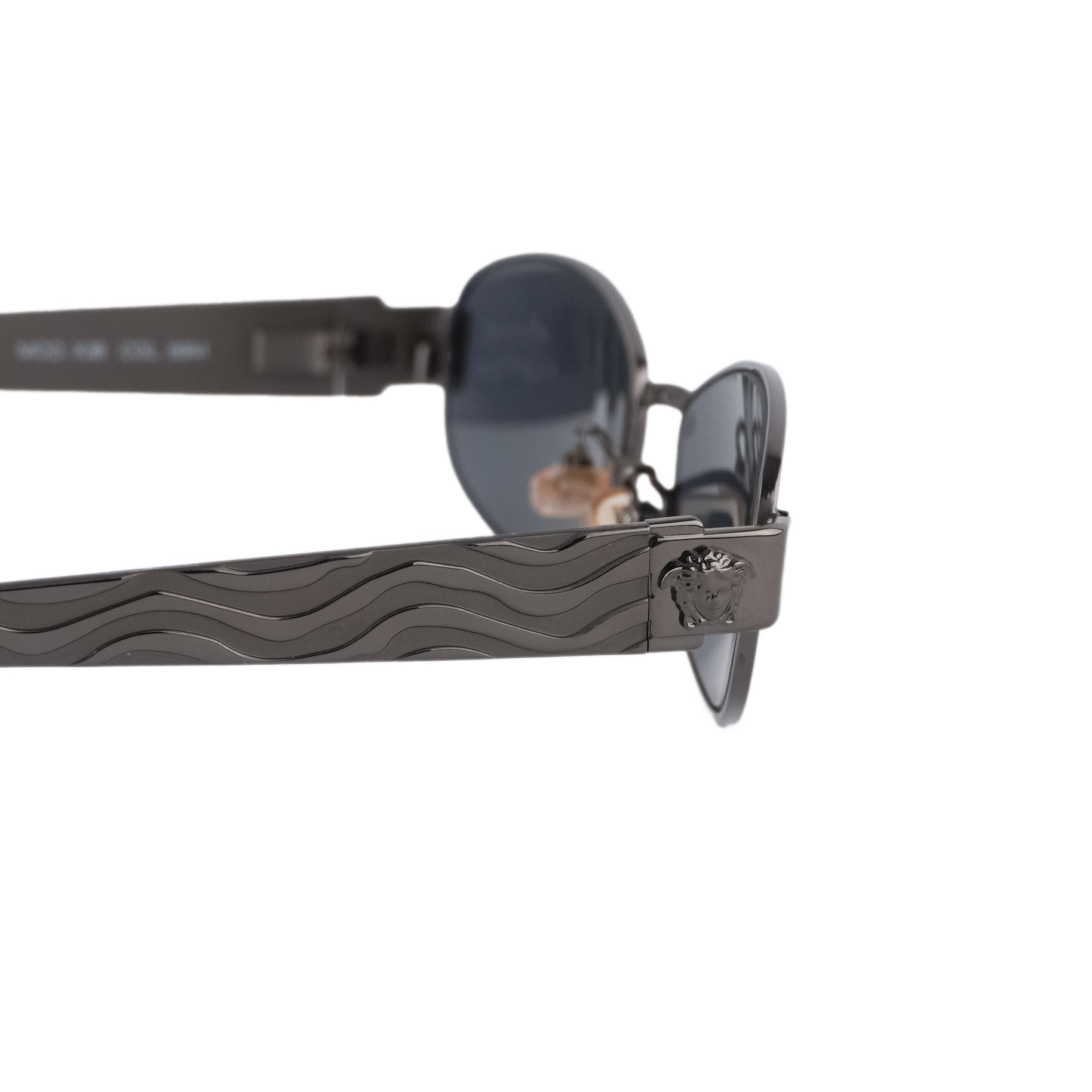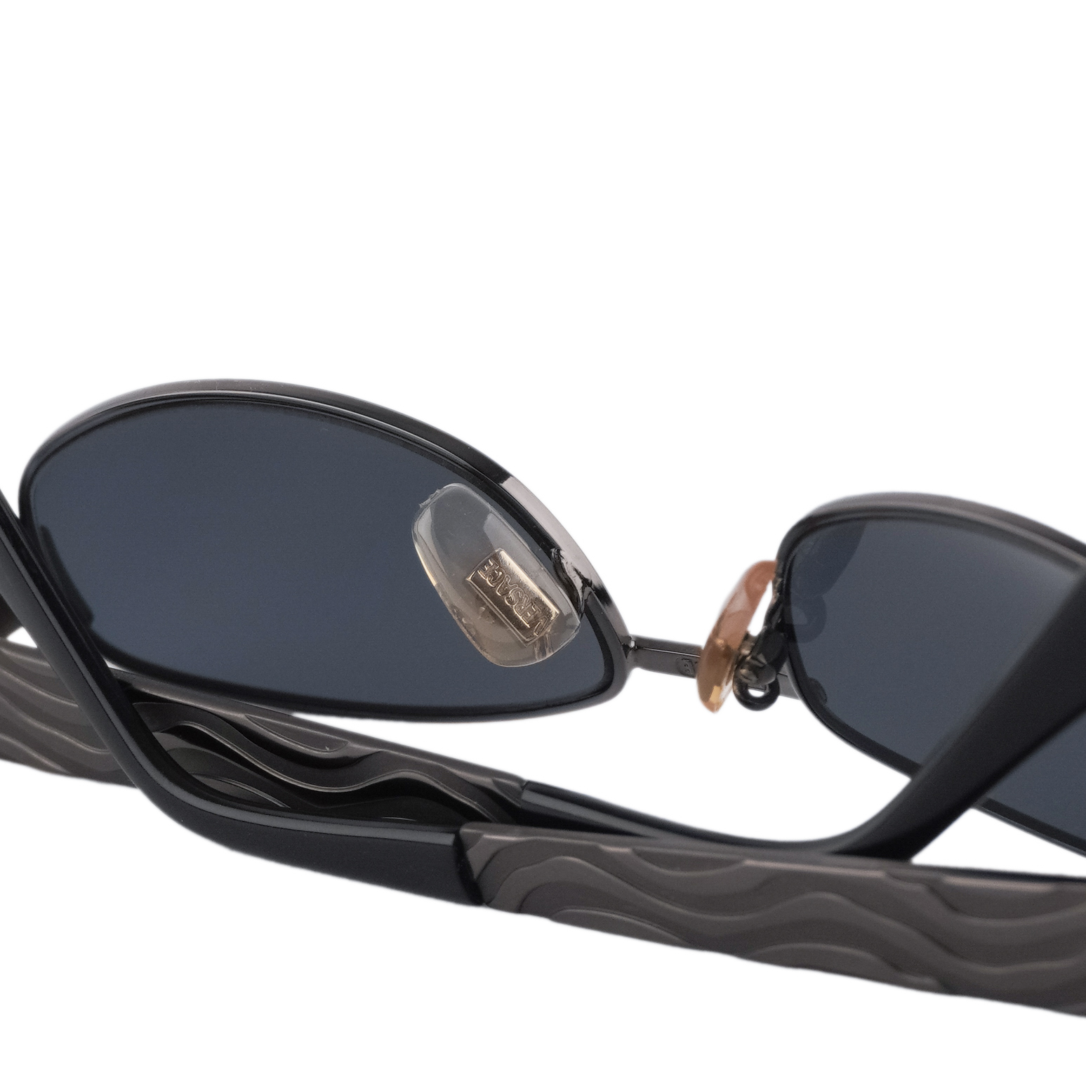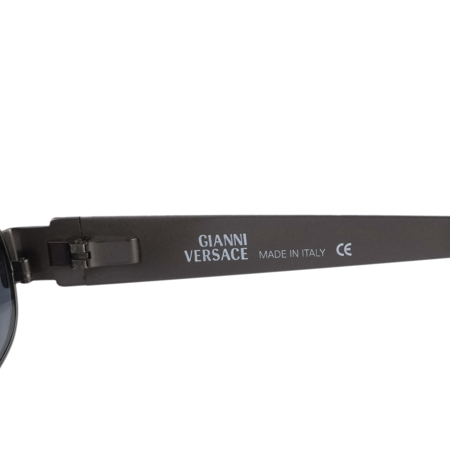 Sleek vintage oval sunglasses from Gianni Versace, crafted in Italy with signature bold detailing. The dark gunmetal frame is paired with deep grey lenses, while the wide temples feature engraved wave patterns and Medusa emblems for a striking finish. A timeless piece that embodies Versace’s confident aesthetic.
