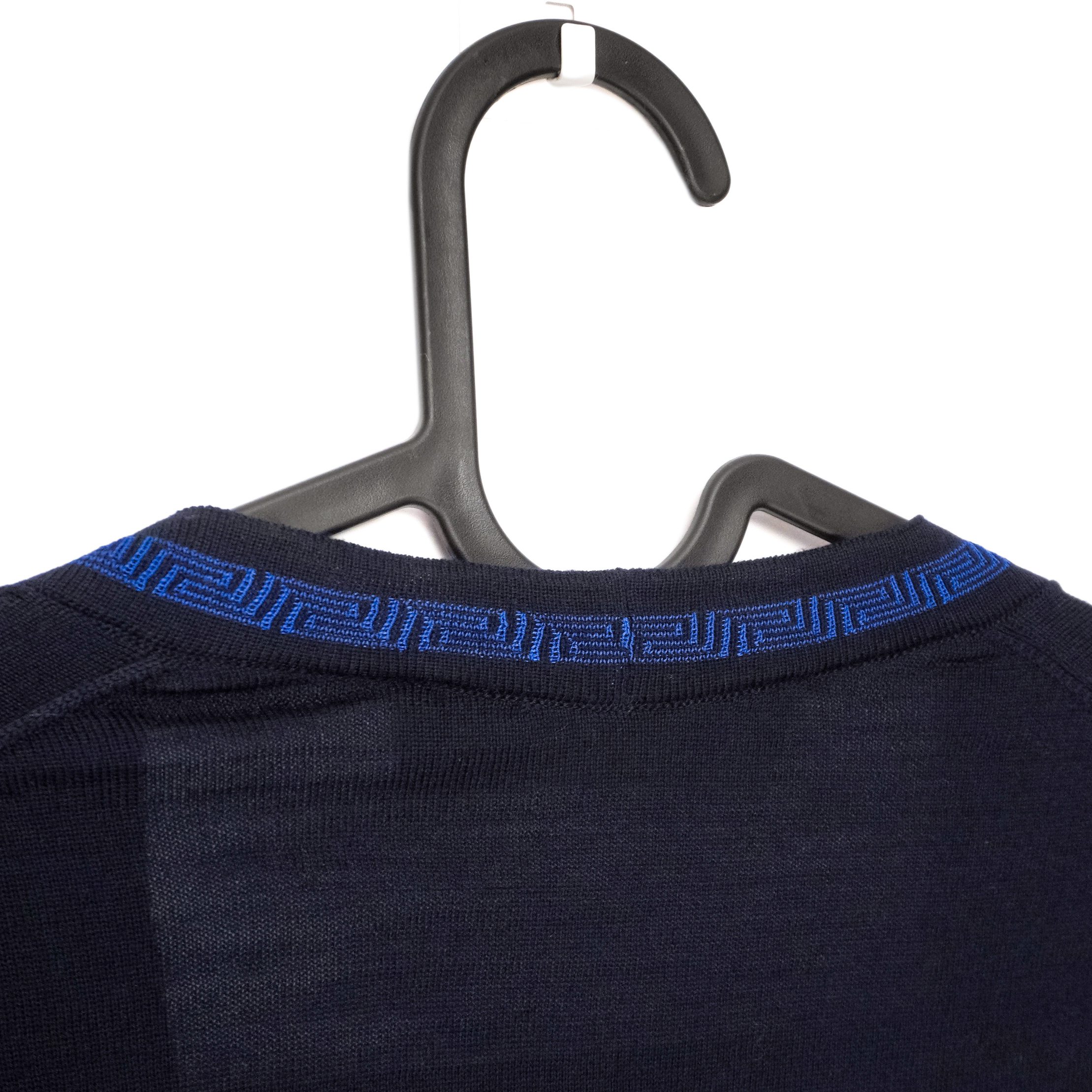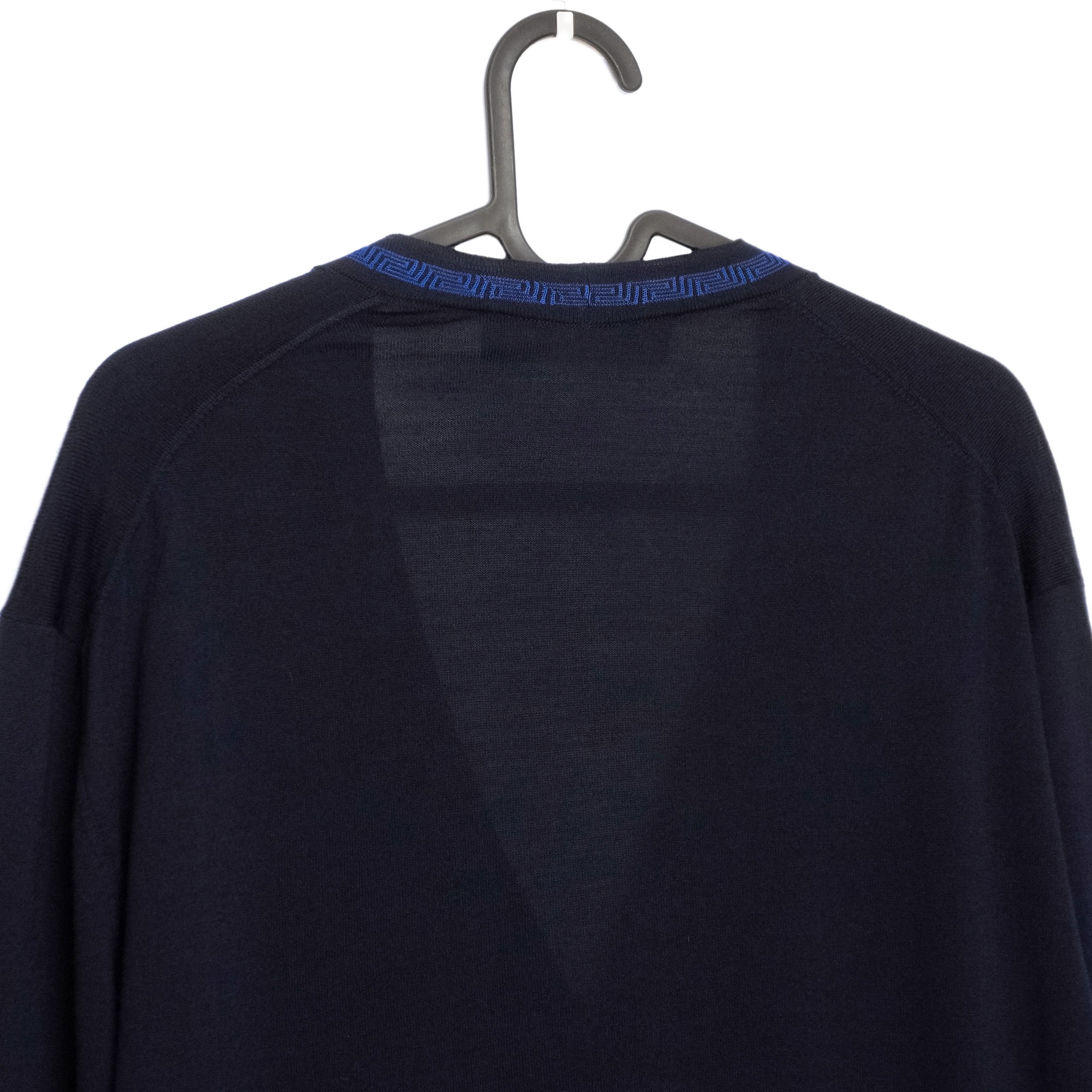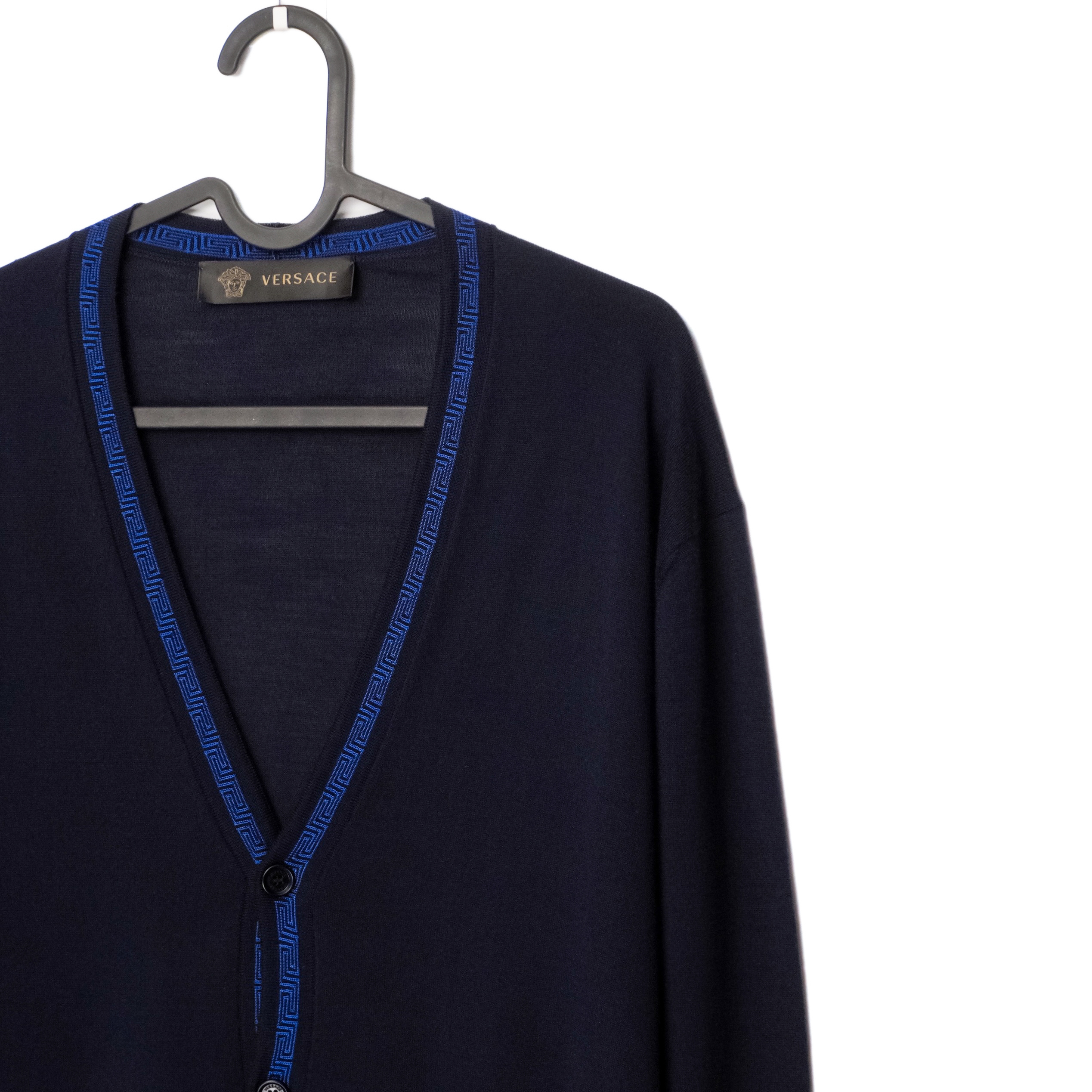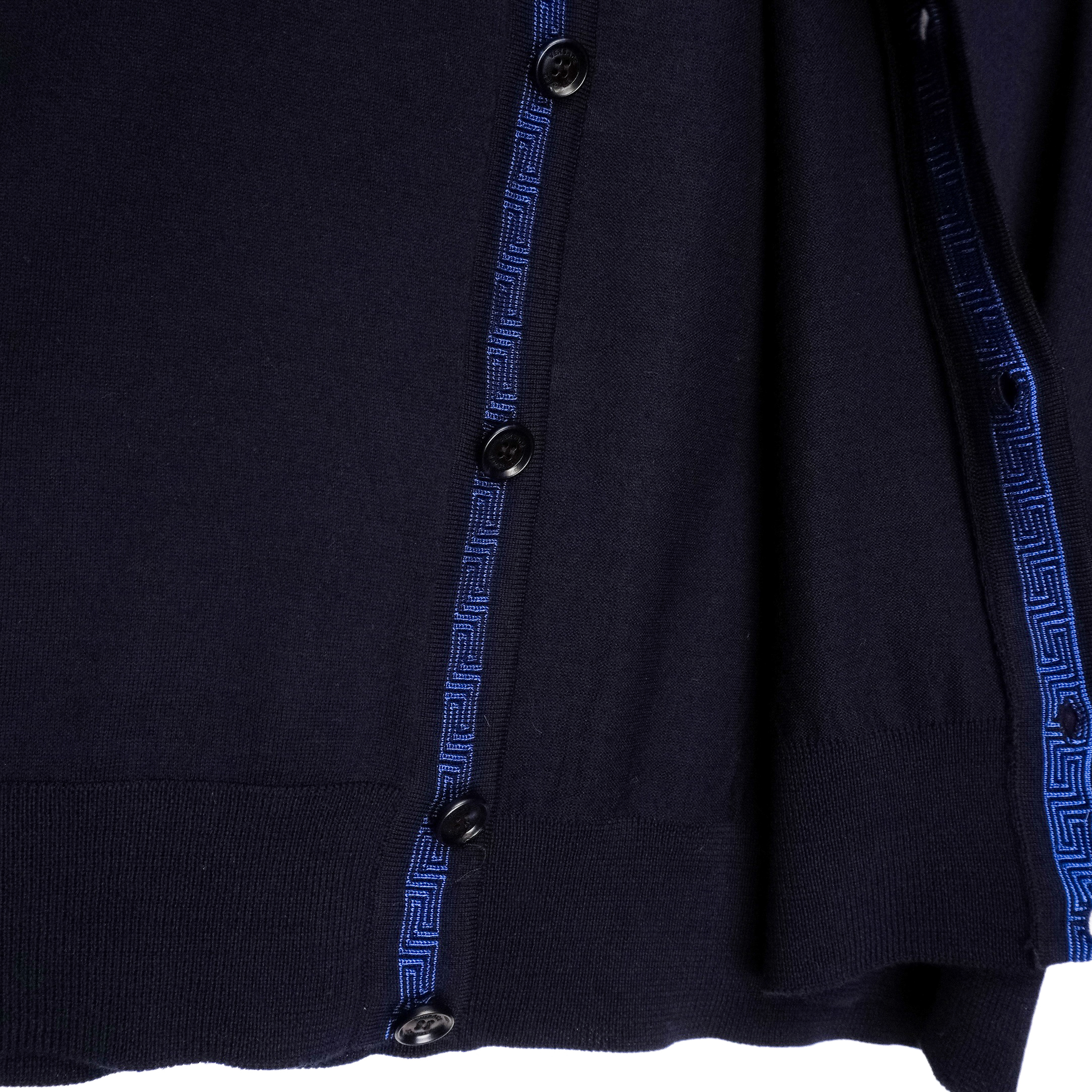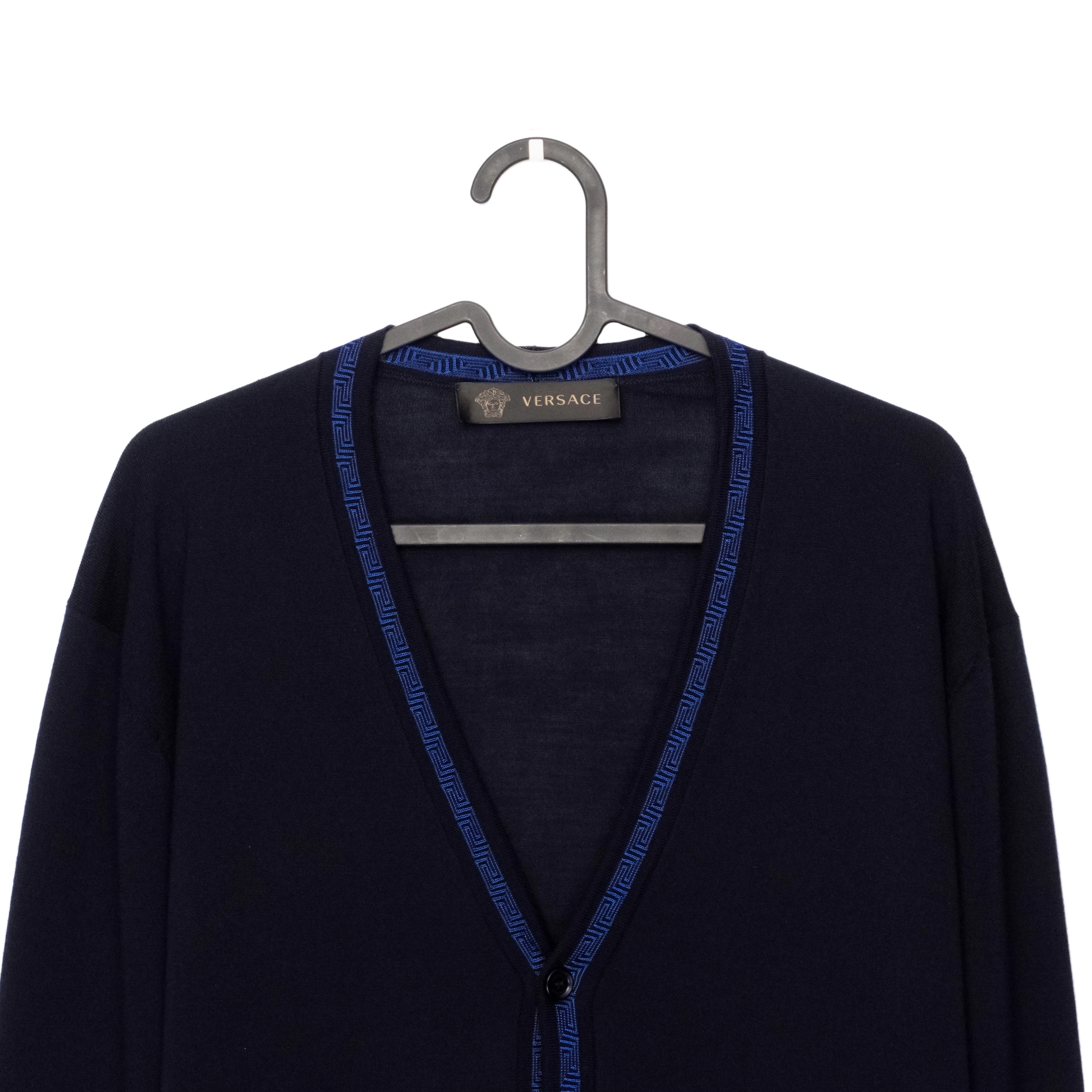 This Versace cardigan is a refined example of Italian craftsmanship, combining luxurious materials with the brand’s signature aesthetic. Made from 100% premium wool, it offers a lightweight yet warm feel, perfect for layering. The deep navy color is complemented by a striking blue Greca-pattern trim that runs along the neckline and button placket—an iconic Versace detail that elevates the minimalist silhouette. A timeless and elegant piece suitable for both casual and elevated looks.