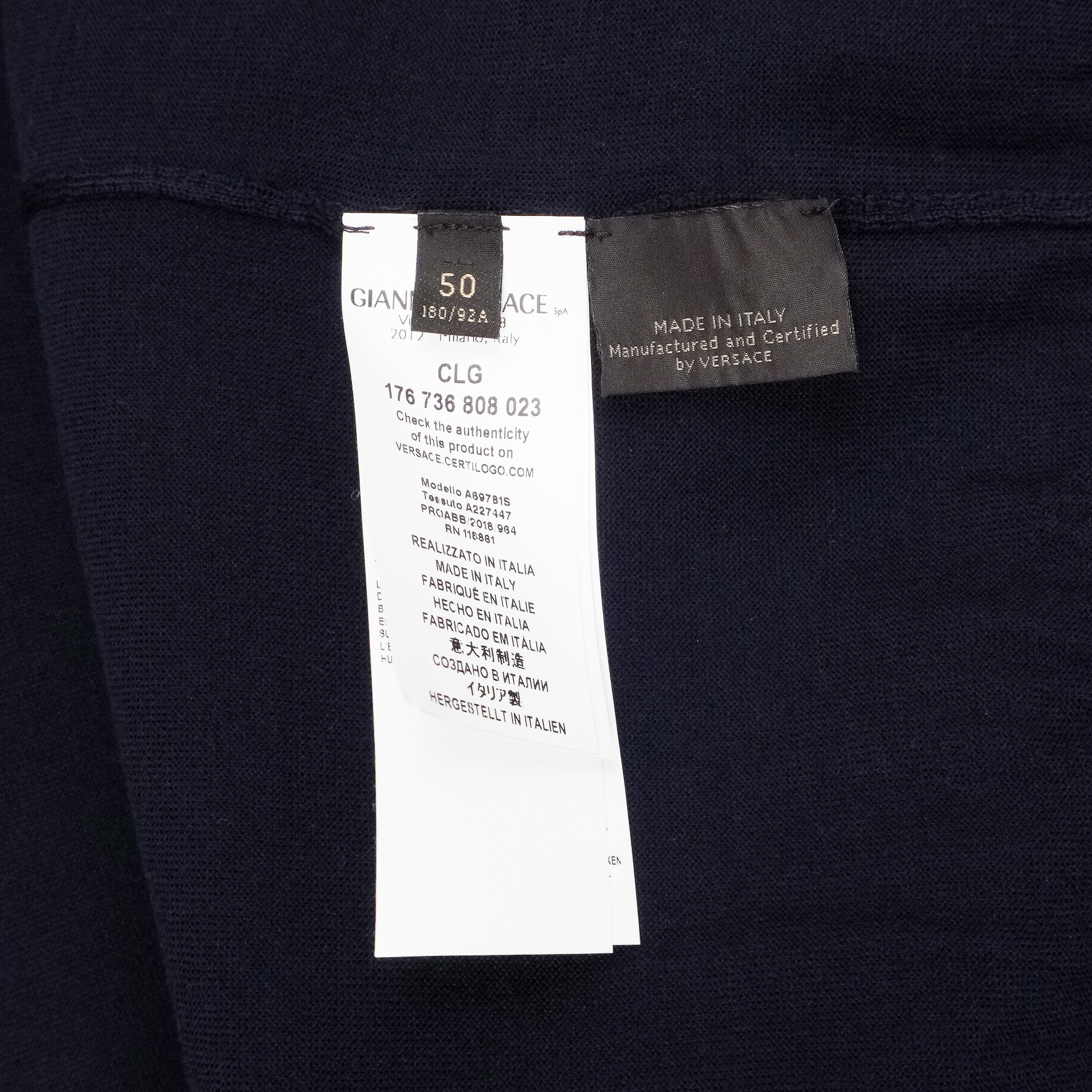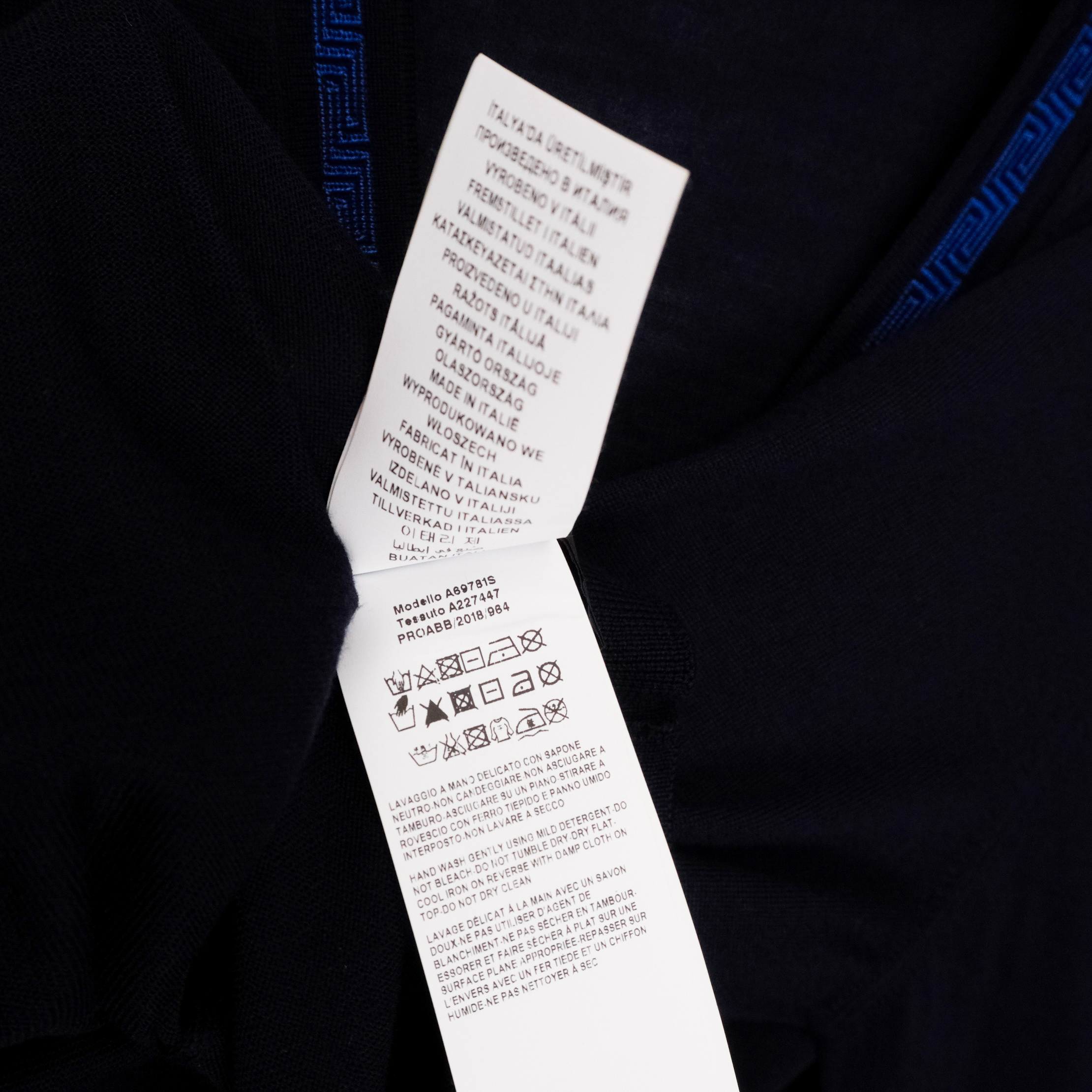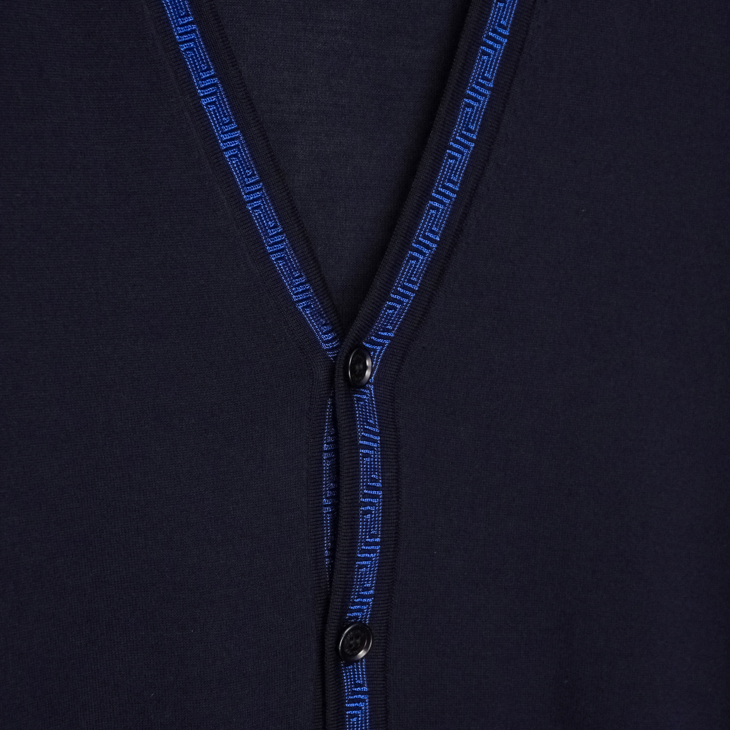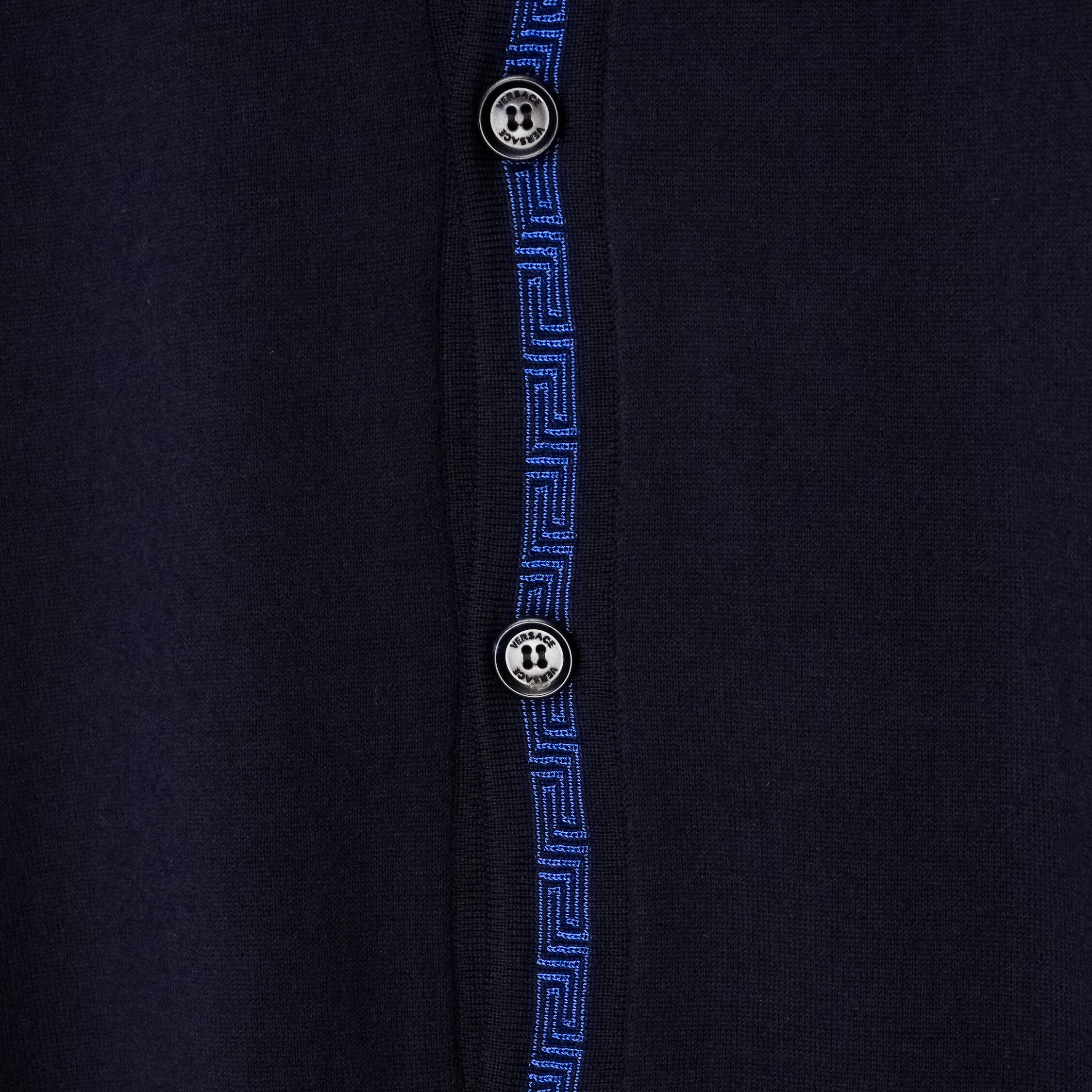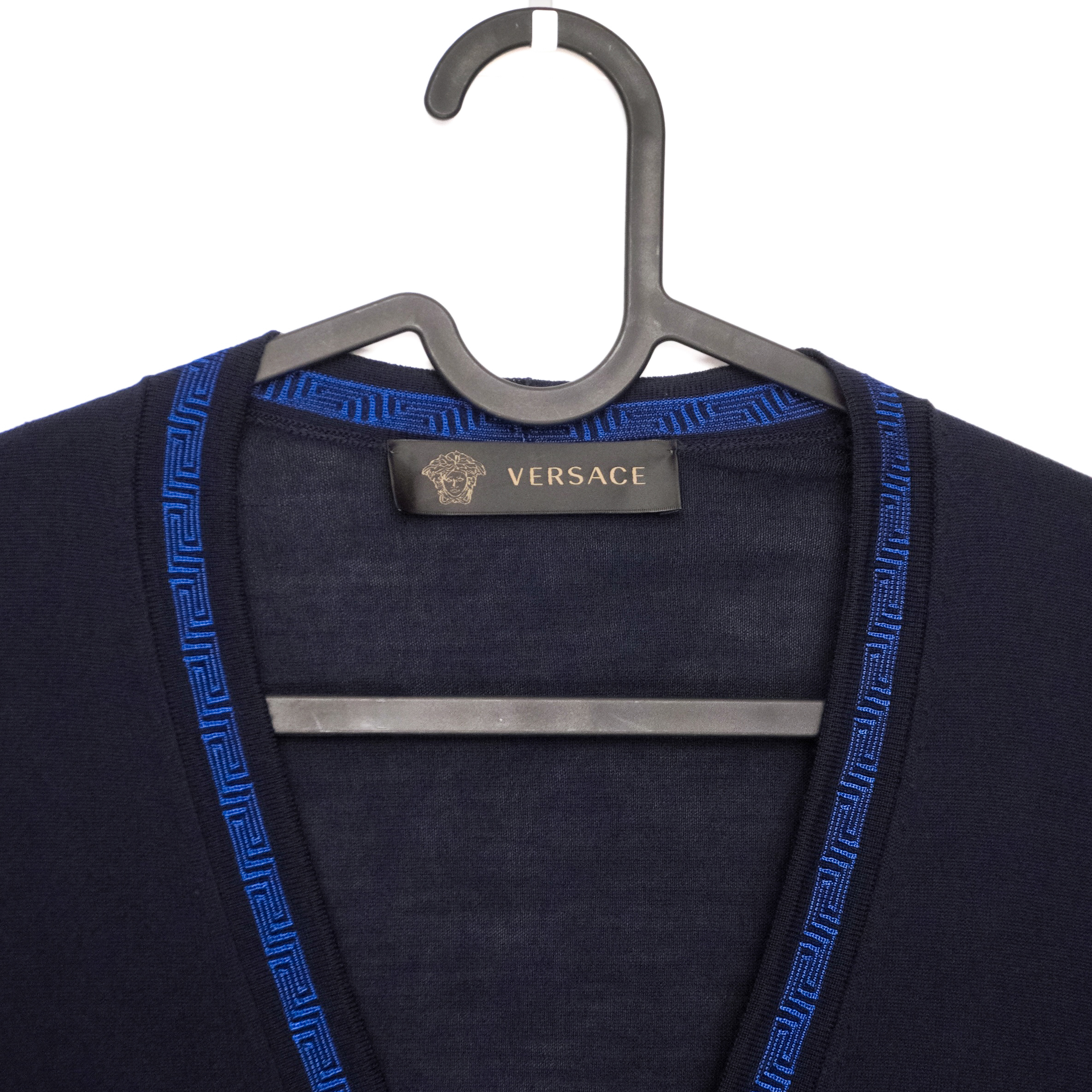 This Versace cardigan is a refined example of Italian craftsmanship, combining luxurious materials with the brand’s signature aesthetic. Made from 100% premium wool, it offers a lightweight yet warm feel, perfect for layering. The deep navy color is complemented by a striking blue Greca-pattern trim that runs along the neckline and button placket—an iconic Versace detail that elevates the minimalist silhouette. A timeless and elegant piece suitable for both casual and elevated looks.