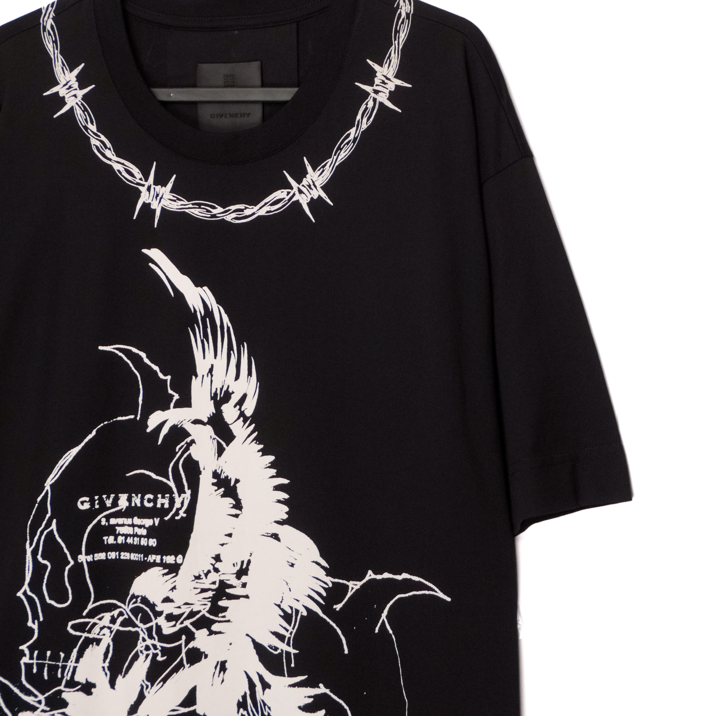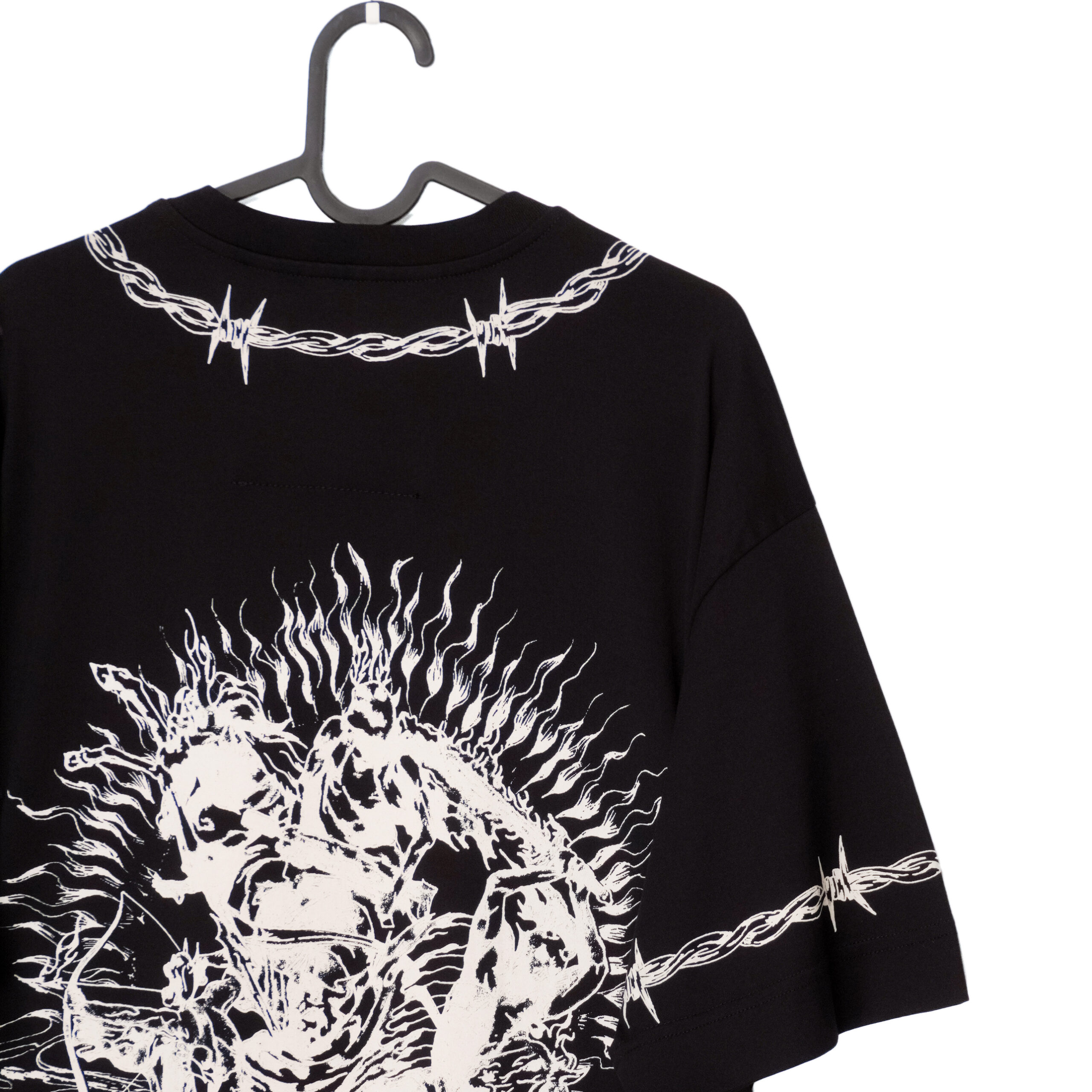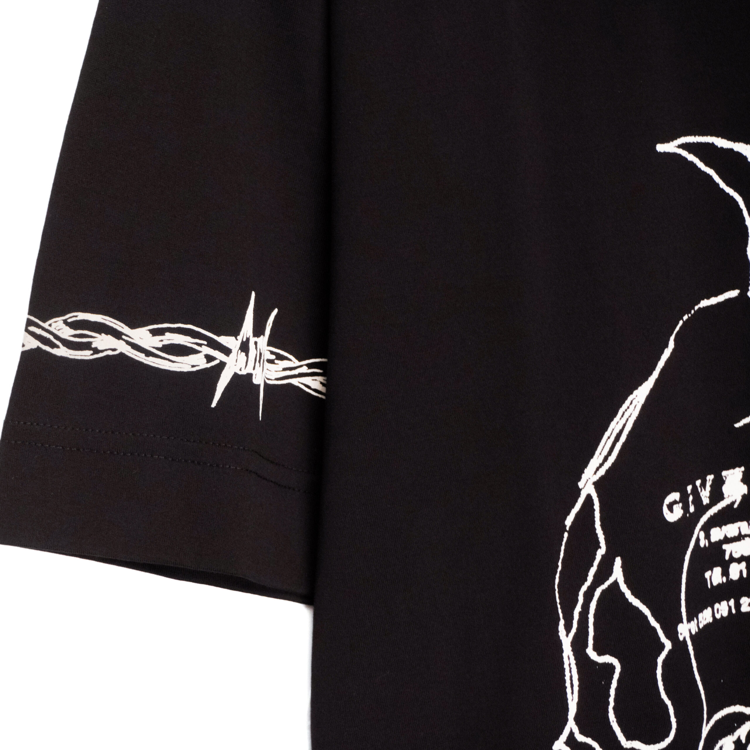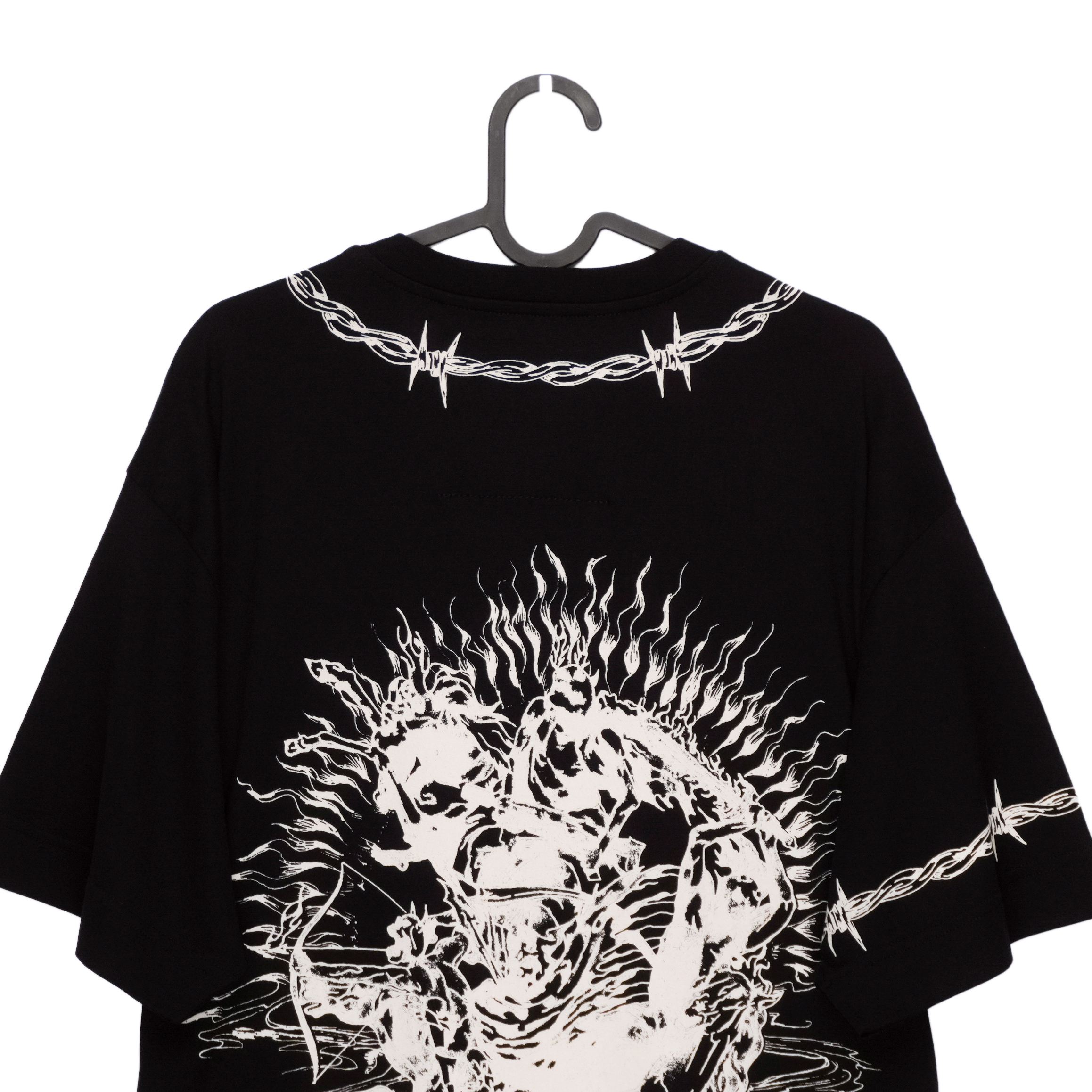 This Givenchy T-shirt is a bold expression of contemporary luxury with a graphic, statement-making edge. Crafted from premium cotton, it features an oversized fit and striking white artwork printed across the front and back. Barbed-wire motifs frame the design, adding a raw, modern aesthetic, while the intricate illustration creates a powerful visual impact. A standout piece for those who appreciate high fashion with an avant-garde twist.