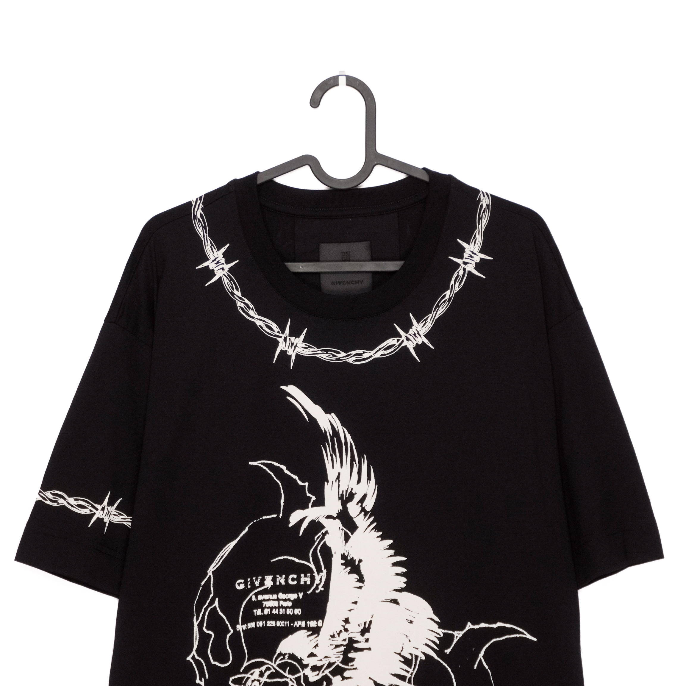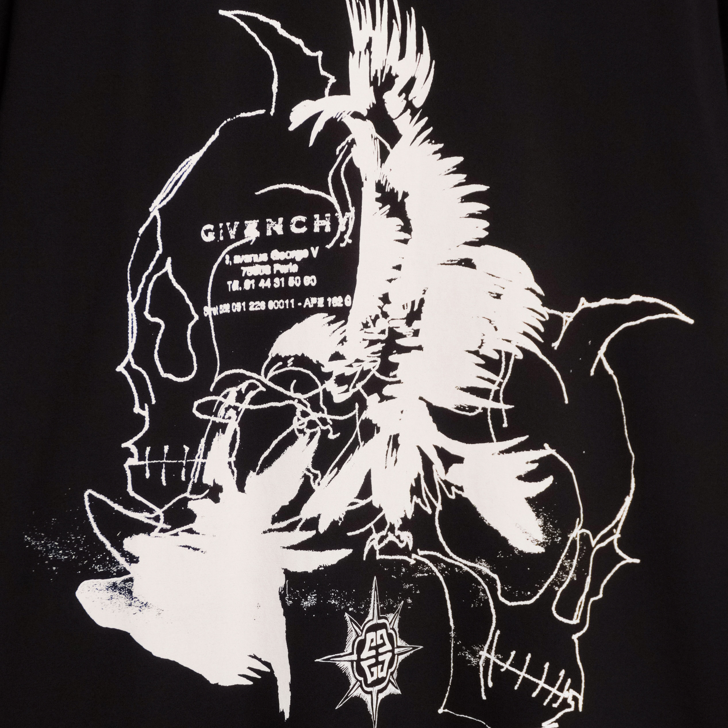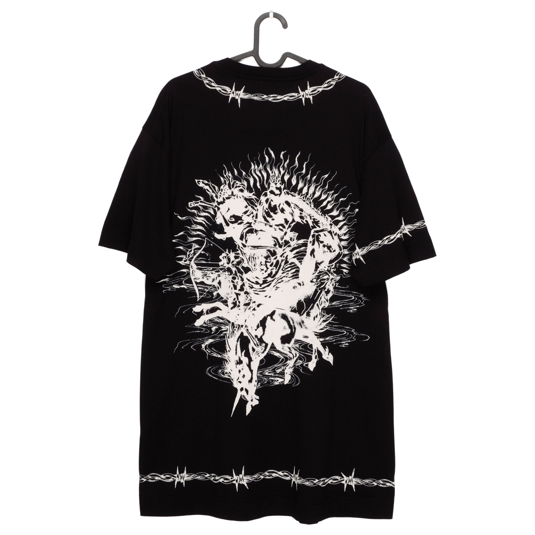 This Givenchy T-shirt is a bold expression of contemporary luxury with a graphic, statement-making edge. Crafted from premium cotton, it features an oversized fit and striking white artwork printed across the front and back. Barbed-wire motifs frame the design, adding a raw, modern aesthetic, while the intricate illustration creates a powerful visual impact. A standout piece for those who appreciate high fashion with an avant-garde twist.