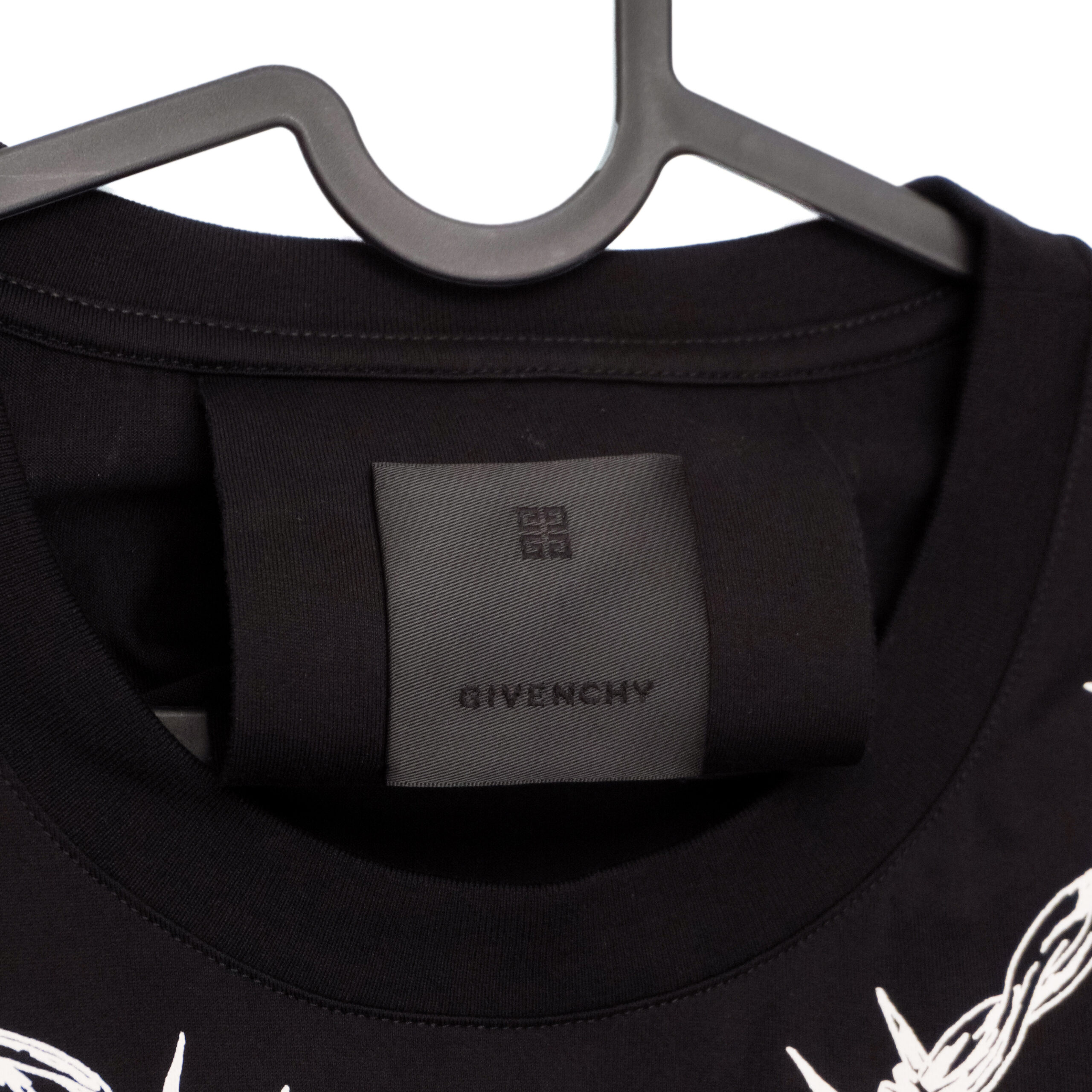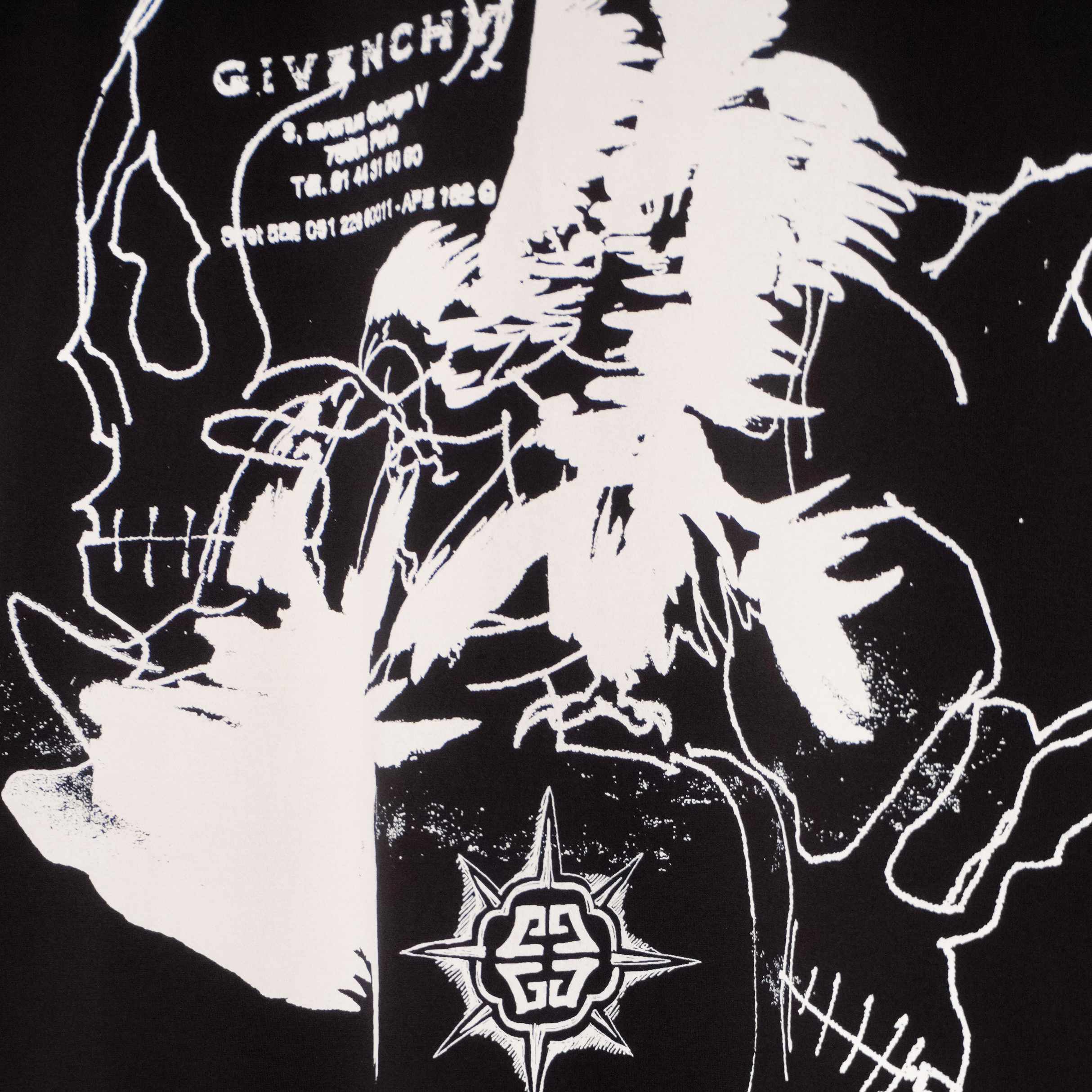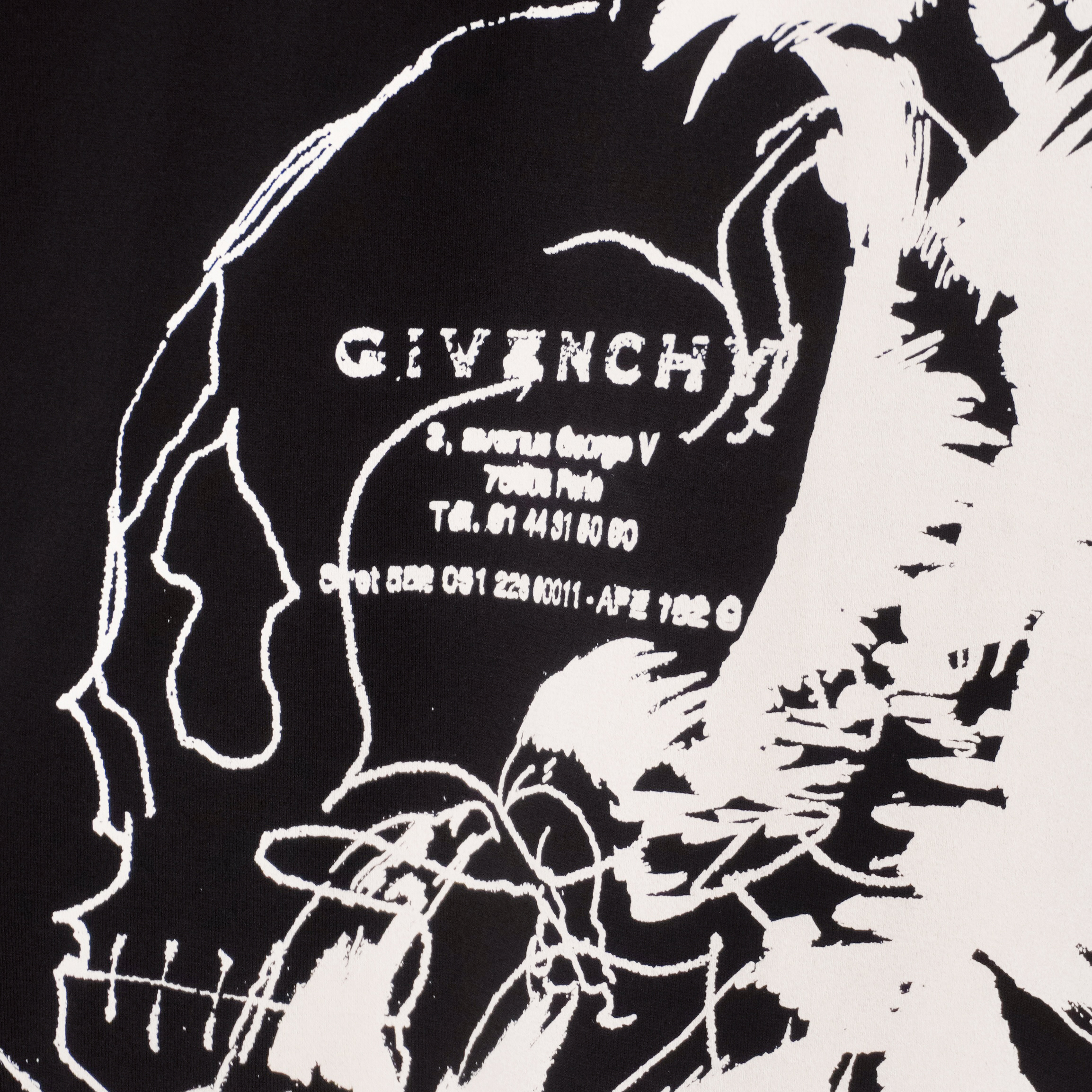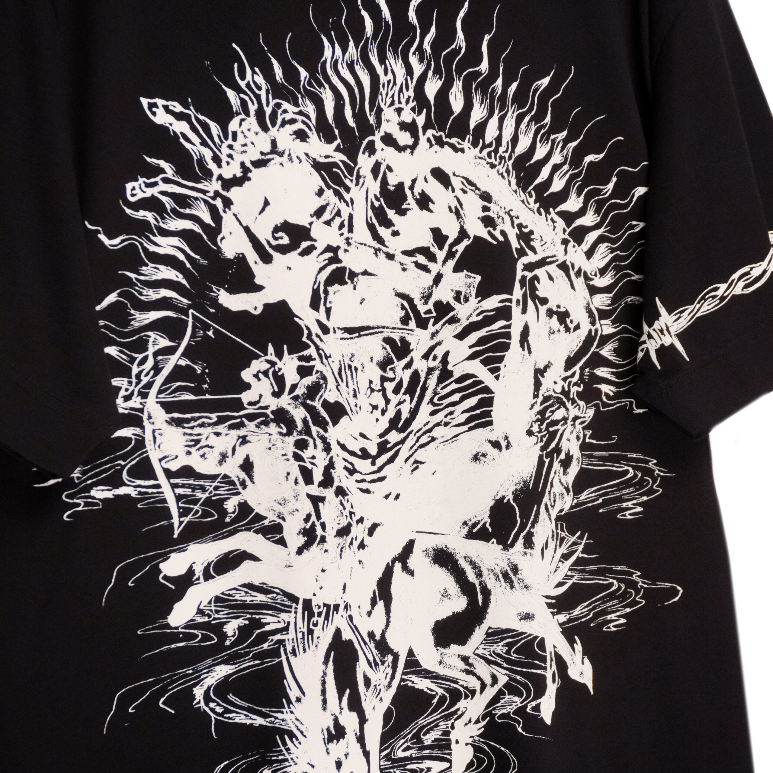 This Givenchy T-shirt is a bold expression of contemporary luxury with a graphic, statement-making edge. Crafted from premium cotton, it features an oversized fit and striking white artwork printed across the front and back. Barbed-wire motifs frame the design, adding a raw, modern aesthetic, while the intricate illustration creates a powerful visual impact. A standout piece for those who appreciate high fashion with an avant-garde twist.
