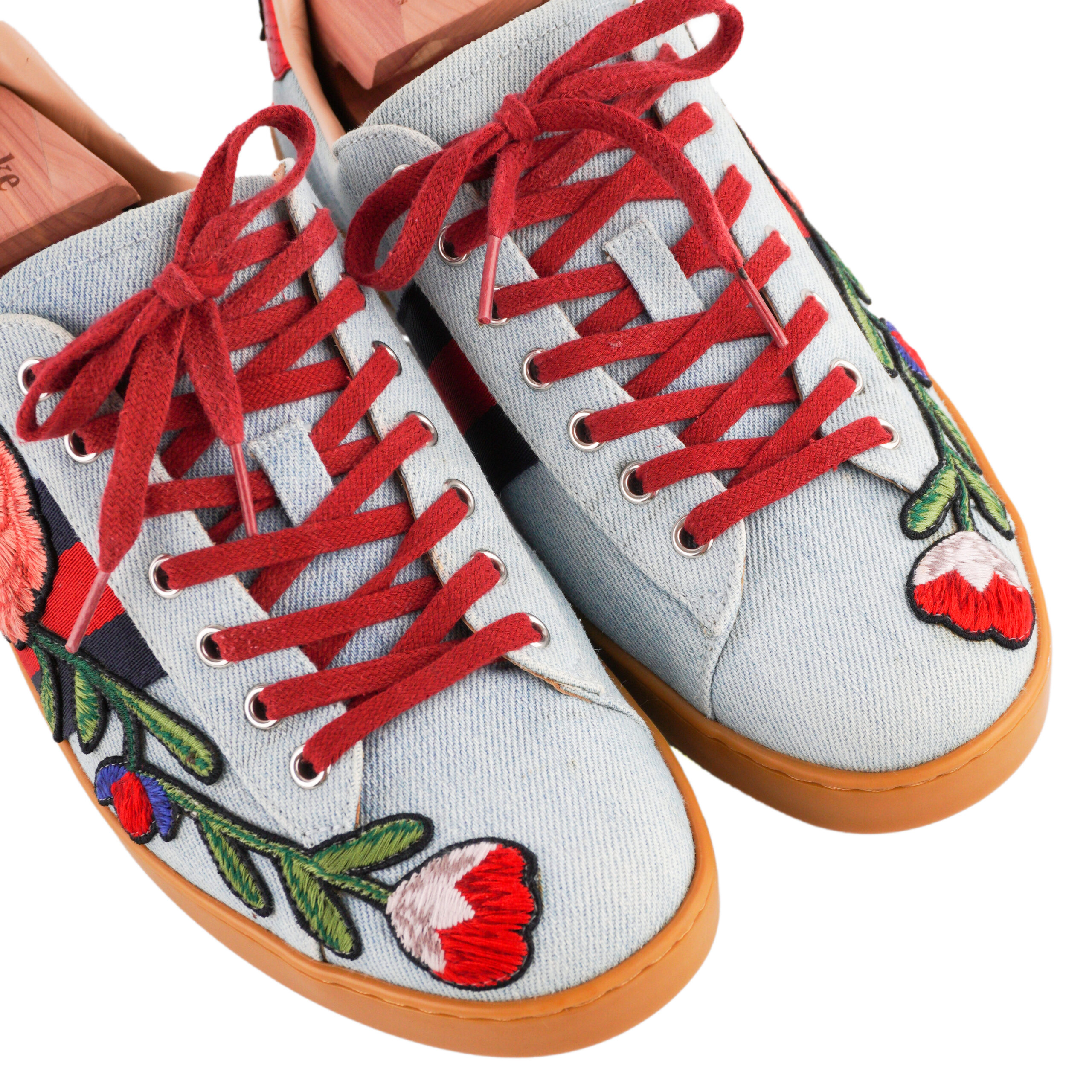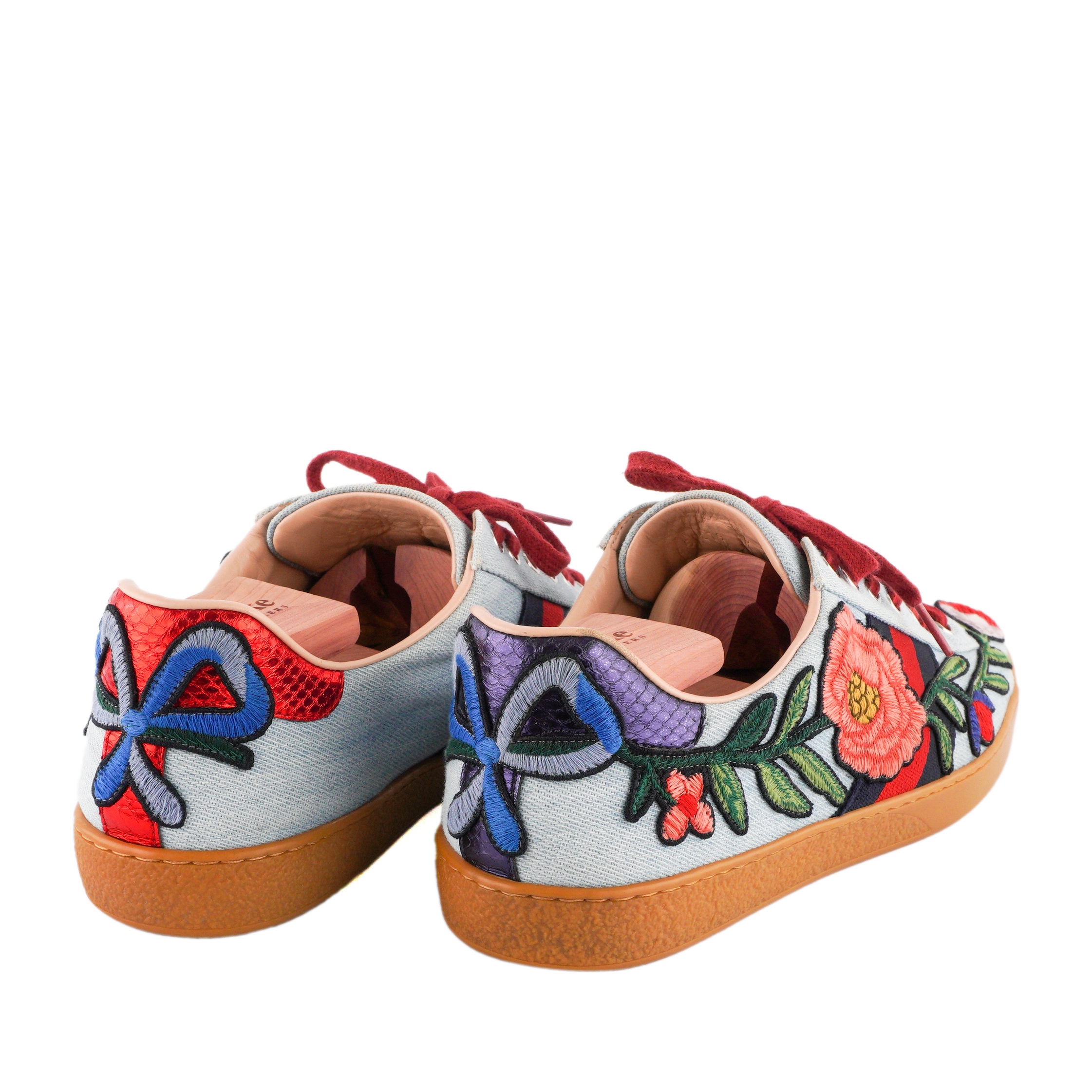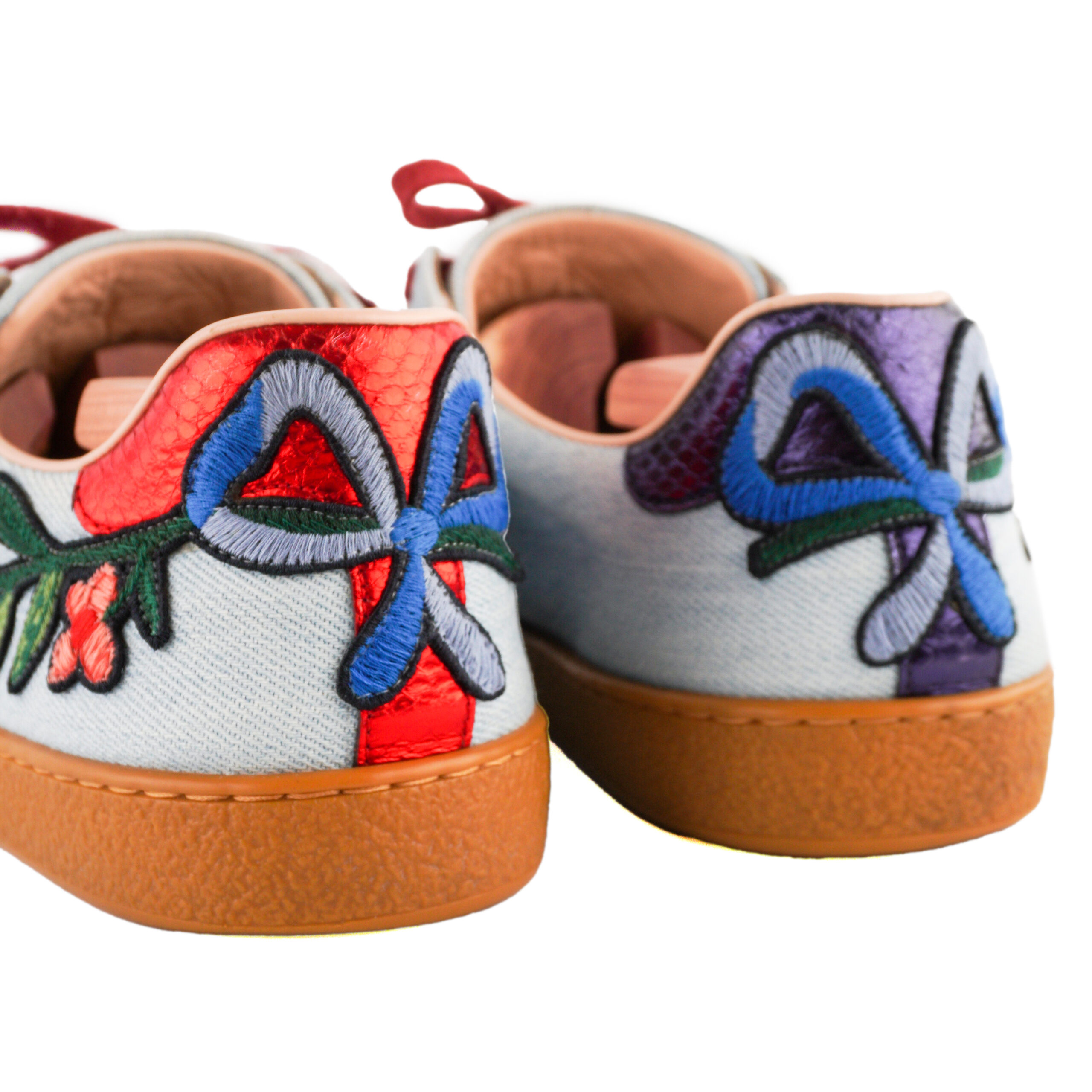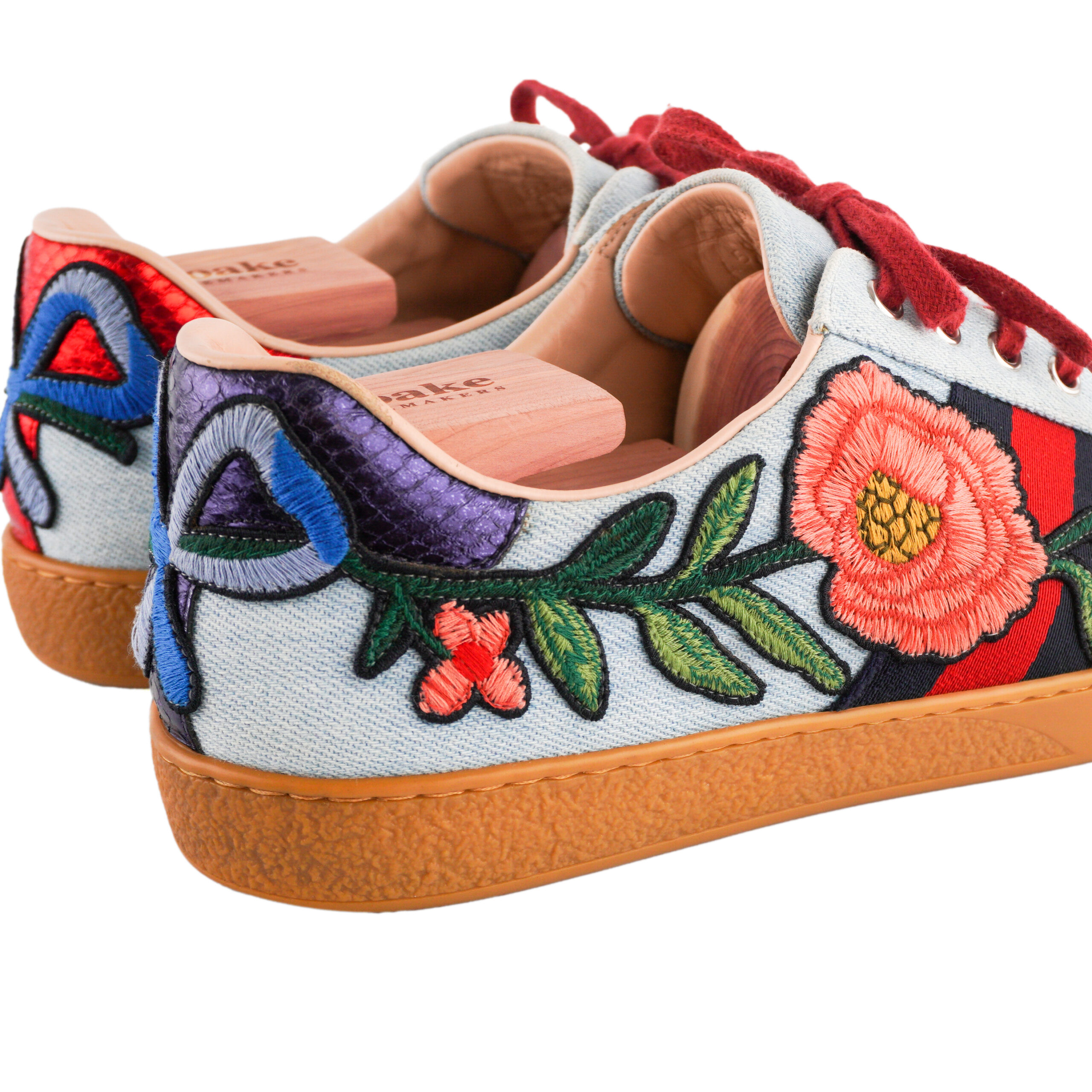 These Gucci sneakers embody playful Italian luxury with a bold twist. Crafted from light blue denim canvas, they feature intricate multicolor floral embroidery along the sides, accented with the brand’s signature red and navy web stripe. Vibrant red laces and metallic snakeskin heel tabs in mismatched tones (red on one shoe, purple on the other) add striking contrast, while the gum rubber sole ensures comfort and durability. A truly standout pair that merges Gucci’s heritage with contemporary streetwear flair.