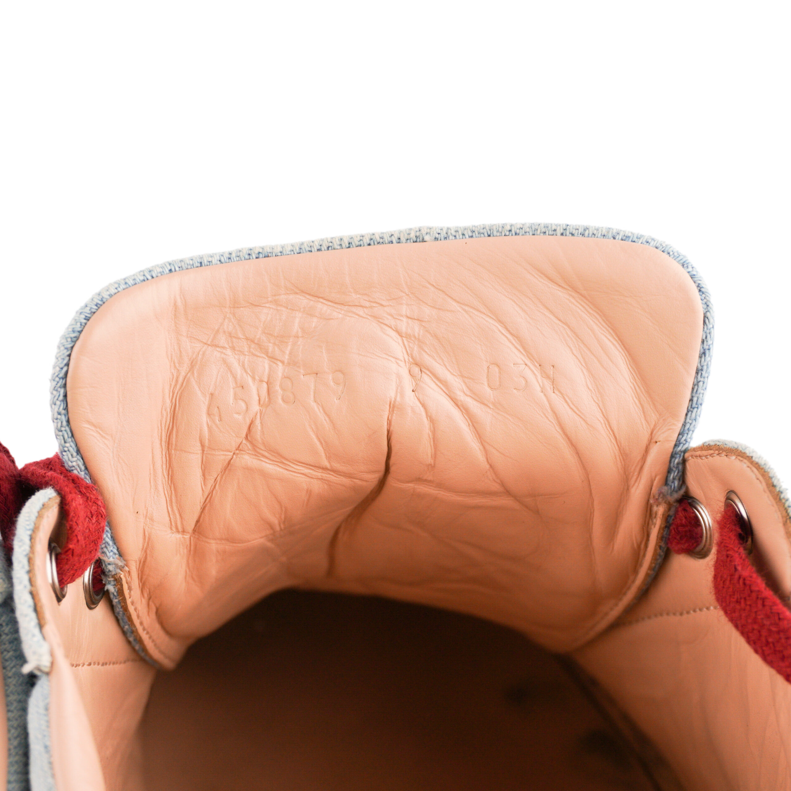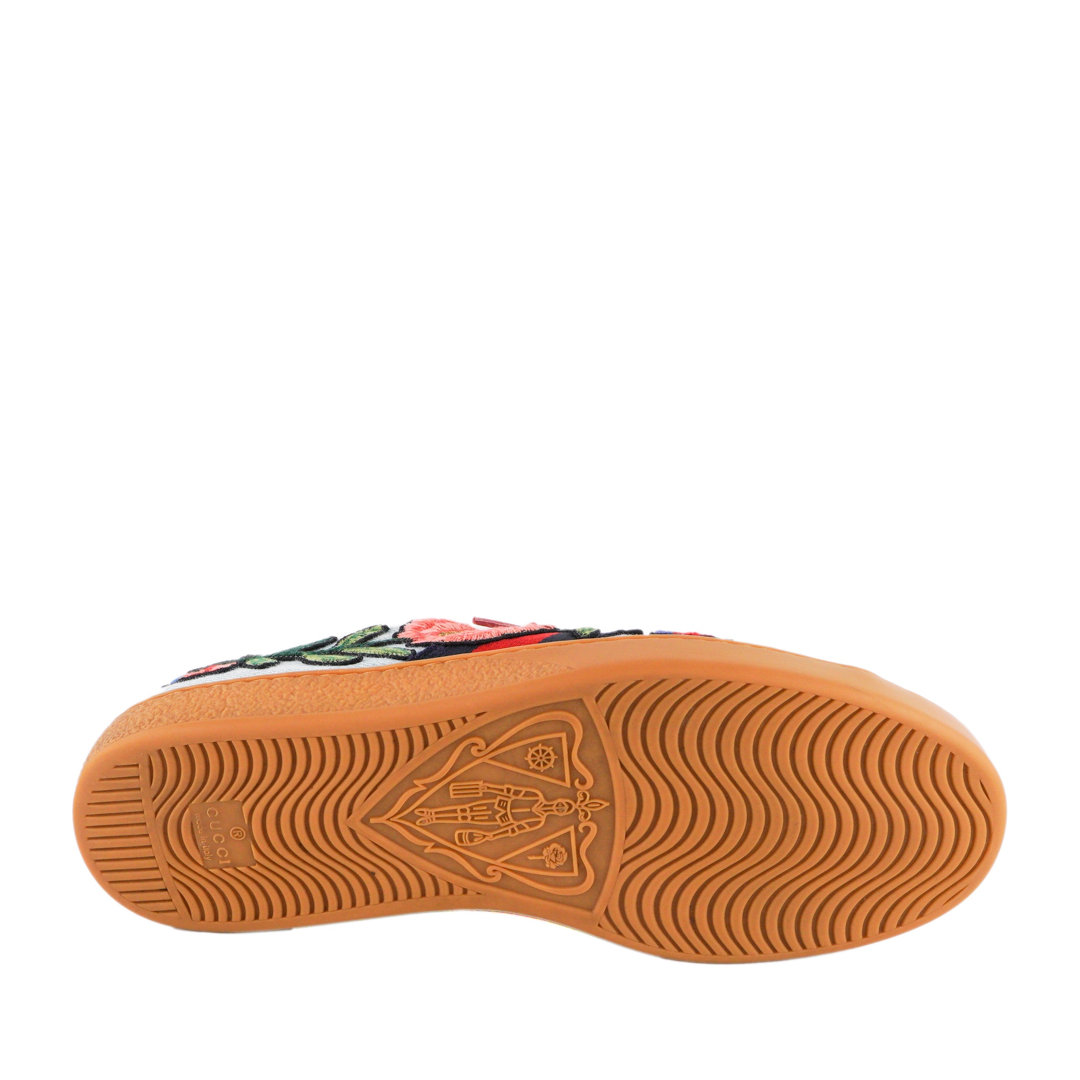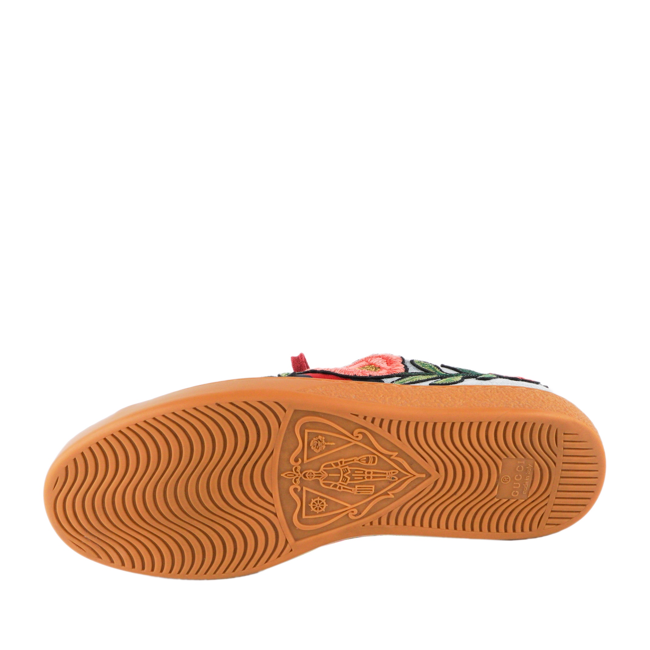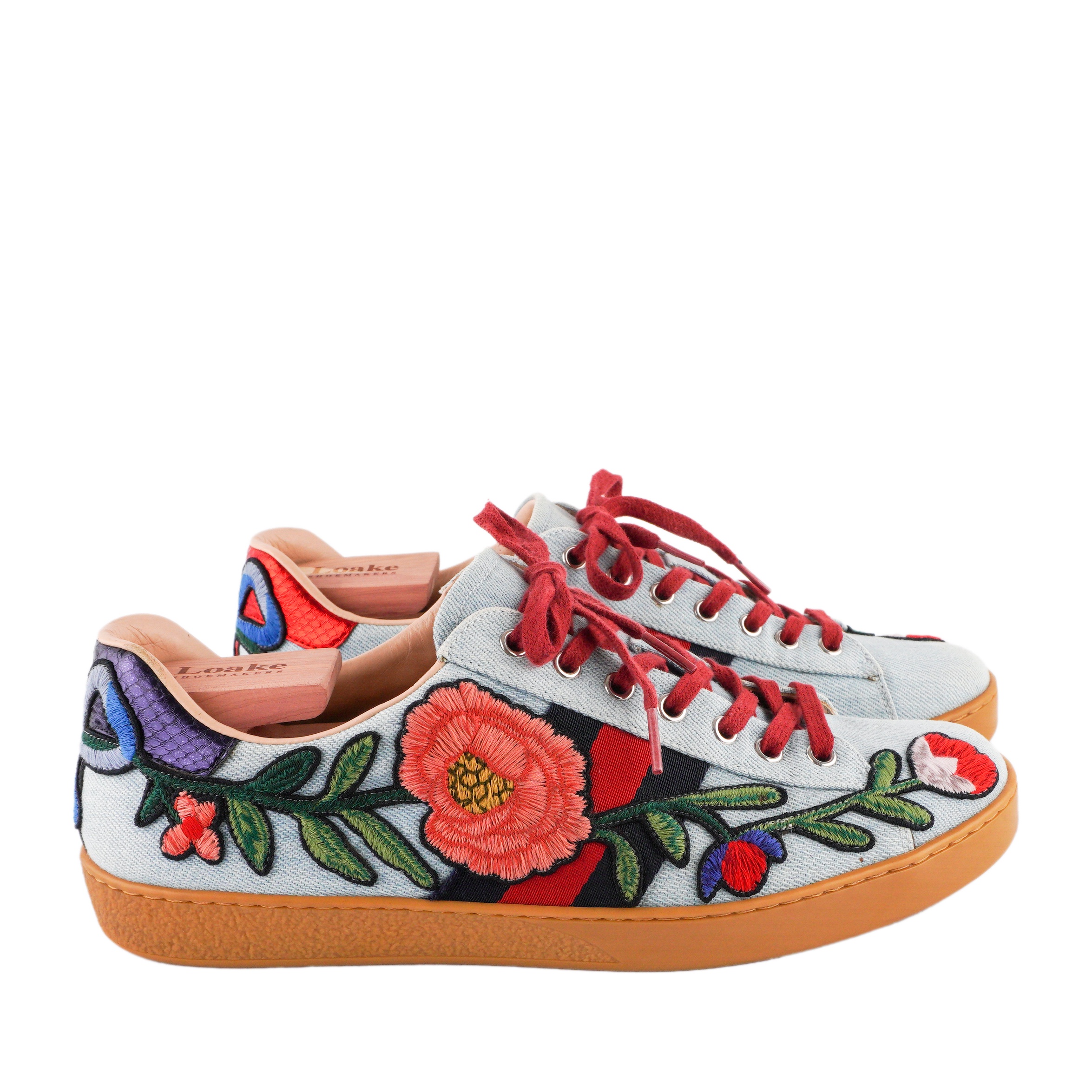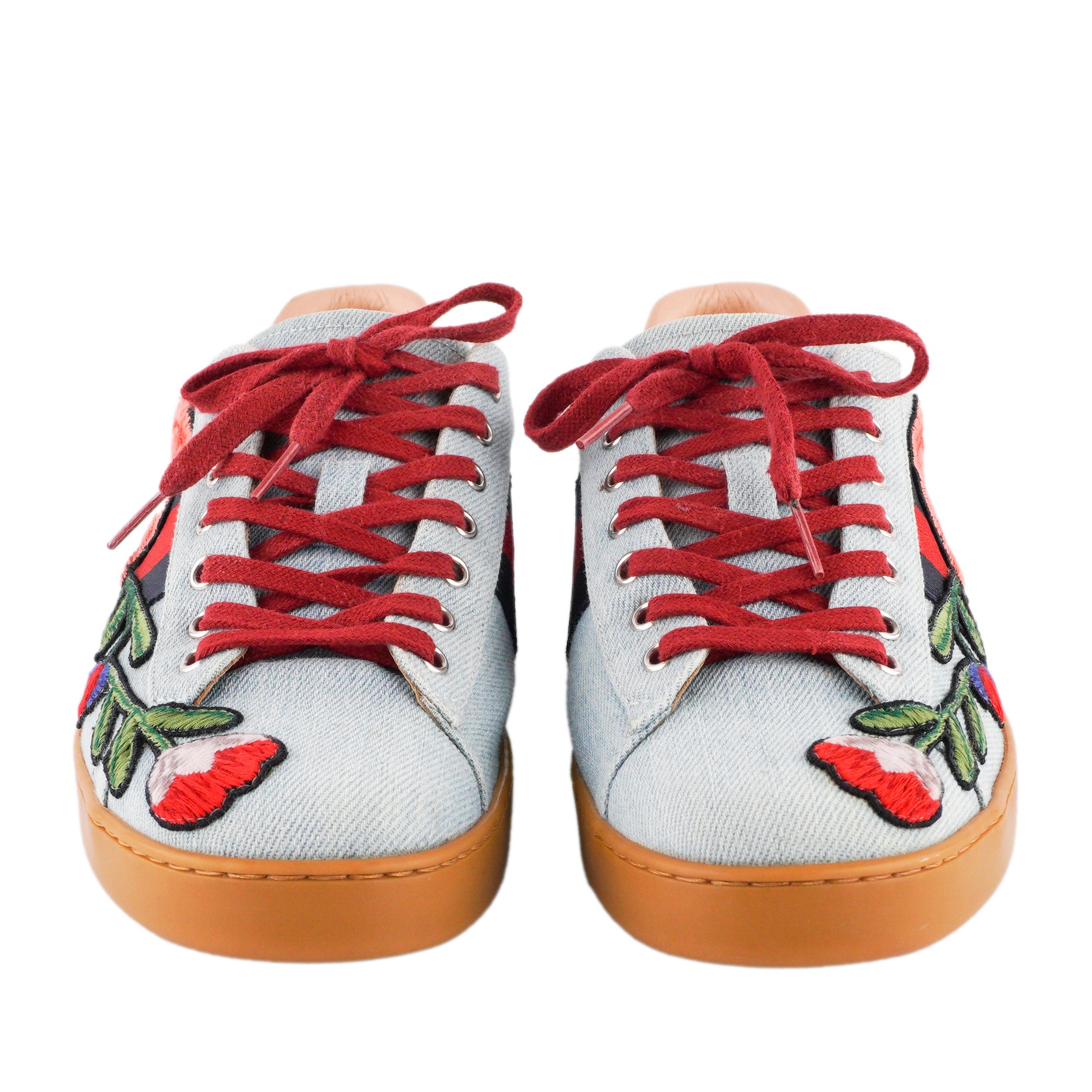 These Gucci sneakers embody playful Italian luxury with a bold twist. Crafted from light blue denim canvas, they feature intricate multicolor floral embroidery along the sides, accented with the brand’s signature red and navy web stripe. Vibrant red laces and metallic snakeskin heel tabs in mismatched tones (red on one shoe, purple on the other) add striking contrast, while the gum rubber sole ensures comfort and durability. A truly standout pair that merges Gucci’s heritage with contemporary streetwear flair.