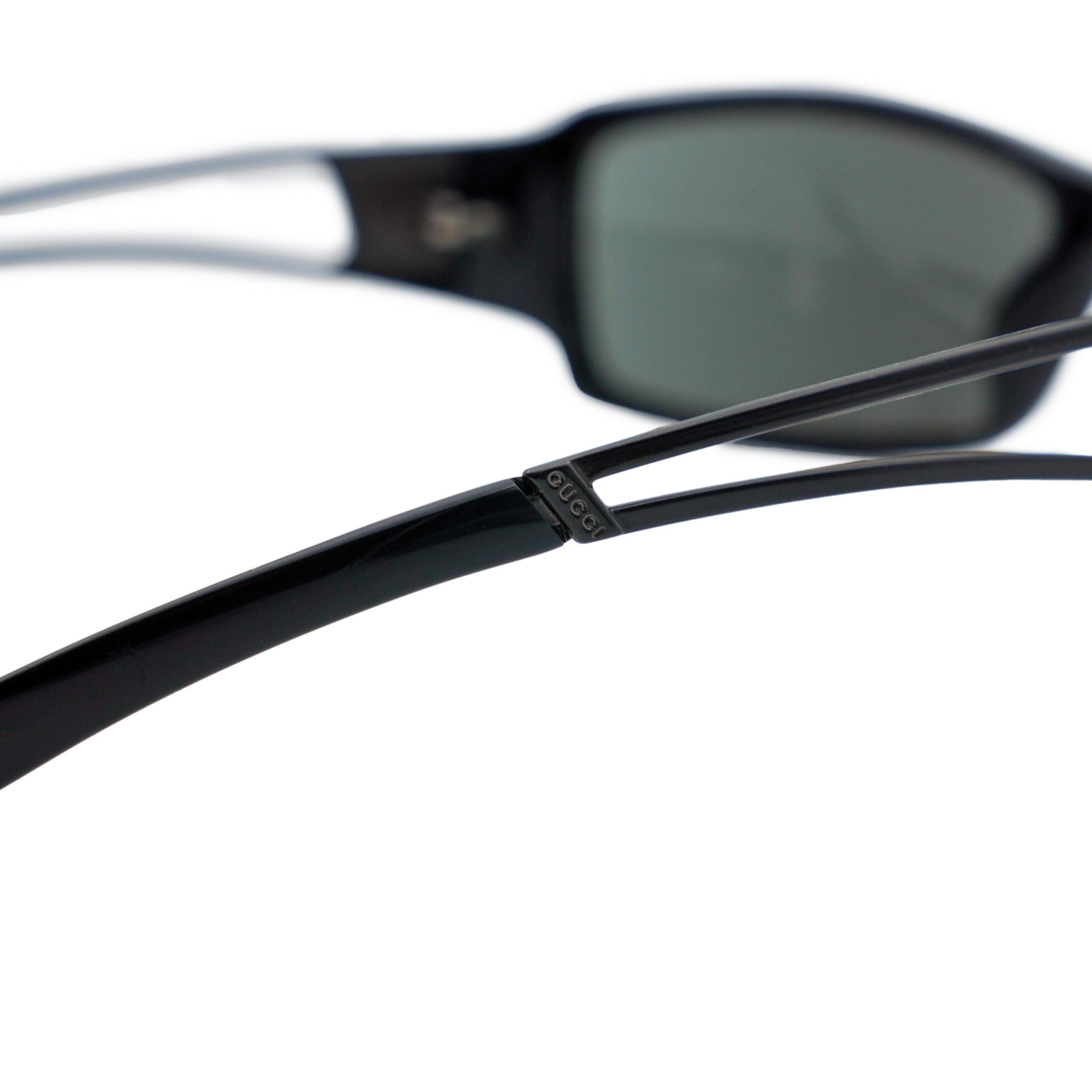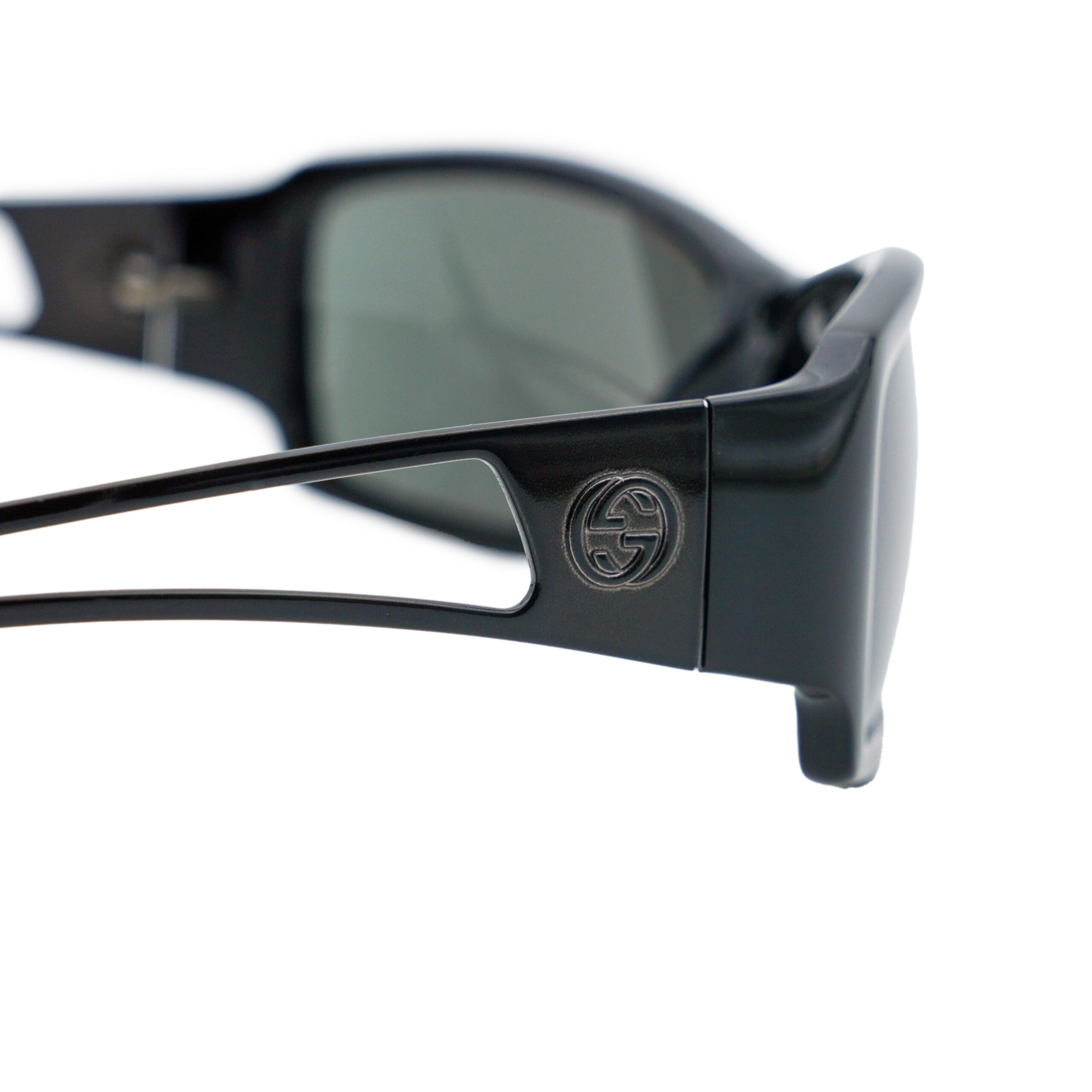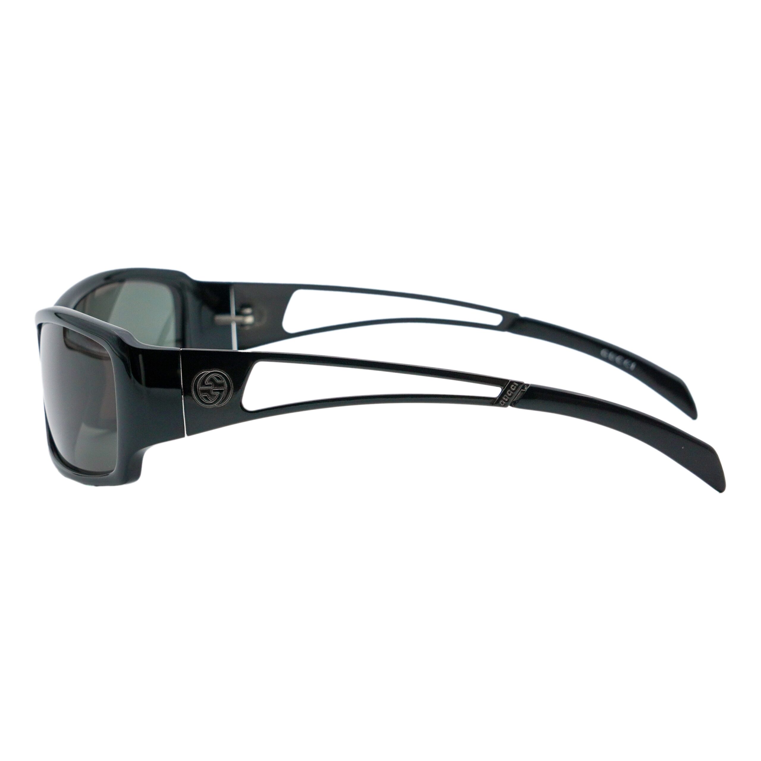 These Gucci sunglasses perfectly embody the bold sophistication of the early 2000s aesthetic. Crafted in Italy, the model GG1486/S features a distinctive cut-out temple design and sleek rectangular wrap frame in glossy black acetate. The tonal Gucci logos on the arms enhance the modern, sculptural silhouette, while the dark lenses provide a confident, urban edge. A statement accessory for those who appreciate refined luxury with an avant-garde twist.