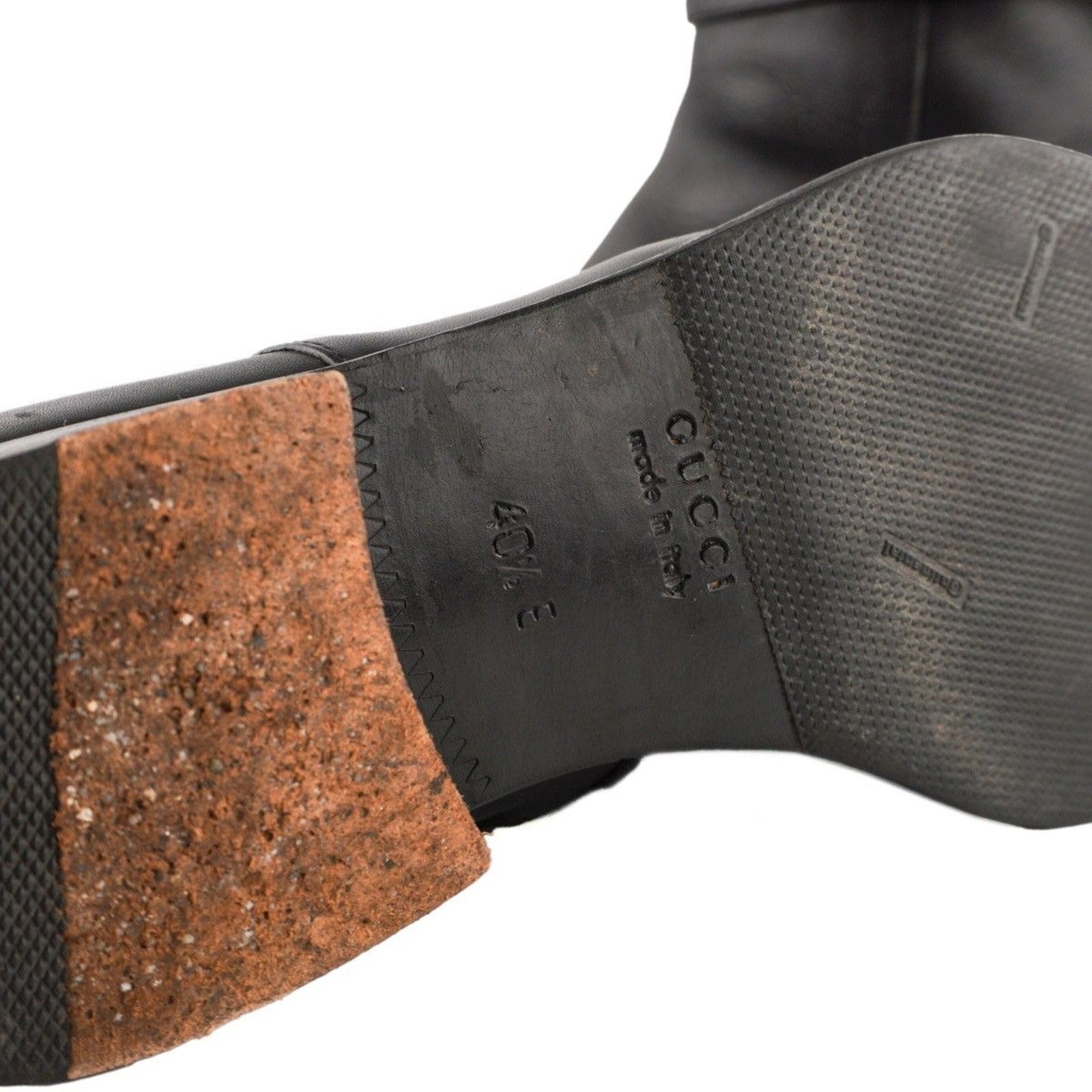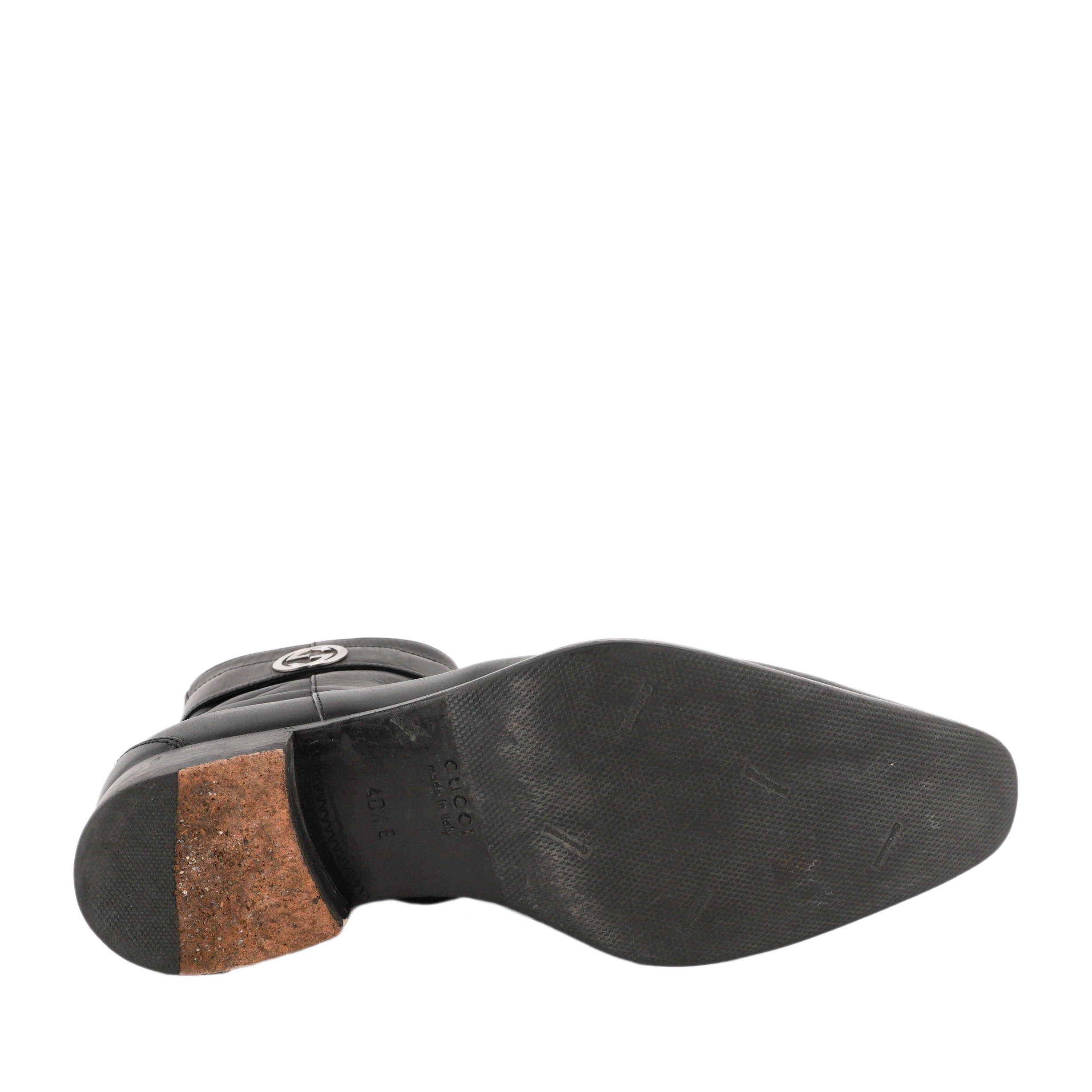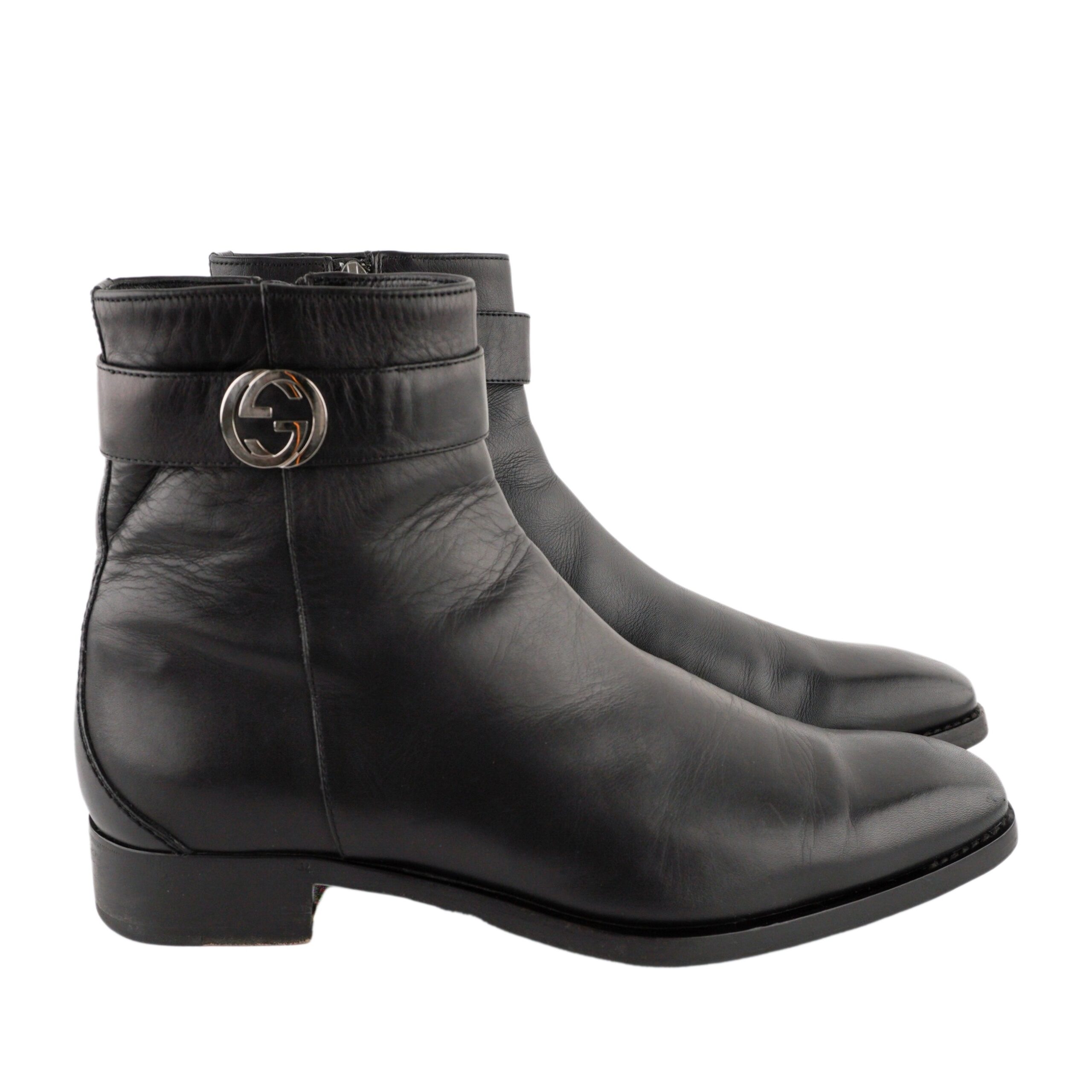 These Gucci leather ankle boots embody refined Italian craftsmanship and timeless luxury. Made from smooth black leather, they feature a sleek silhouette complemented by a signature silver-tone interlocking G logo strap around the ankle. The side zipper ensures easy wear, while the clean design makes them versatile enough for both formal and casual looks. A perfect choice for those who appreciate understated elegance with iconic branding.