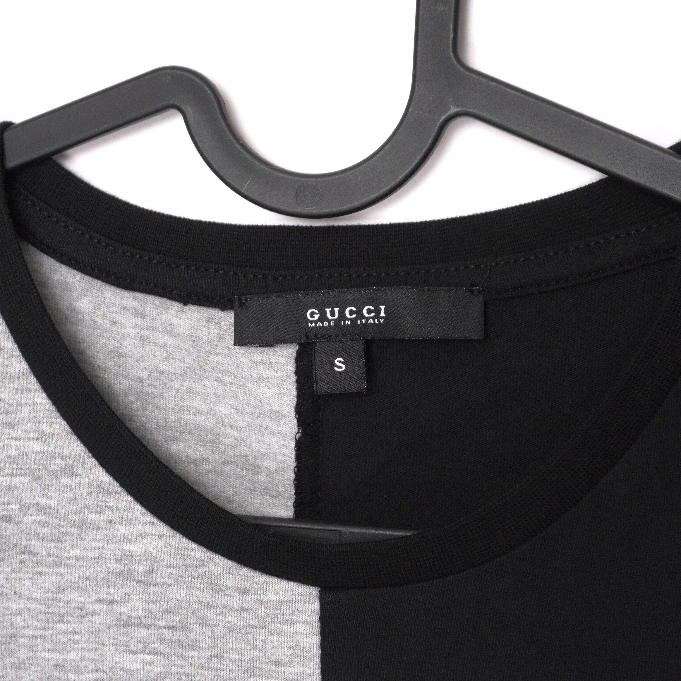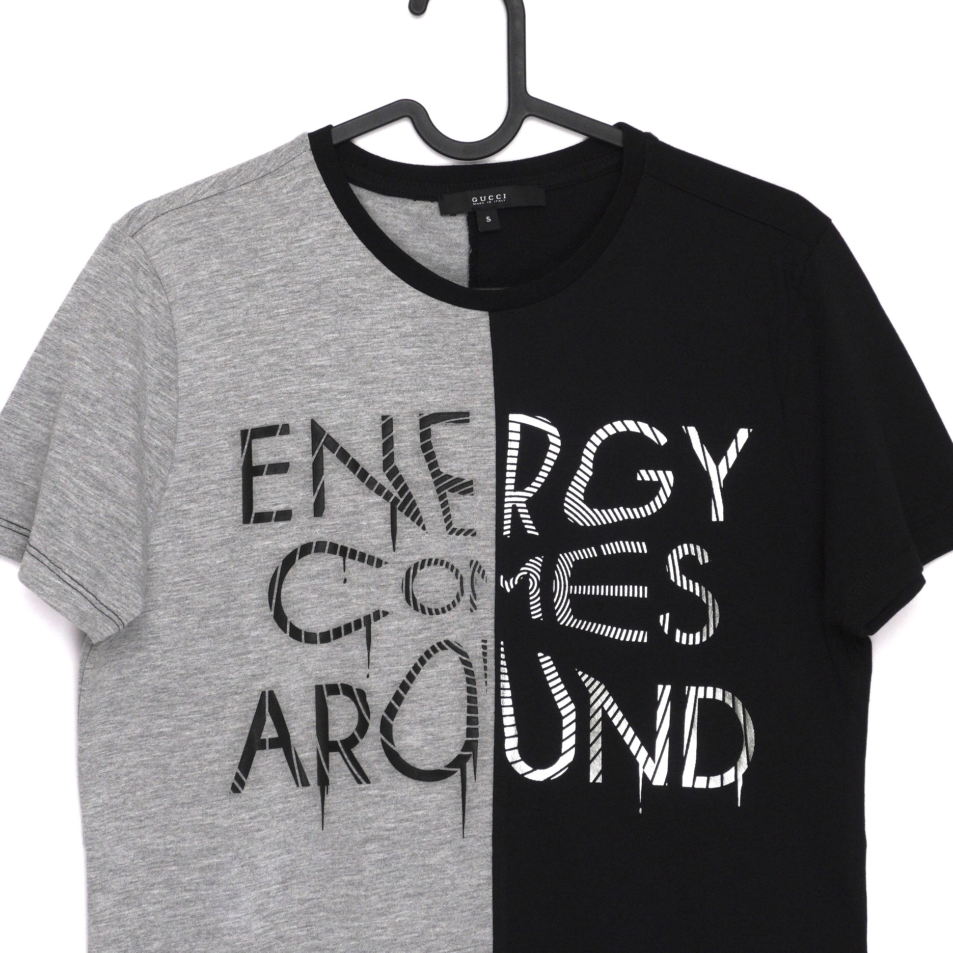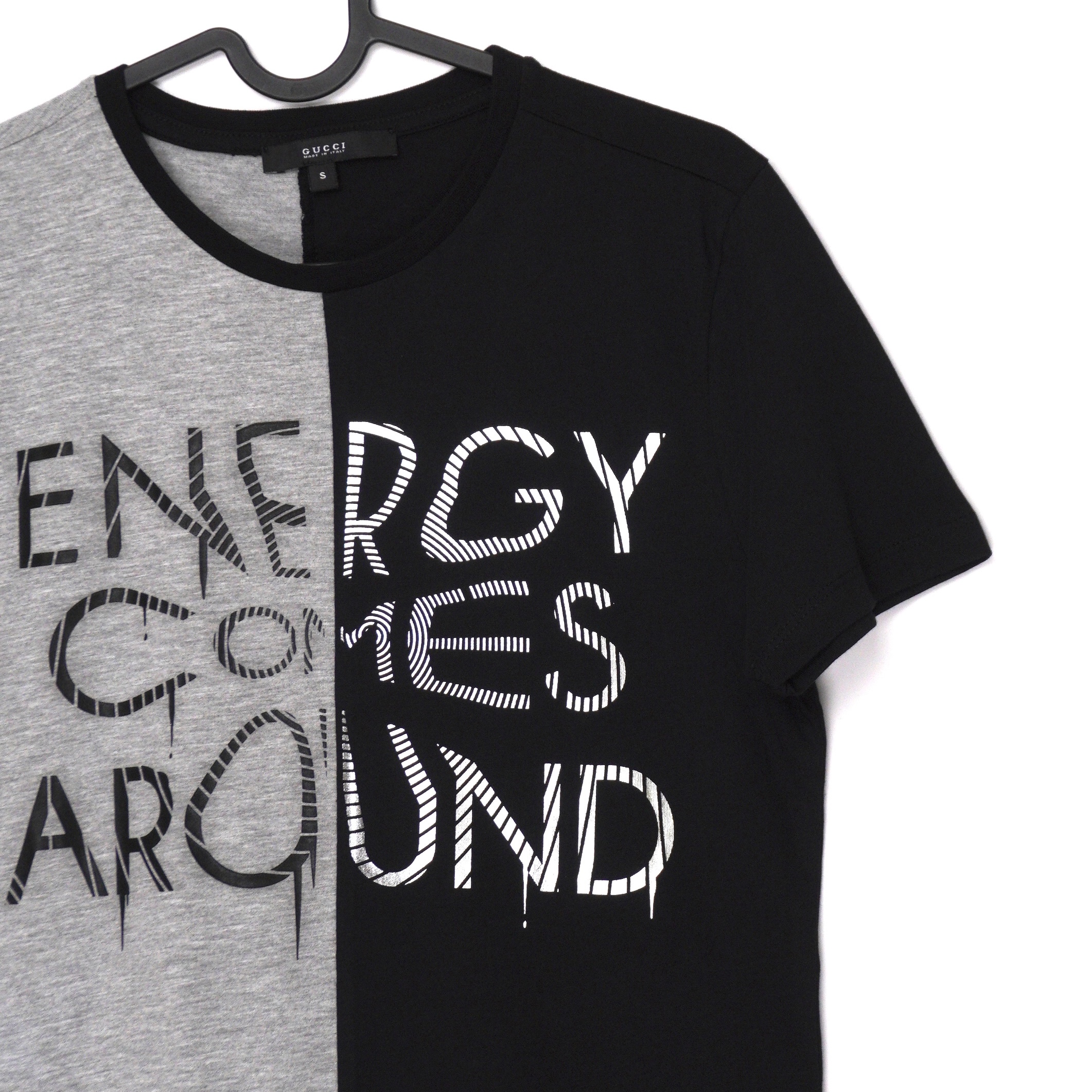This Gucci T-shirt combines bold streetwear energy with Italian craftsmanship. Designed in a half black and half grey split construction, it features the striking slogan print "Energy Comes Around" across the front. Crafted in Italy from 100% premium cotton, it offers a comfortable fit while making a strong visual statement. A modern piece that stands out whether styled casually with denim or layered under a jacket for an elevated look.