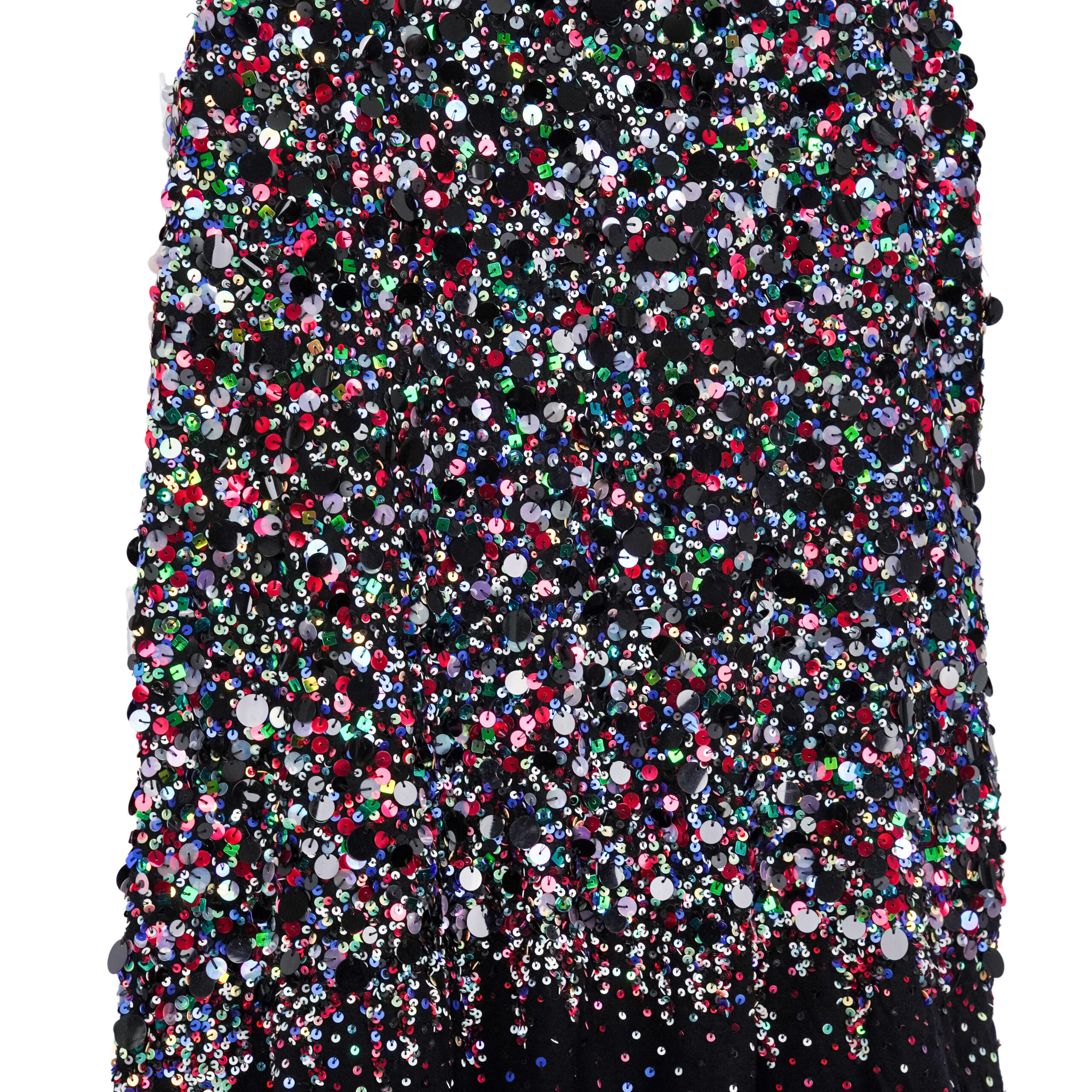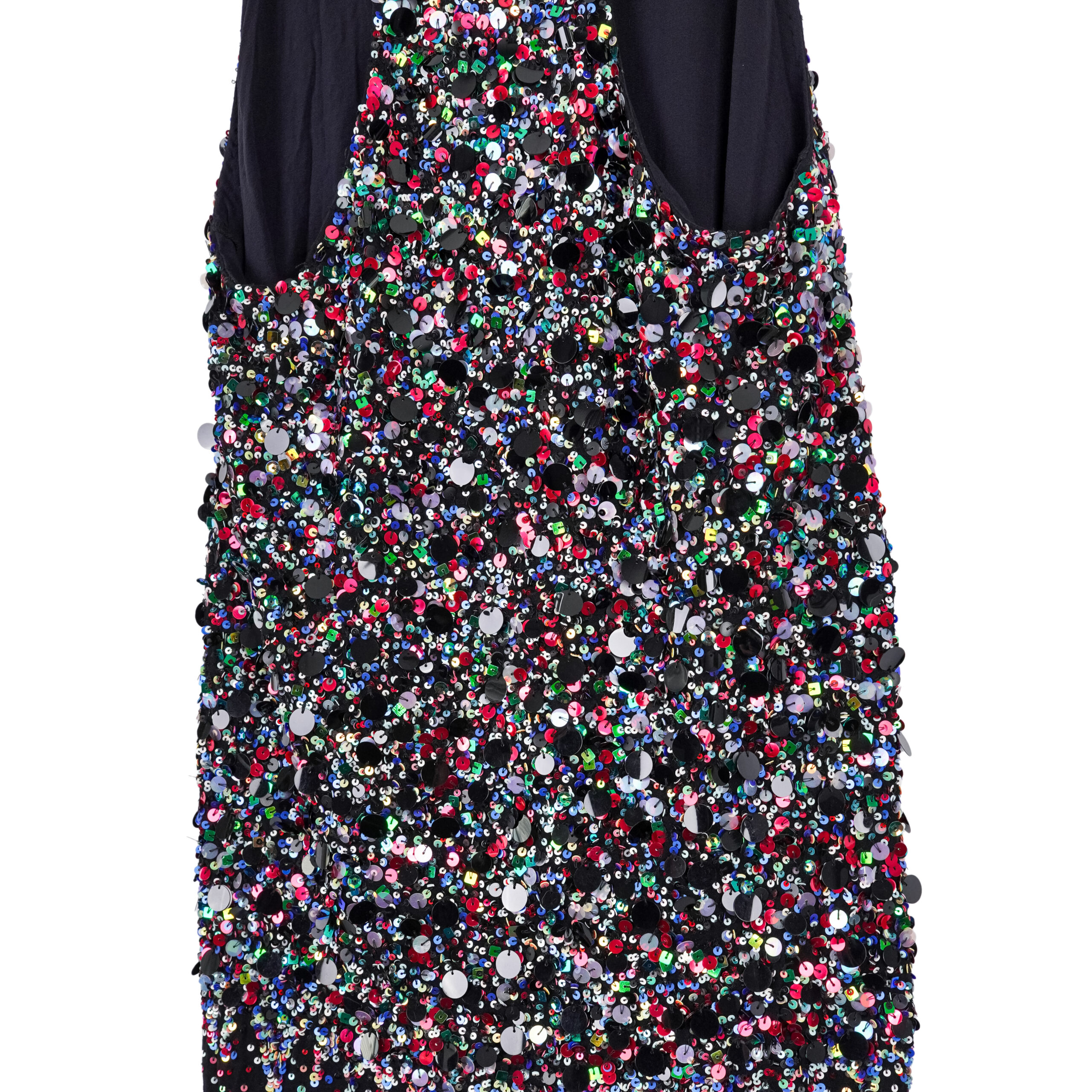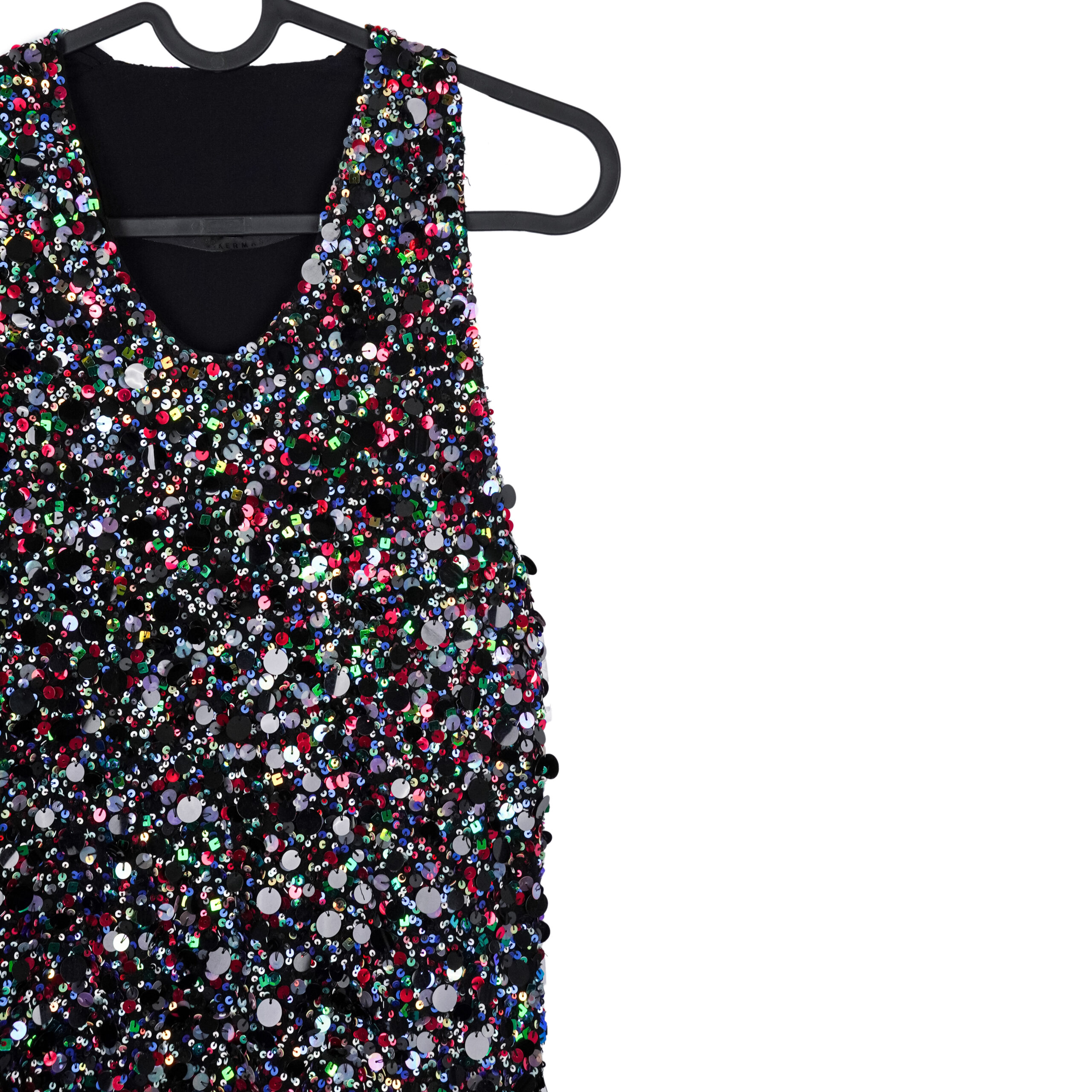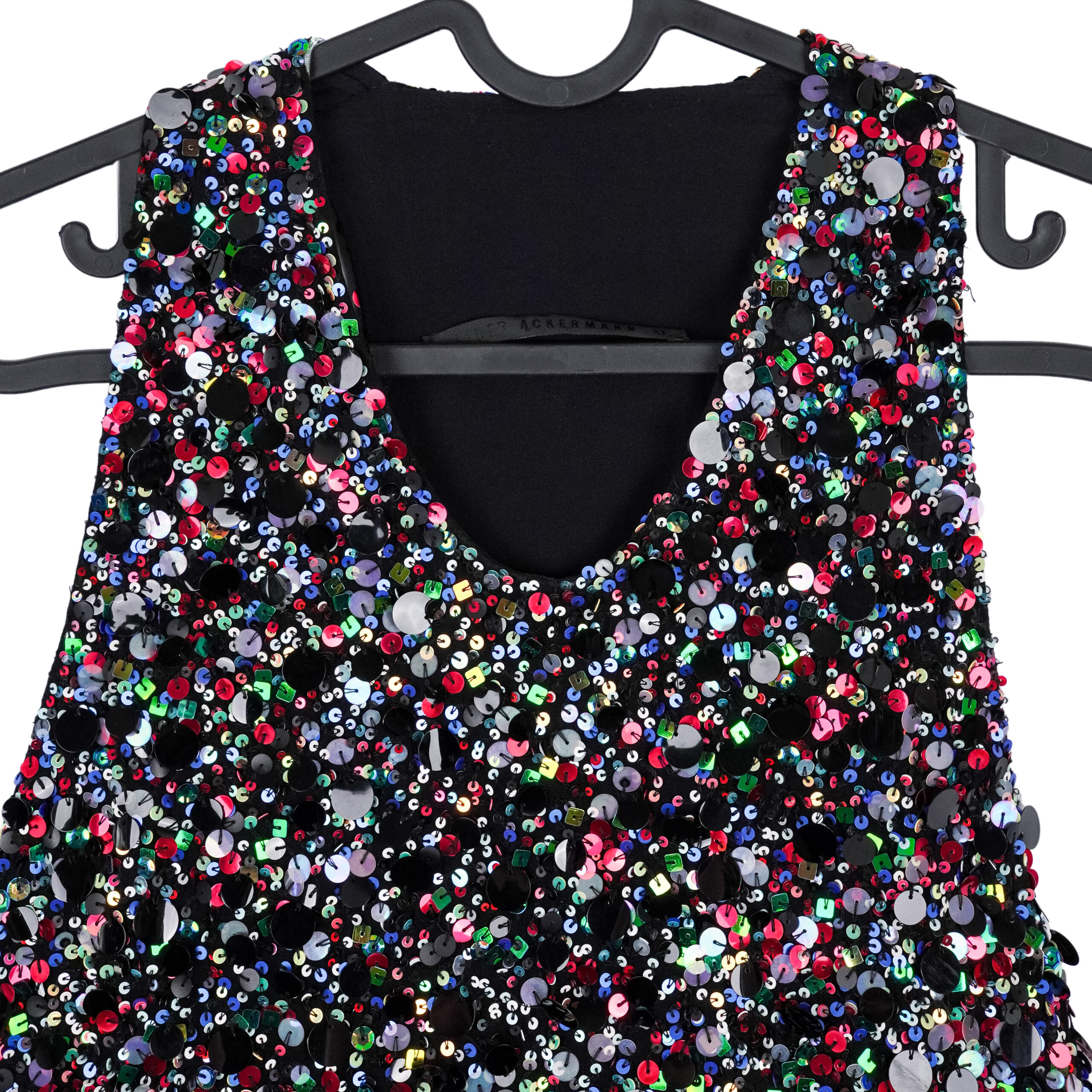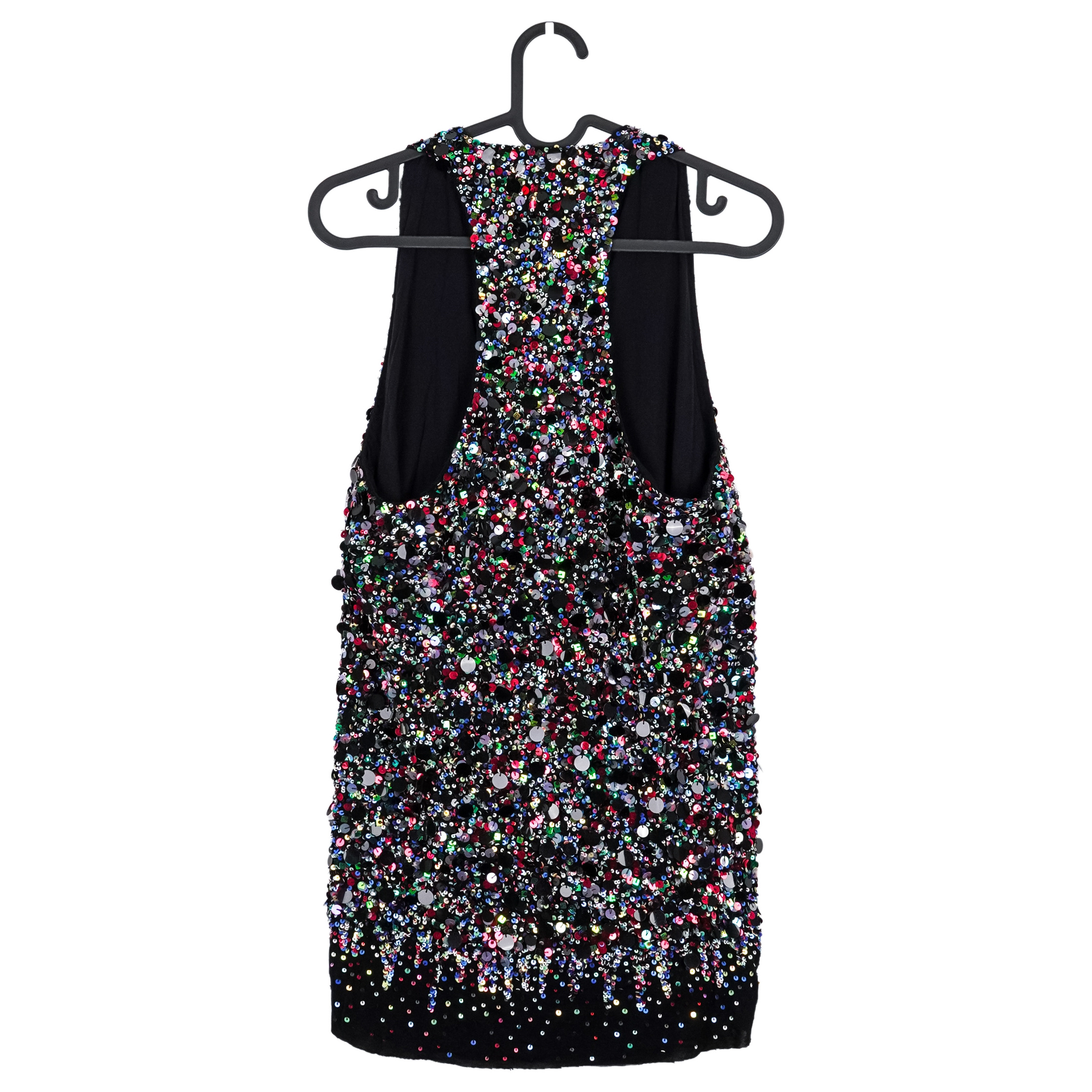This vintage tank top explodes with energy and sparkle, fully embellished in multicolor sequins that shimmer with every move. Crafted with a 100% cotton outer and a silk-spandex lining, it’s both bold and comfortable. A true statement piece perfect for night outs, events, or collectors of avant-garde fashion.