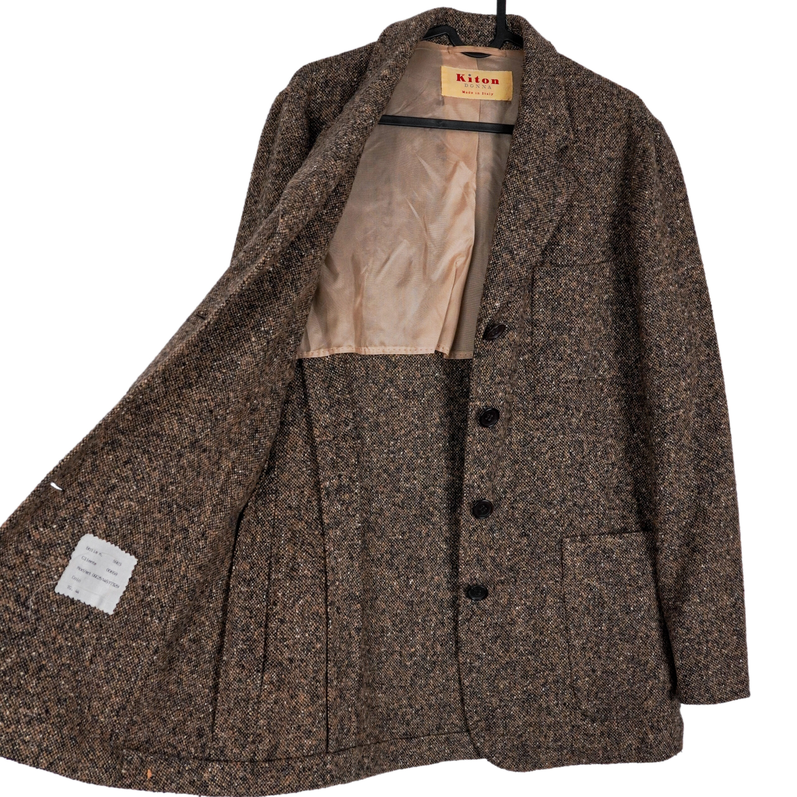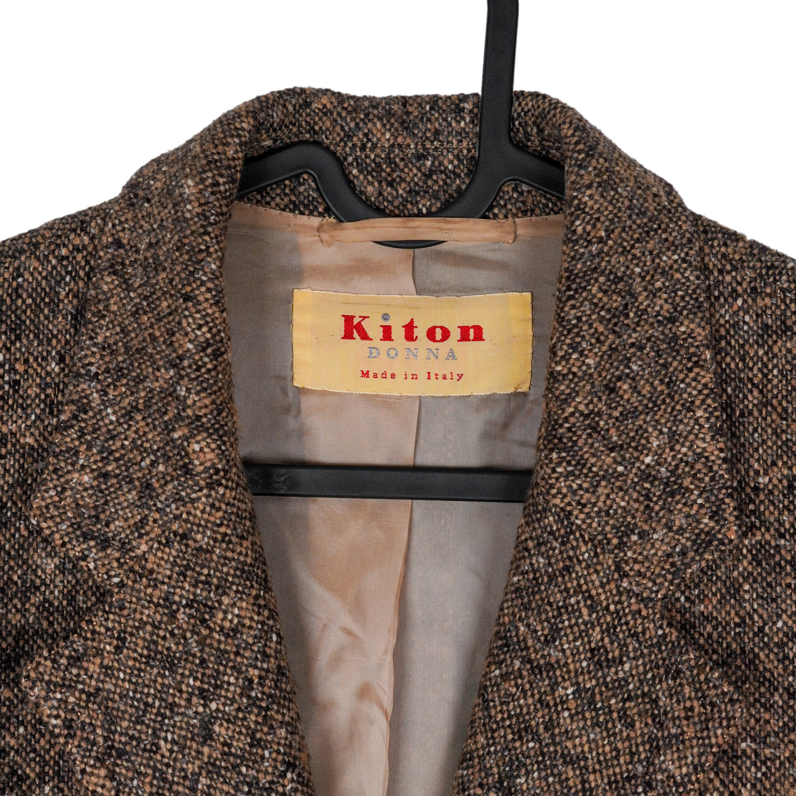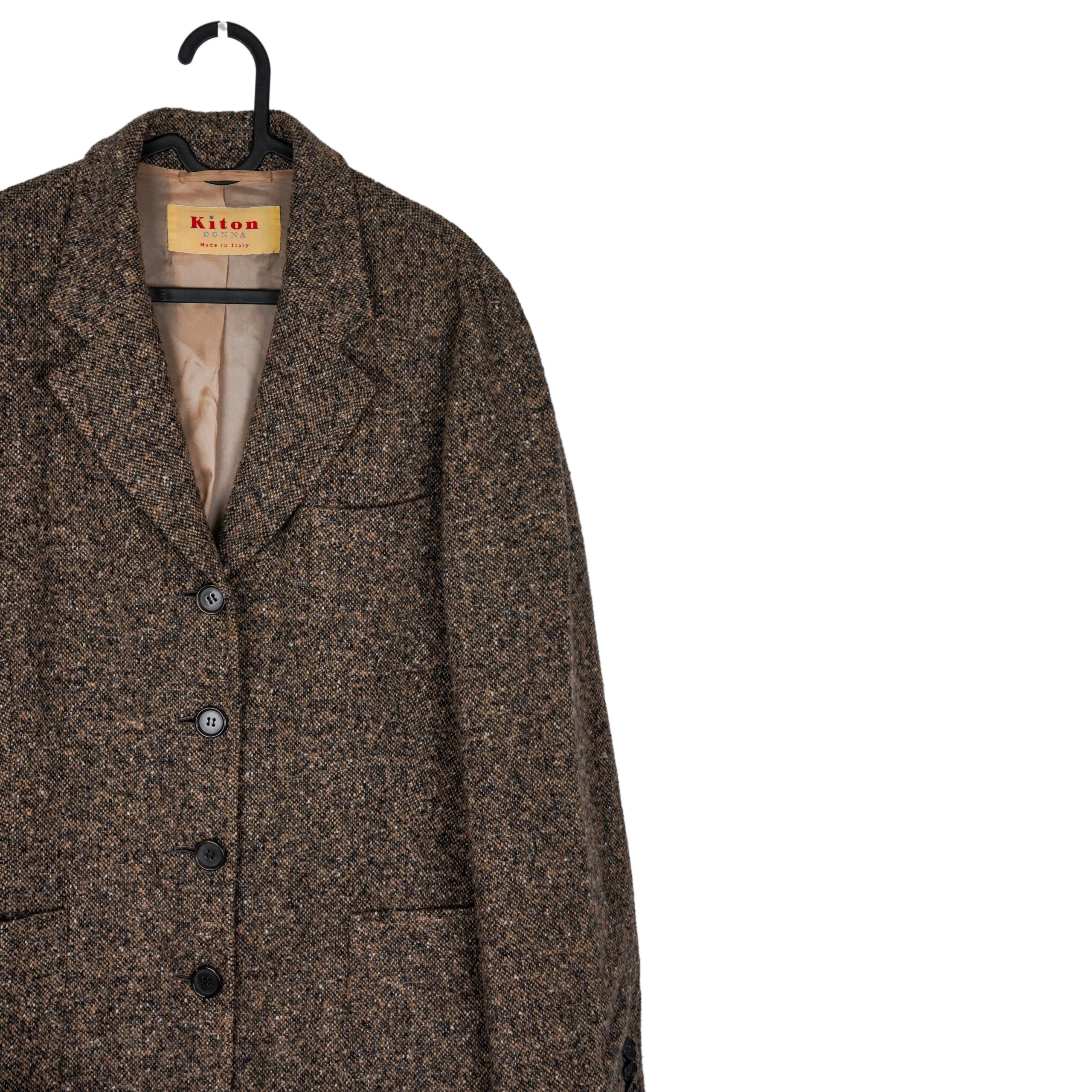 This Kiton Donna blazer is a refined example of true Italian luxury tailoring. Crafted from 100% pure cashmere, it offers an exceptionally soft hand feel and a naturally elegant drape. The rich brown tweed texture adds depth and character, making this piece timeless yet distinctive. Designed with a classic tailored silhouette, it transitions effortlessly from formal ensembles to elevated everyday looks. A perfect choice for those who appreciate craftsmanship, heritage, and understated sophistication.