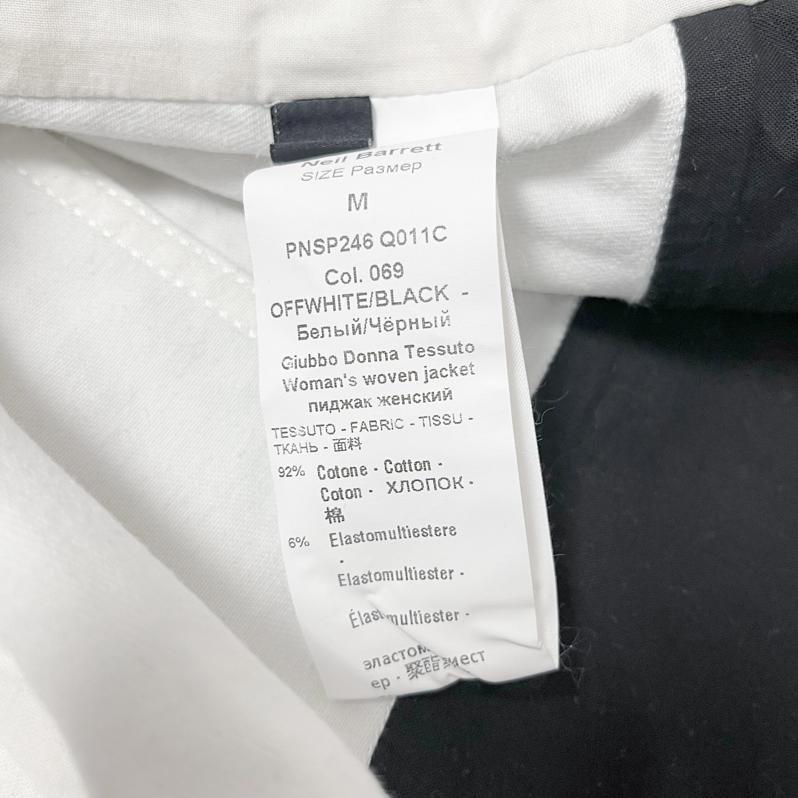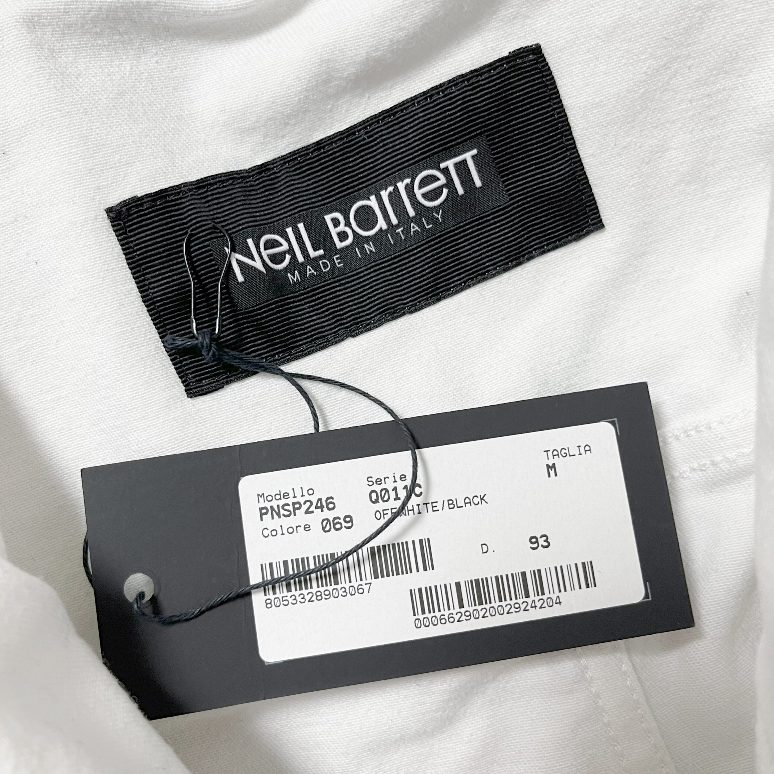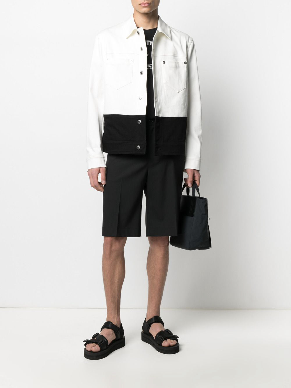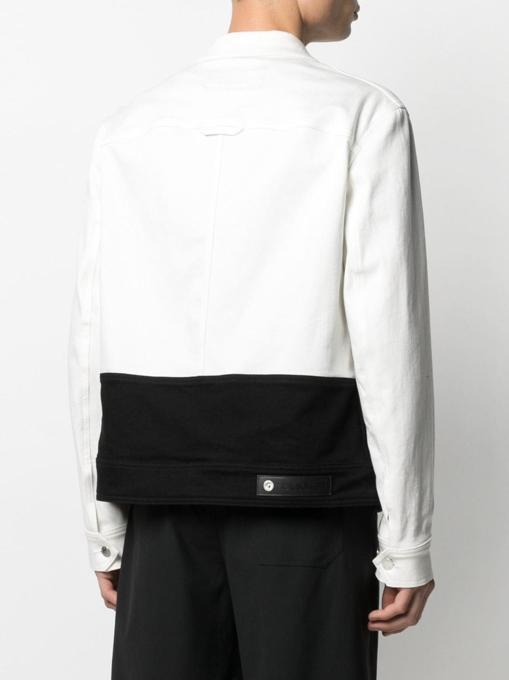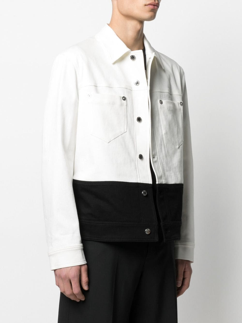 This Neil Barrett jacket showcases the brand’s signature modern minimalism with a bold contrast design. Crafted in Italy, it features a clean off-white upper and a sharp black lower panel, creating a structured, contemporary look. Metal snap buttons and chest pockets emphasize the classic trucker-jacket silhouette, while the refined tailoring and premium cotton-blend fabric ensure comfort and durability. A standout piece that elevates any casual or smart-casual wardrobe.