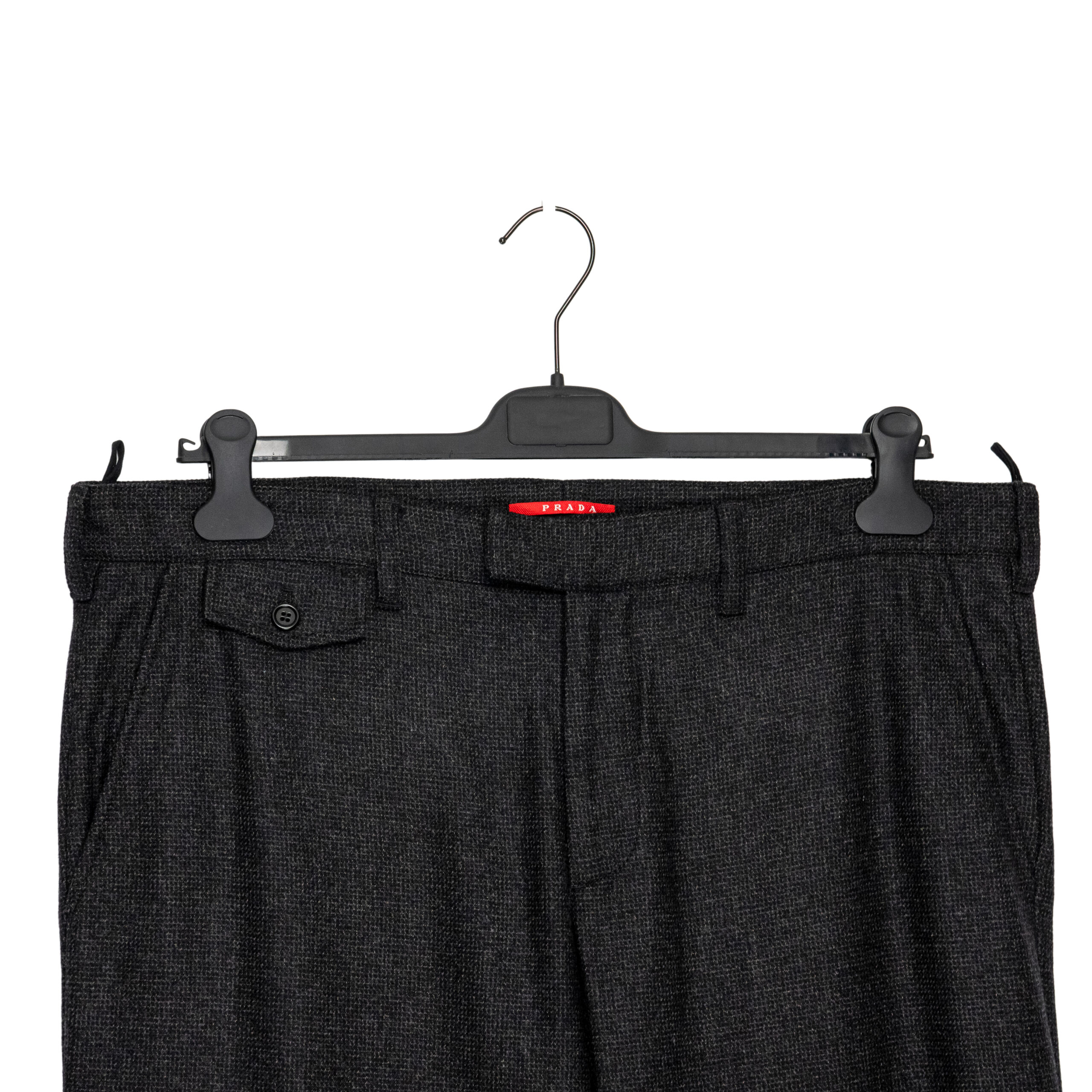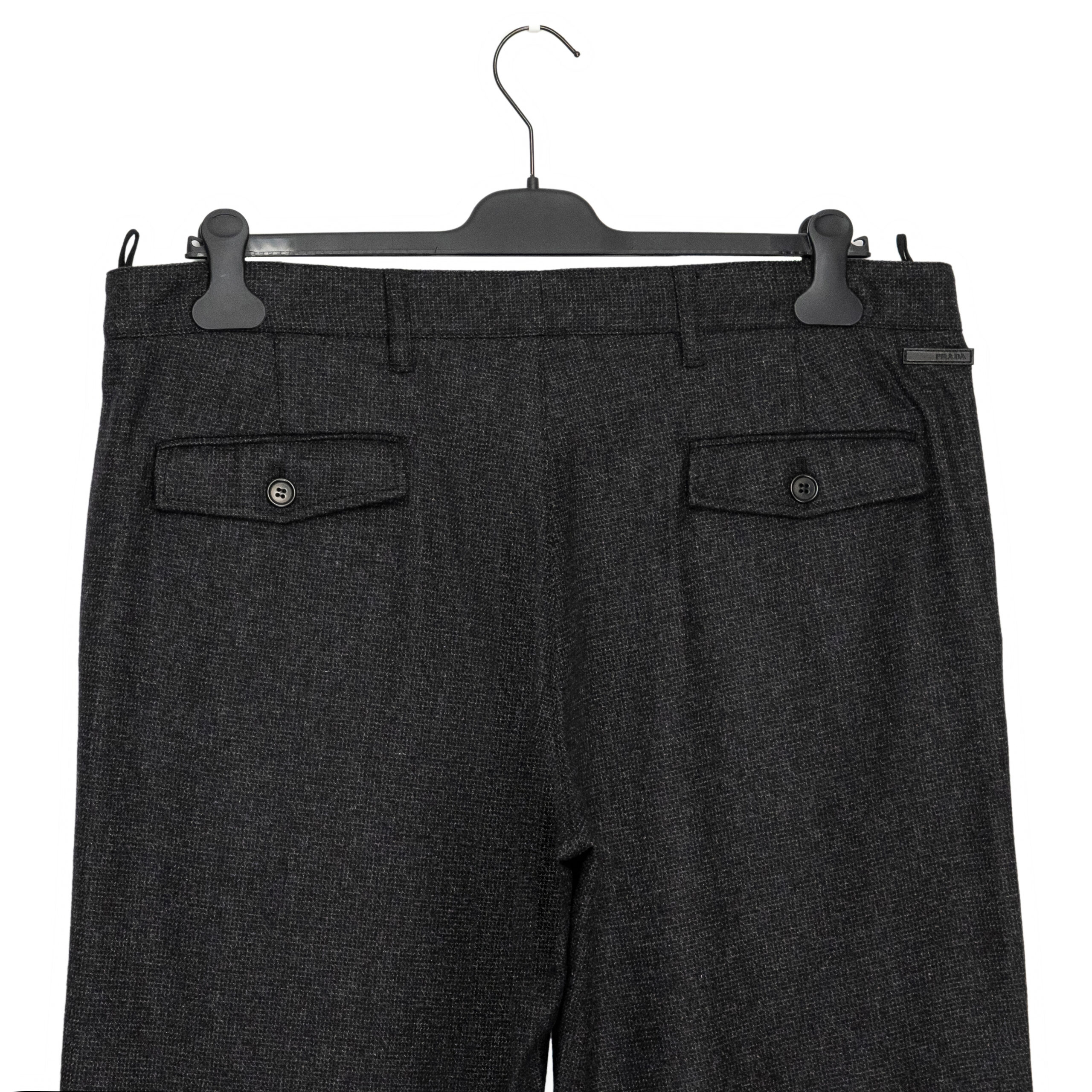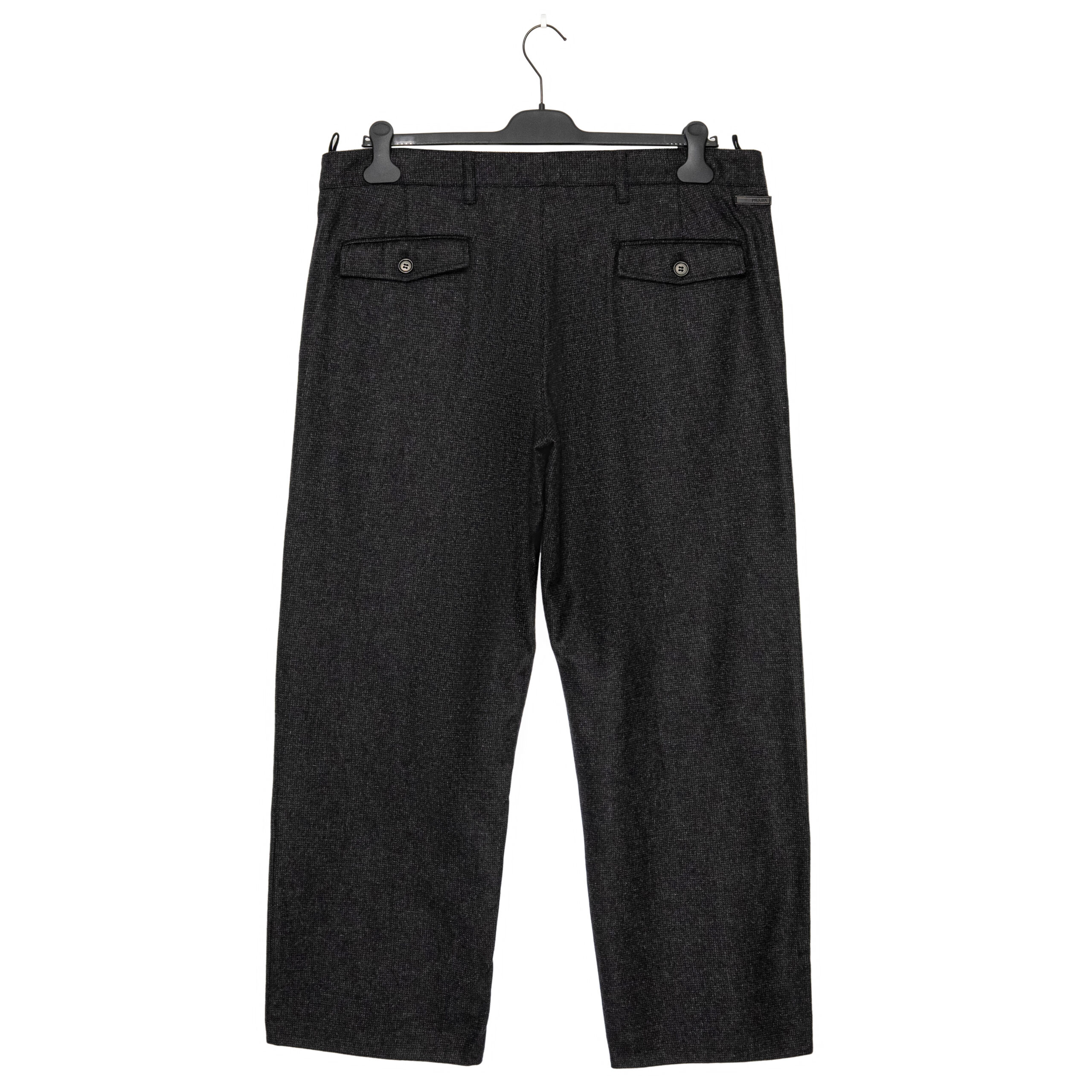 These Prada trousers reflect the brand’s refined tailoring and understated luxury. Made from a premium wool-blend fabric, they feature a clean straight-leg cut with classic back flap pockets and subtle Prada branding. A timeless wardrobe essential suitable for both formal and smart-casual looks.