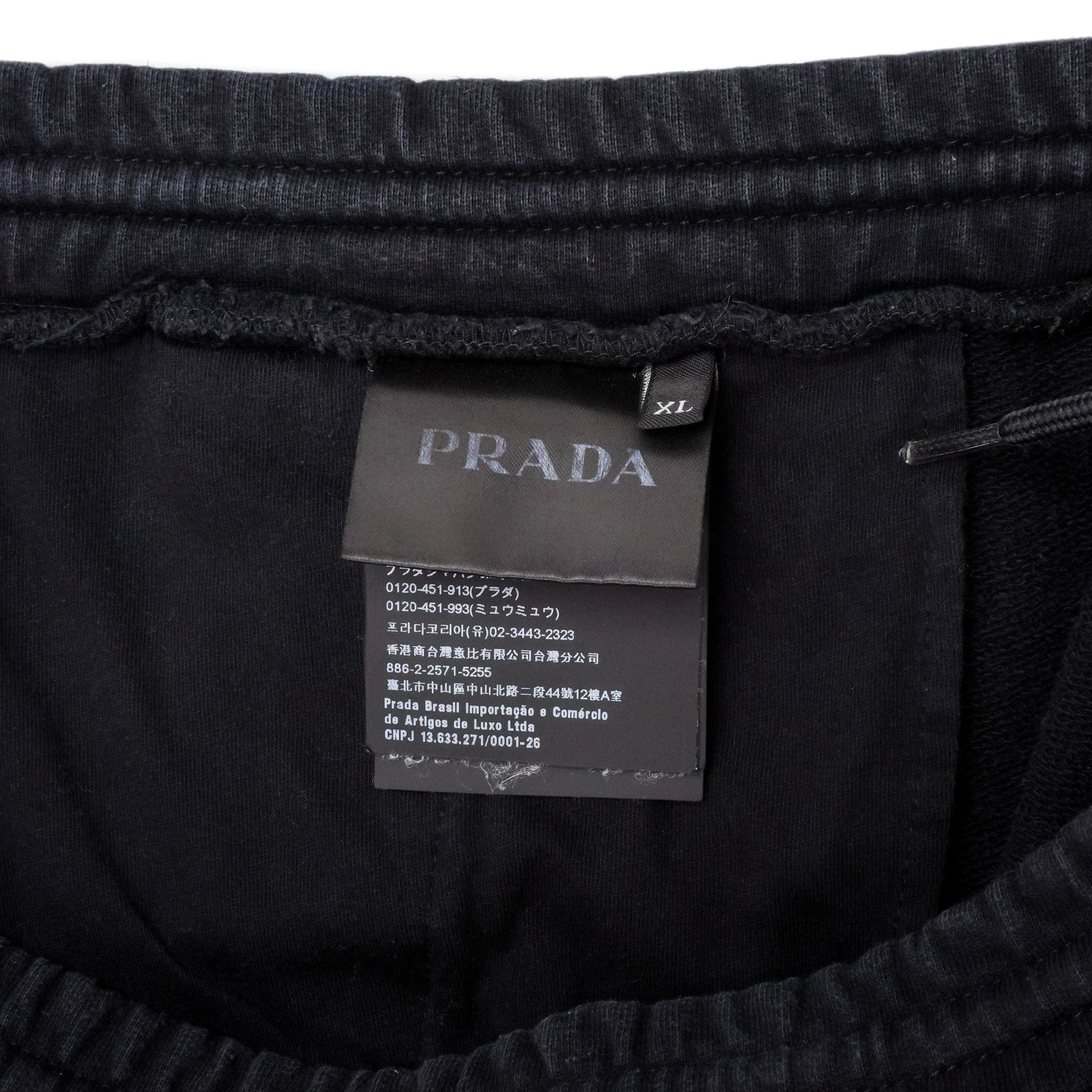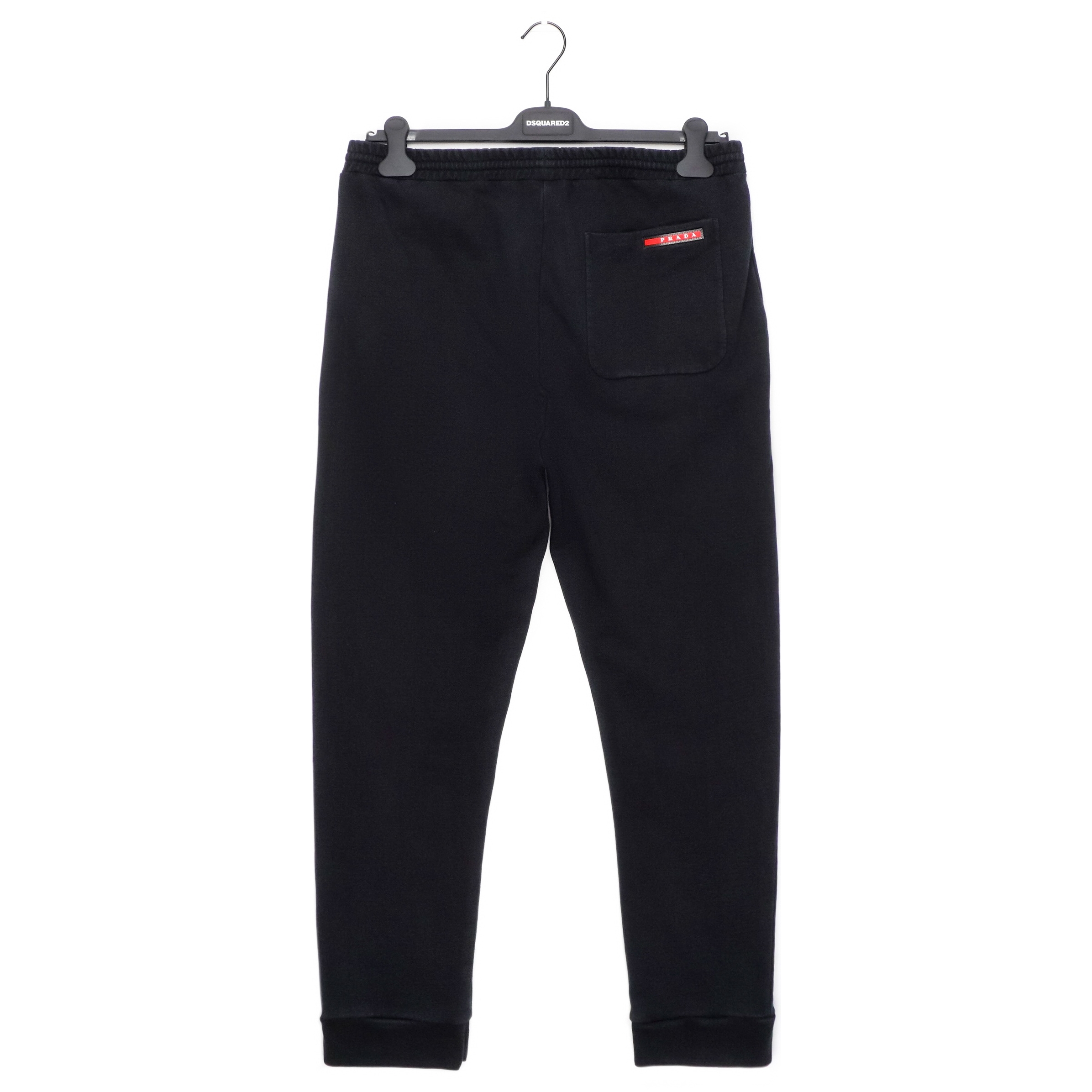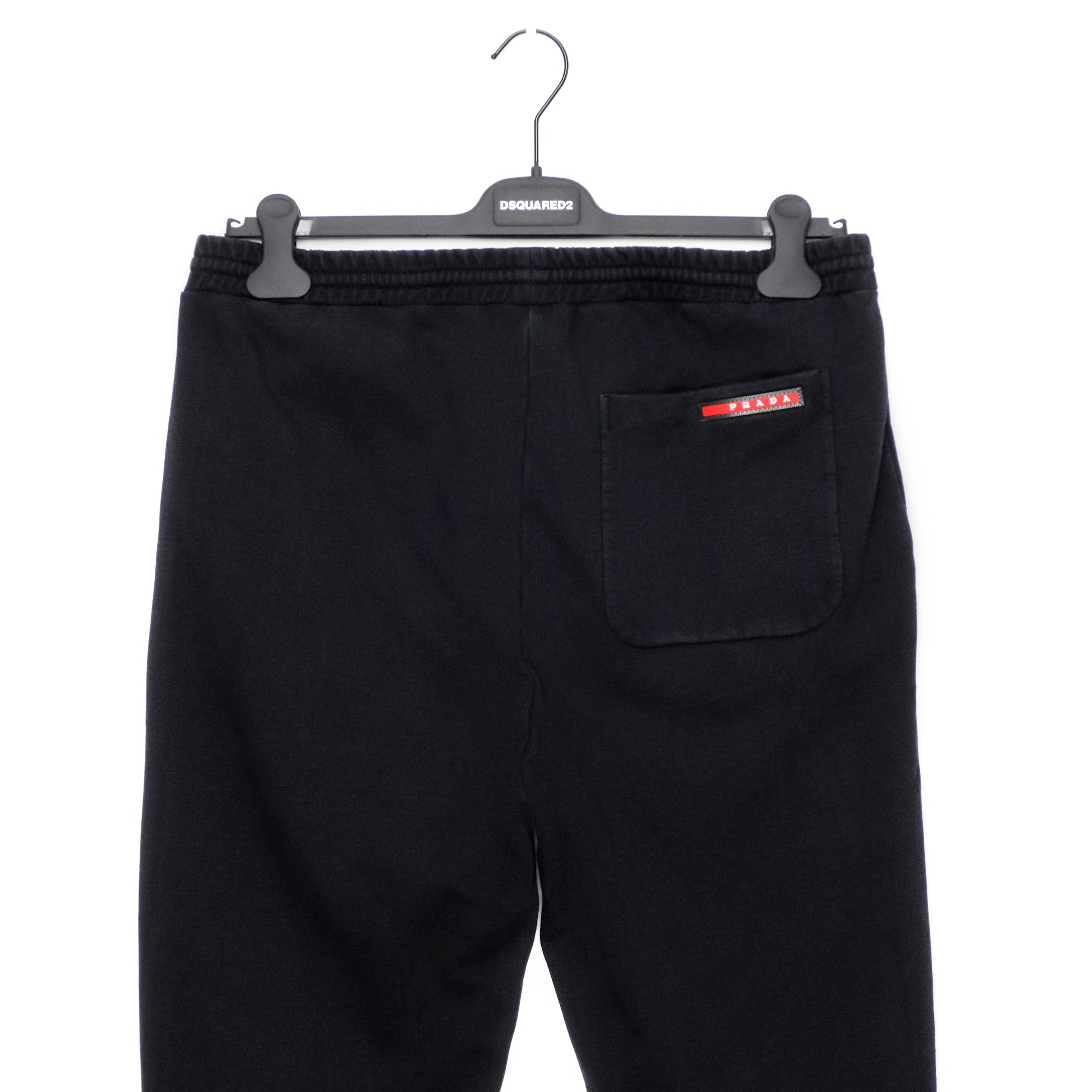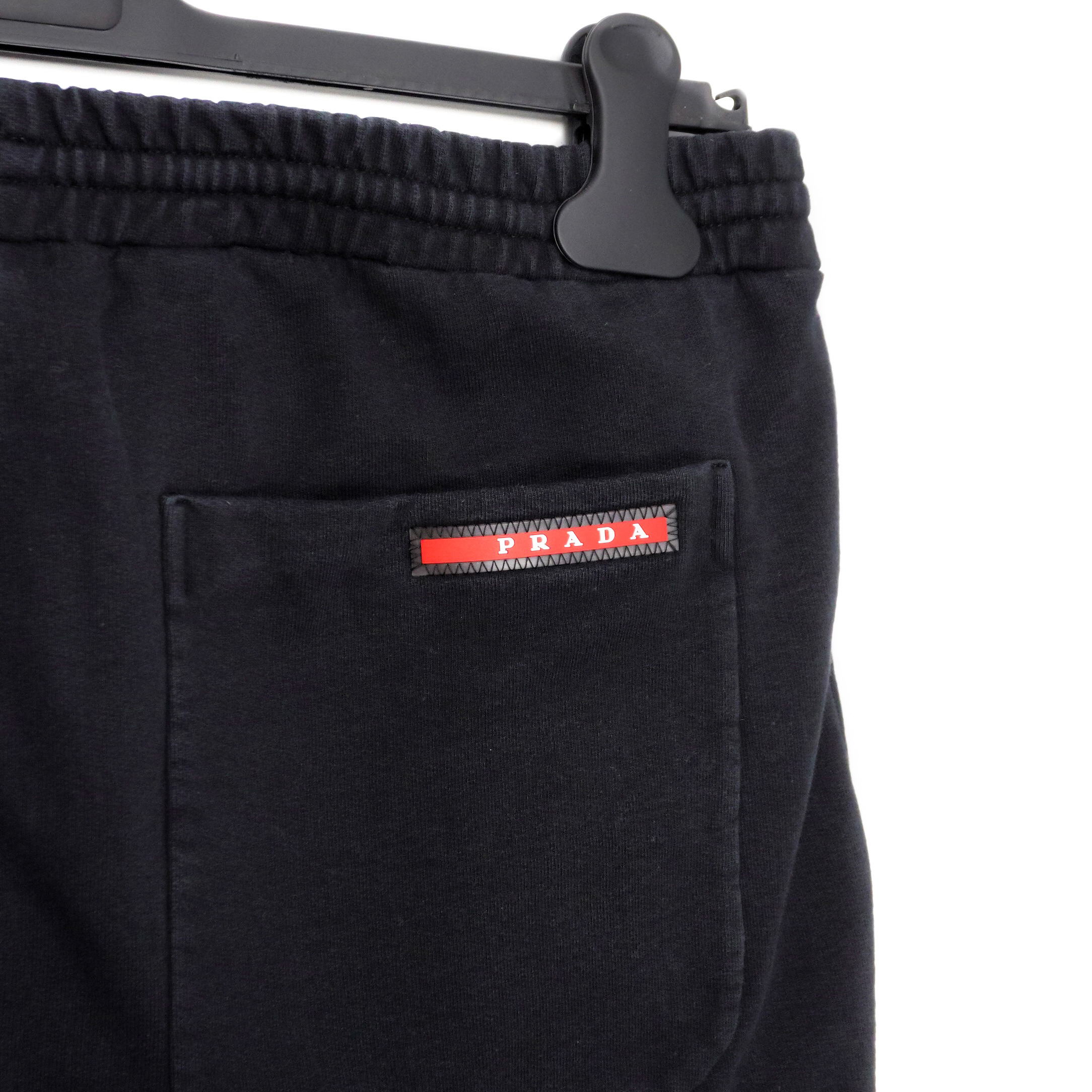 • Prada red logo tab on back pocket