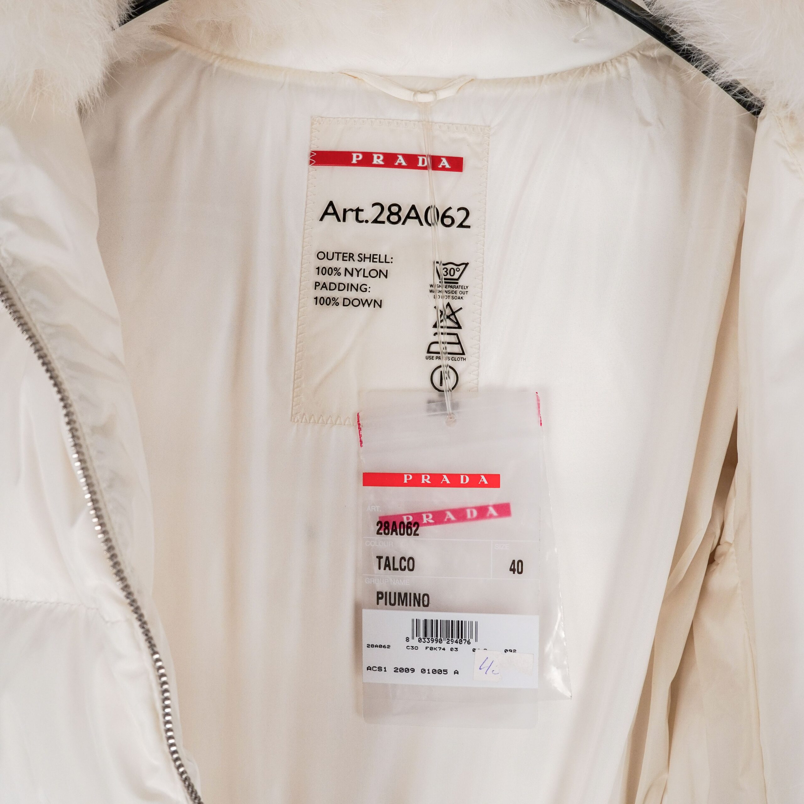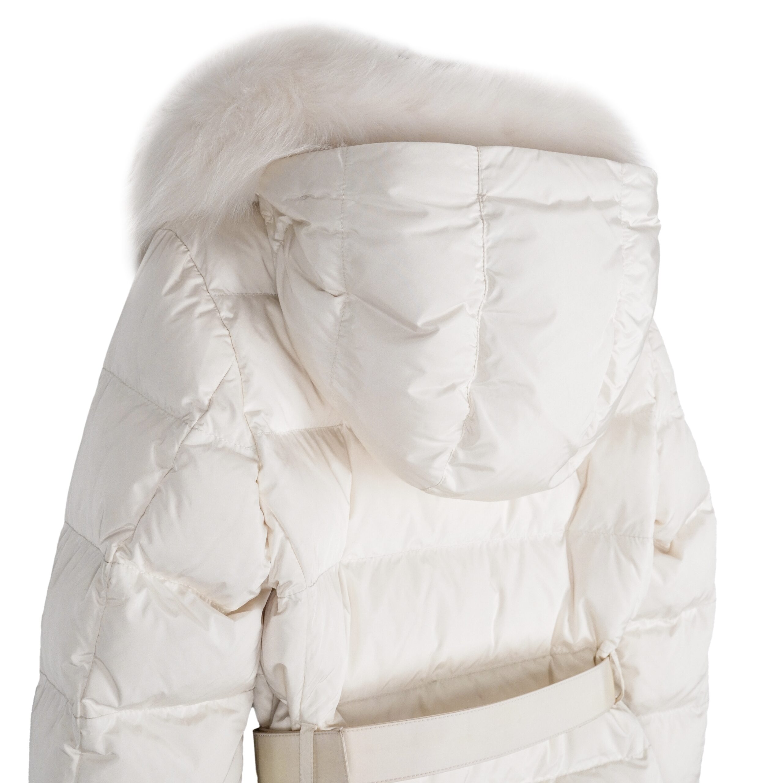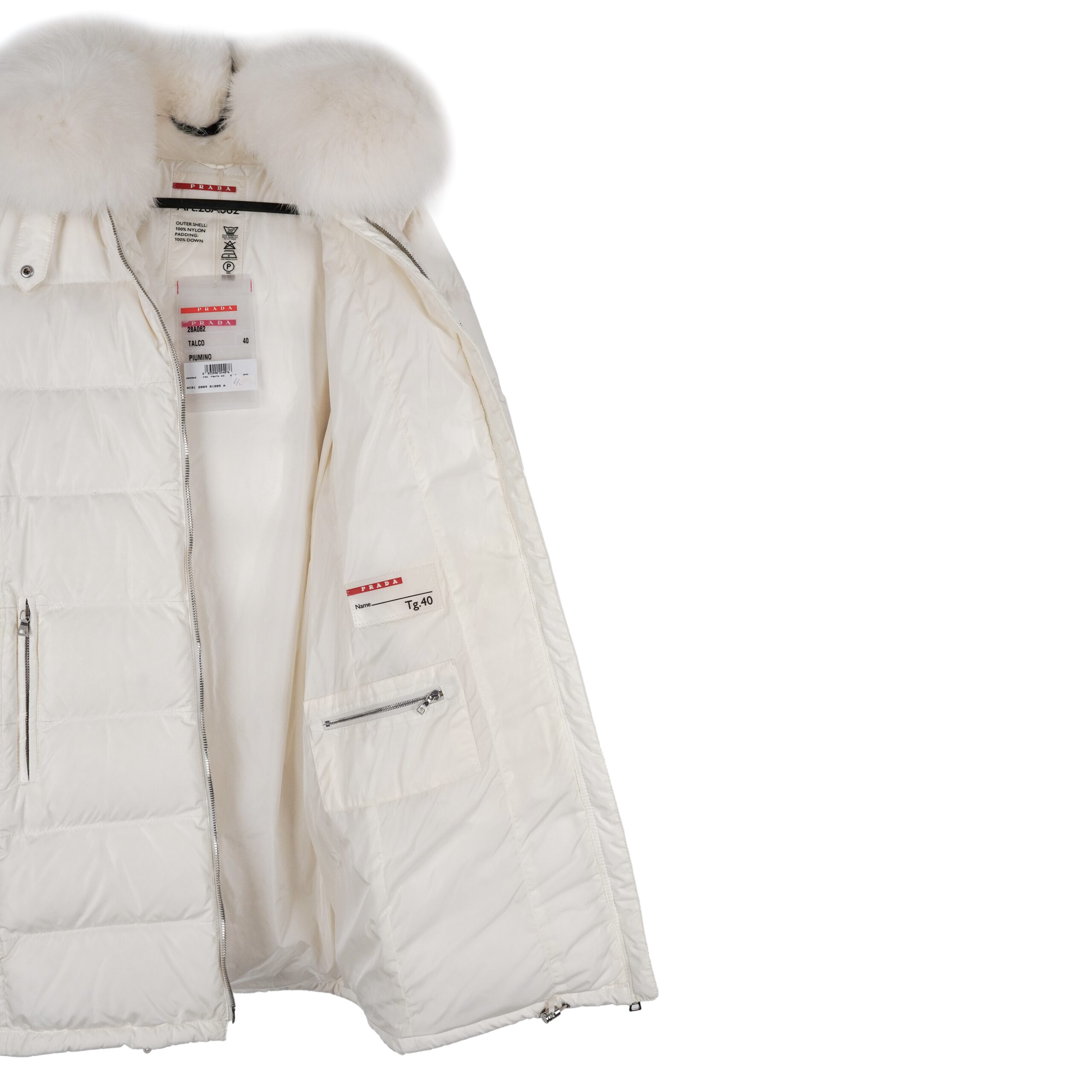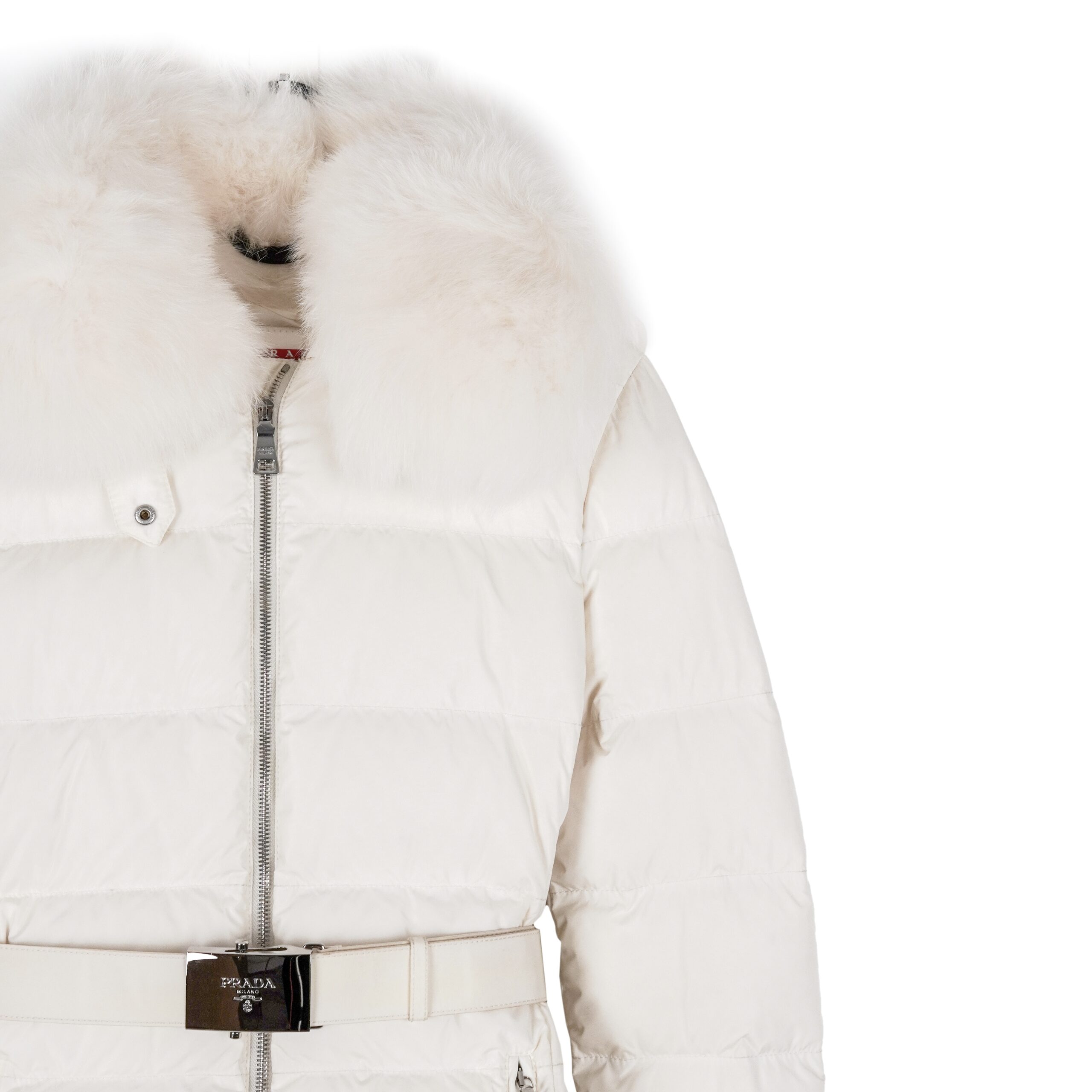 Elegant and luxurious Prada Linea Rossa down coat in the soft cream shade Talco. This belted piumino features a voluminous genuine white fox fur collar and hood, creating a refined yet statement winter silhouette. The coat is crafted from lightweight technical nylon and filled with 100% premium down for exceptional warmth without bulk. A structured waist belt with polished Prada Milano metal buckle defines the figure, while silver-tone zippers add a clean, modern contrast. The fur is dyed white fox (Alopex Lagopus), sourced from Finland, as indicated on the original label. A sophisticated and timeless winter investment piece.