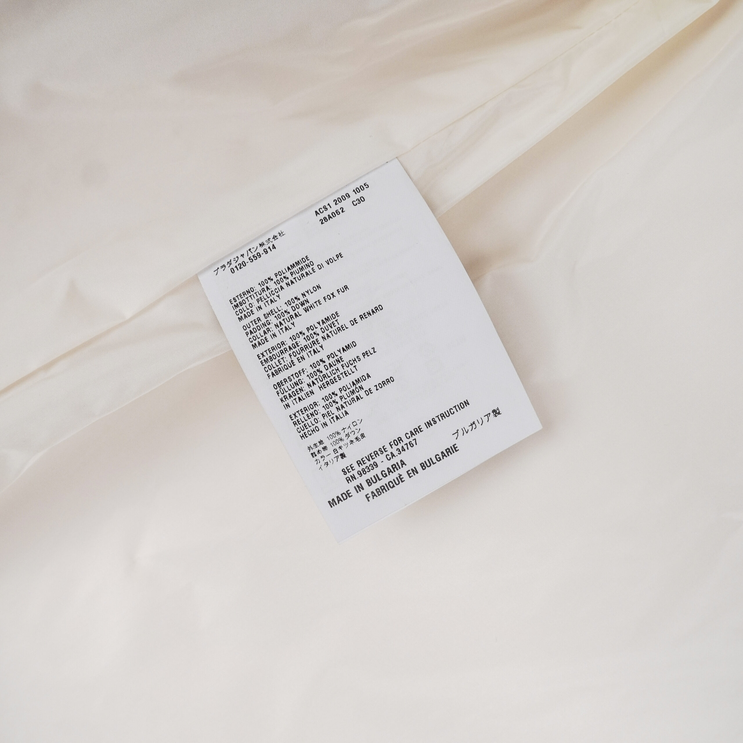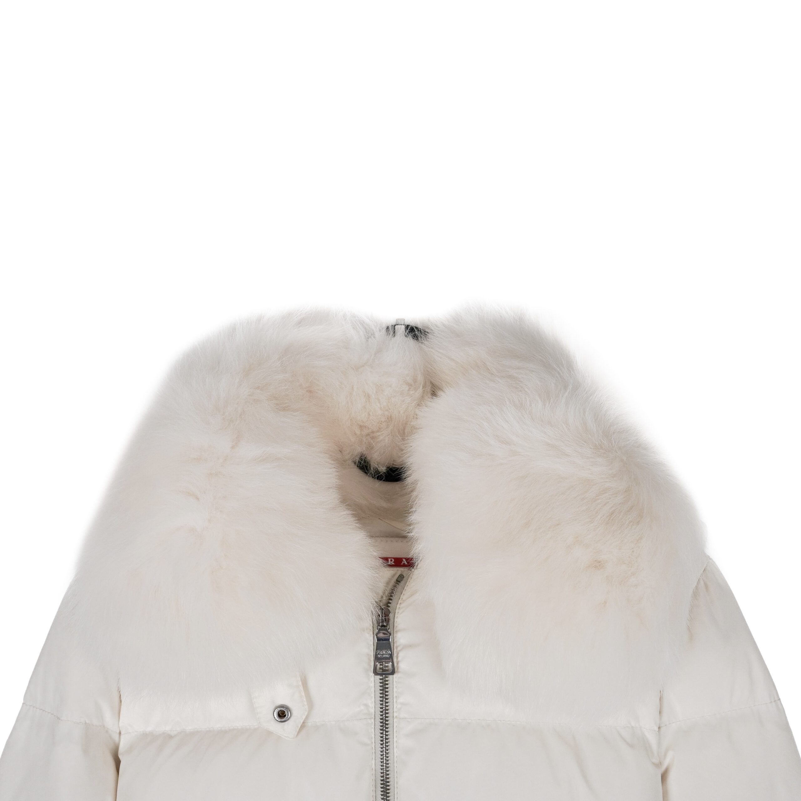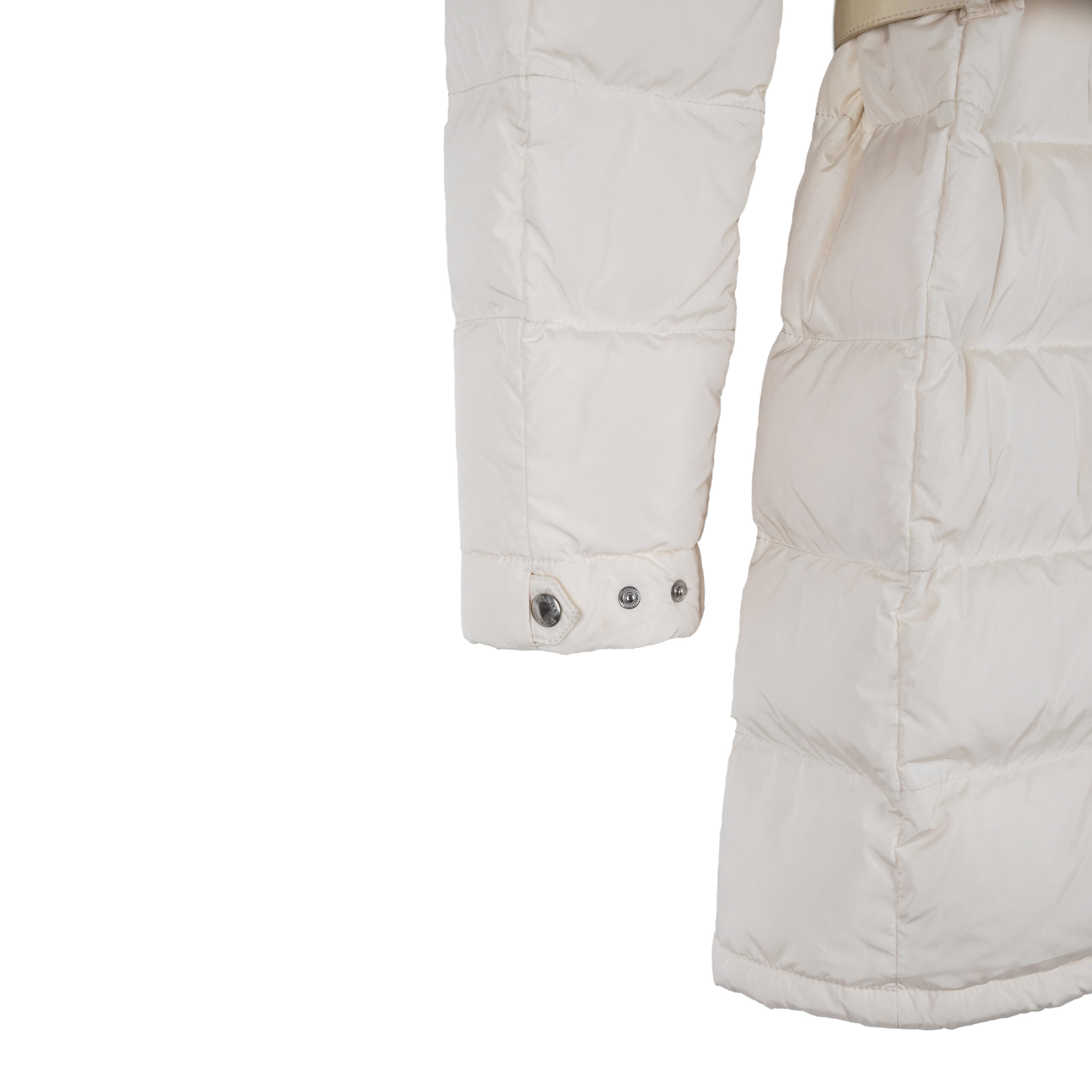 Elegant and luxurious Prada Linea Rossa down coat in the soft cream shade Talco. This belted piumino features a voluminous genuine white fox fur collar and hood, creating a refined yet statement winter silhouette. The coat is crafted from lightweight technical nylon and filled with 100% premium down for exceptional warmth without bulk. A structured waist belt with polished Prada Milano metal buckle defines the figure, while silver-tone zippers add a clean, modern contrast. The fur is dyed white fox (Alopex Lagopus), sourced from Finland, as indicated on the original label. A sophisticated and timeless winter investment piece.