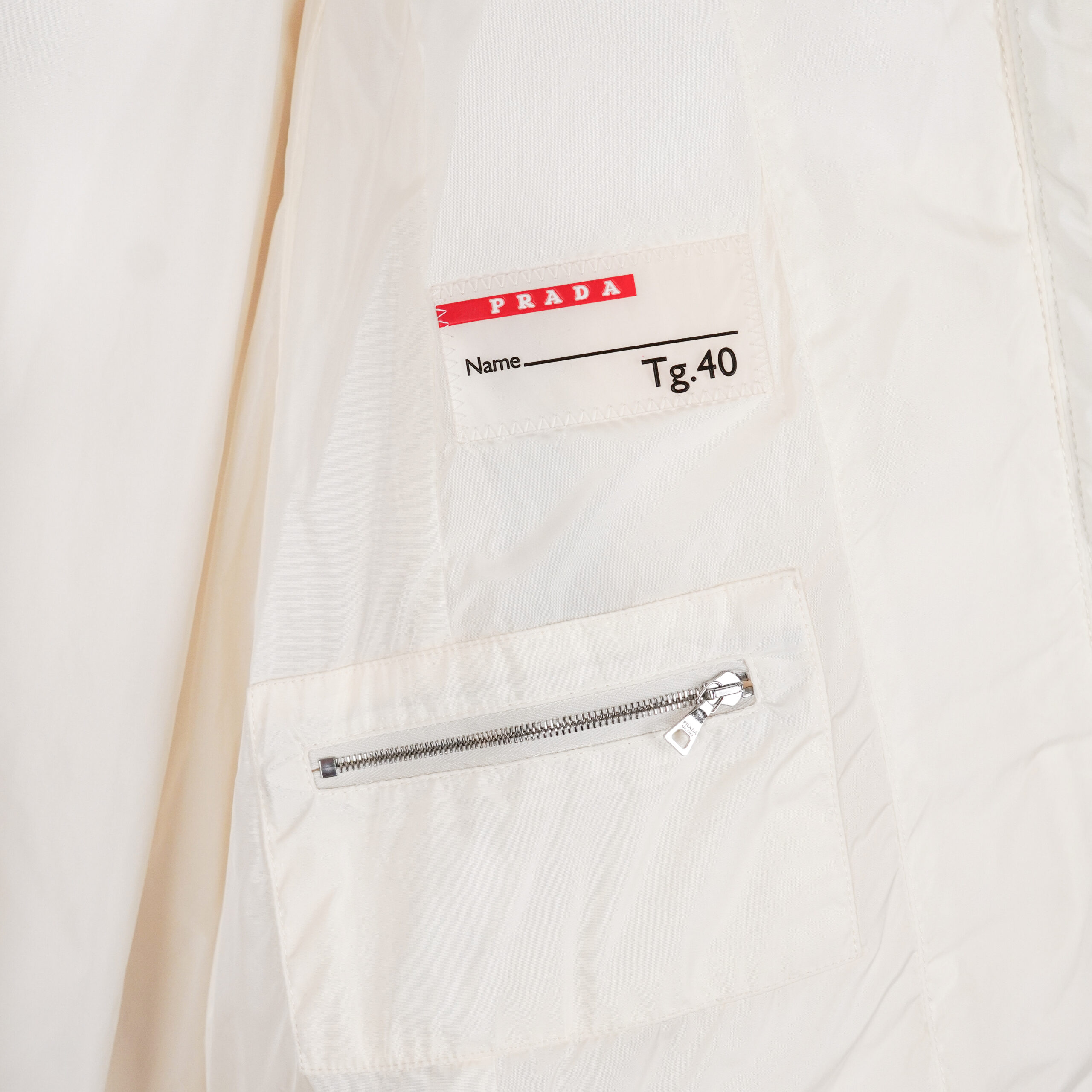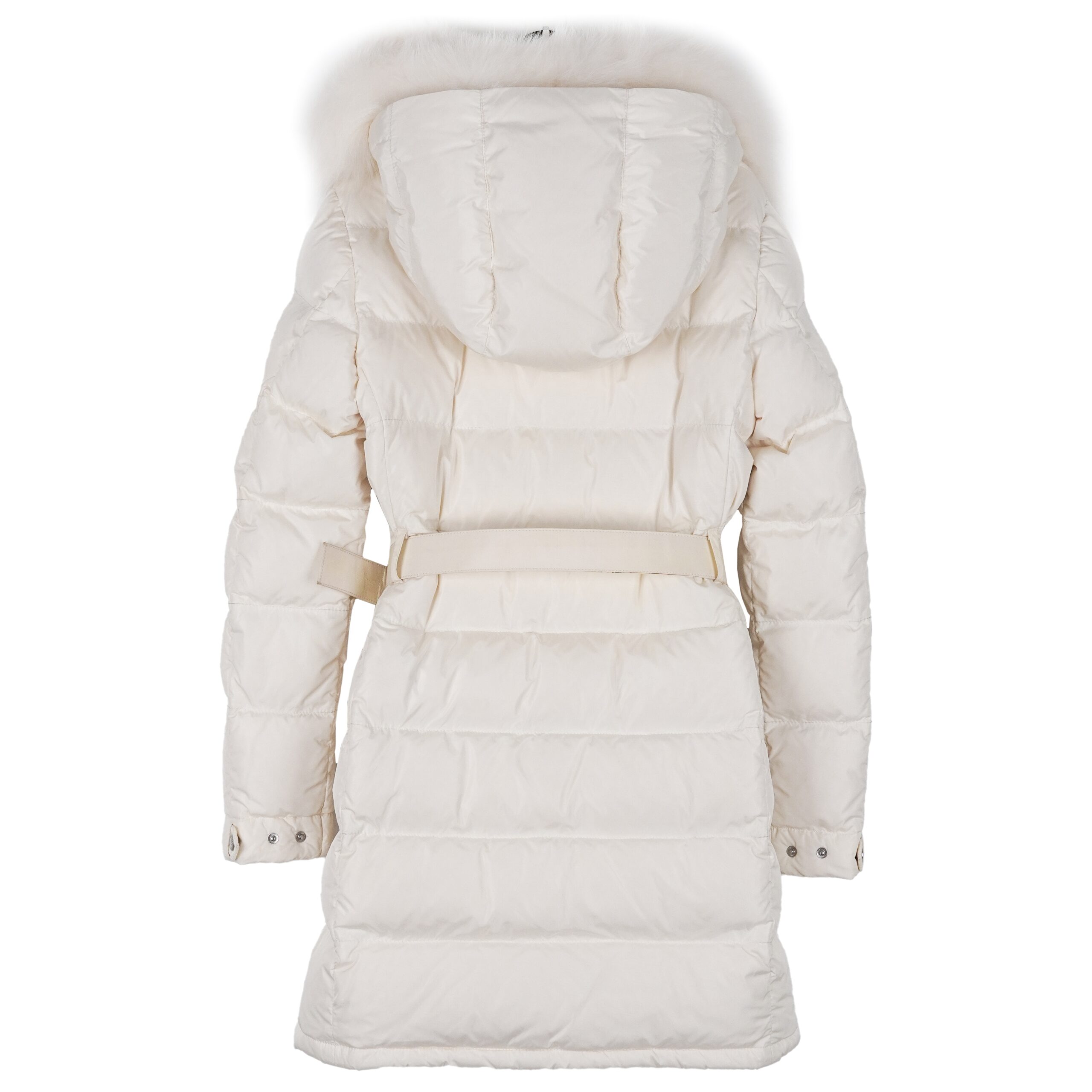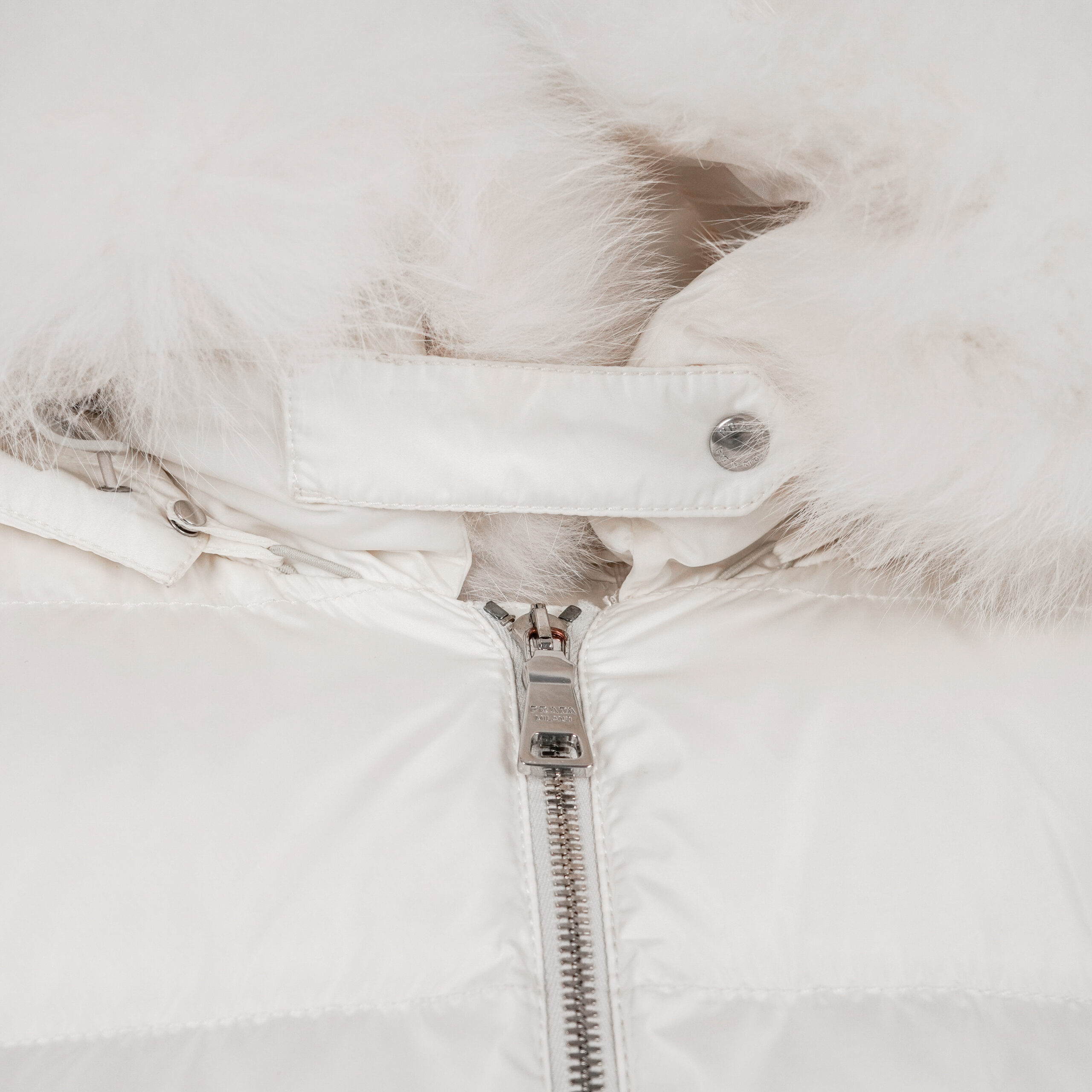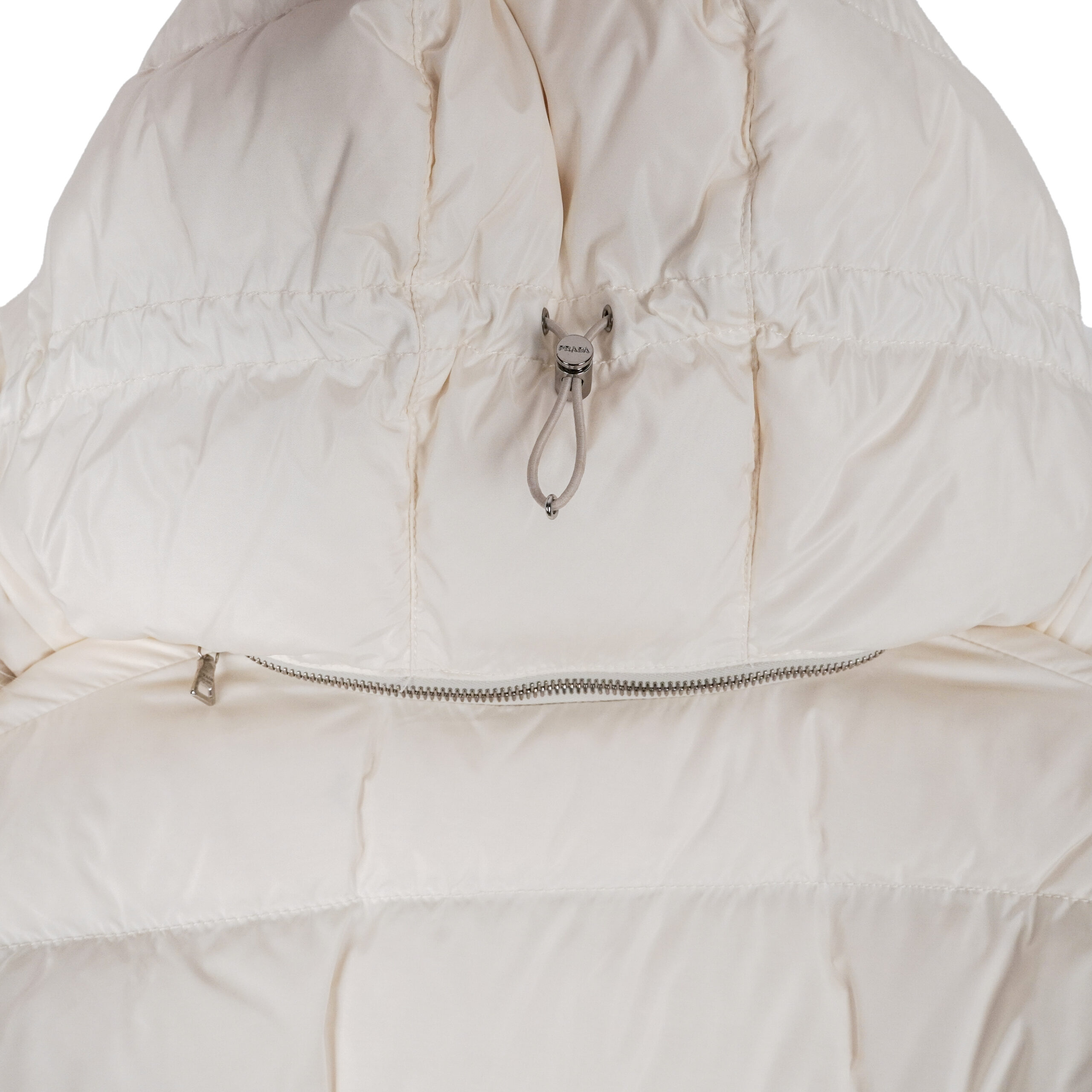 Elegant and luxurious Prada Linea Rossa down coat in the soft cream shade Talco. This belted piumino features a voluminous genuine white fox fur collar and hood, creating a refined yet statement winter silhouette. The coat is crafted from lightweight technical nylon and filled with 100% premium down for exceptional warmth without bulk. A structured waist belt with polished Prada Milano metal buckle defines the figure, while silver-tone zippers add a clean, modern contrast. The fur is dyed white fox (Alopex Lagopus), sourced from Finland, as indicated on the original label. A sophisticated and timeless winter investment piece.