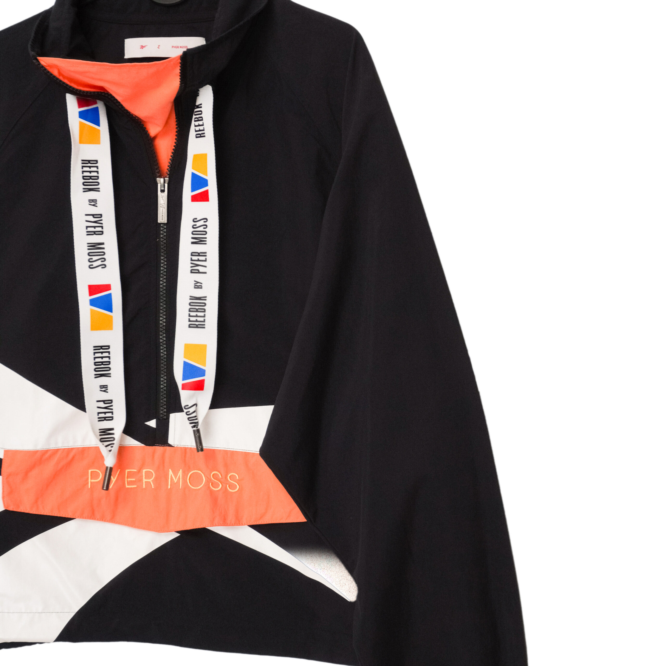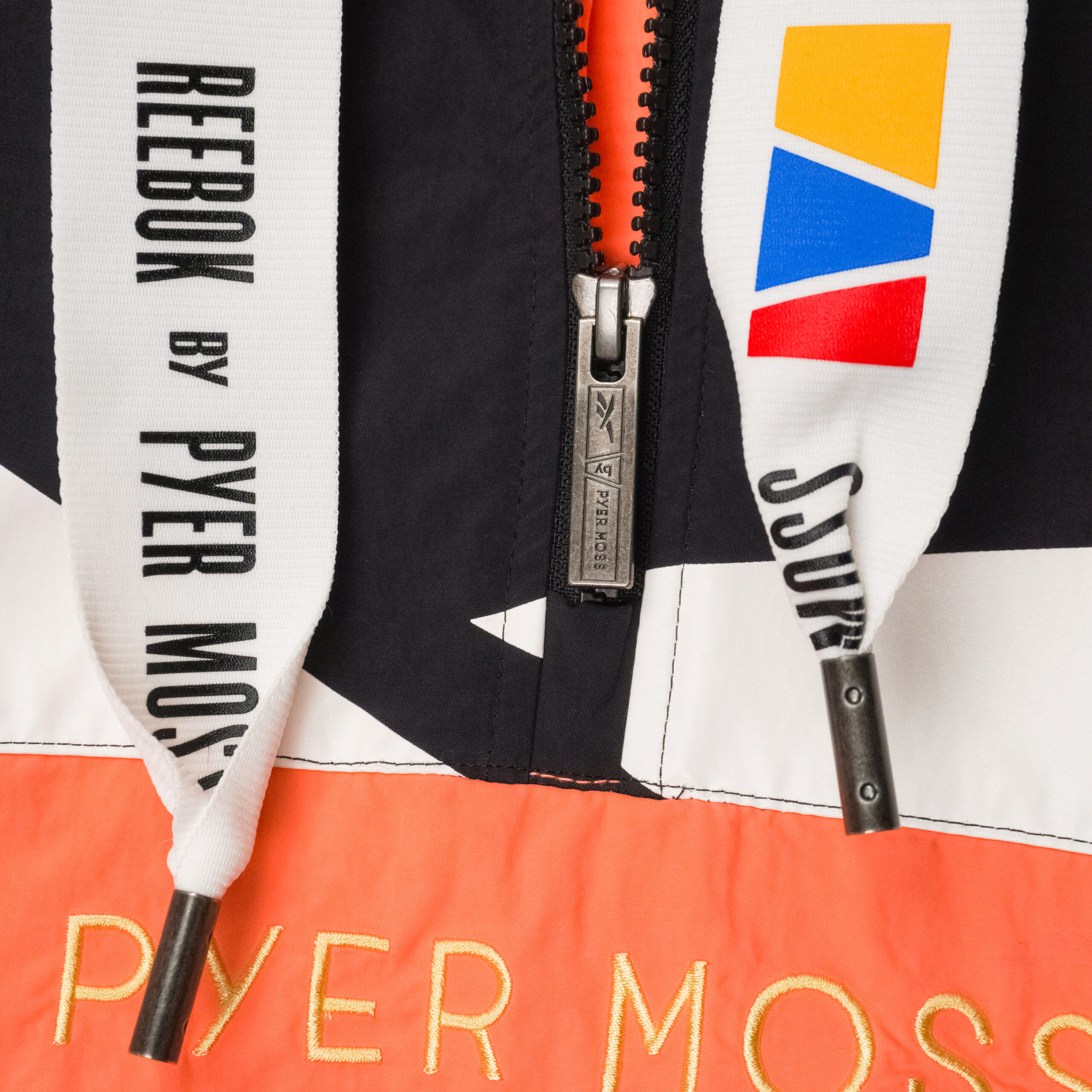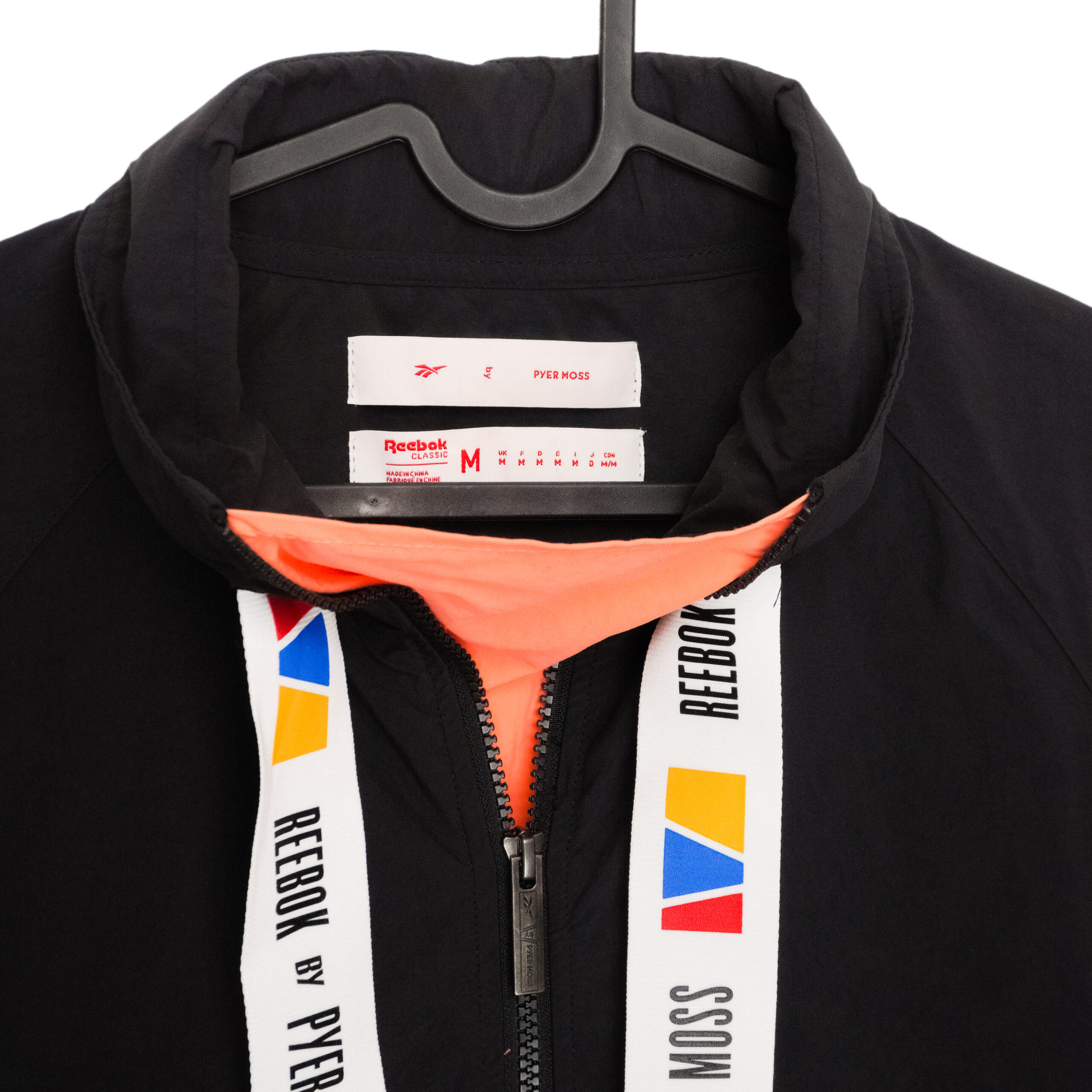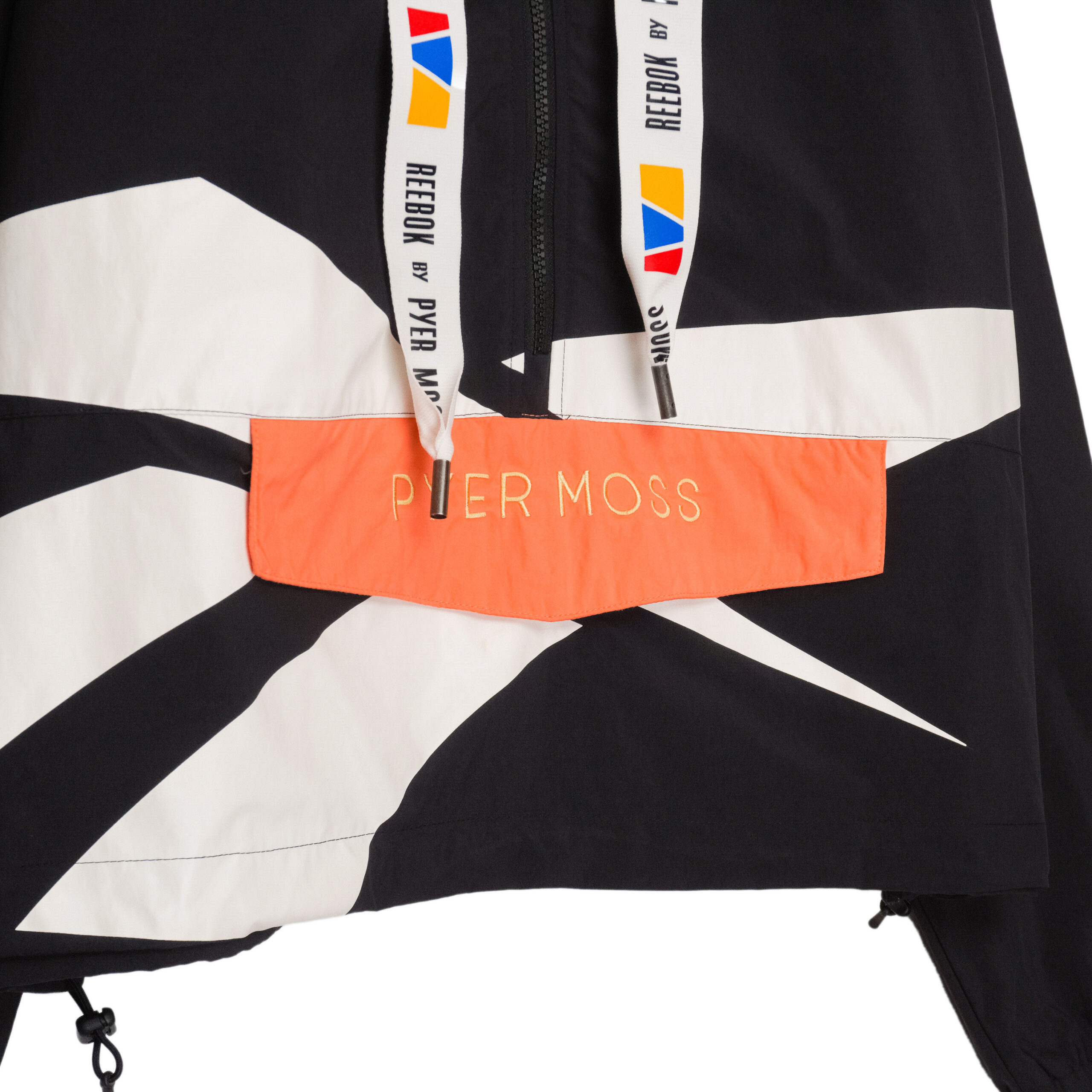 This Reebok by Pyer Moss jacket is a standout piece of modern streetwear design. Combining Reebok’s athletic heritage with Pyer Moss’s bold artistic direction, it features striking color-blocking, oversized branded drawstrings, and a sculptural silhouette. The half-zip pullover construction adds a sporty edge, while the unique graphic elements and vibrant orange accent make it a statement garment. Perfect for those who appreciate contemporary fashion infused with cultural storytelling.