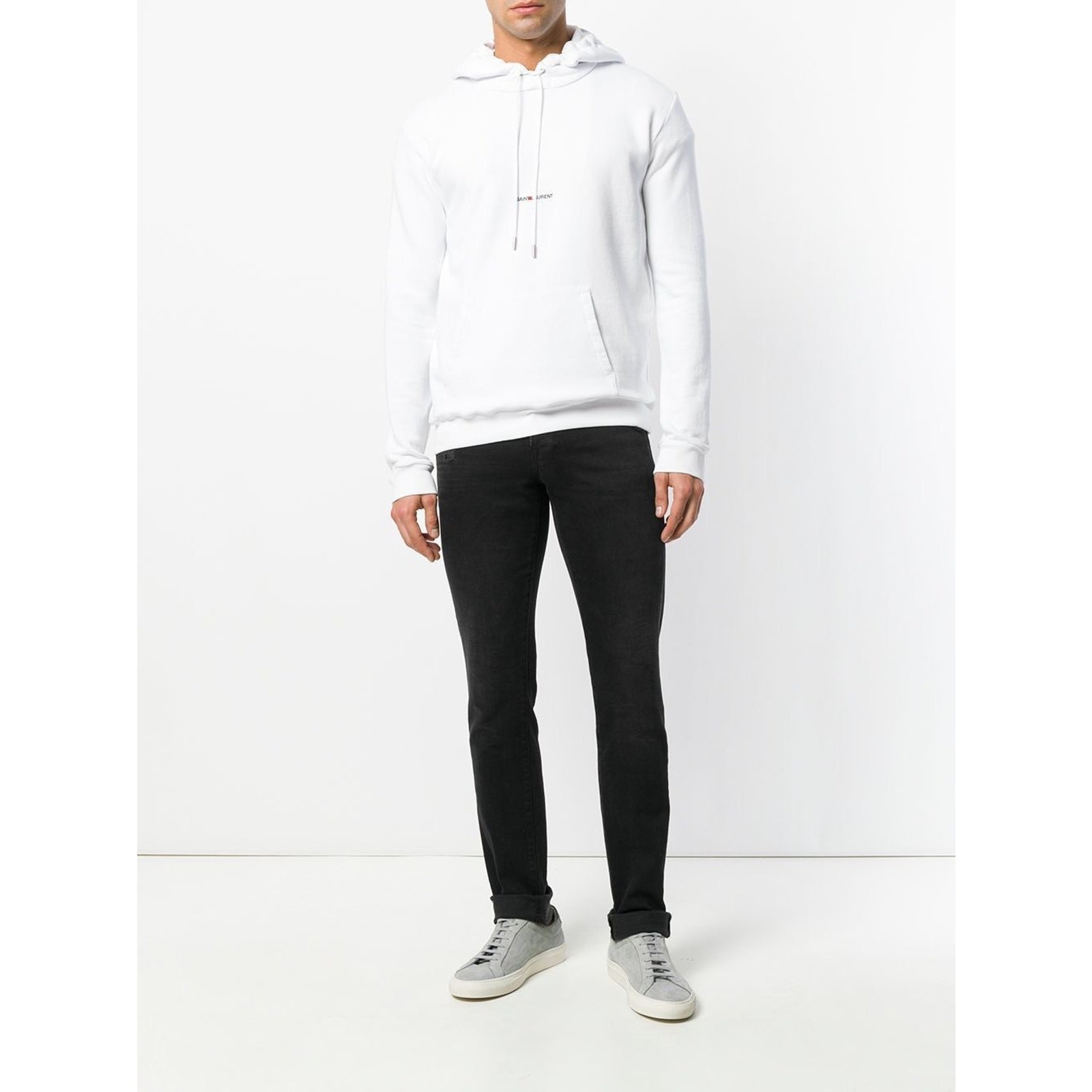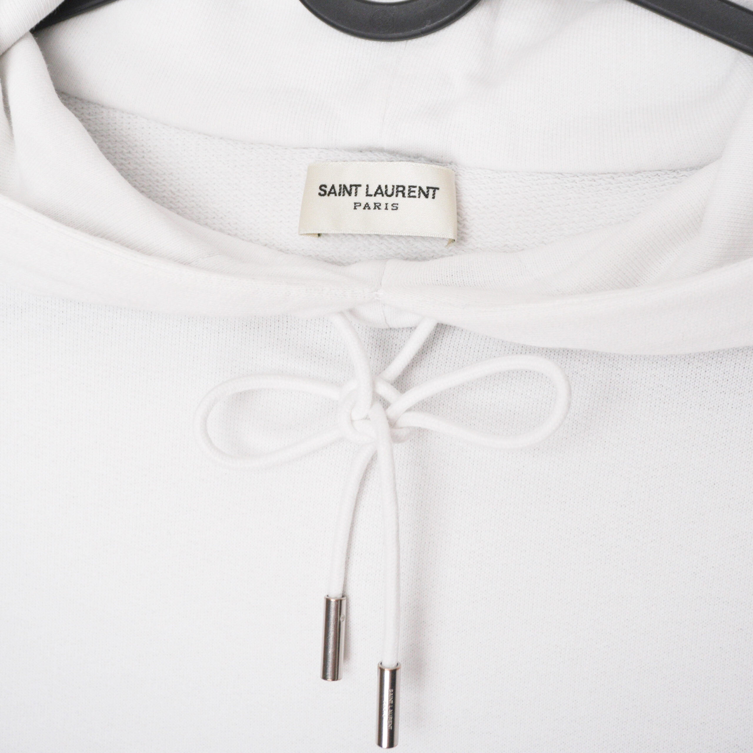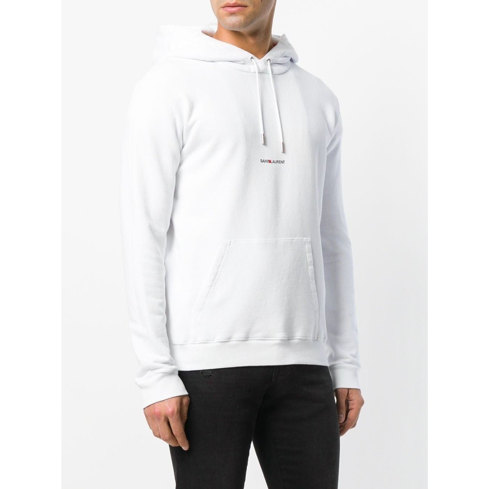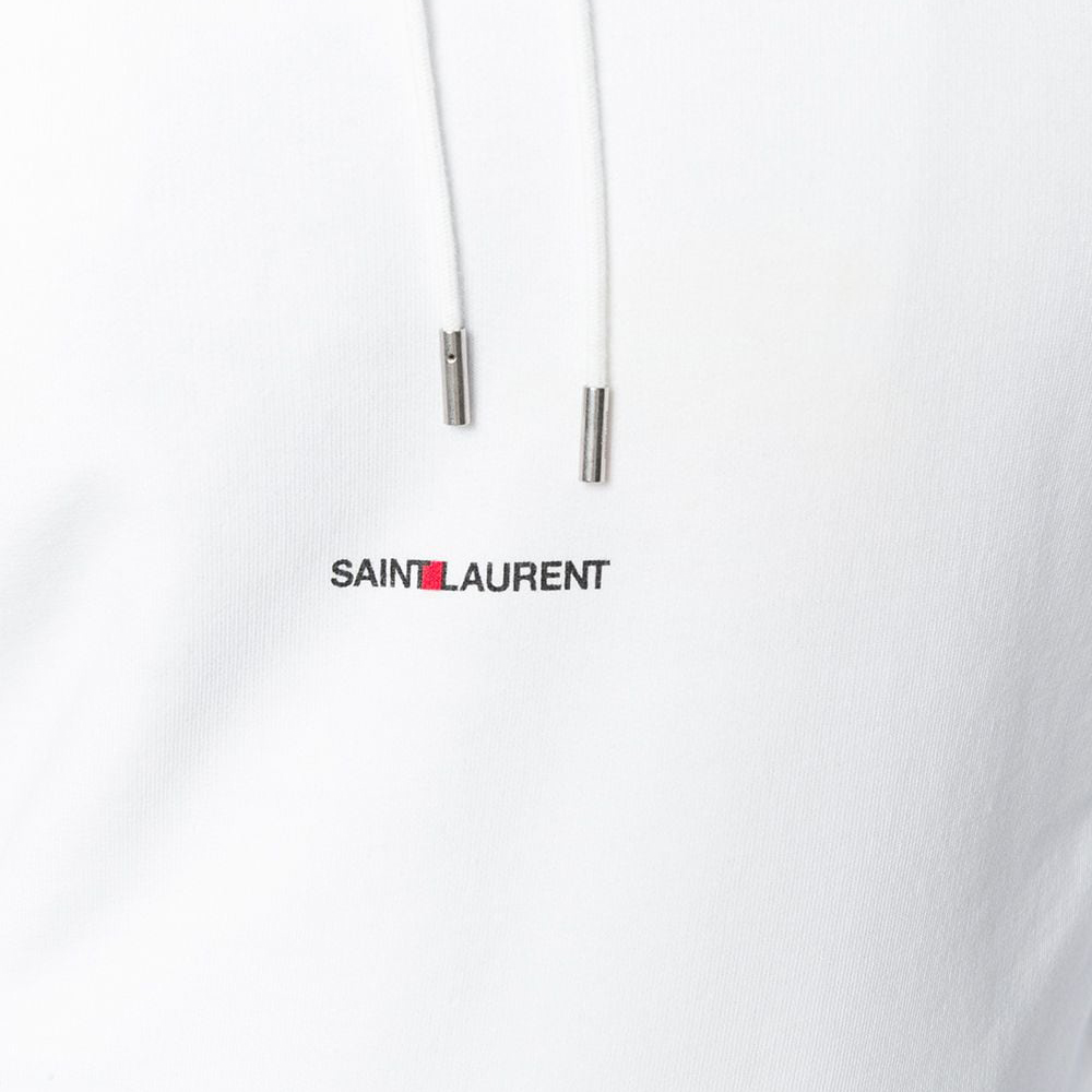 This Saint Laurent hoodie is a refined take on a modern essential. Crafted from premium cotton jersey, it features a clean white finish accented by a subtle Saint Laurent logo at the chest. The classic pullover silhouette with an adjustable drawstring hood and kangaroo pocket delivers effortless everyday wear while maintaining the brand’s signature minimalist luxury. A versatile piece that pairs seamlessly with casual and elevated looks alike.