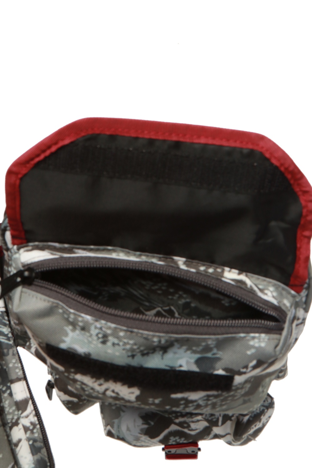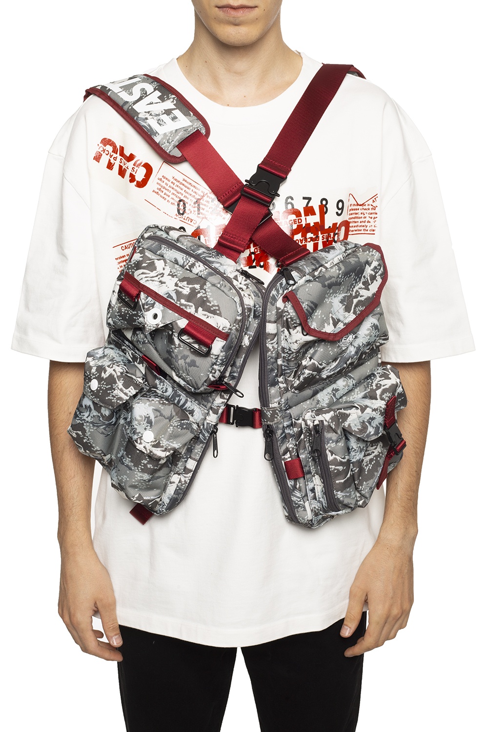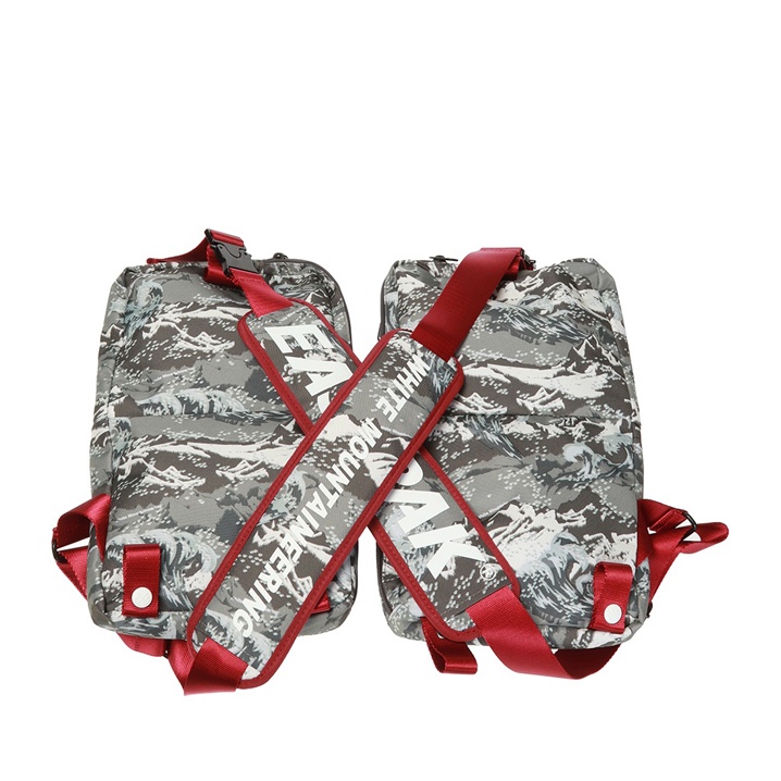 This Eastpak x White Mountaineering chest rig is a functional statement piece that blends technical design with modern streetwear aesthetics. Made from durable fabric, it features a multi-pocket construction and an adjustable harness system, allowing it to be worn comfortably over the chest or shoulders. The grey camouflage pattern with contrasting red details adds a bold yet practical look, ideal for everyday wear or travel.