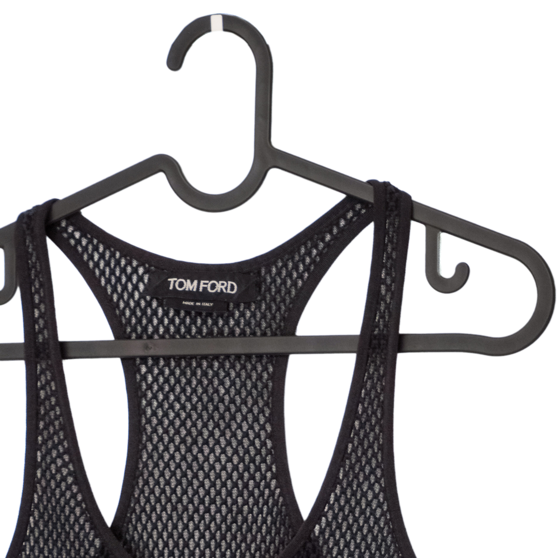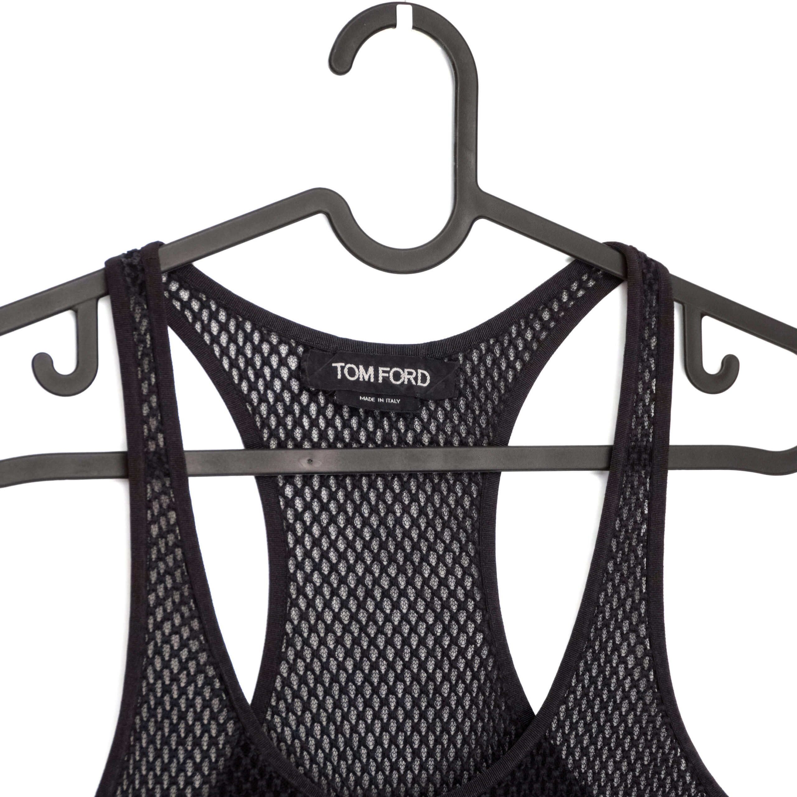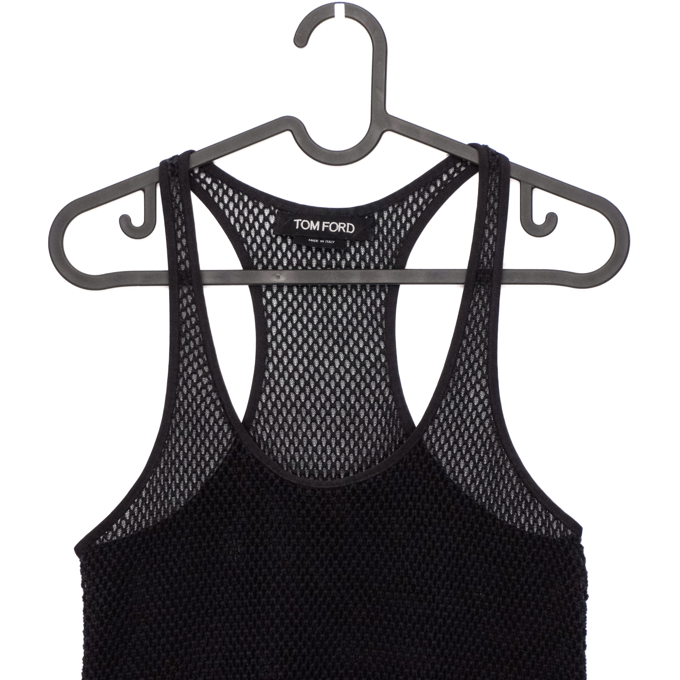 This Tom Ford mesh tank top is a striking example of modern luxury with an athletic, high-fashion twist. Crafted in Italy, it features a fully open-knit mesh construction that creates a bold, breathable silhouette. The racerback design enhances its sporty attitude, while the soft cotton exterior and silky stretch lining ensure a comfortable fit. A rare and distinctive piece that perfectly embodies Tom Ford’s signature mix of sensuality and refinement.