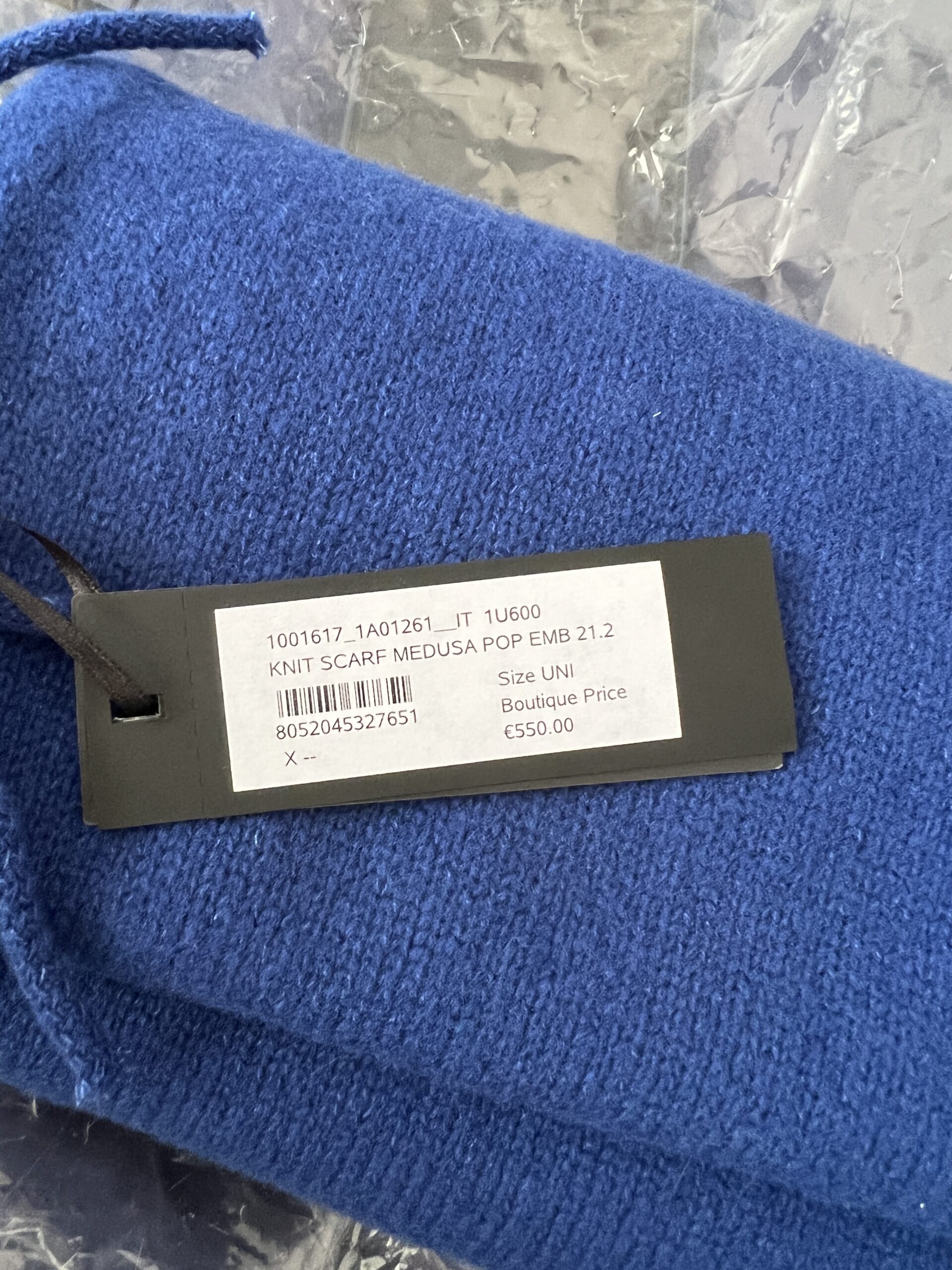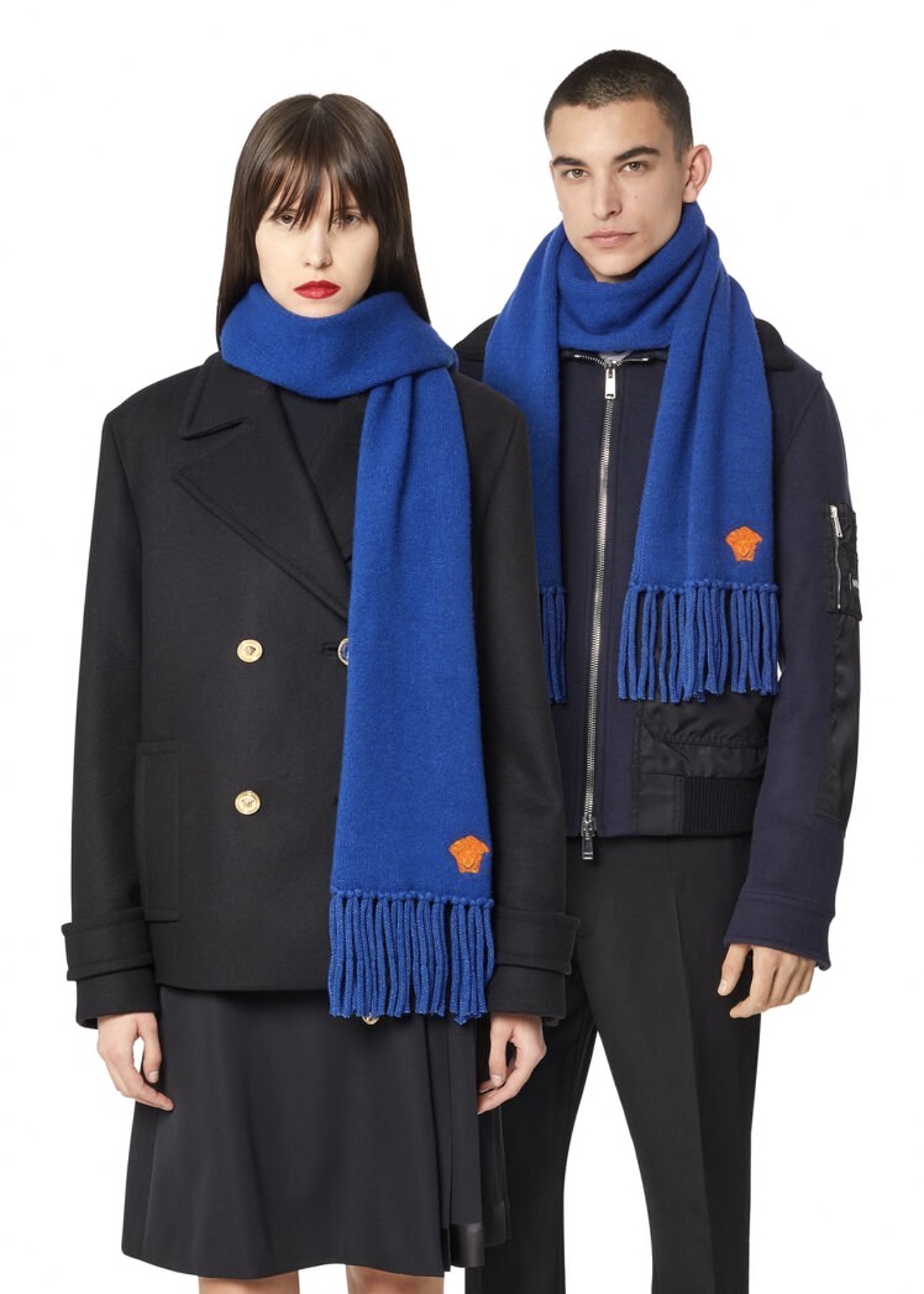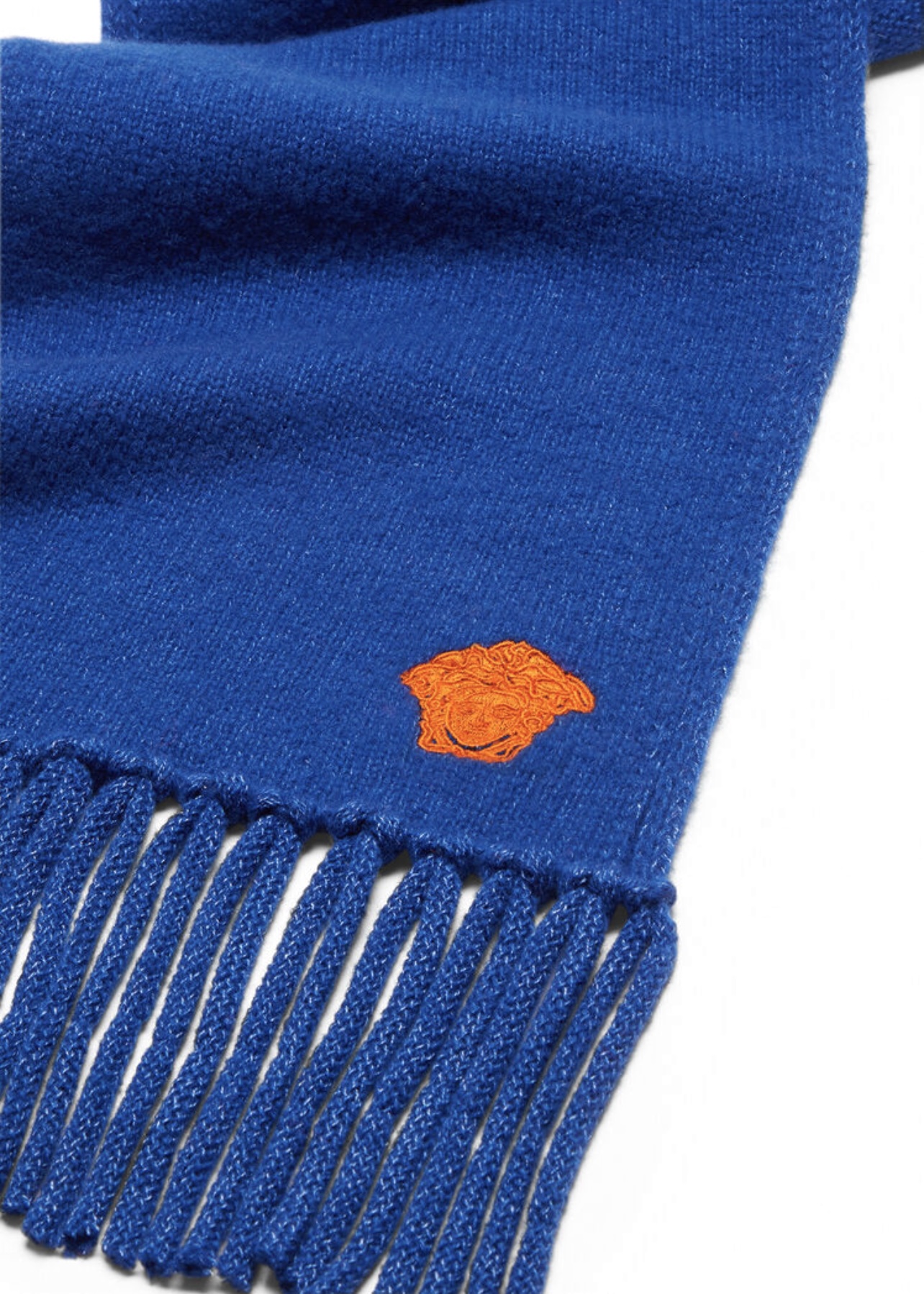 This Versace Medusa Pop scarf is a bold and luxurious accessory crafted from soft blue knit. It features the iconic Medusa head embroidered in bright orange, adding a striking contrast and signature Versace character. The long silhouette and thick fringe detailing make it both stylish and practical, perfect for adding a vibrant touch to any winter look.