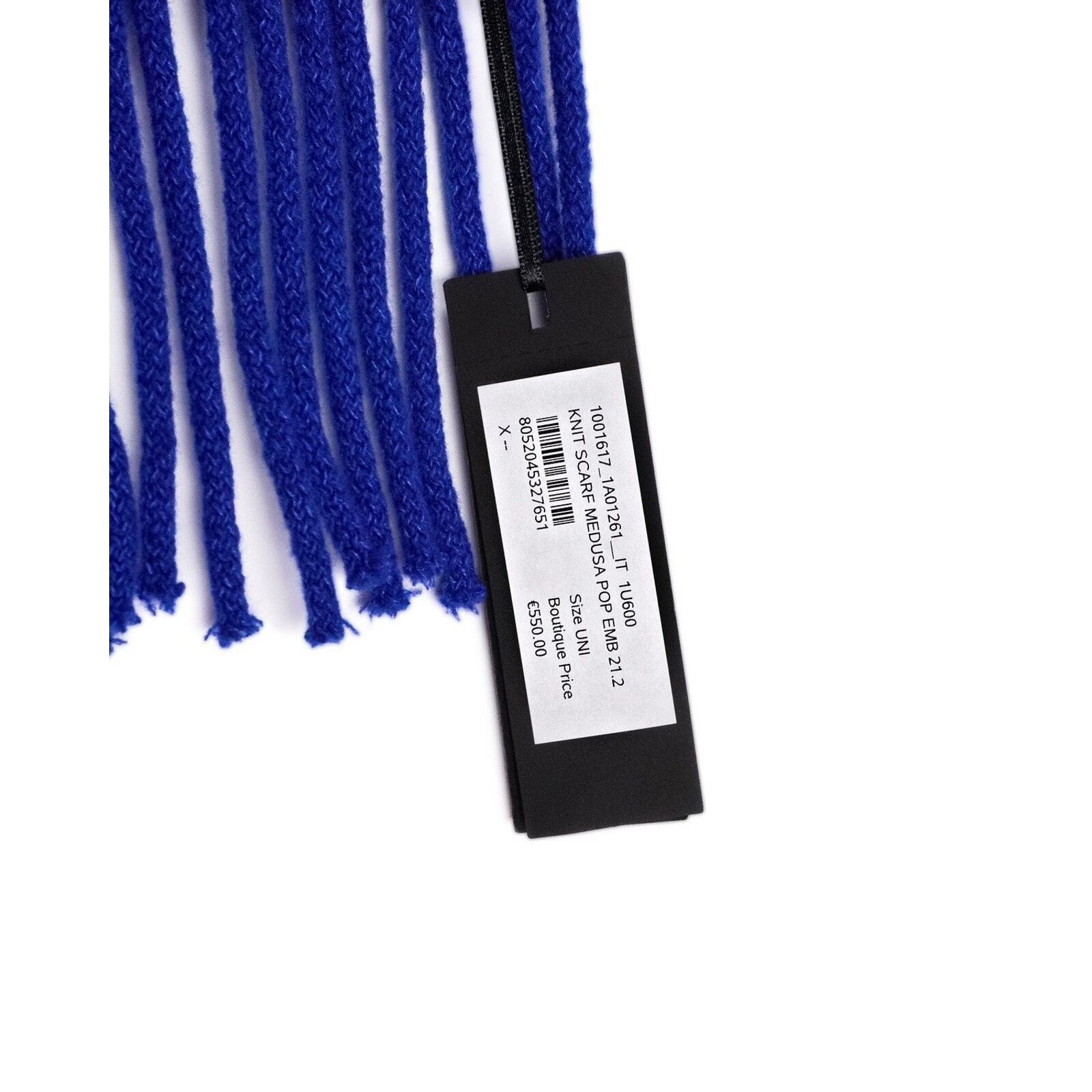 This Versace Medusa Pop scarf is a bold and luxurious accessory crafted from soft blue knit. It features the iconic Medusa head embroidered in bright orange, adding a striking contrast and signature Versace character. The long silhouette and thick fringe detailing make it both stylish and practical, perfect for adding a vibrant touch to any winter look.