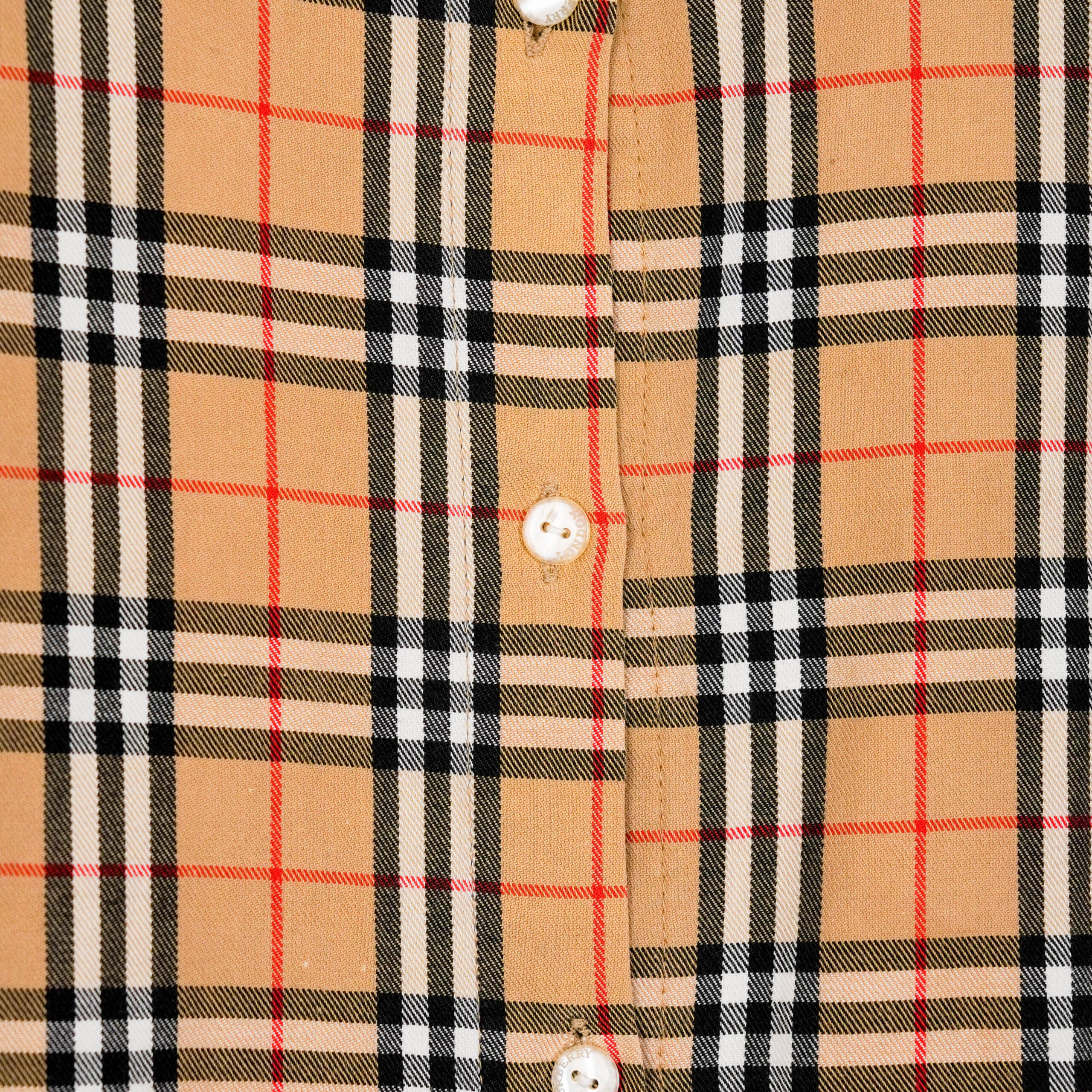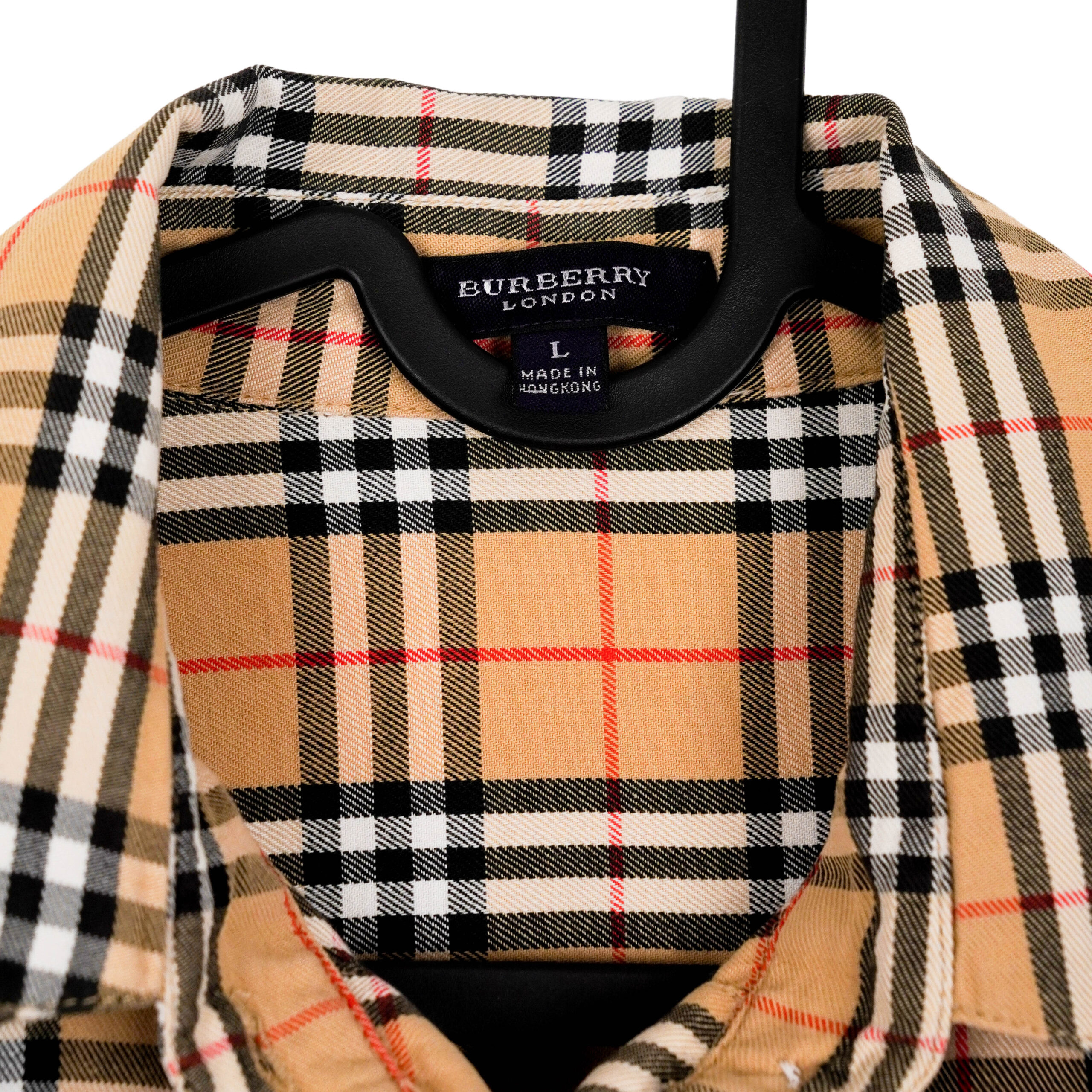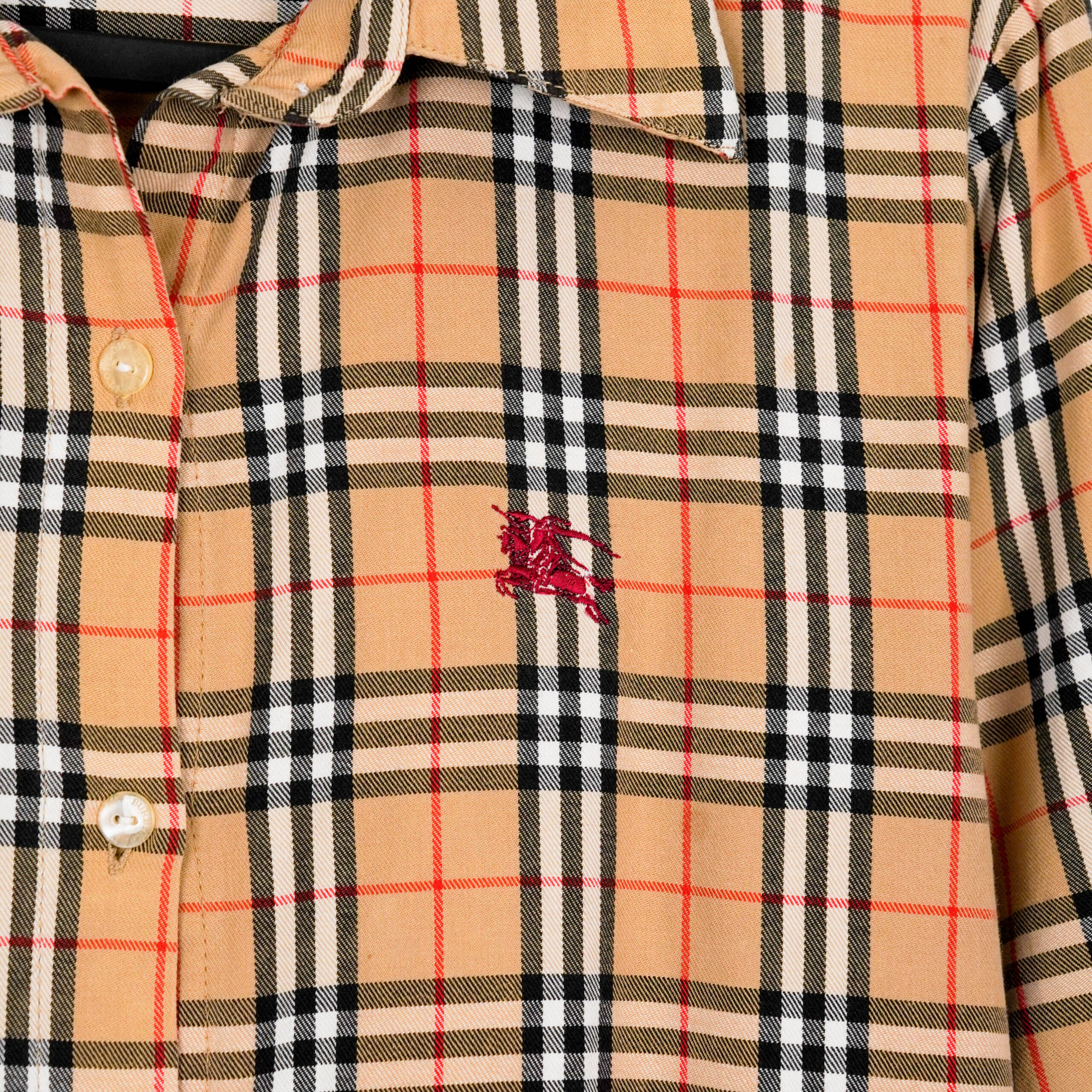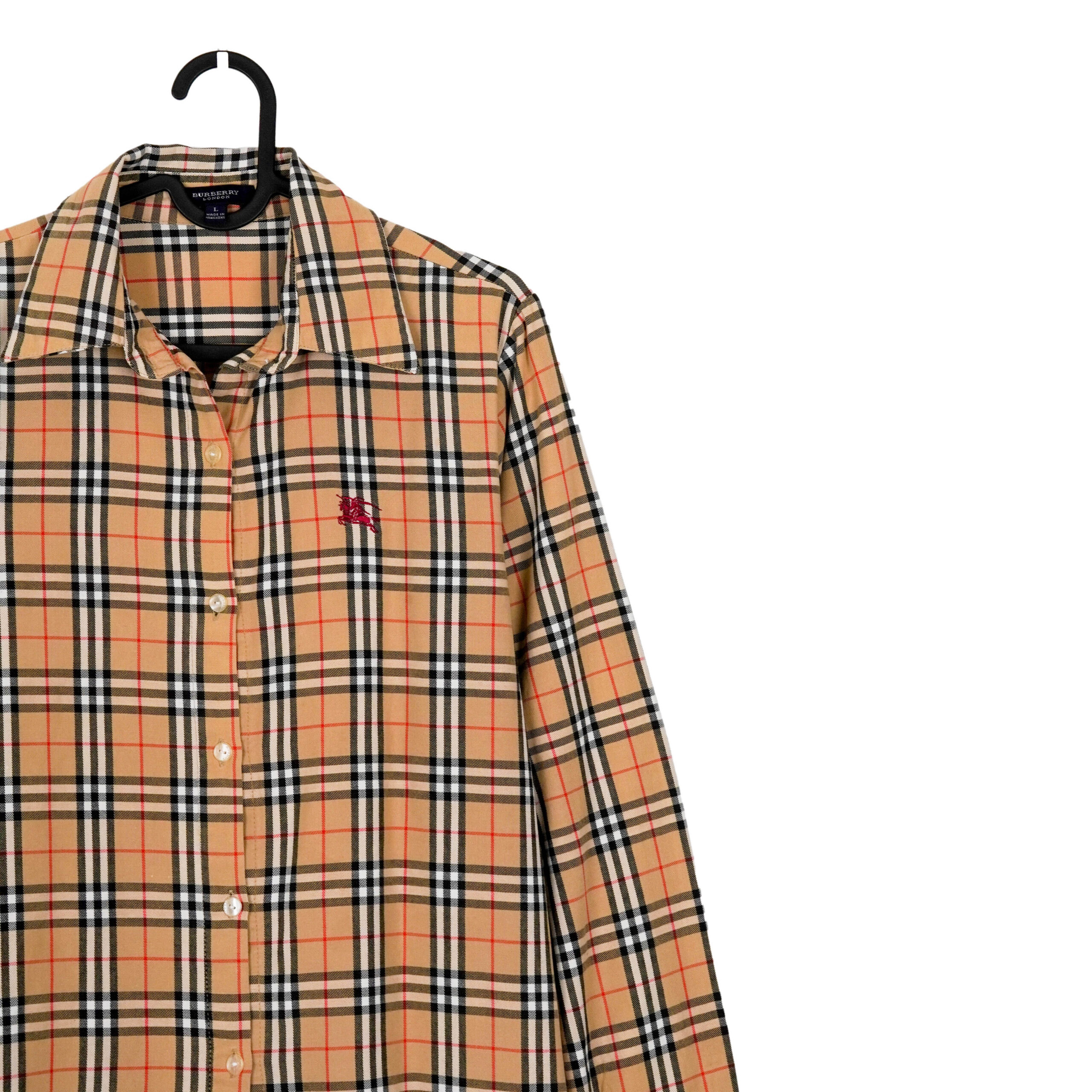 This Burberry London shirt is a classic piece showcasing the brand’s iconic Nova Check pattern in beige, black, and red tones. Crafted with attention to detail, it features long sleeves, a button-up front, and the signature equestrian knight logo embroidered in red on the chest. Its timeless design makes it a versatile wardrobe essential, pairing perfectly with both casual and refined looks.